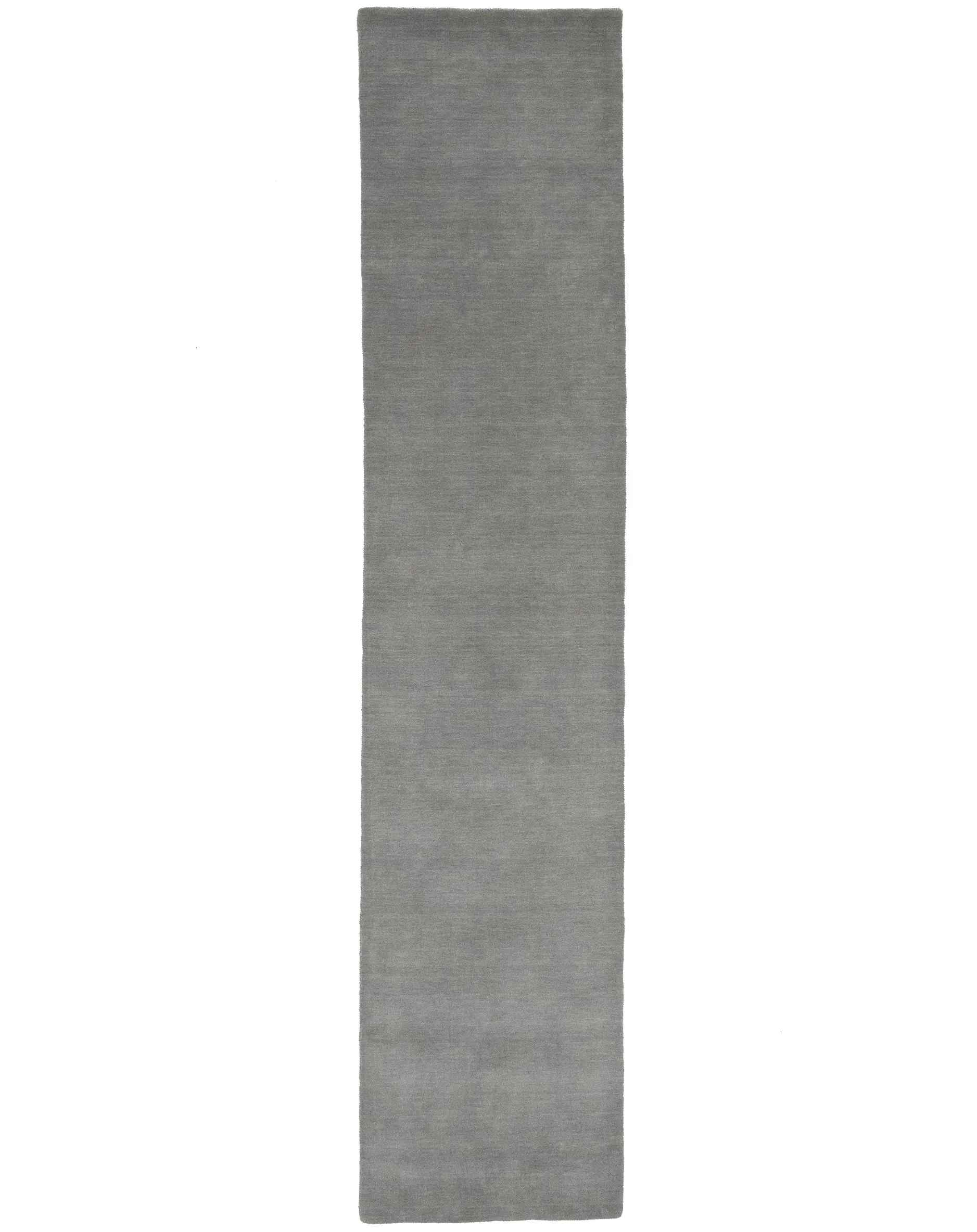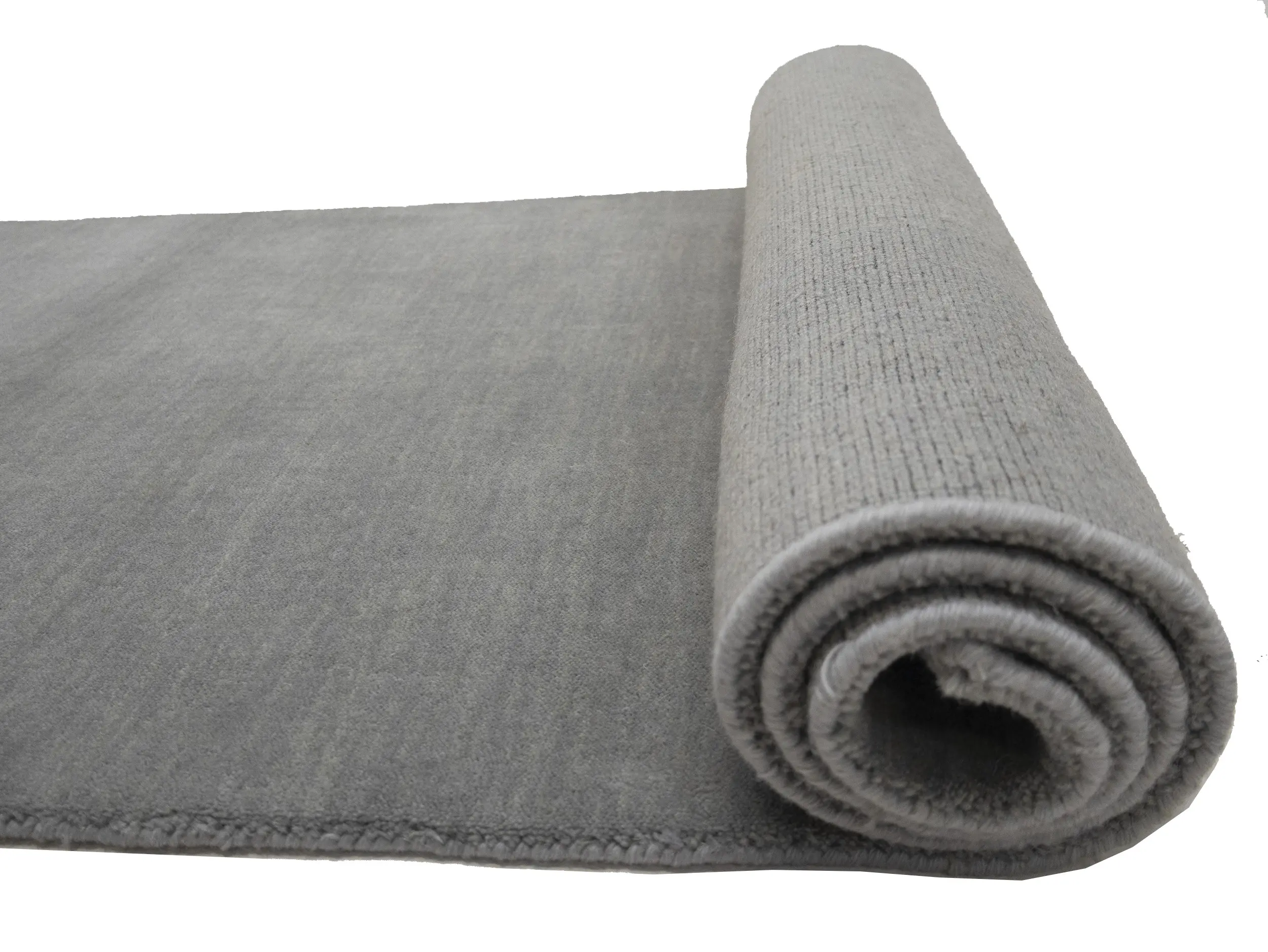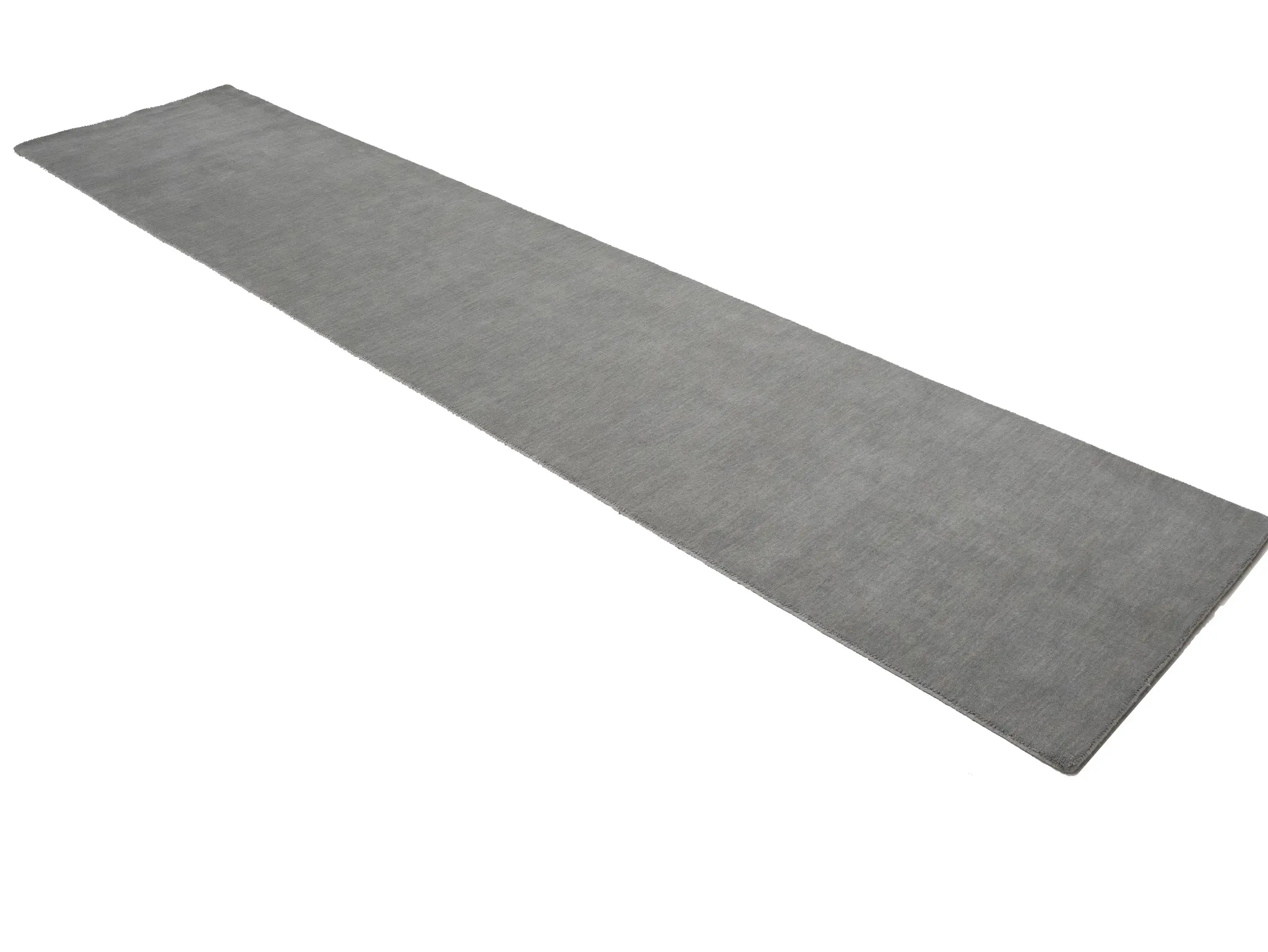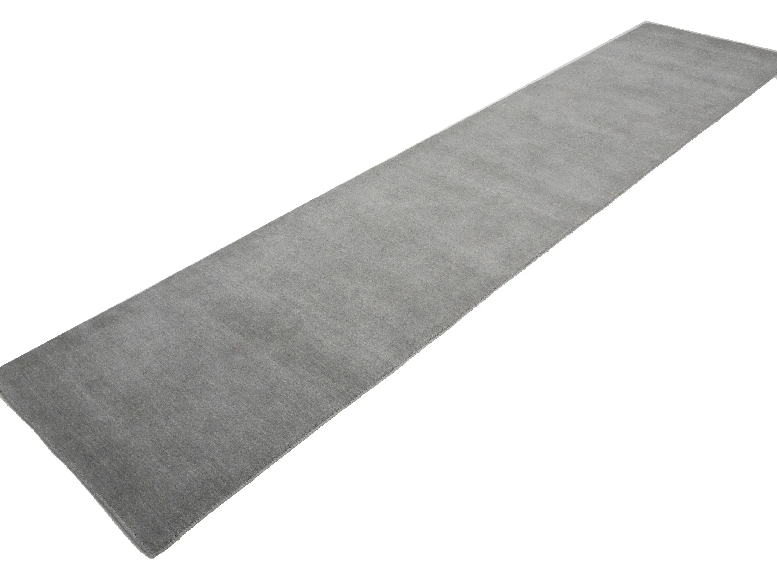 This hand-loomed 3X12 Gray Oriental Runner rug from India features a modern, Solid design that seamlessly integrates traditional craftsmanship with contemporary style, showcasing a striking Gray primary color. It provides a luxuriant softness and durability underfoot, as it is constructed from premium wool with a cotton foundation. The rug is optimized for high-traffic areas due to its medium pile height and knot density of 100 knots per square inch, which ensures durability and comfort. This rug, which is in exceptional condition and was recently manufactured, is an ideal complement to any contemporary setting, providing both versatility and timeless elegance.