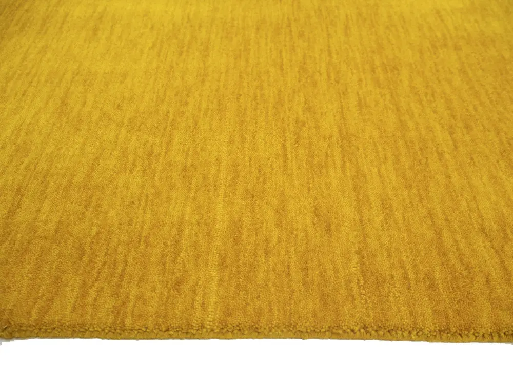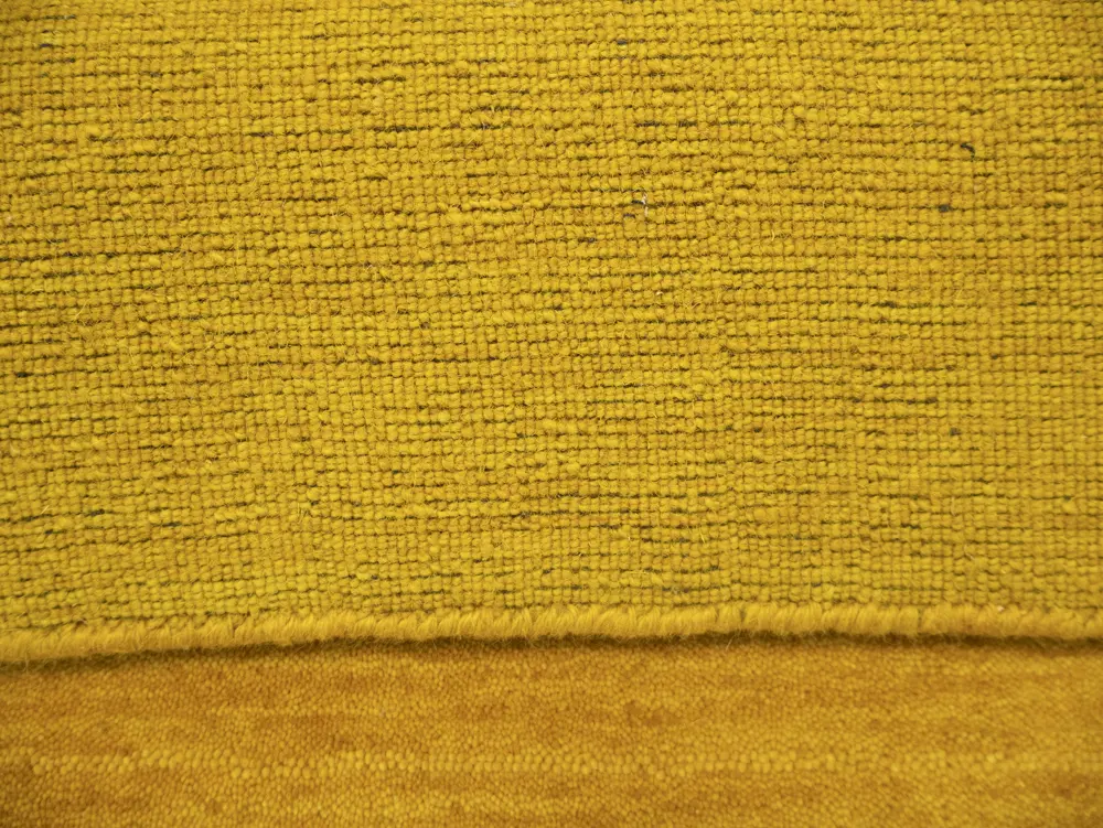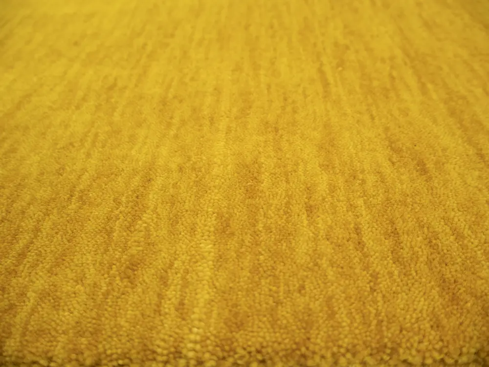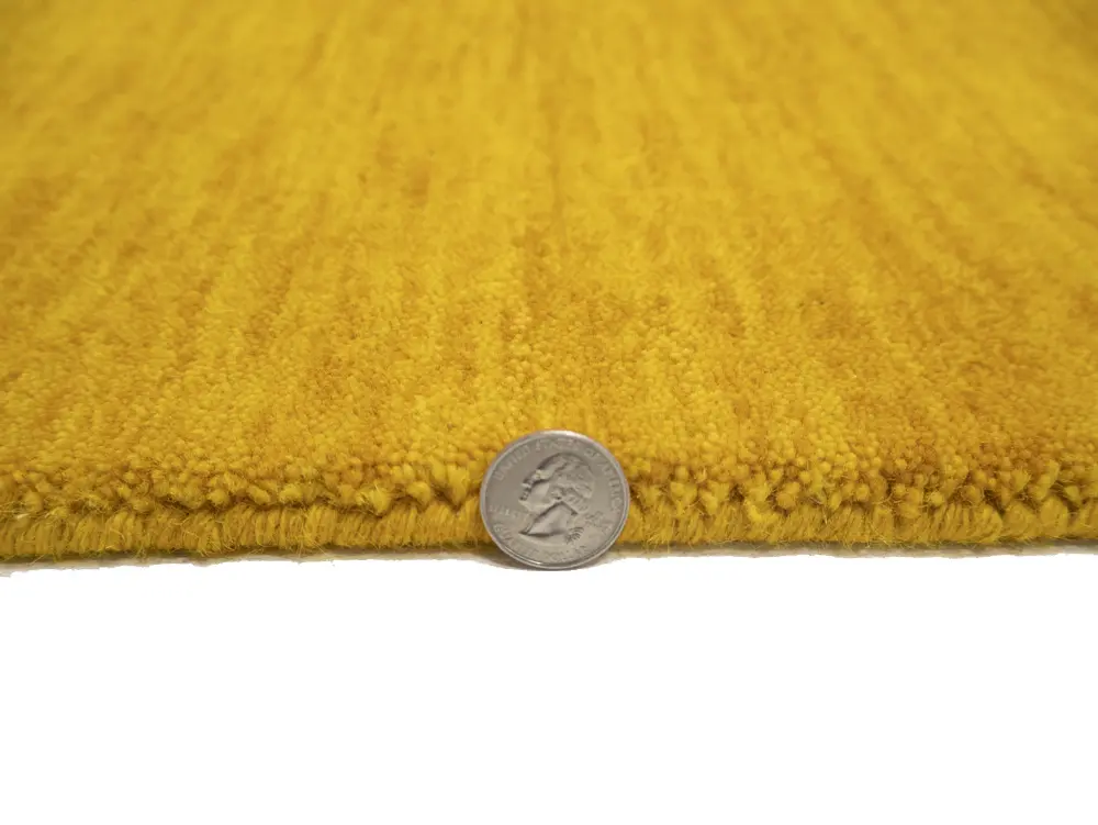 This hand-loomed 2X3 Marigold Oriental rug from India features a modern, Solid design that seamlessly integrates traditional craftsmanship with contemporary style, showcasing a striking Marigold primary color. It provides a luxuriant softness and durability underfoot, as it is constructed from premium wool with a cotton foundation. The rug is optimized for high-traffic areas due to its medium pile height and knot density of 100 knots per square inch, which ensures durability and comfort. This rug, which is in exceptional condition and was recently manufactured, is an ideal complement to any contemporary setting, providing both versatility and timeless elegance.