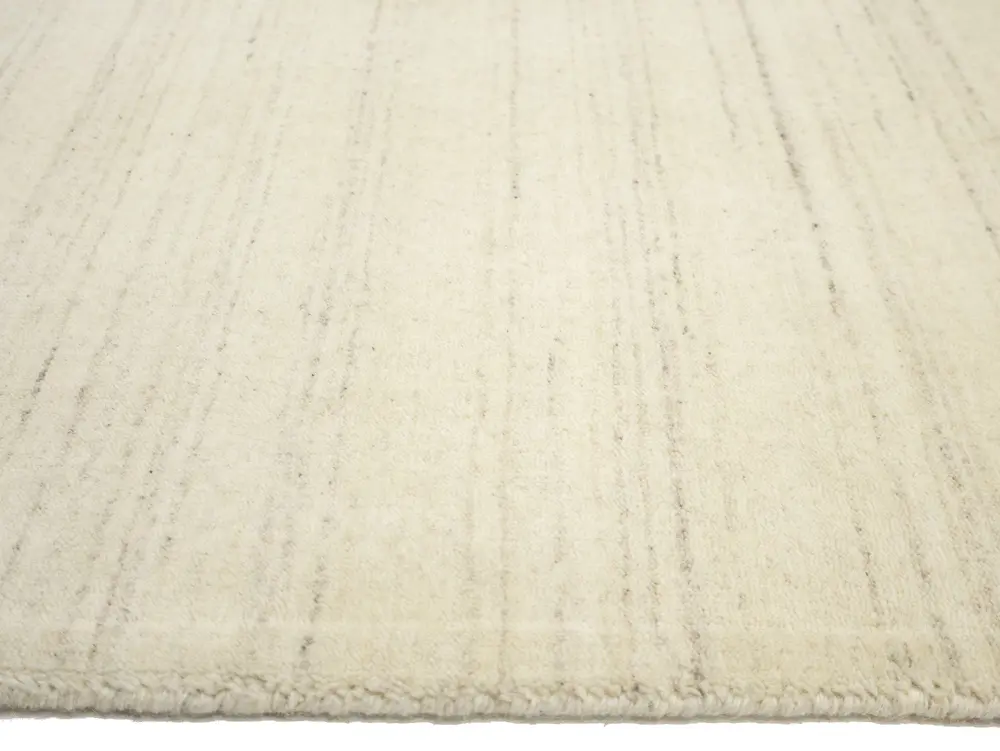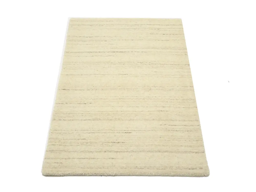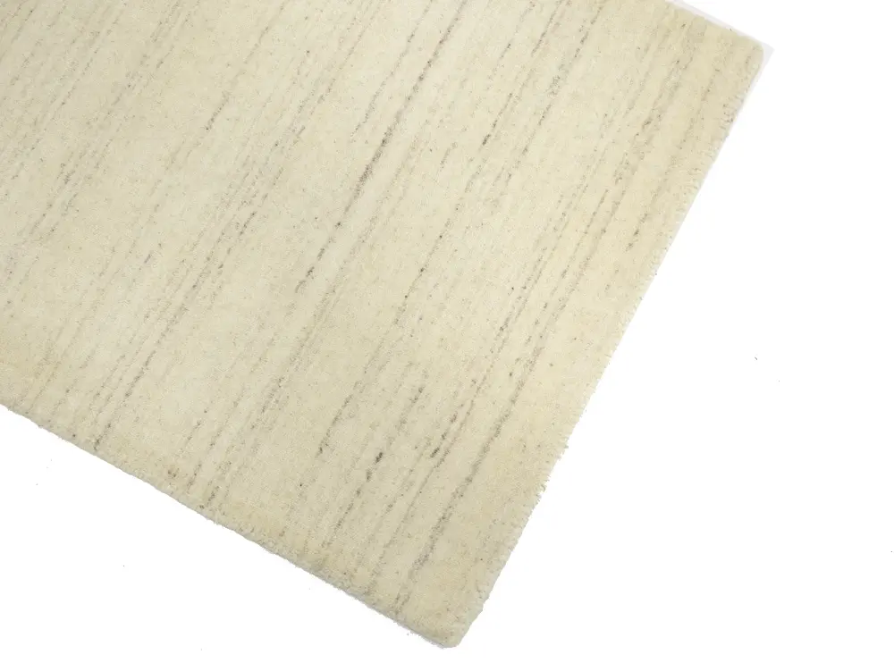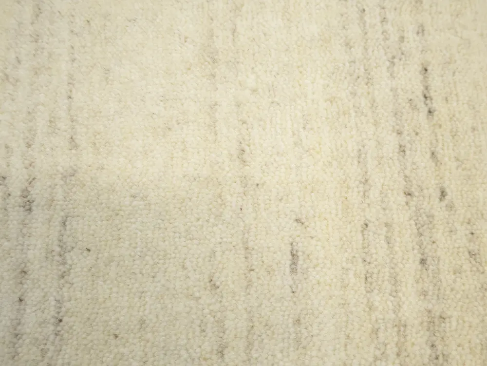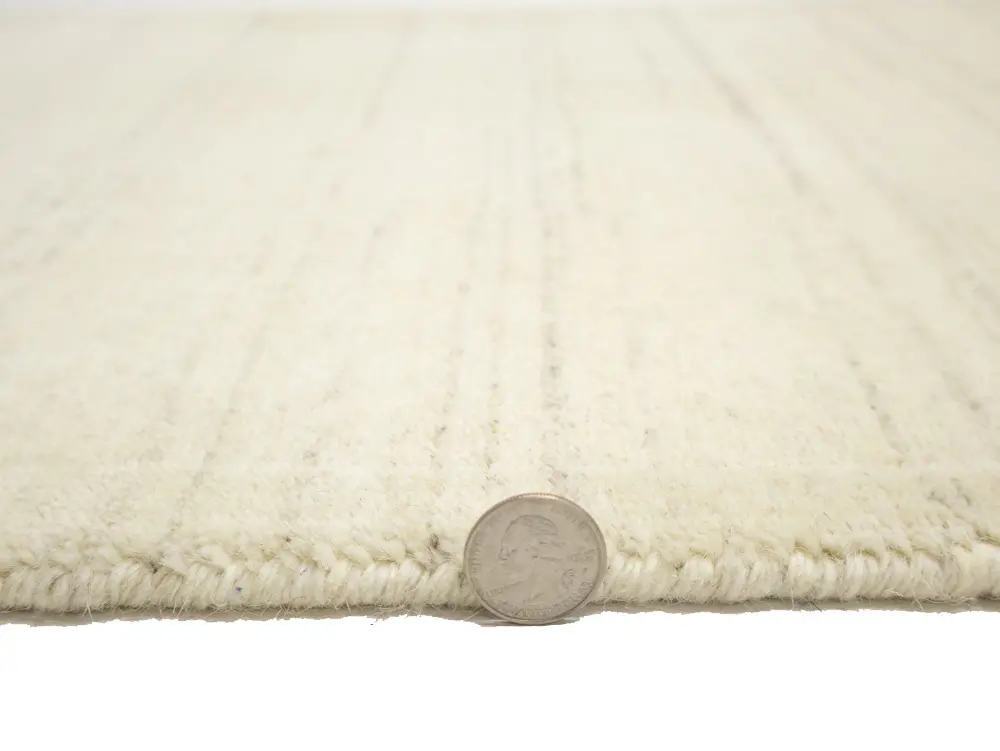 This hand-loomed Oriental rug from India features a modern, Solid design that seamlessly integrates traditional craftsmanship with contemporary style, showcasing a striking Cream primary color. It provides a luxuriant softness and durability underfoot, as it is constructed from premium wool with a cotton foundation. The rug is optimized for high-traffic areas due to its medium pile height and knot density of 100 knots per square inch, which ensures durability and comfort. This rug, which is in exceptional condition and was recently manufactured, is an ideal complement to any contemporary setting, providing both versatility and timeless elegance.