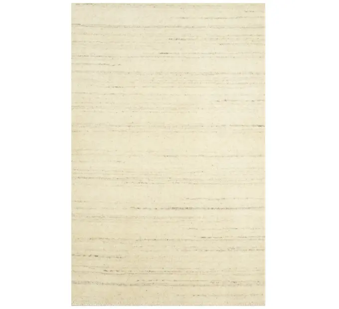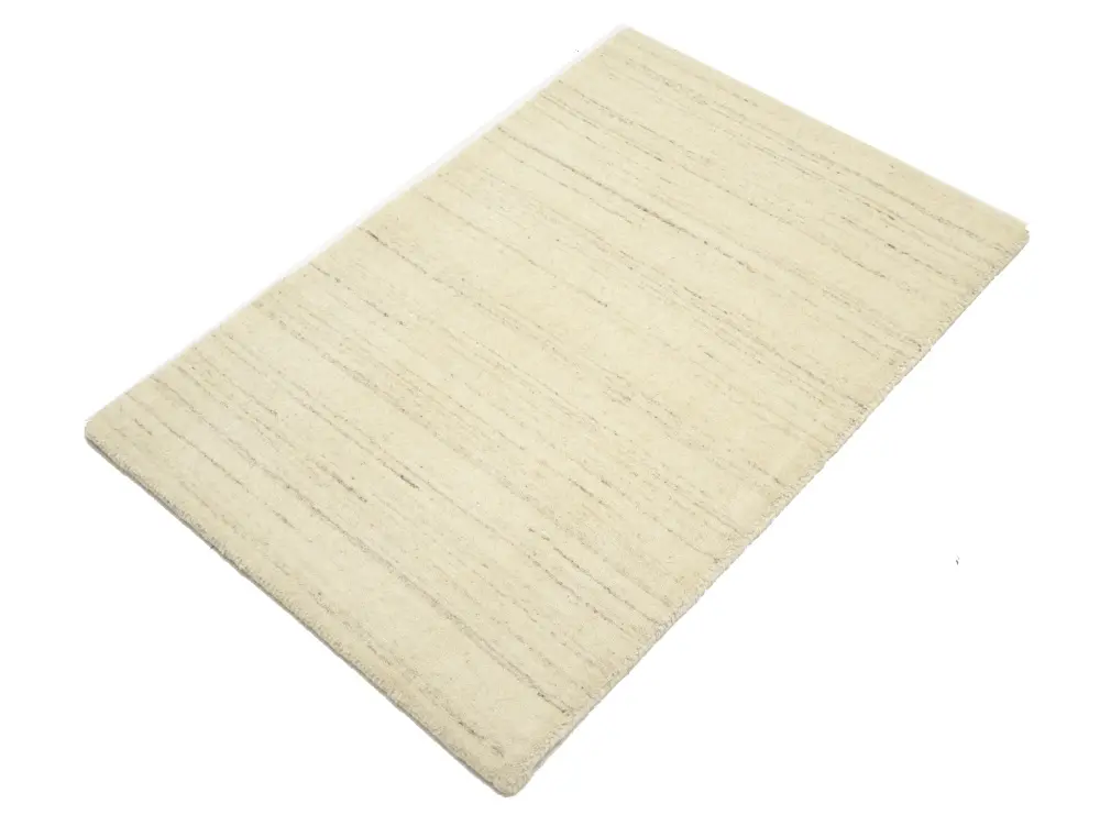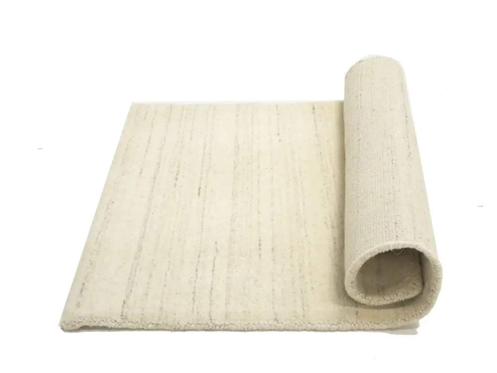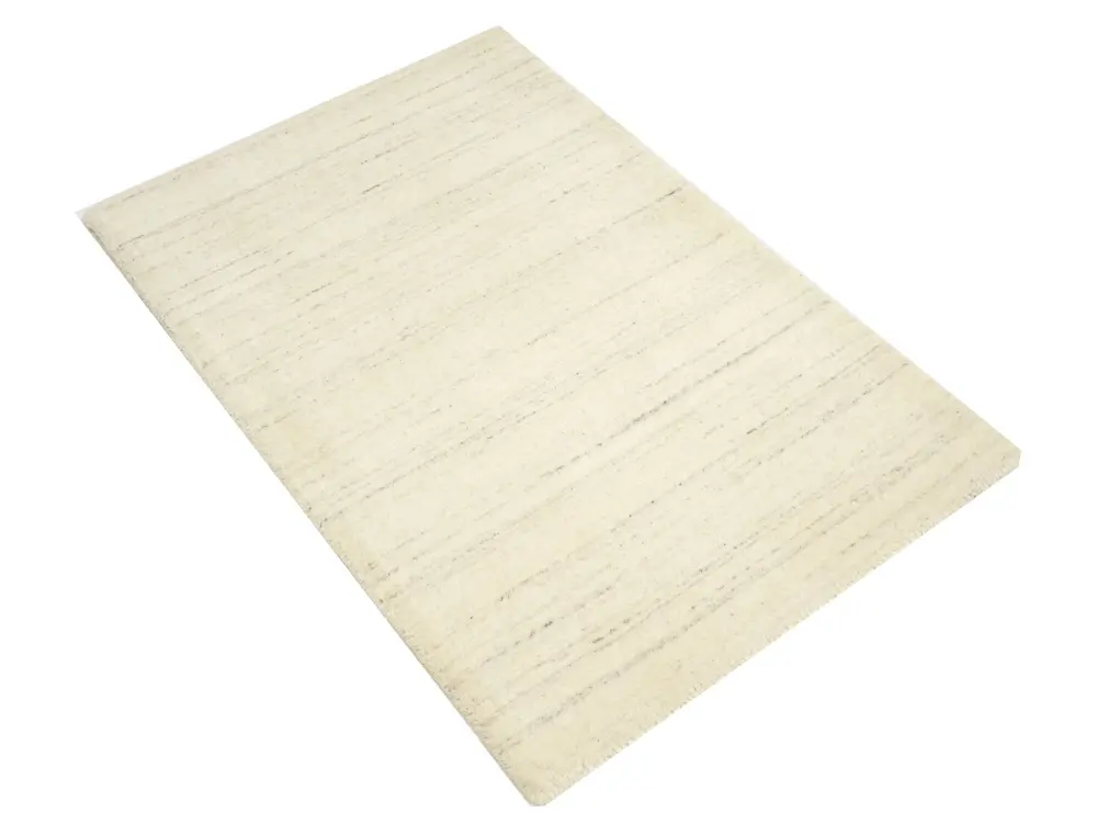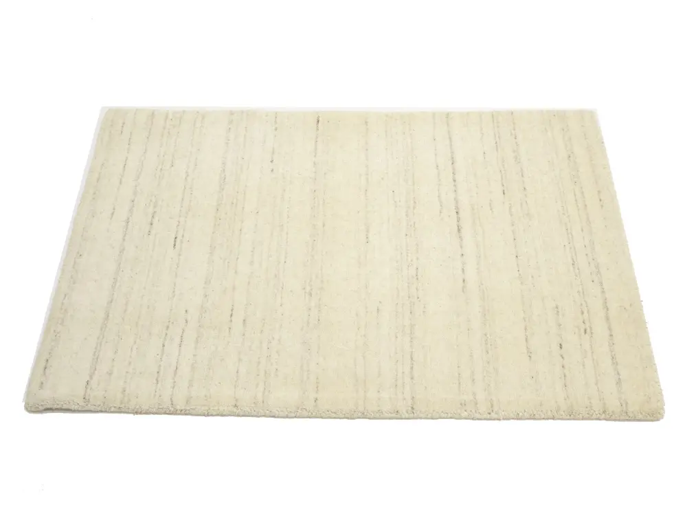This hand-loomed Oriental rug from India features a modern, Solid design that seamlessly integrates traditional craftsmanship with contemporary style, showcasing a striking Cream primary color. It provides a luxuriant softness and durability underfoot, as it is constructed from premium wool with a cotton foundation. The rug is optimized for high-traffic areas due to its medium pile height and knot density of 100 knots per square inch, which ensures durability and comfort. This rug, which is in exceptional condition and was recently manufactured, is an ideal complement to any contemporary setting, providing both versatility and timeless elegance.