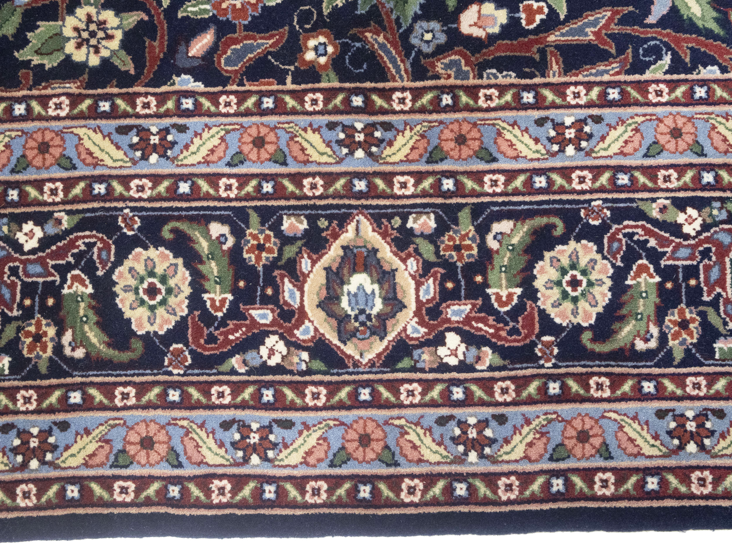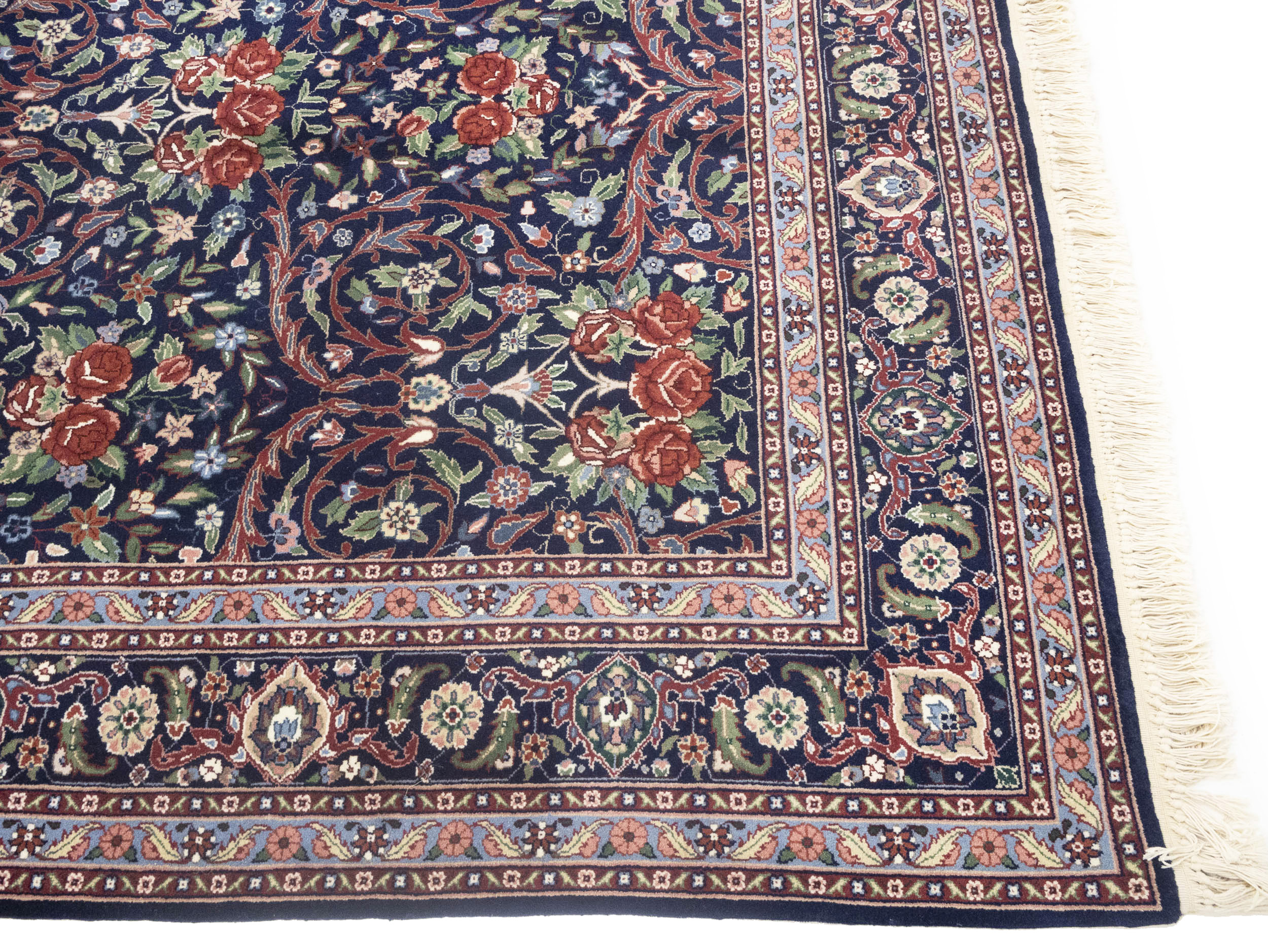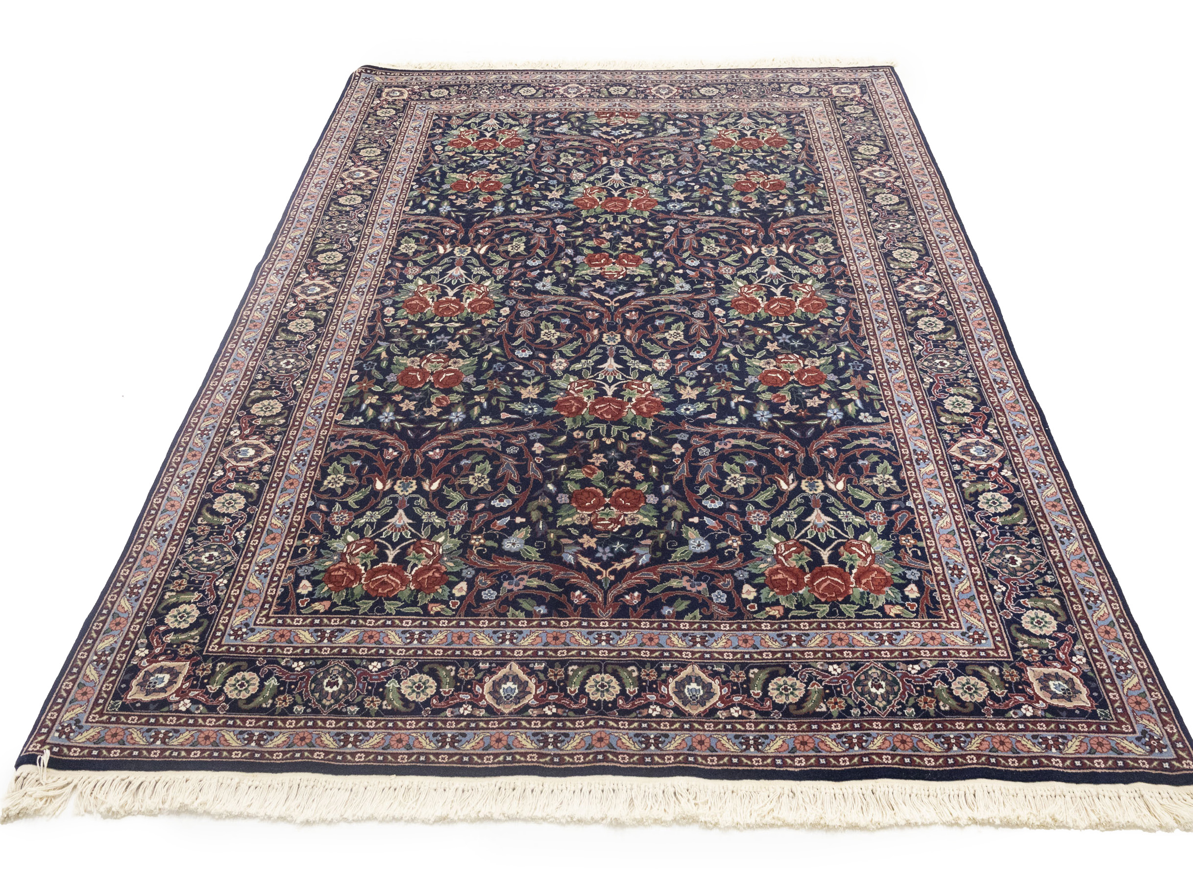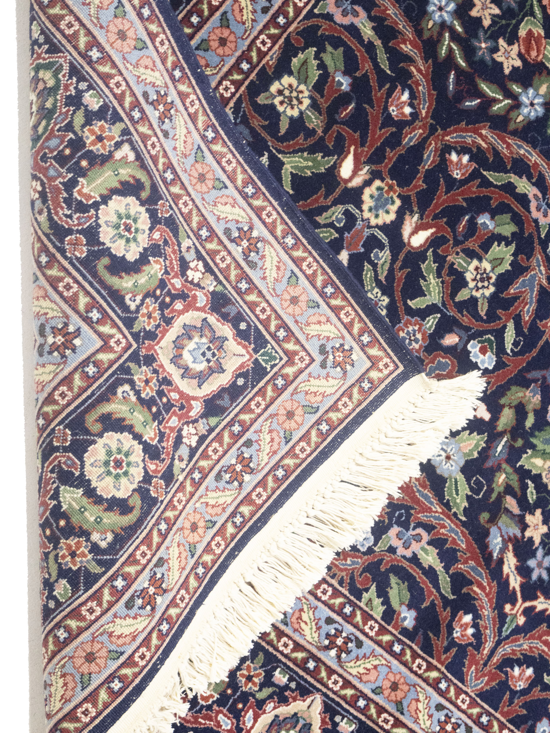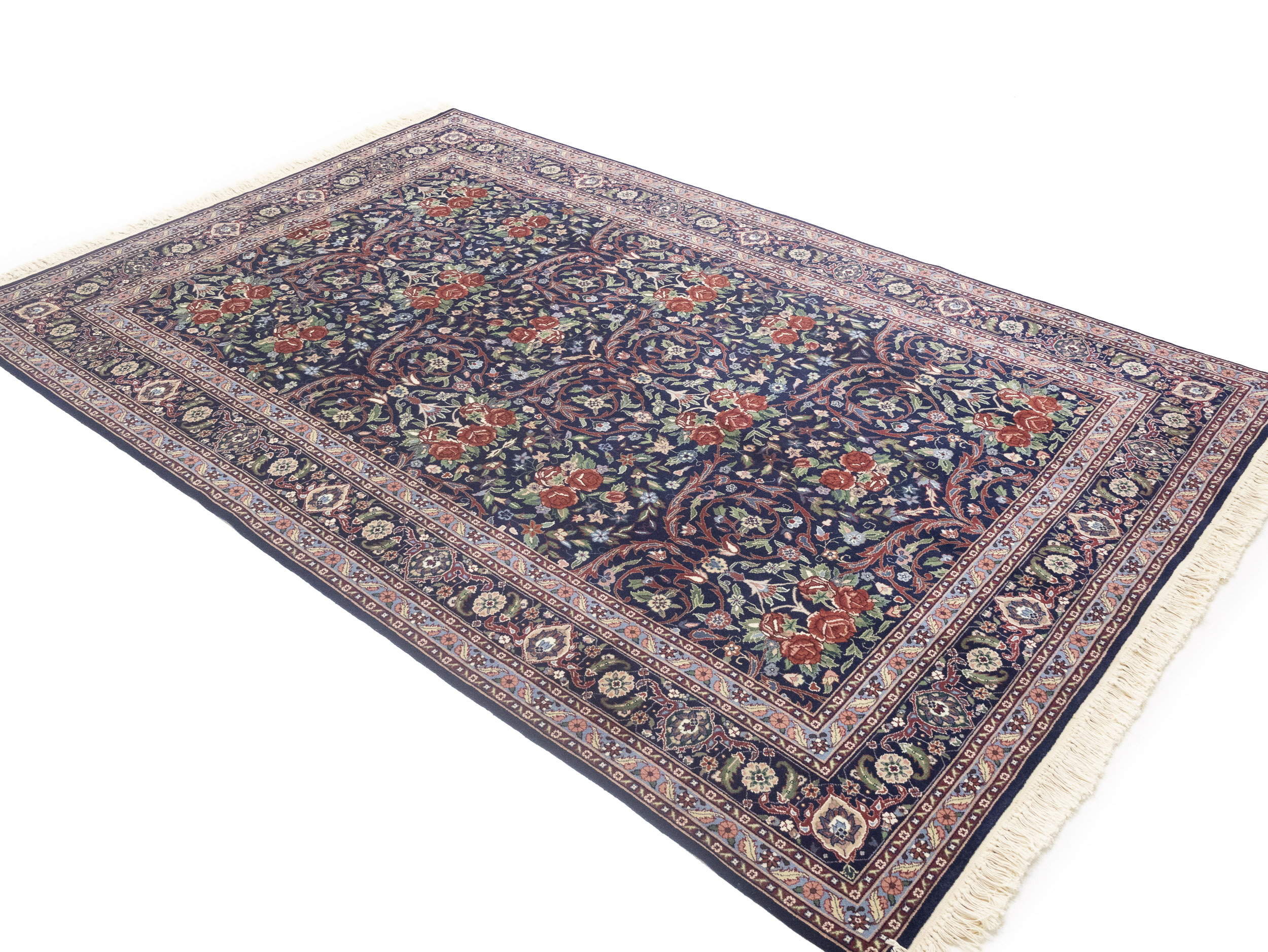 Handmade 6X9 purple-navy oriental rug made with vegetable dyes (fine wool pile and cotton foundation), exceptional knot count, and appealing ancient designs. This Oriental rug never will go out of style and would be among your most valuable treasures.