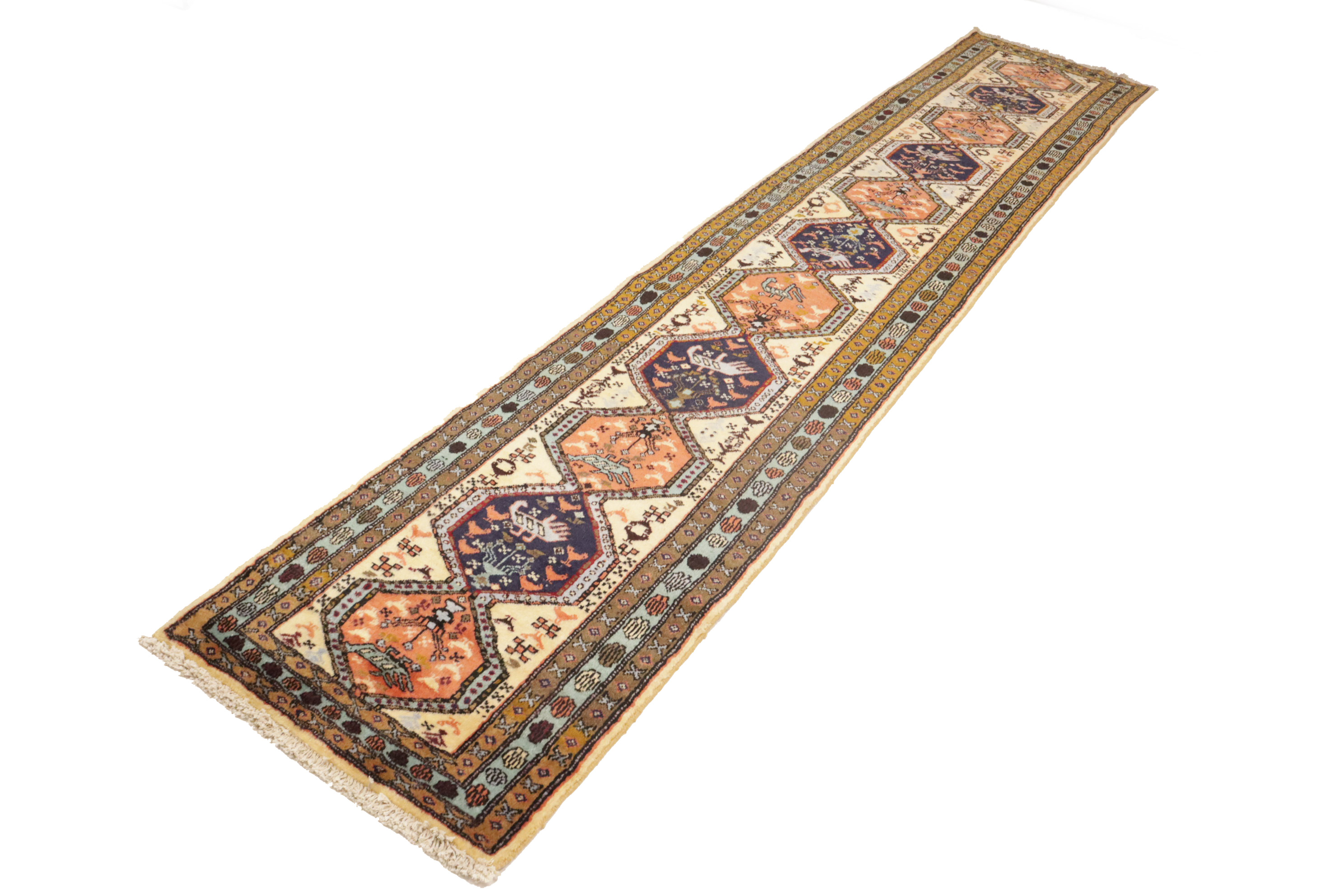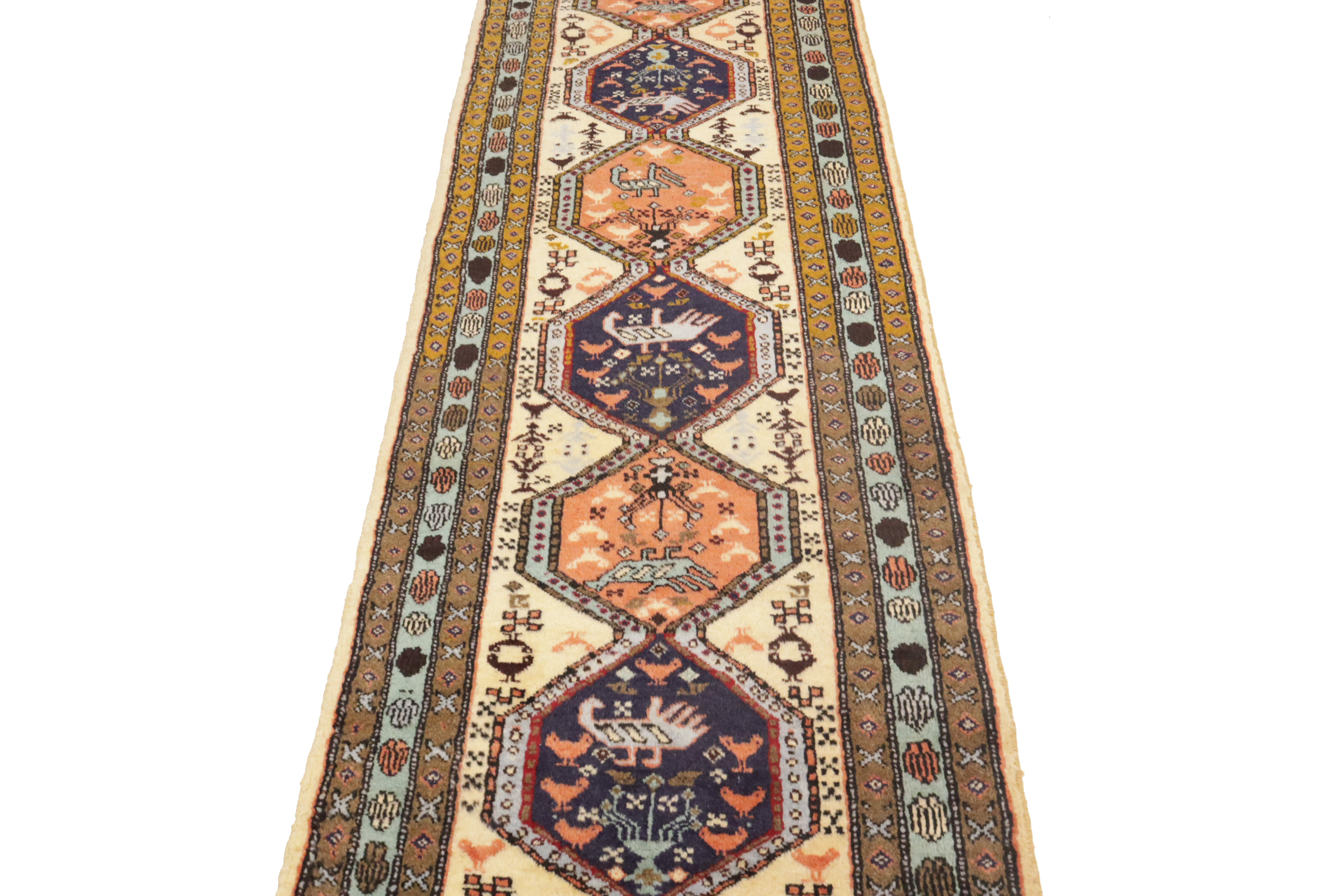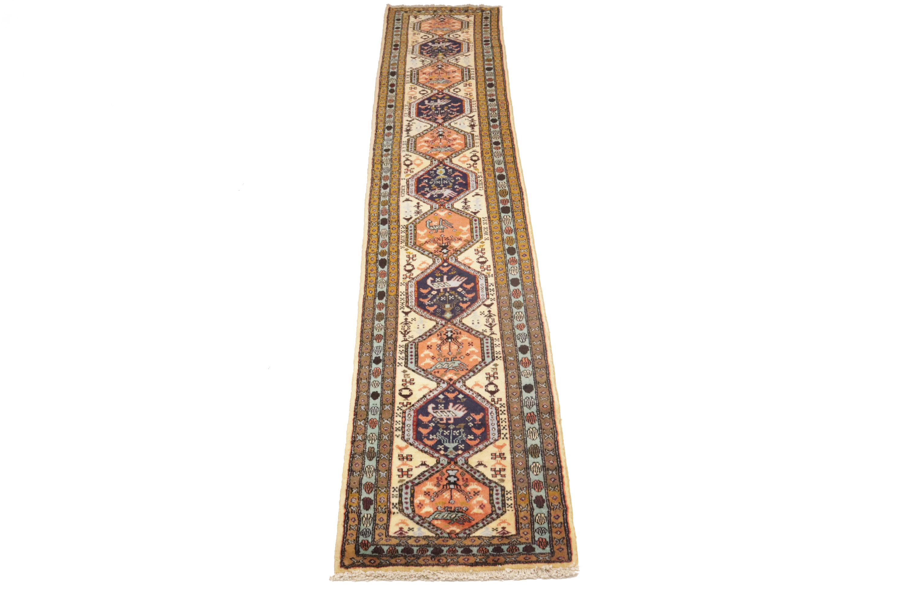 Handmade vintage 2'5X12'9 cream Persian runner made with natural dyes (fine wool pile and cotton foundation), superior knot count, and appealing ancient designs. This Oriental runner never will go out of style and would be among your most valuable treasures.