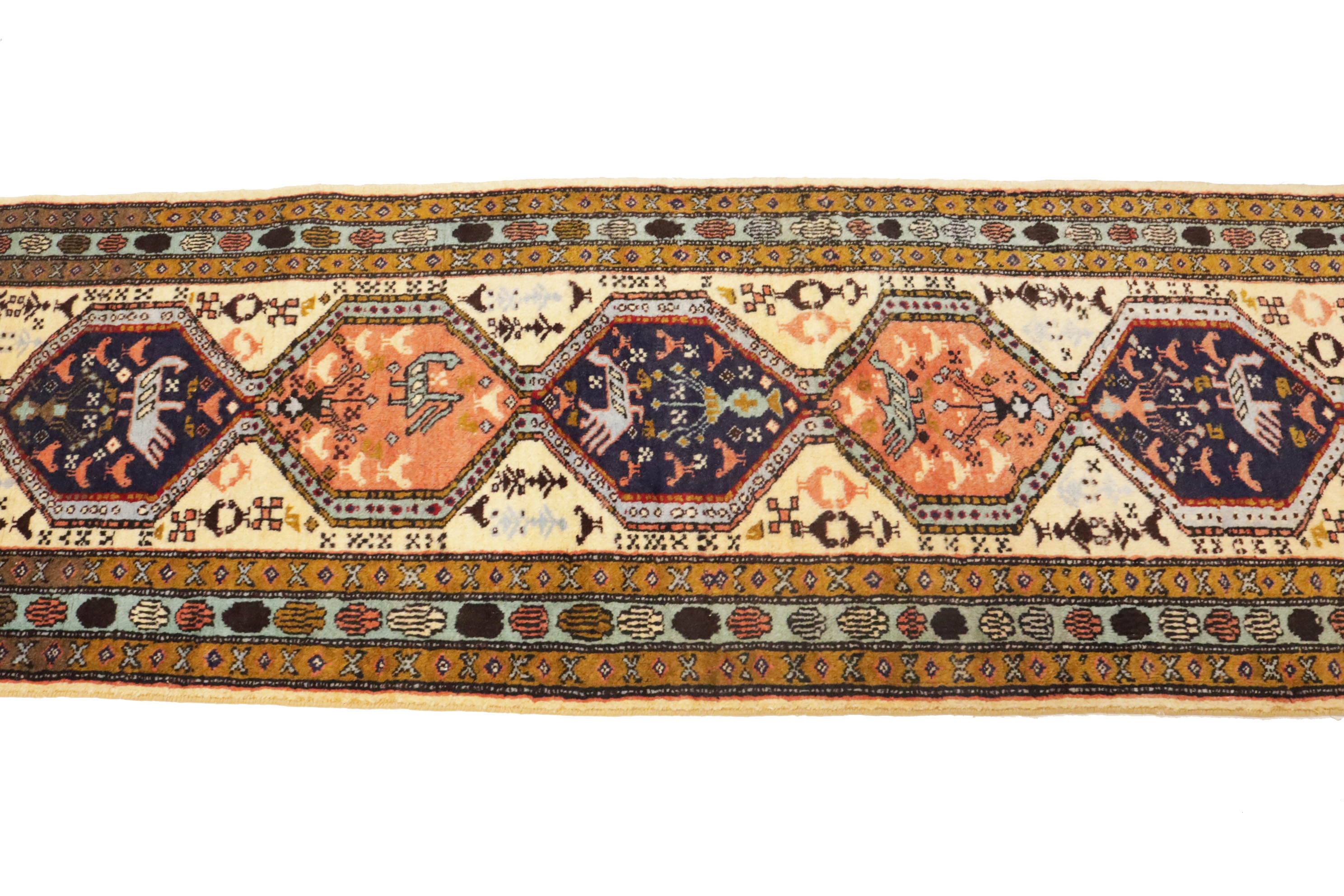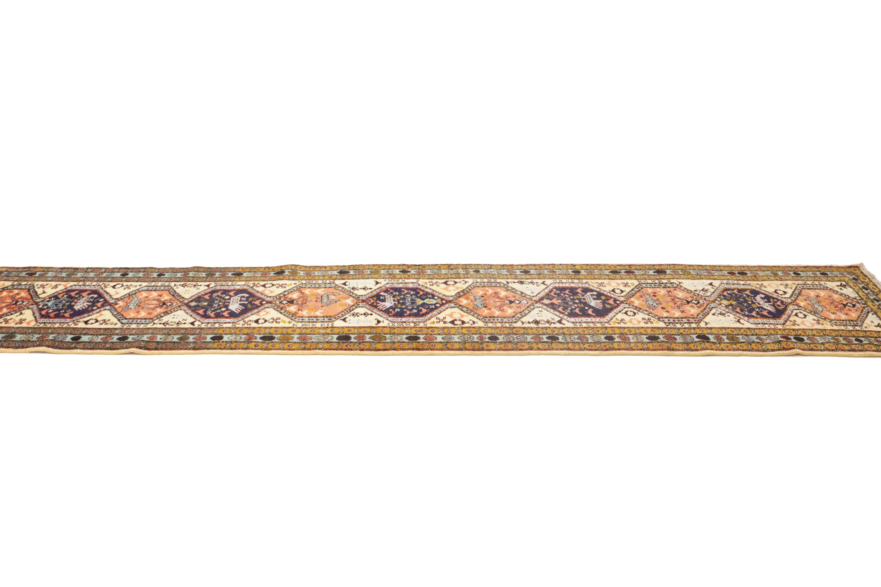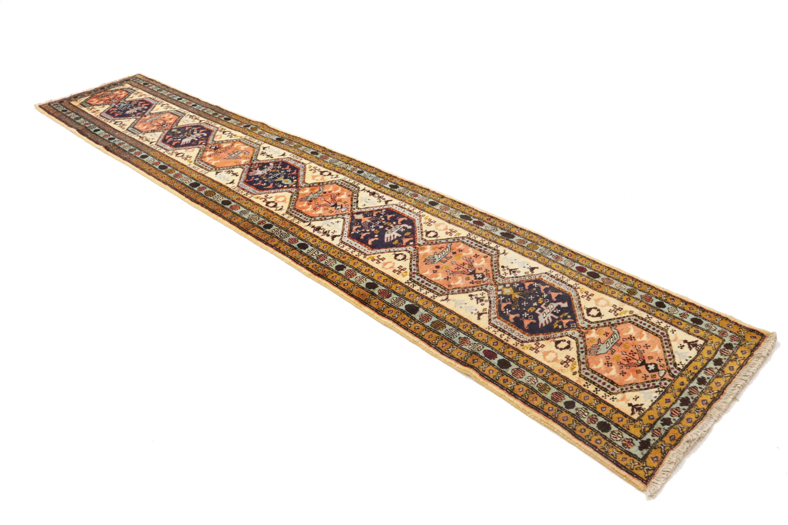 Handmade vintage 2'5X12'9 cream Persian runner made with natural dyes (fine wool pile and cotton foundation), superior knot count, and appealing ancient designs. This Oriental runner never will go out of style and would be among your most valuable treasures.