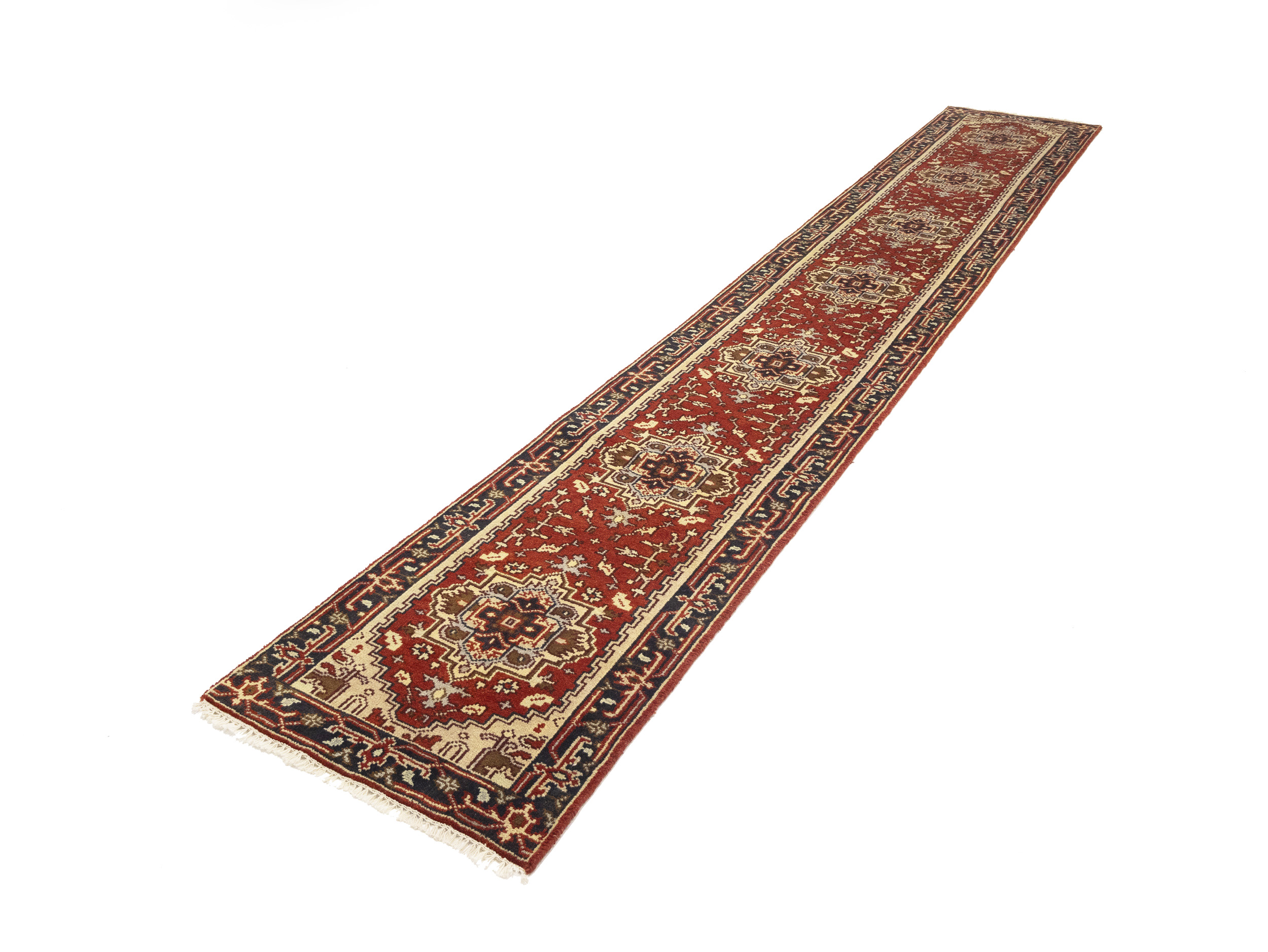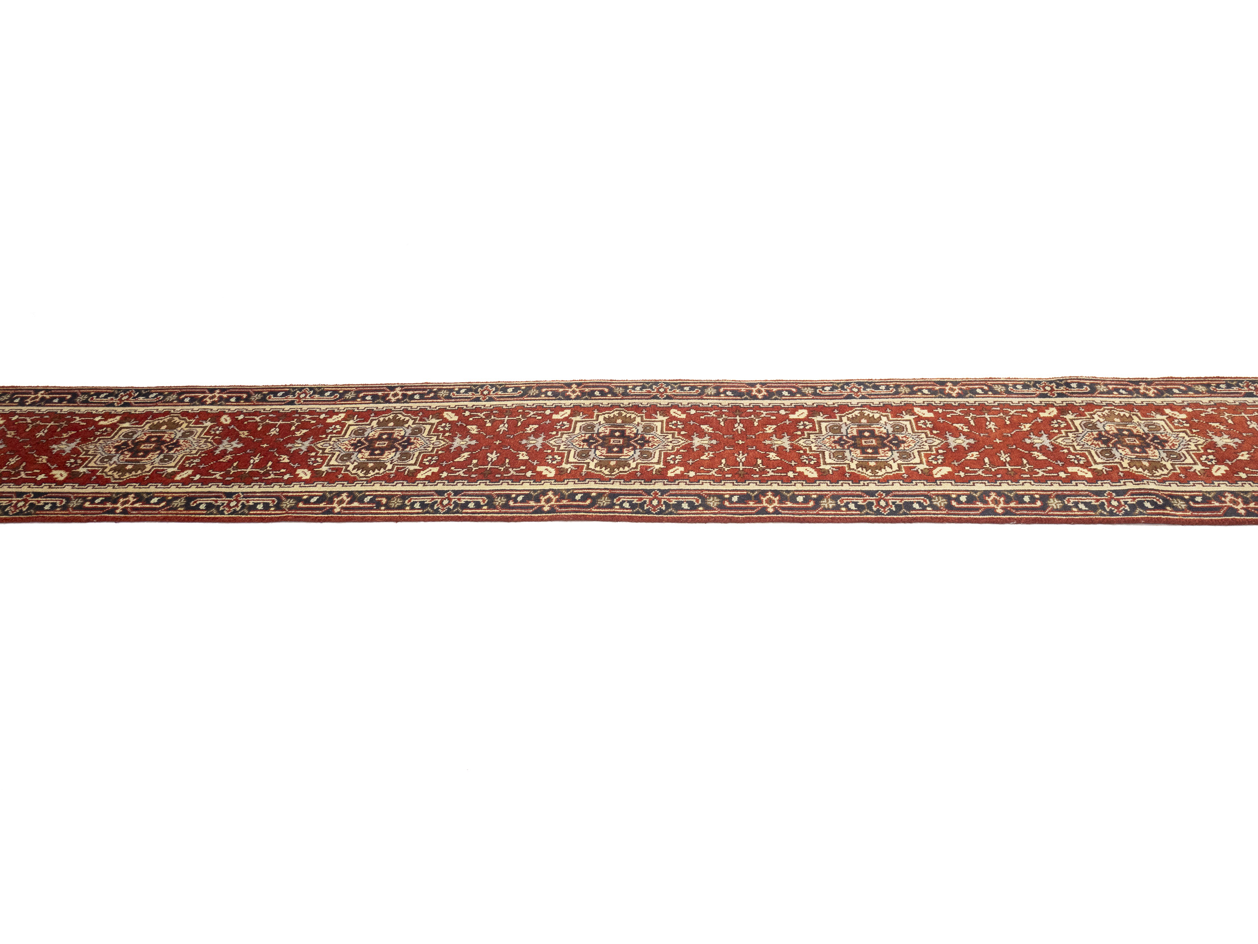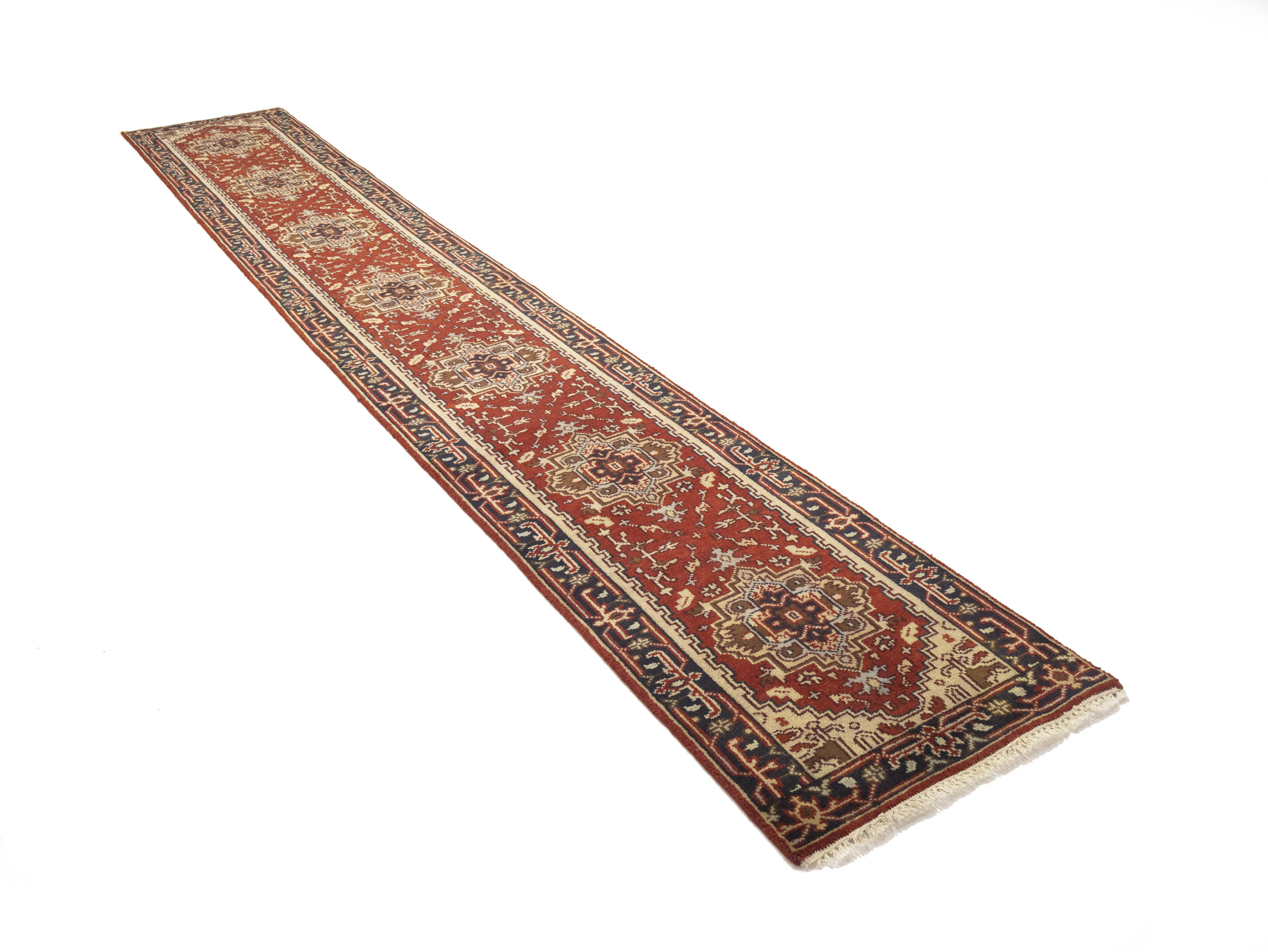 Handmade 2'5X16 red Oriental runner made with vegetable dyes (fine wool pile and cotton foundation), superior knot count, and alluring ancient designs. This Oriental runner never will go out of style and would be among your most valuable treasures.