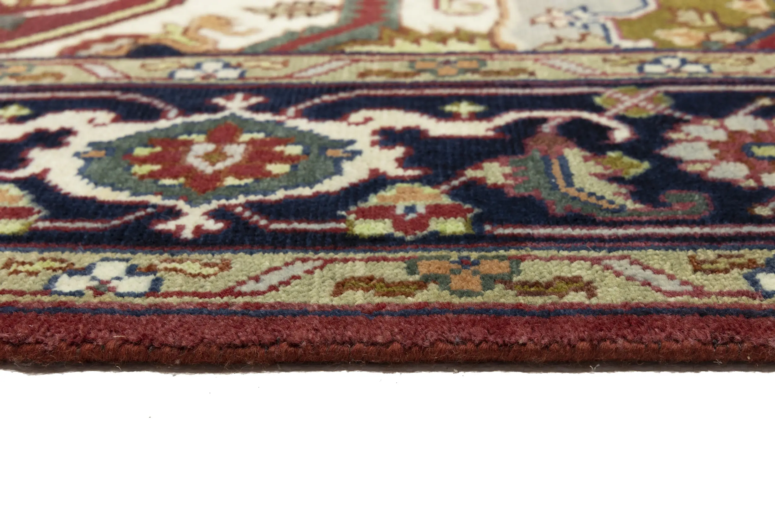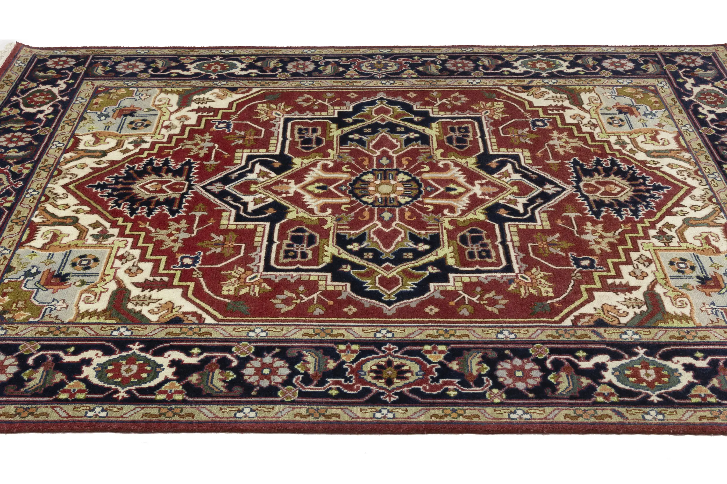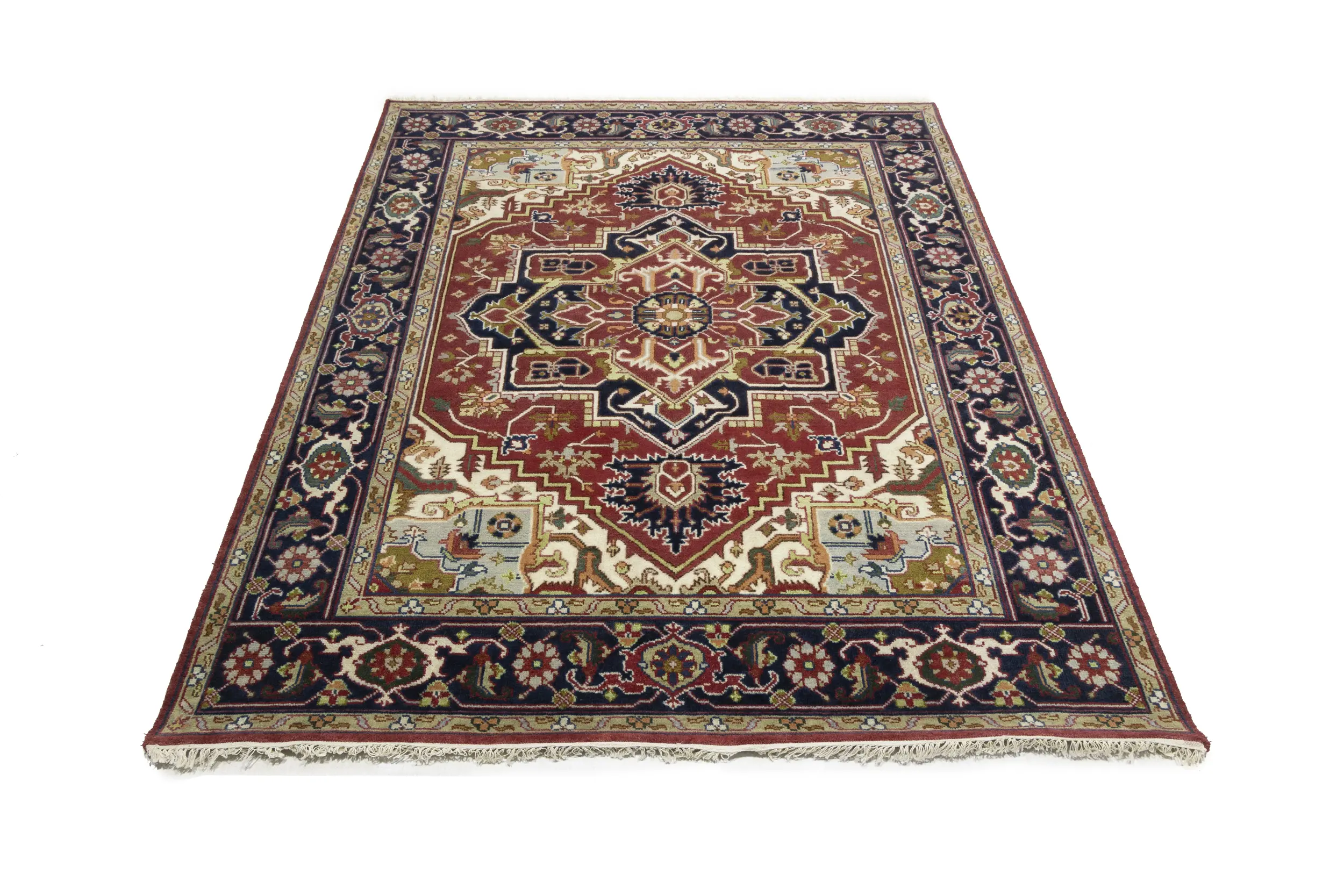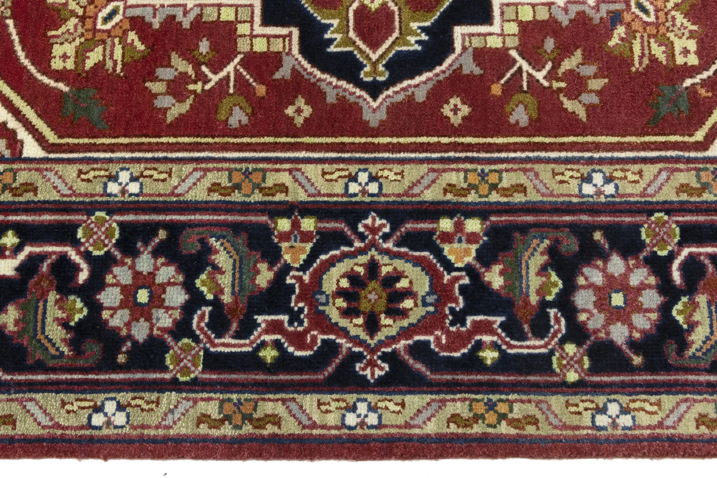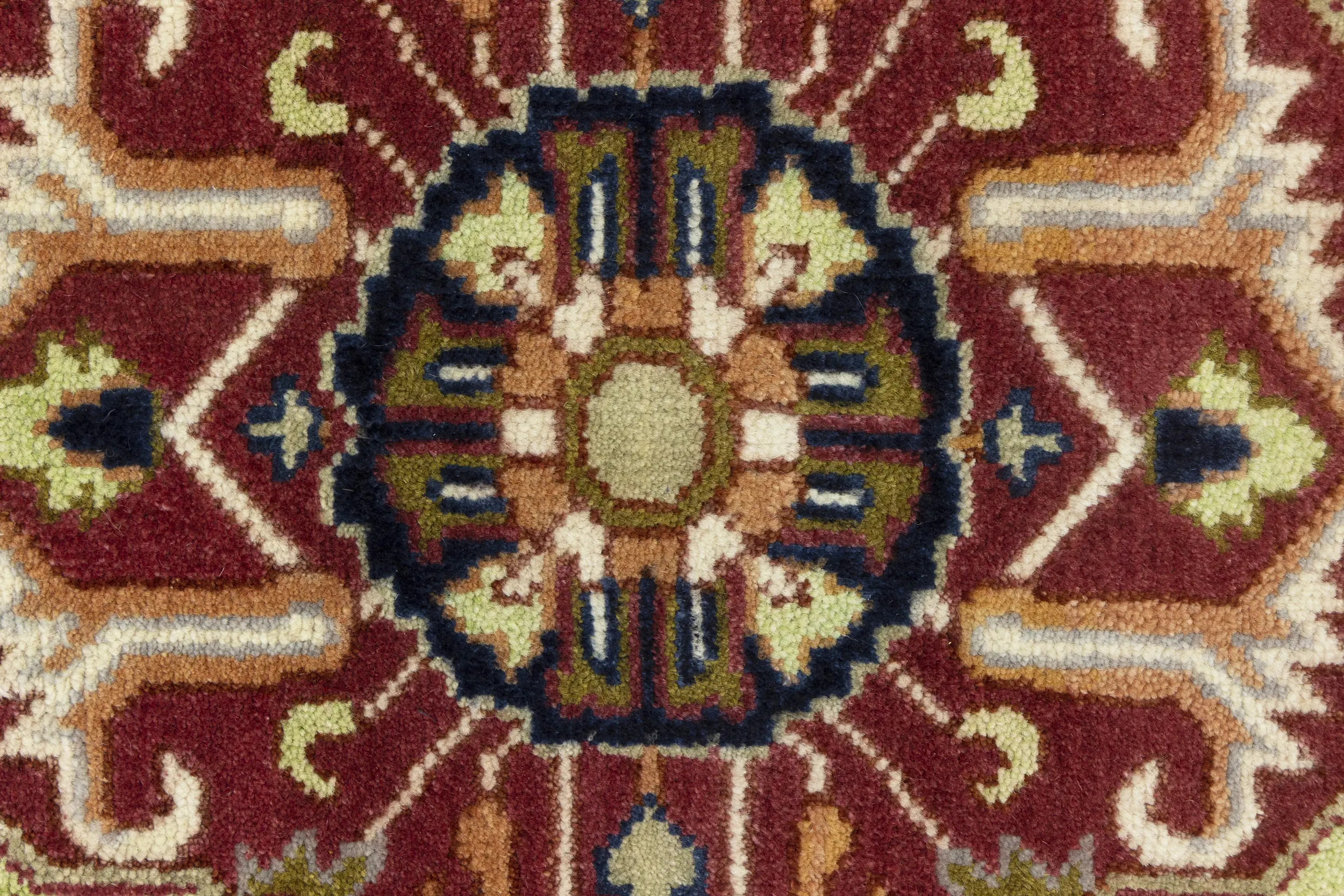 This original 8X10 red new Oriental rug was finely knotted by the hands of weavers influenced by a variety of amazing artistic designs, to recreate the aged look of the exceptional piece with a richness of color and embellished background field. What set this vintage style Oriental area rug from the others are the material and dye used (wool pile and cotton foundation), knot count, antique designs, fantastic grades, and its regional historical connection: it has deep roots, from the story of the people who produced it to the meaning of the symbols and colors displayed across its canvas that have been praised for centuries. This Indian home décor carpet will be completely cozy and inviting that never will go out of style!