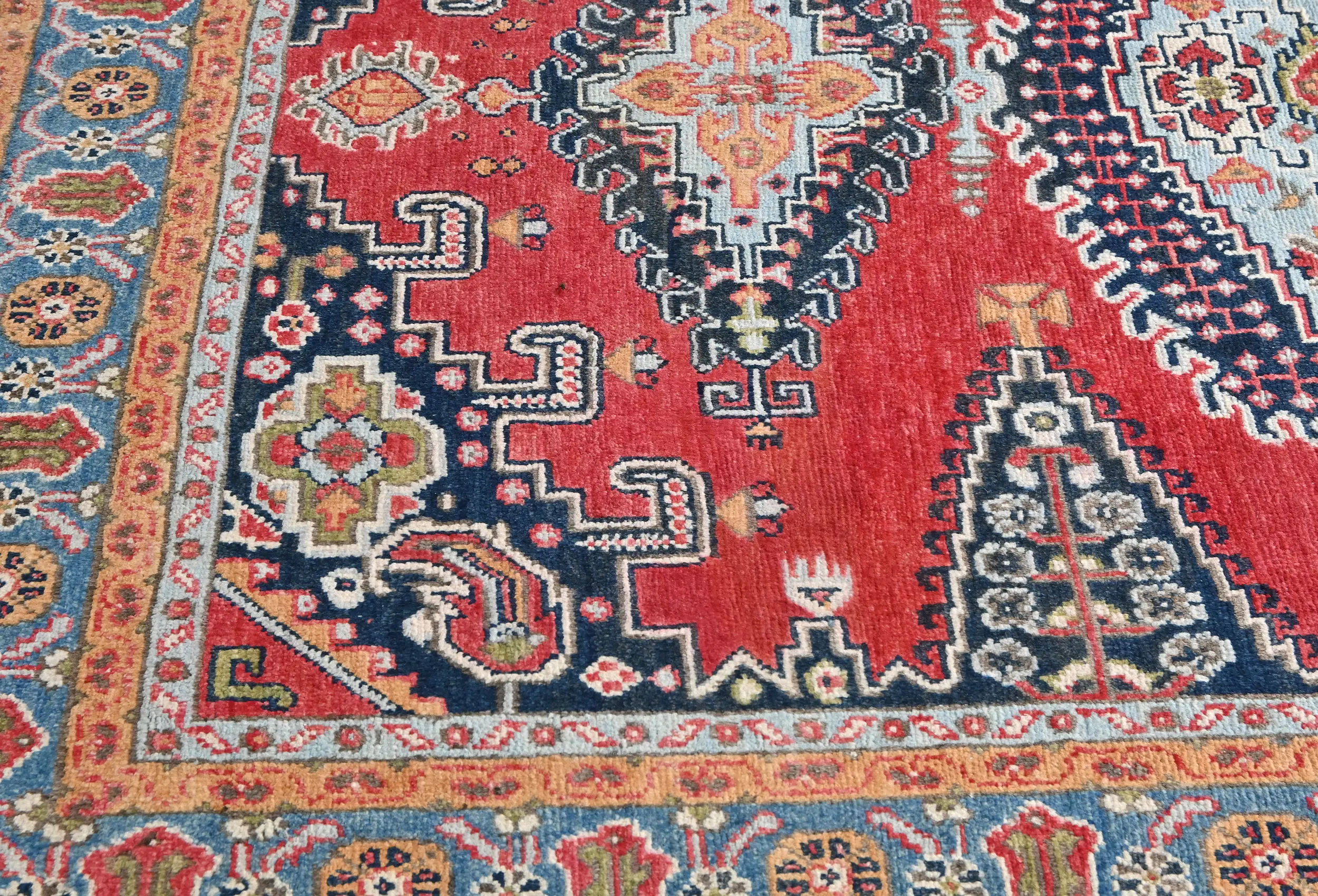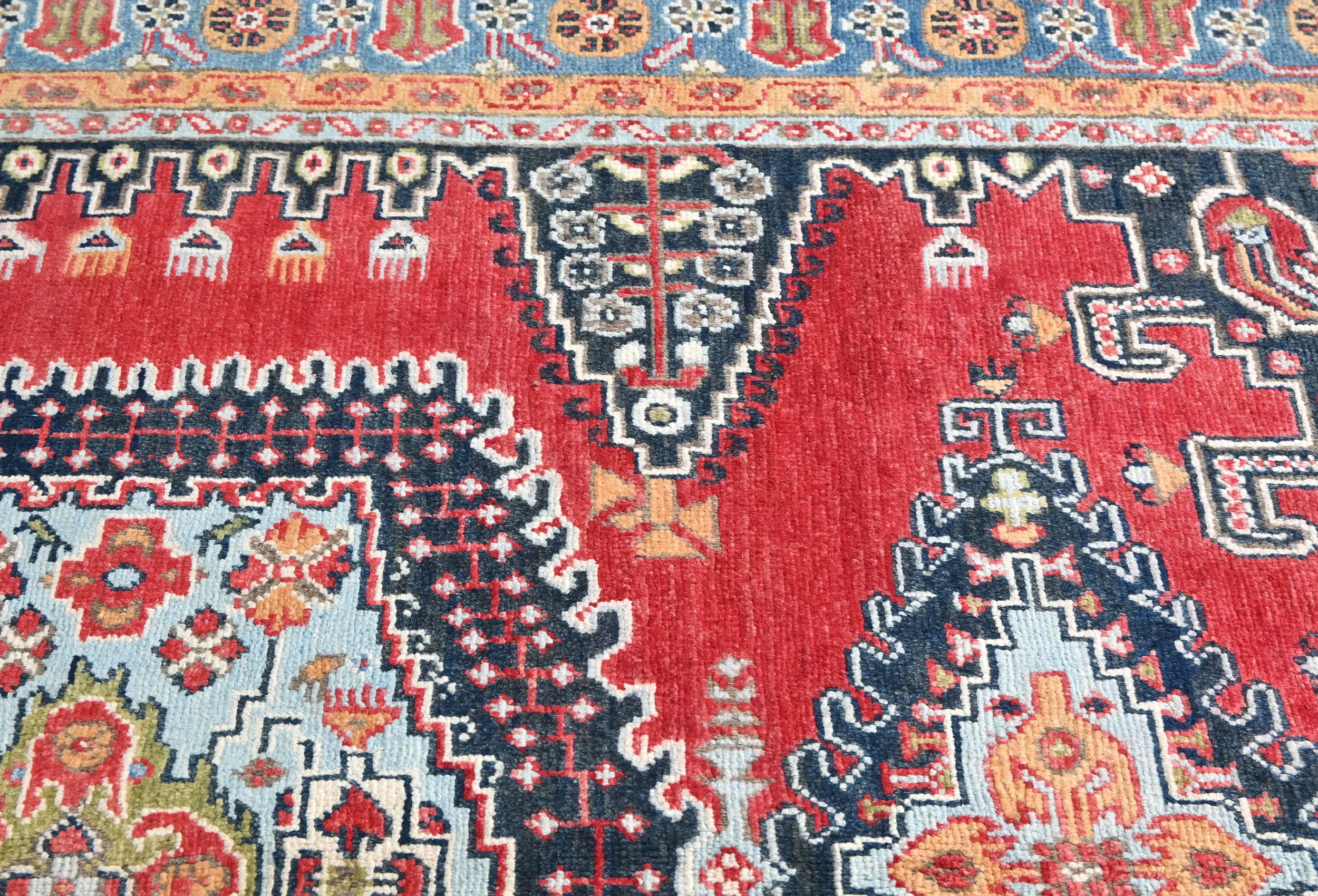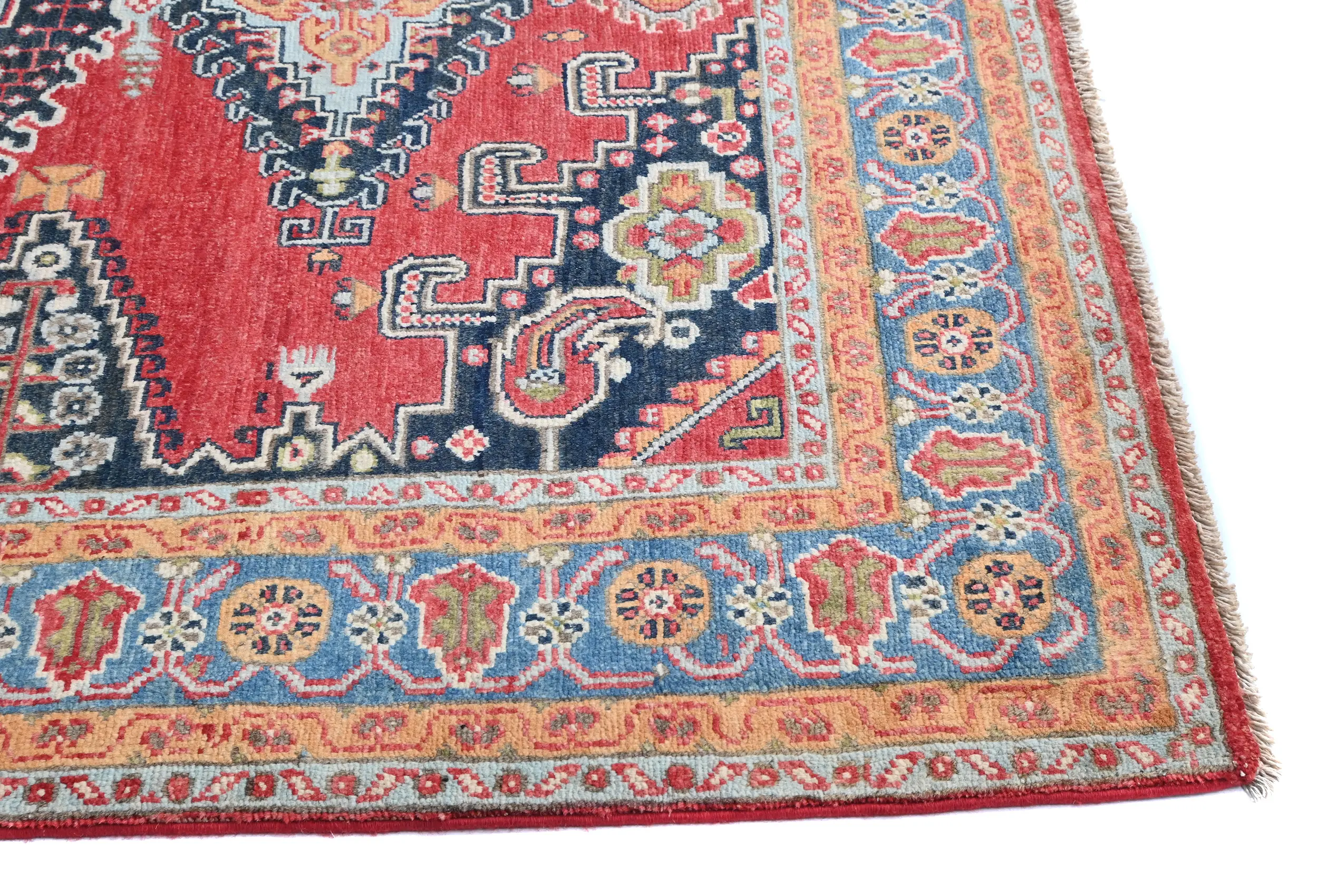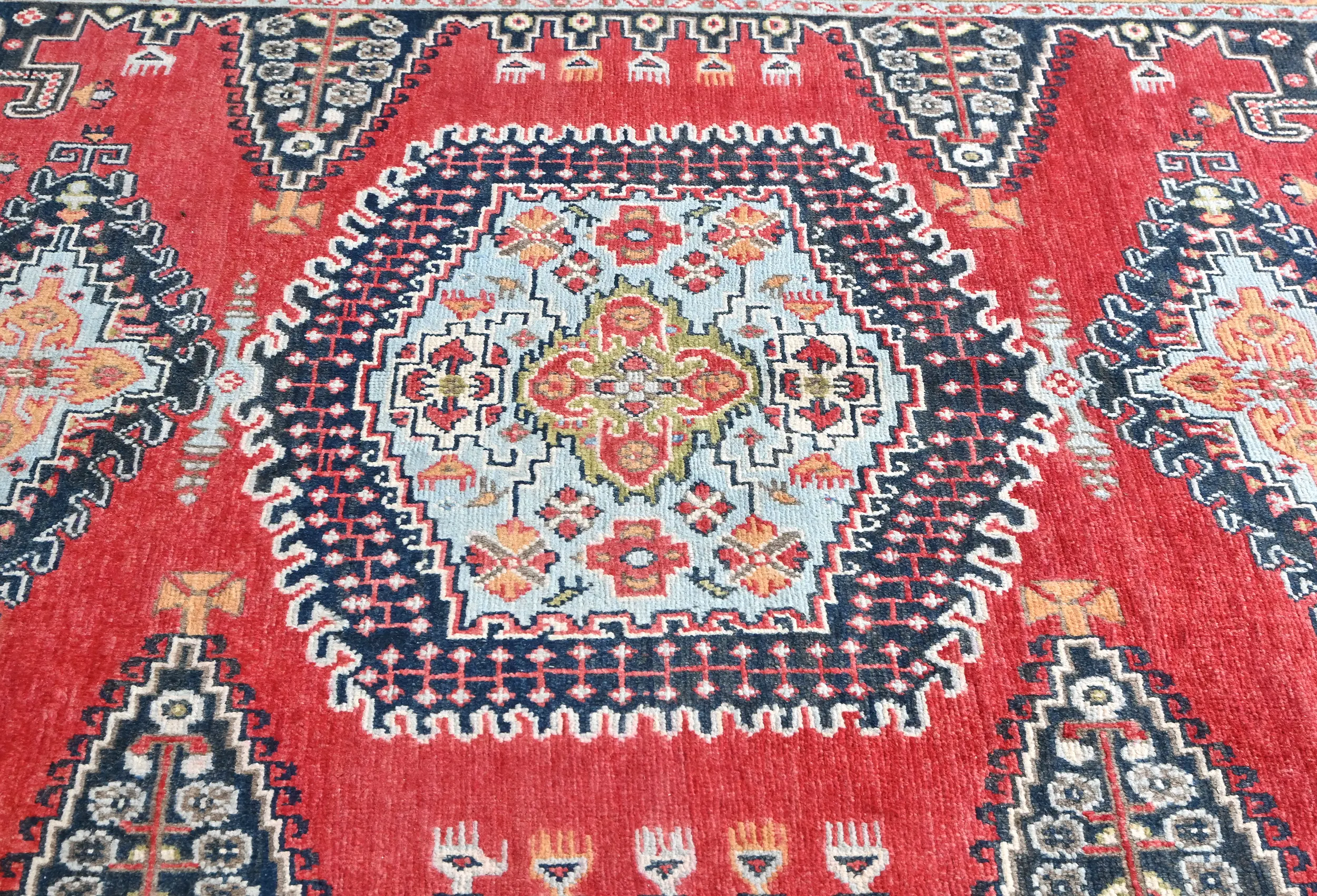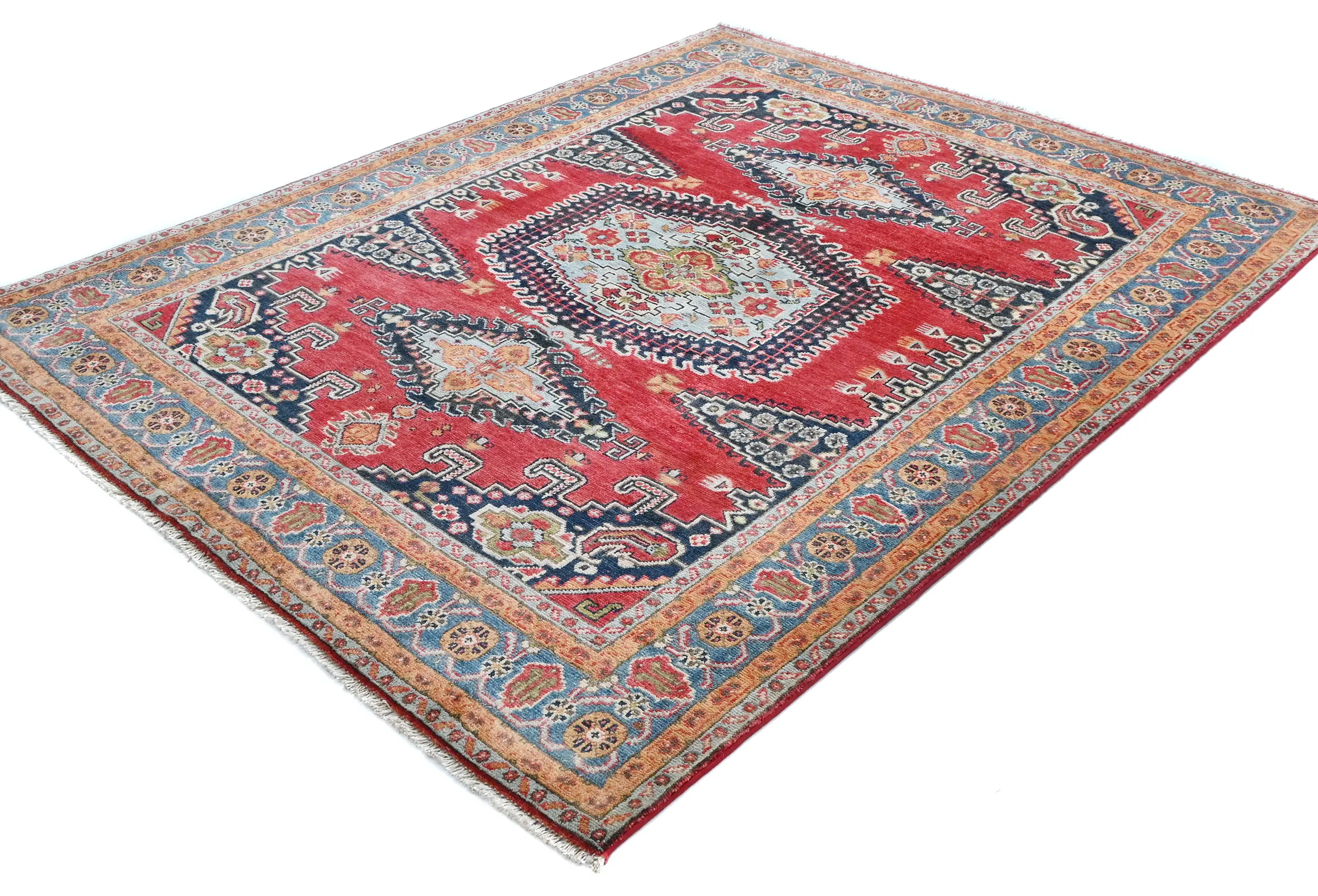 Hand Knotted 4'11X6'2 red Oriental rug made with vegetable dyes (fine wool pile and cotton foundation), exceptional knot count, and appealing ancient designs. This Oriental rug never will go out of style and would be among your most valuable treasures.
