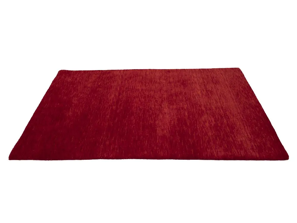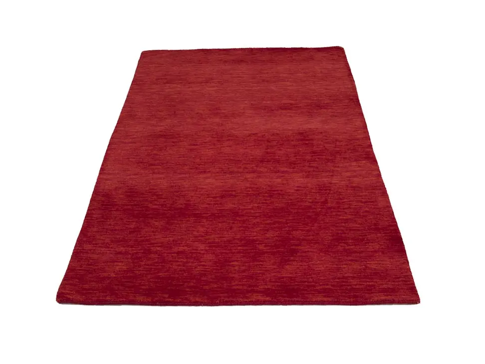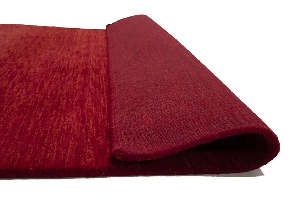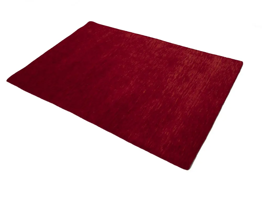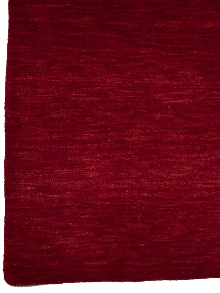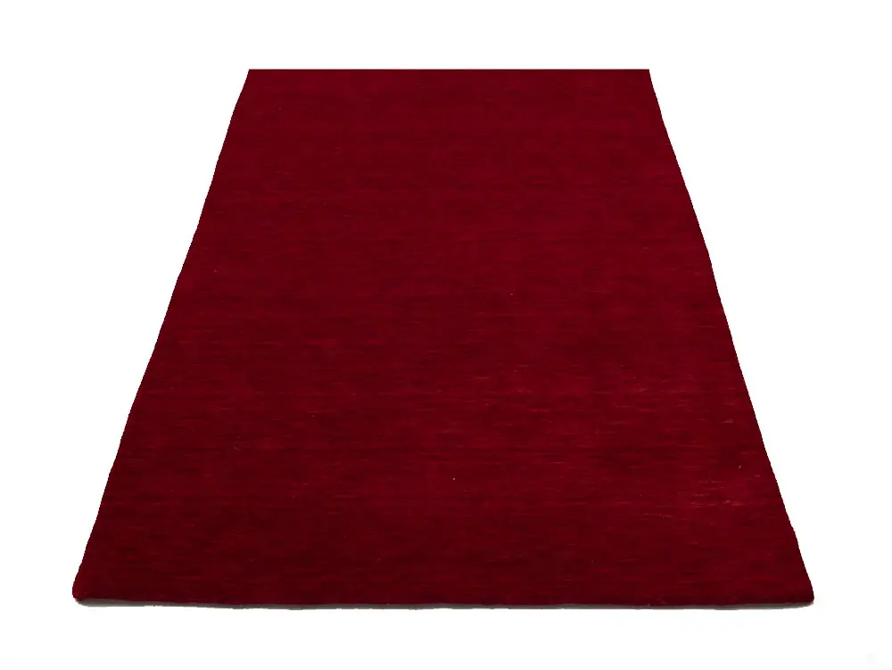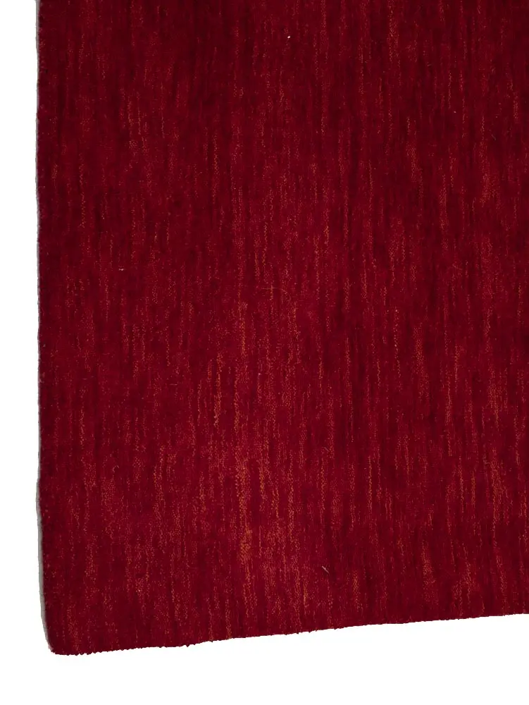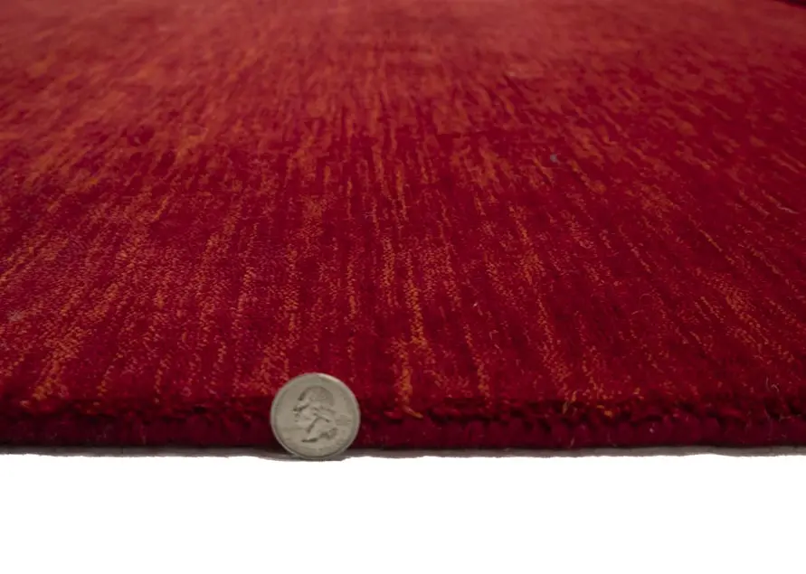 This hand-loomed 4X6 Red Oriental rug from India features a modern, Solid design that seamlessly integrates traditional craftsmanship with contemporary style, showcasing a striking Cherry Red primary color. It provides a luxuriant softness and durability underfoot, as it is constructed from premium wool with a cotton foundation. The rug is optimized for high-traffic areas due to its medium pile height and knot density of 100 knots per square inch, which ensures durability and comfort. This rug, which is in exceptional condition and was recently manufactured, is an ideal complement to any contemporary setting, providing both versatility and timeless elegance.