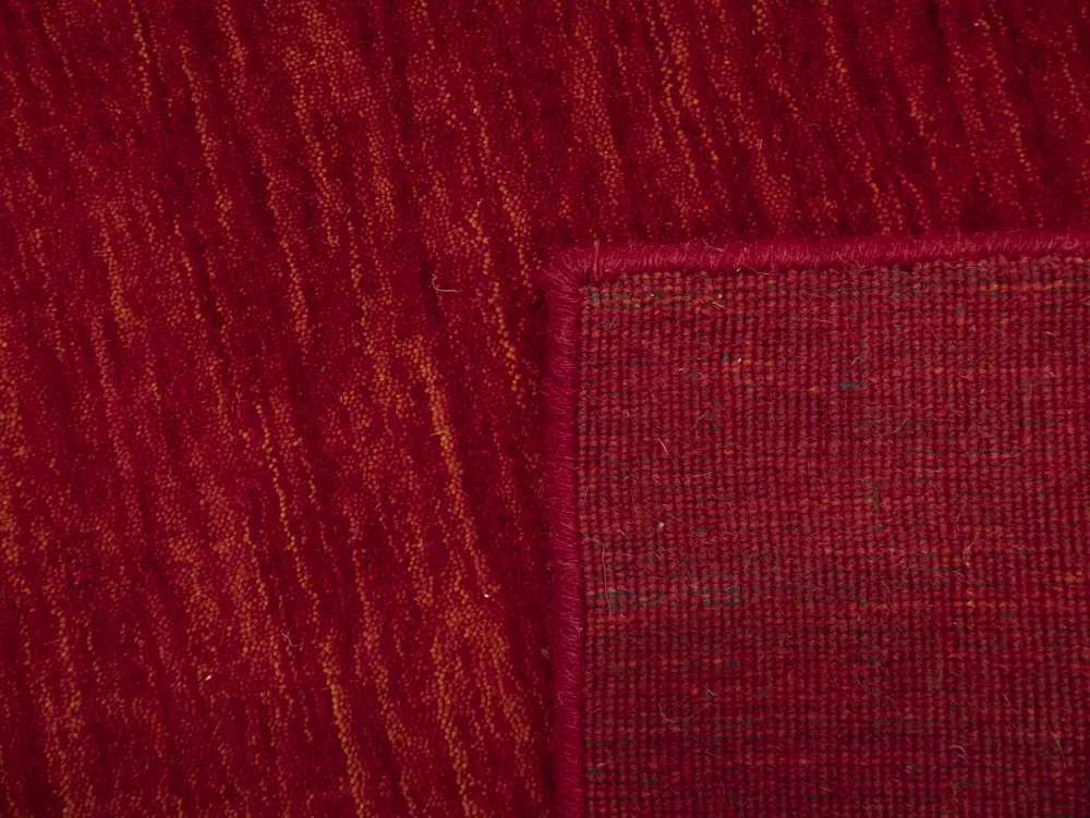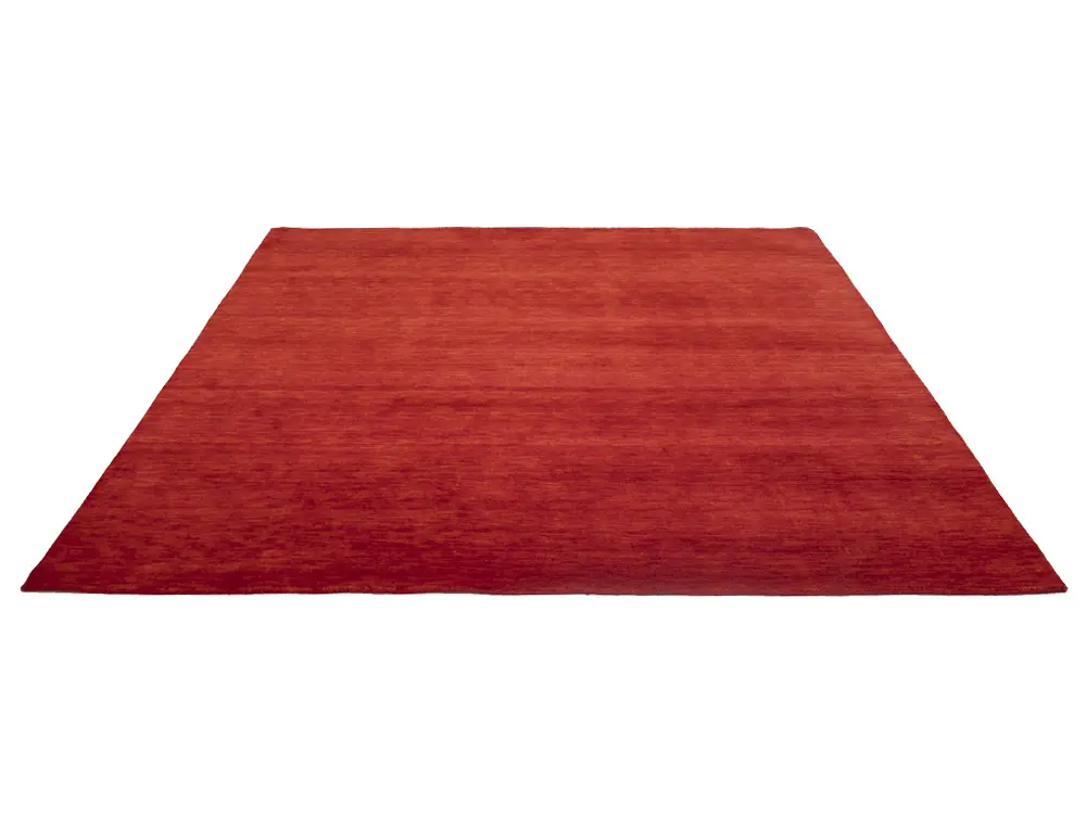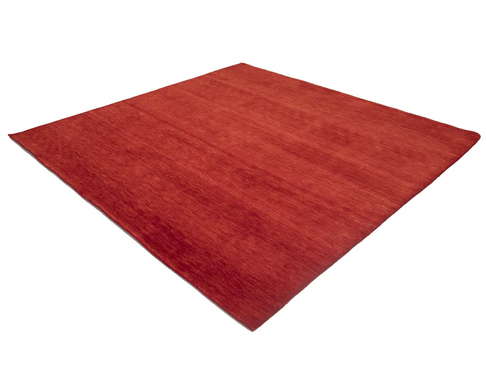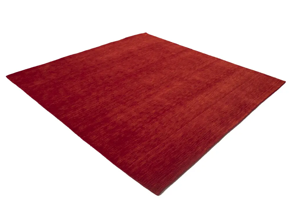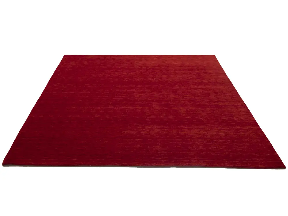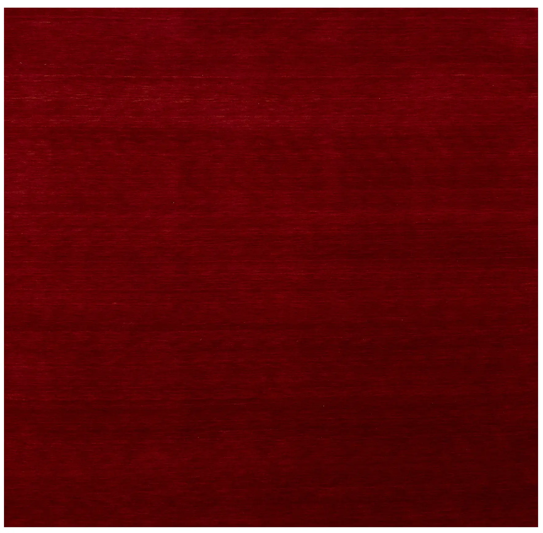 This hand-loomed 8X8 Red Oriental Square rug from India features a modern, Solid design that seamlessly integrates traditional craftsmanship with contemporary style, showcasing a striking Cherry Red primary color. It provides a luxuriant softness and durability underfoot, as it is constructed from premium wool with a cotton foundation. The rug is optimized for high-traffic areas due to its medium pile height and knot density of 100 knots per square inch, which ensures durability and comfort. This rug, which is in exceptional condition and was recently manufactured, is an ideal complement to any contemporary setting, providing both versatility and timeless elegance.