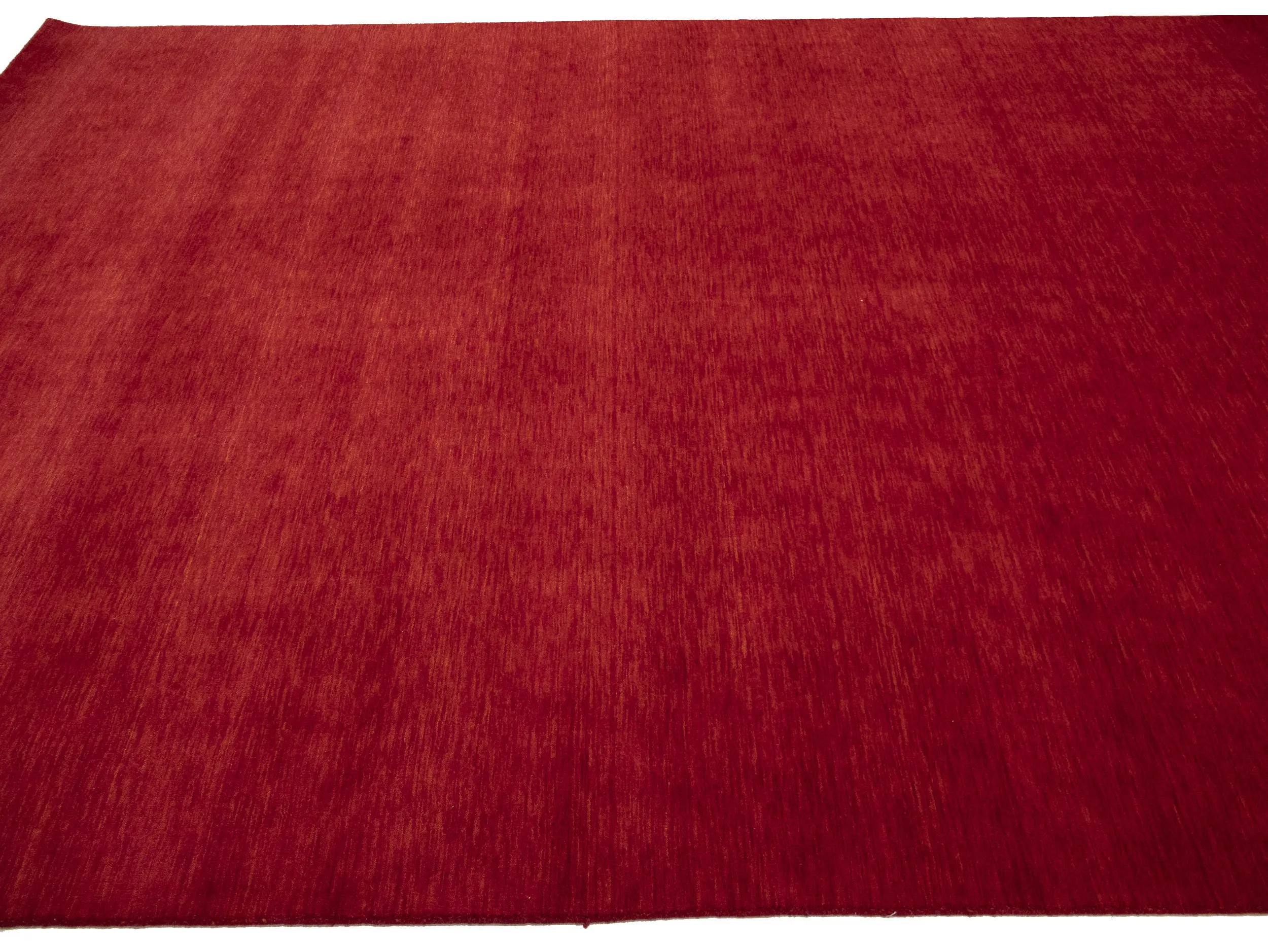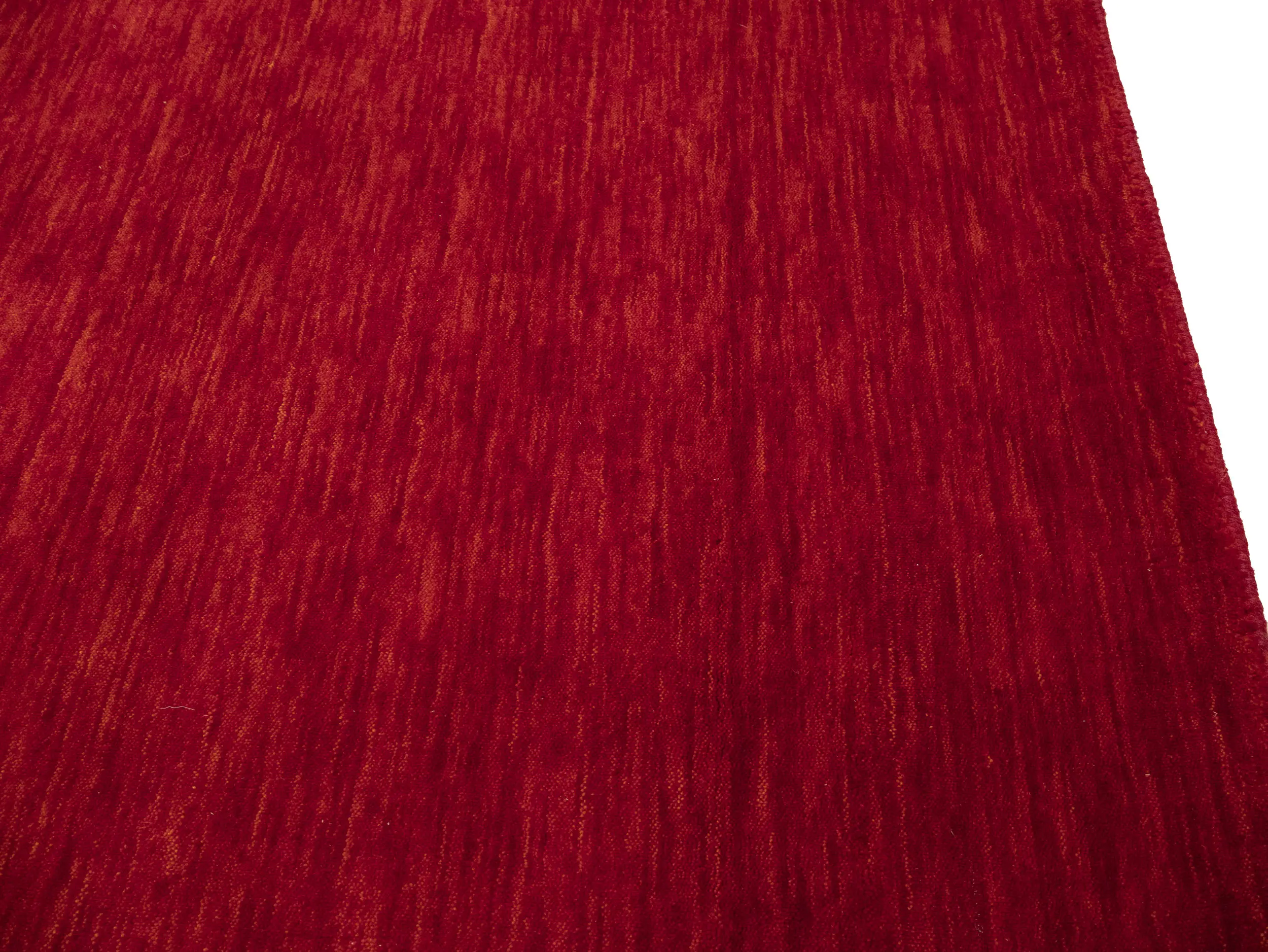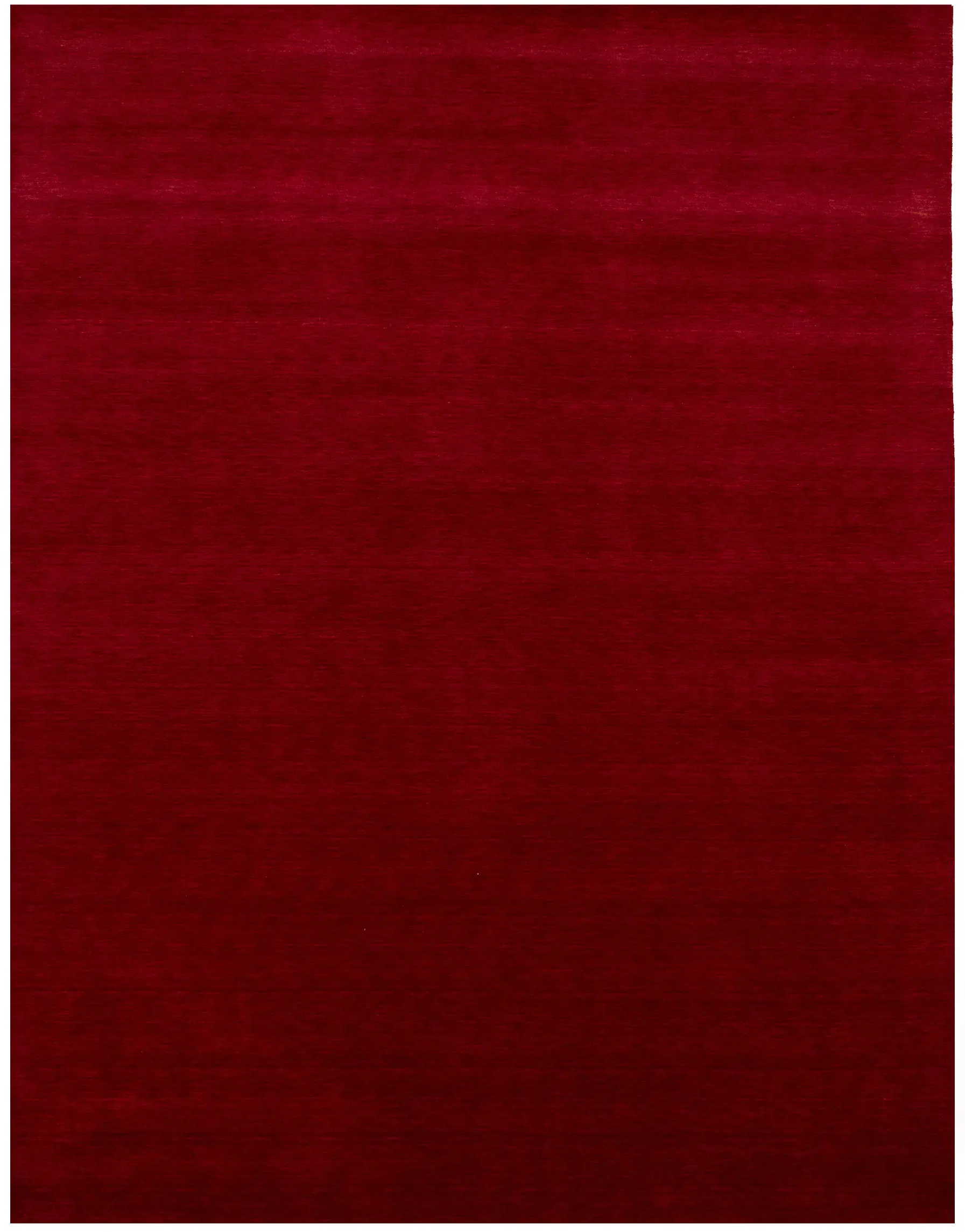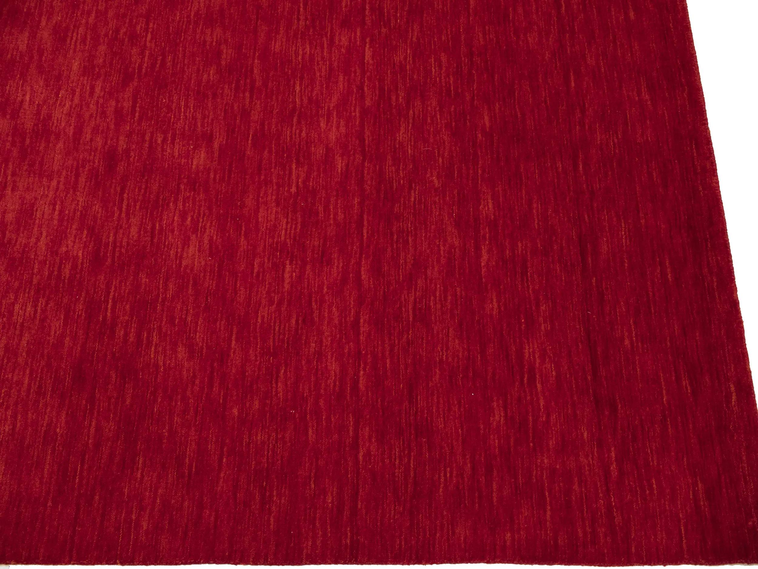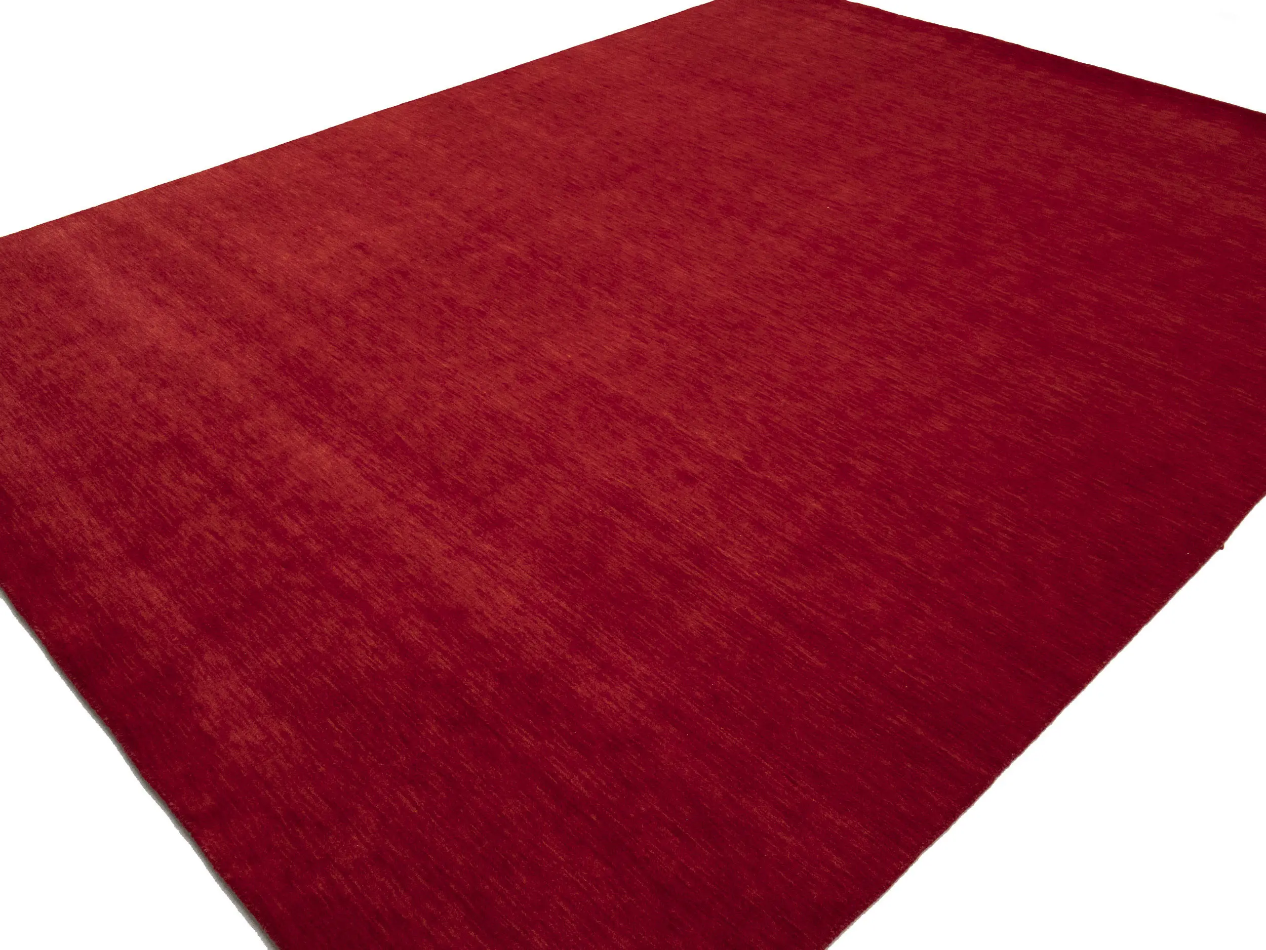 This hand-loomed 9X12 Red Oriental rug from India features a modern, Solid design that seamlessly integrates traditional craftsmanship with contemporary style, showcasing a striking Cherry Red primary color. It provides a luxuriant softness and durability underfoot, as it is constructed from premium wool with a cotton foundation. The rug is optimized for high-traffic areas due to its medium pile height and knot density of 100 knots per square inch, which ensures durability and comfort. This rug, which is in exceptional condition and was recently manufactured, is an ideal complement to any contemporary setting, providing both versatility and timeless elegance.