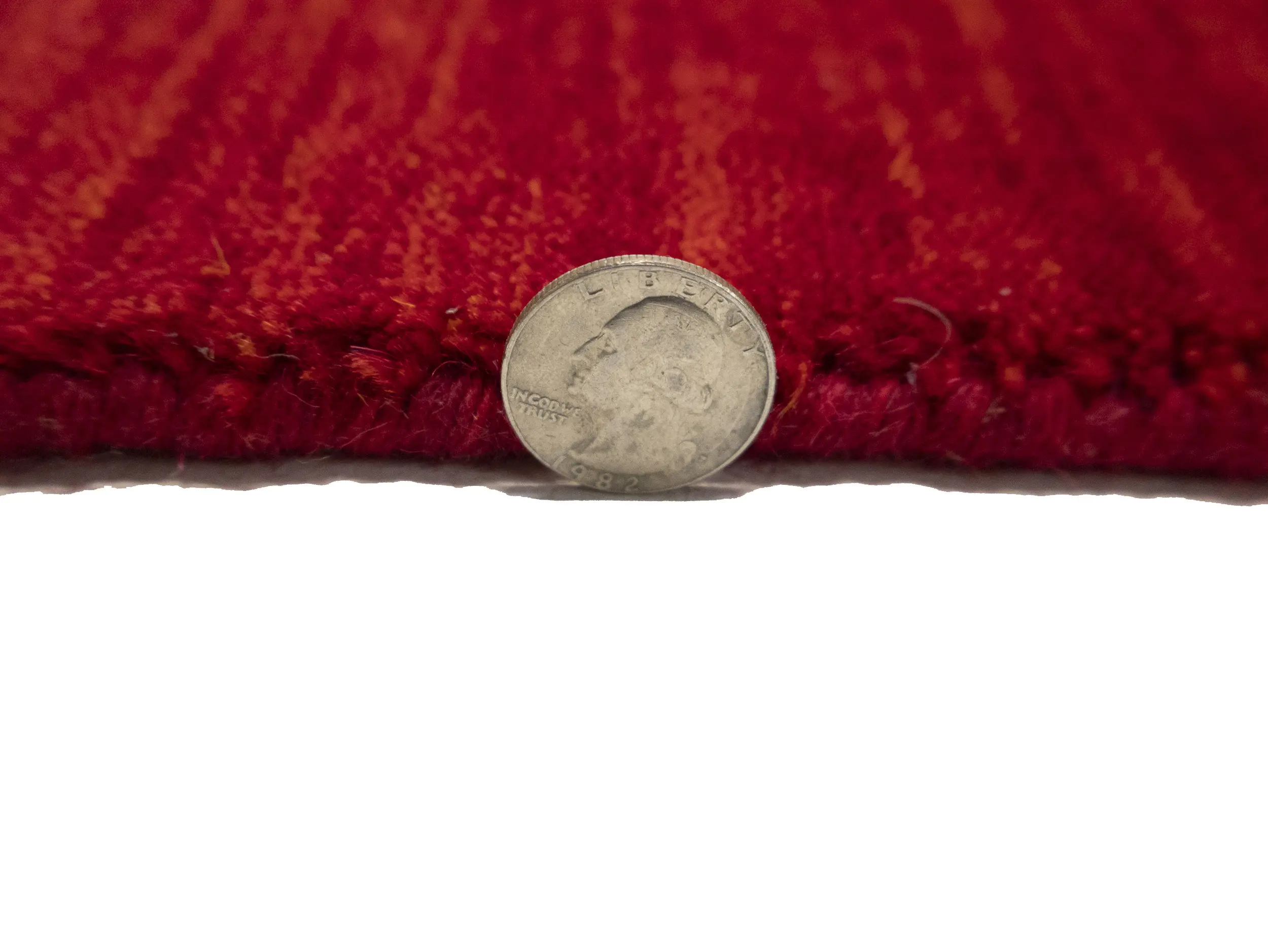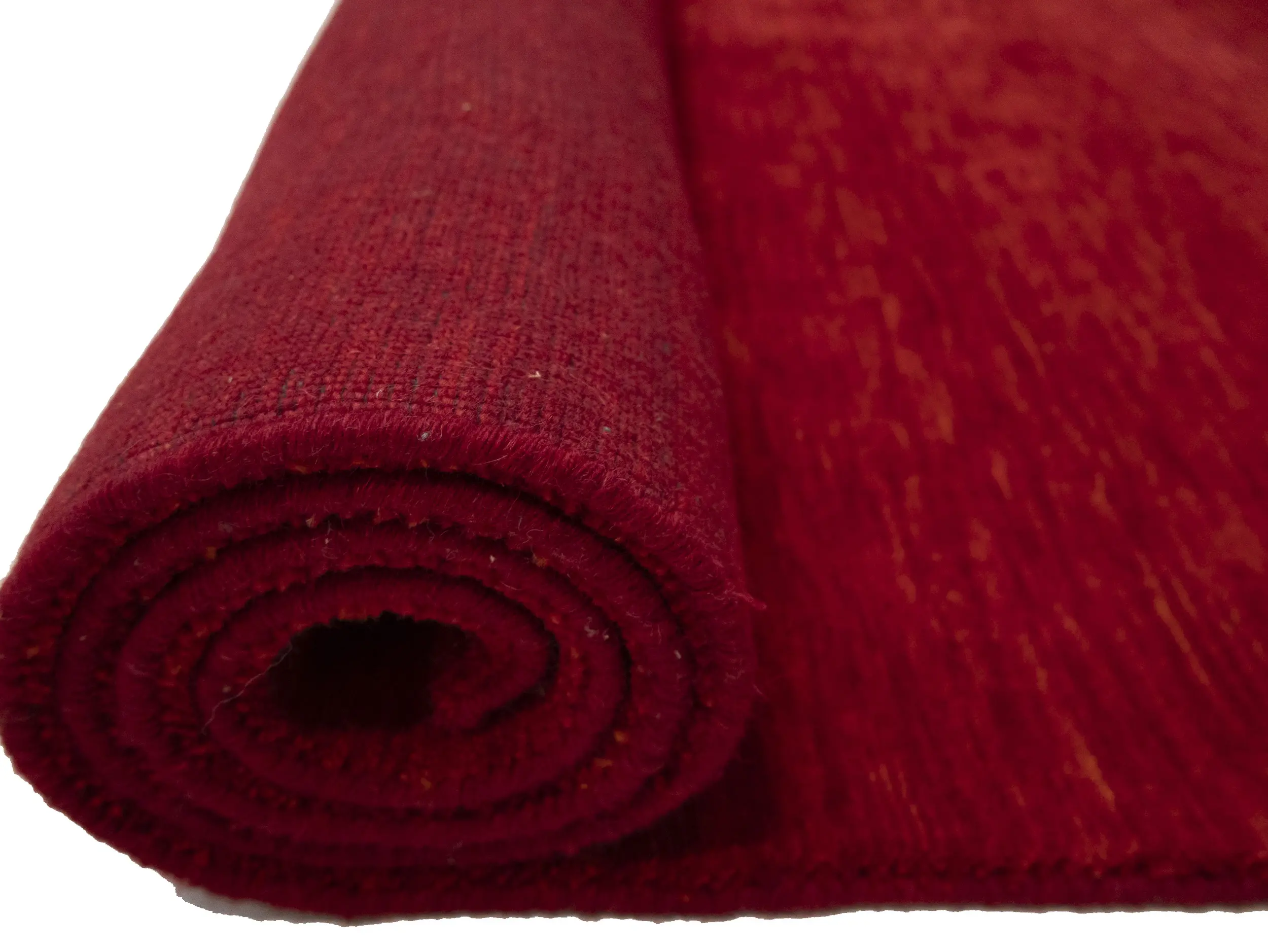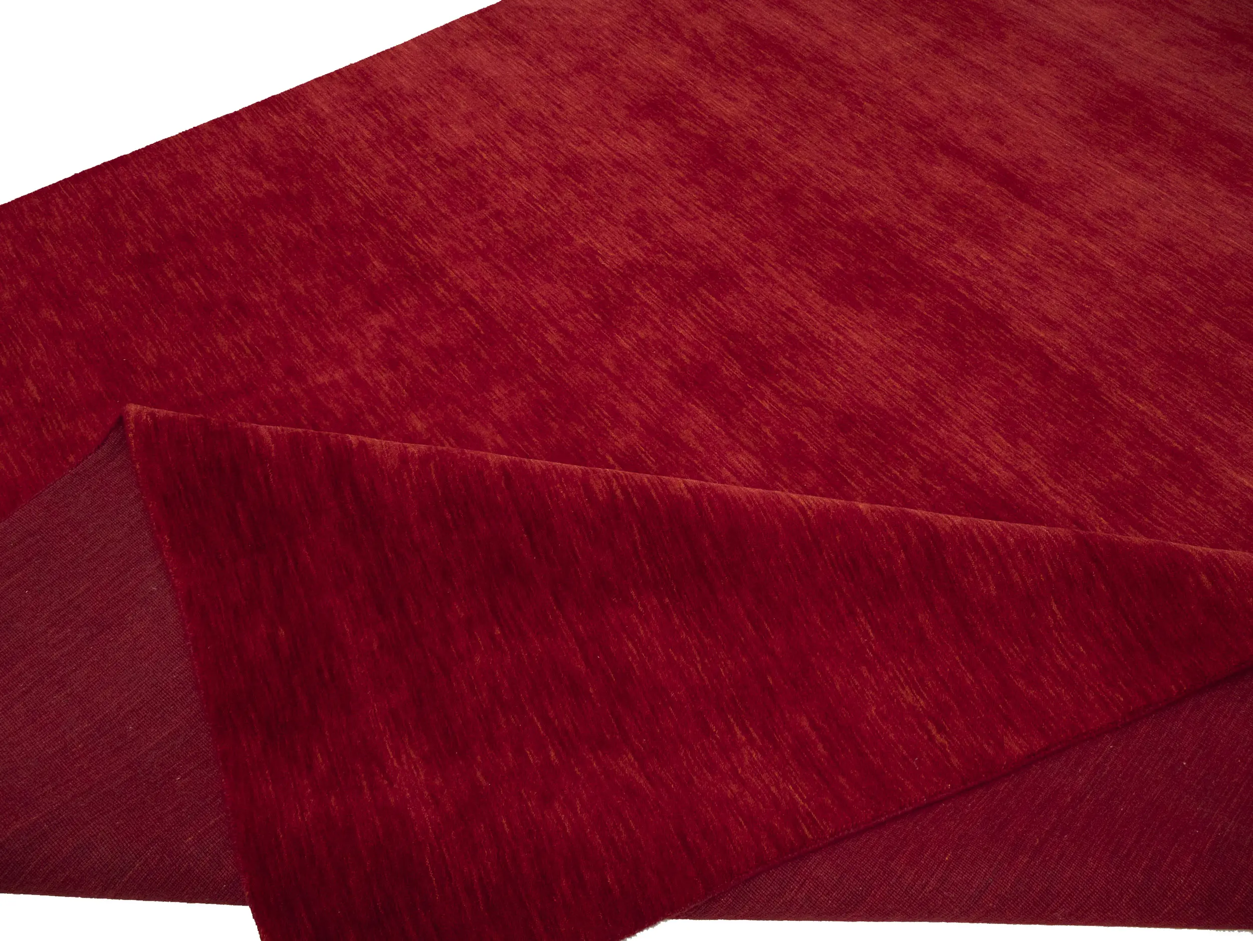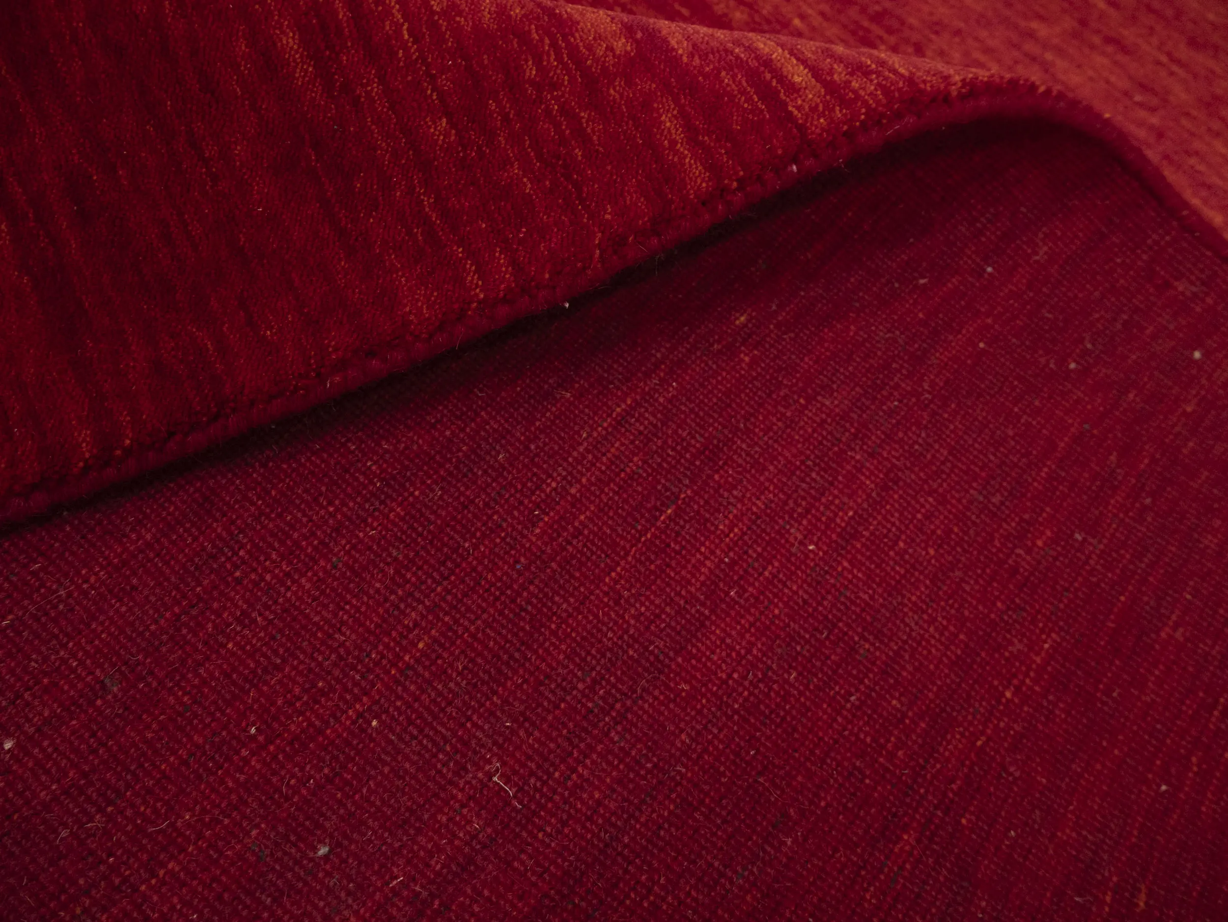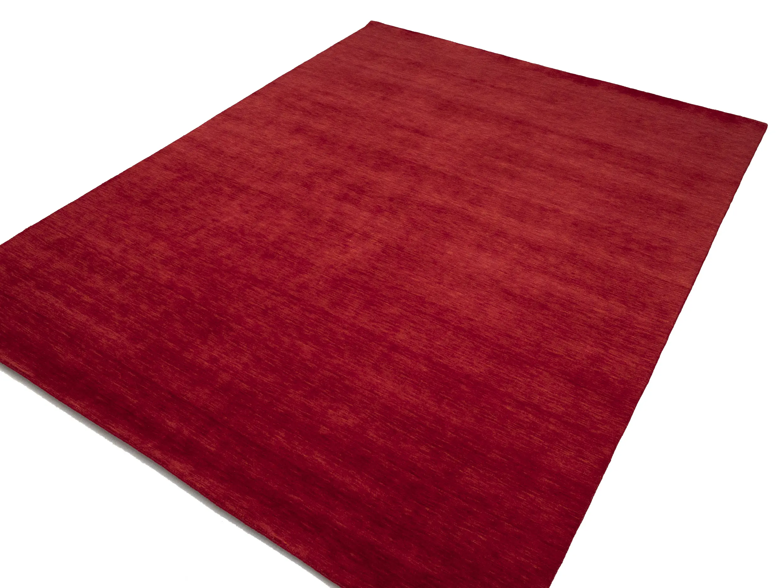 This hand-loomed 9X12 Red Oriental rug from India features a modern, Solid design that seamlessly integrates traditional craftsmanship with contemporary style, showcasing a striking Cherry Red primary color. It provides a luxuriant softness and durability underfoot, as it is constructed from premium wool with a cotton foundation. The rug is optimized for high-traffic areas due to its medium pile height and knot density of 100 knots per square inch, which ensures durability and comfort. This rug, which is in exceptional condition and was recently manufactured, is an ideal complement to any contemporary setting, providing both versatility and timeless elegance.
