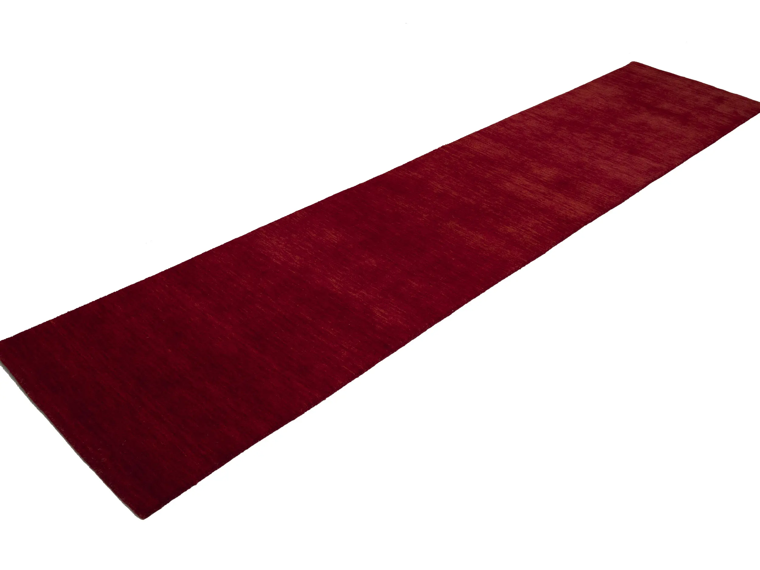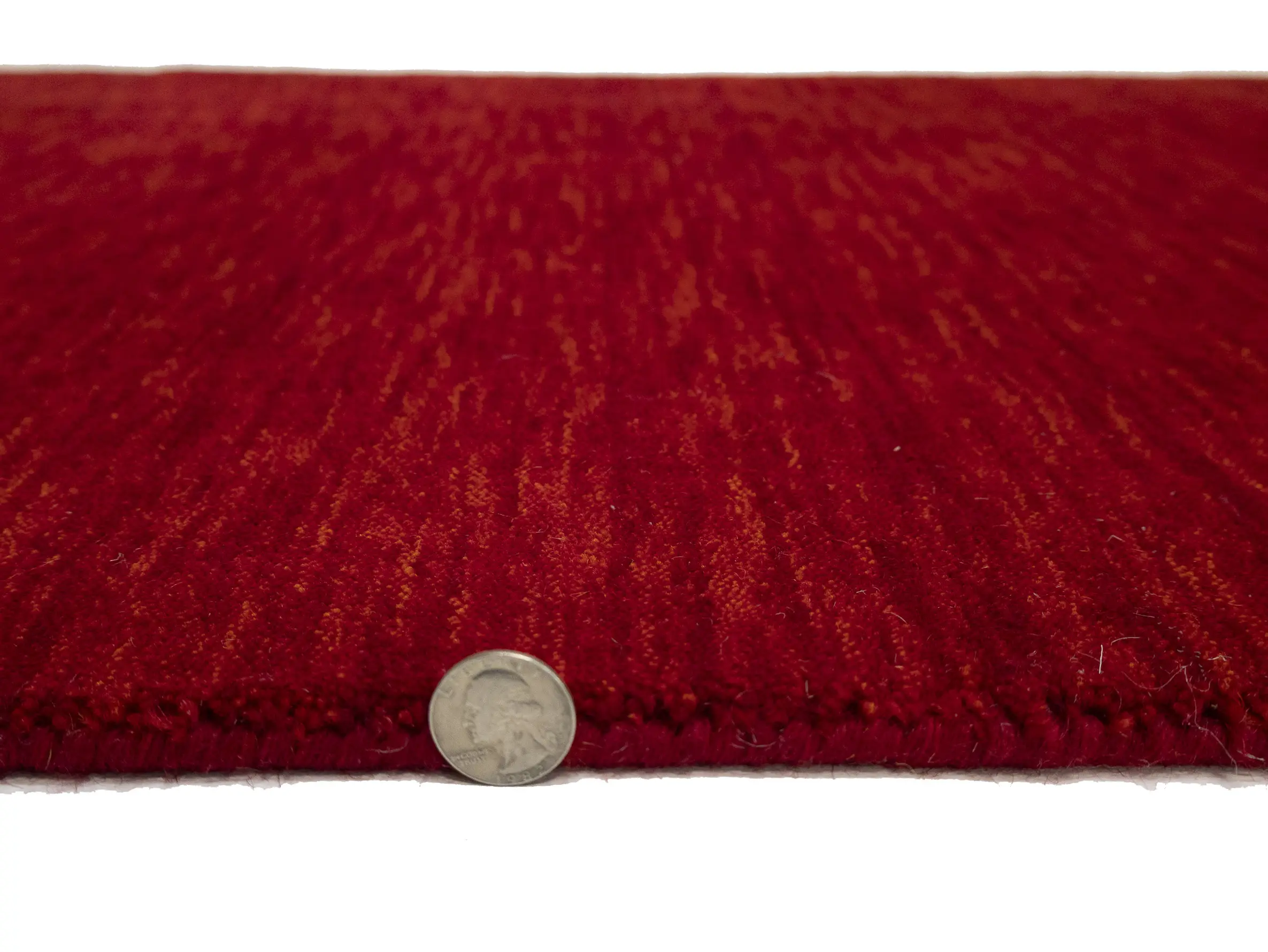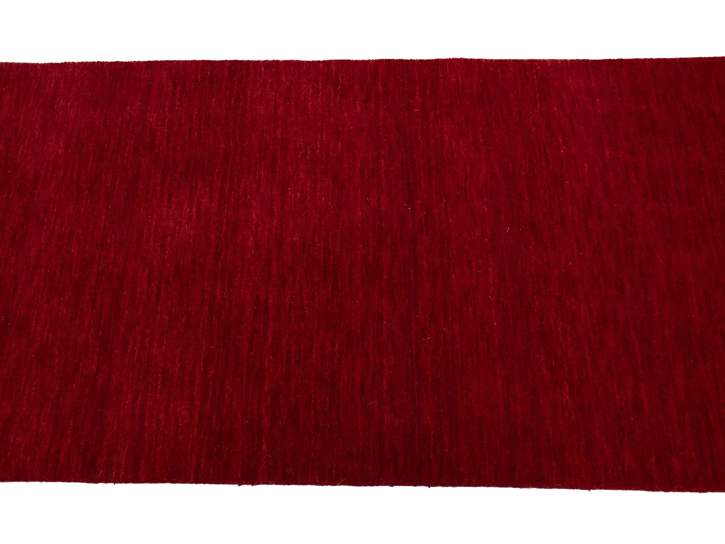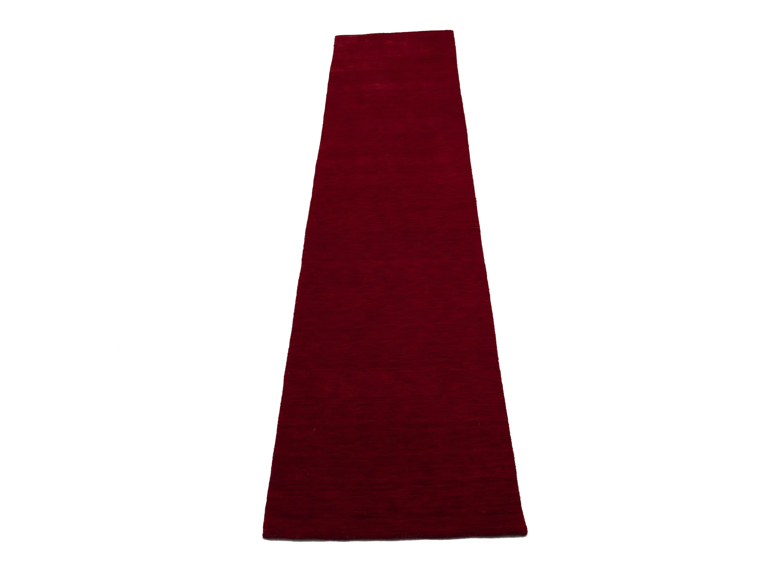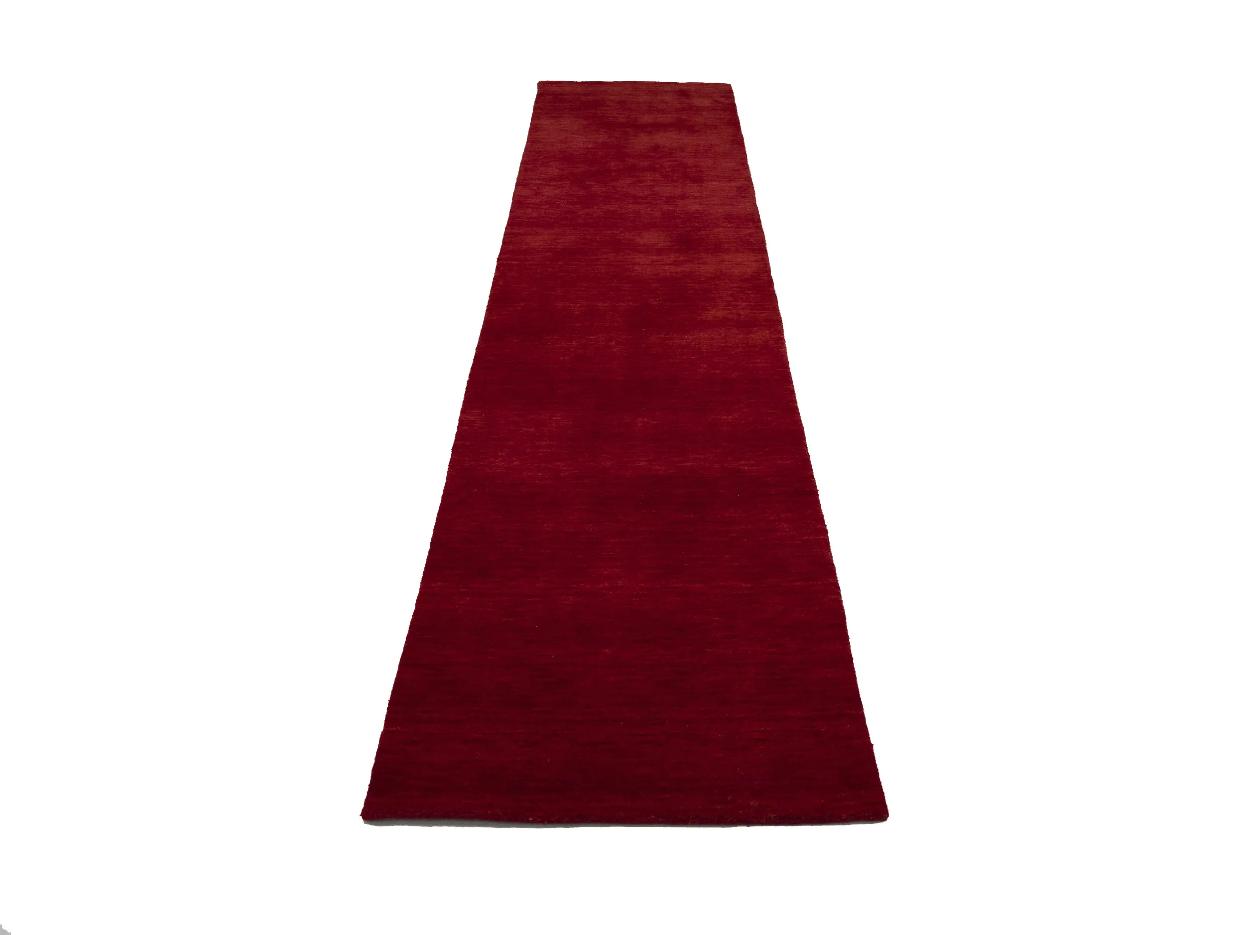This hand-loomed 3X12 Red Oriental Runner rug from India features a modern, Solid design that seamlessly integrates traditional craftsmanship with contemporary style, showcasing a striking Cherry Red primary color. It provides a luxuriant softness and durability underfoot, as it is constructed from premium wool with a cotton foundation. The rug is optimized for high-traffic areas due to its medium pile height and knot density of 100 knots per square inch, which ensures durability and comfort. This rug, which is in exceptional condition and was recently manufactured, is an ideal complement to any contemporary setting, providing both versatility and timeless elegance.