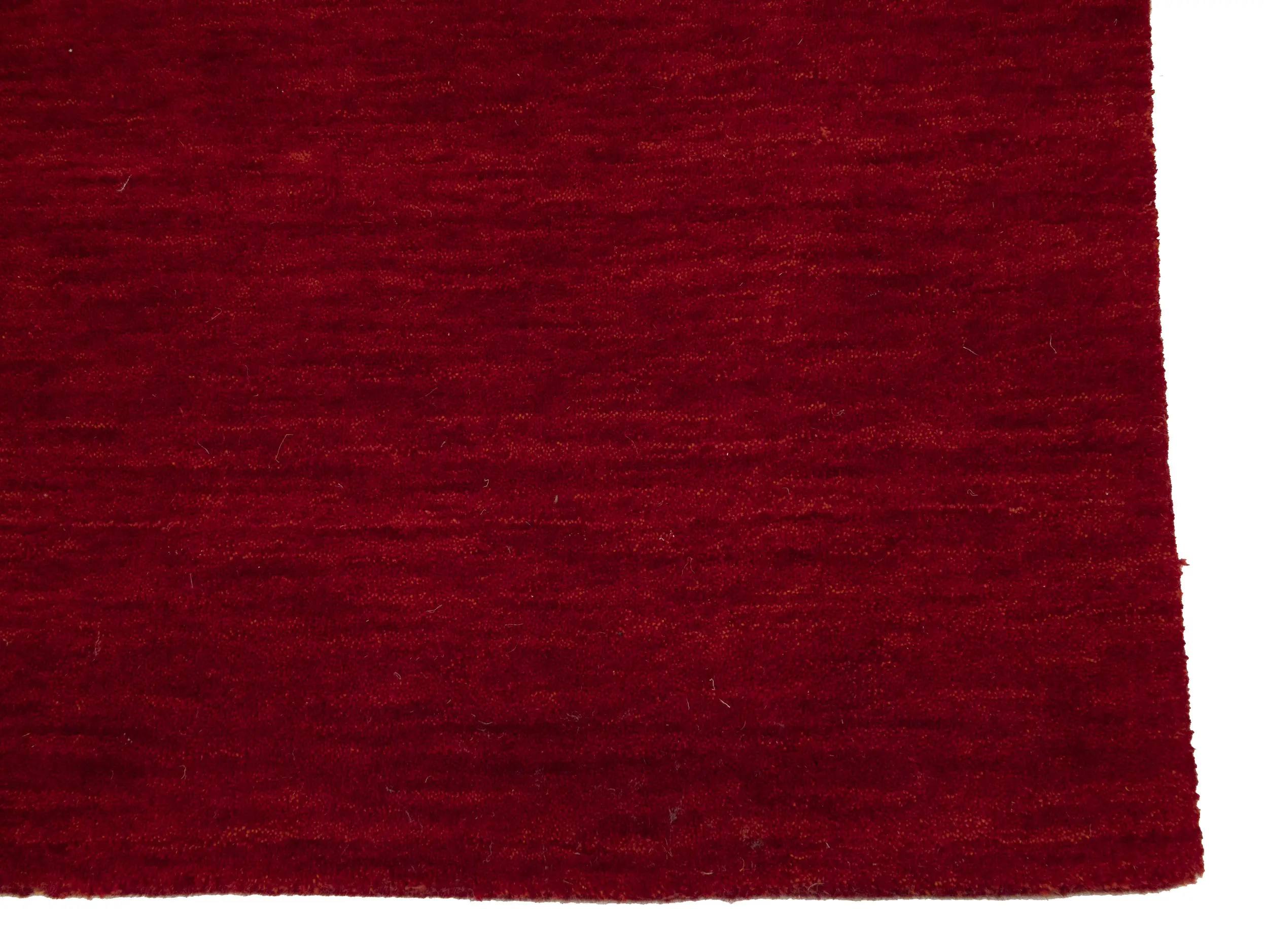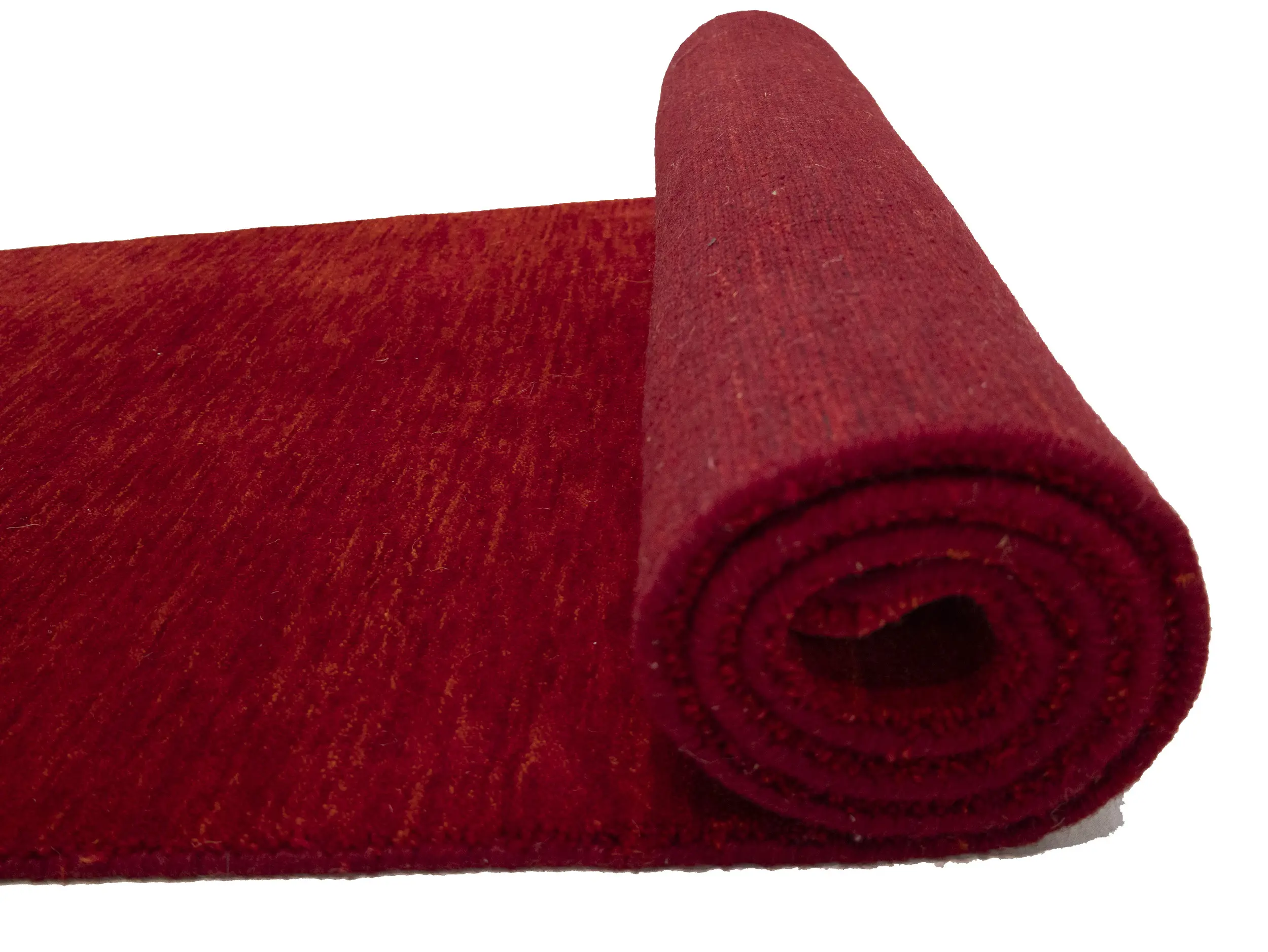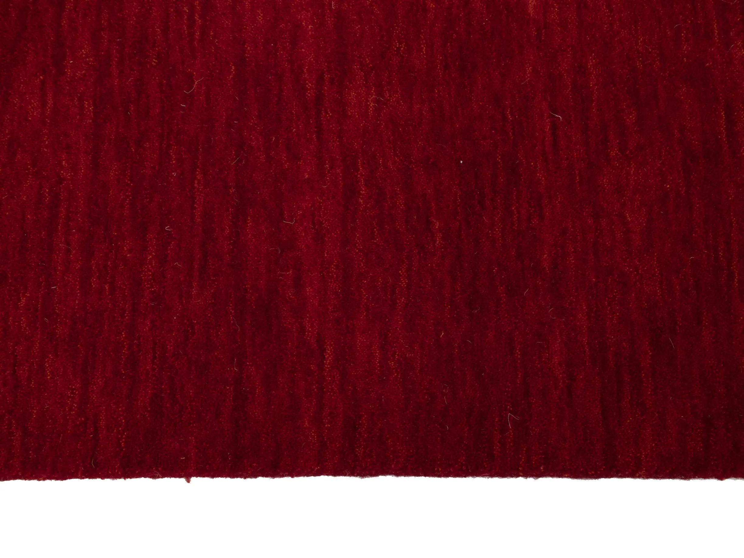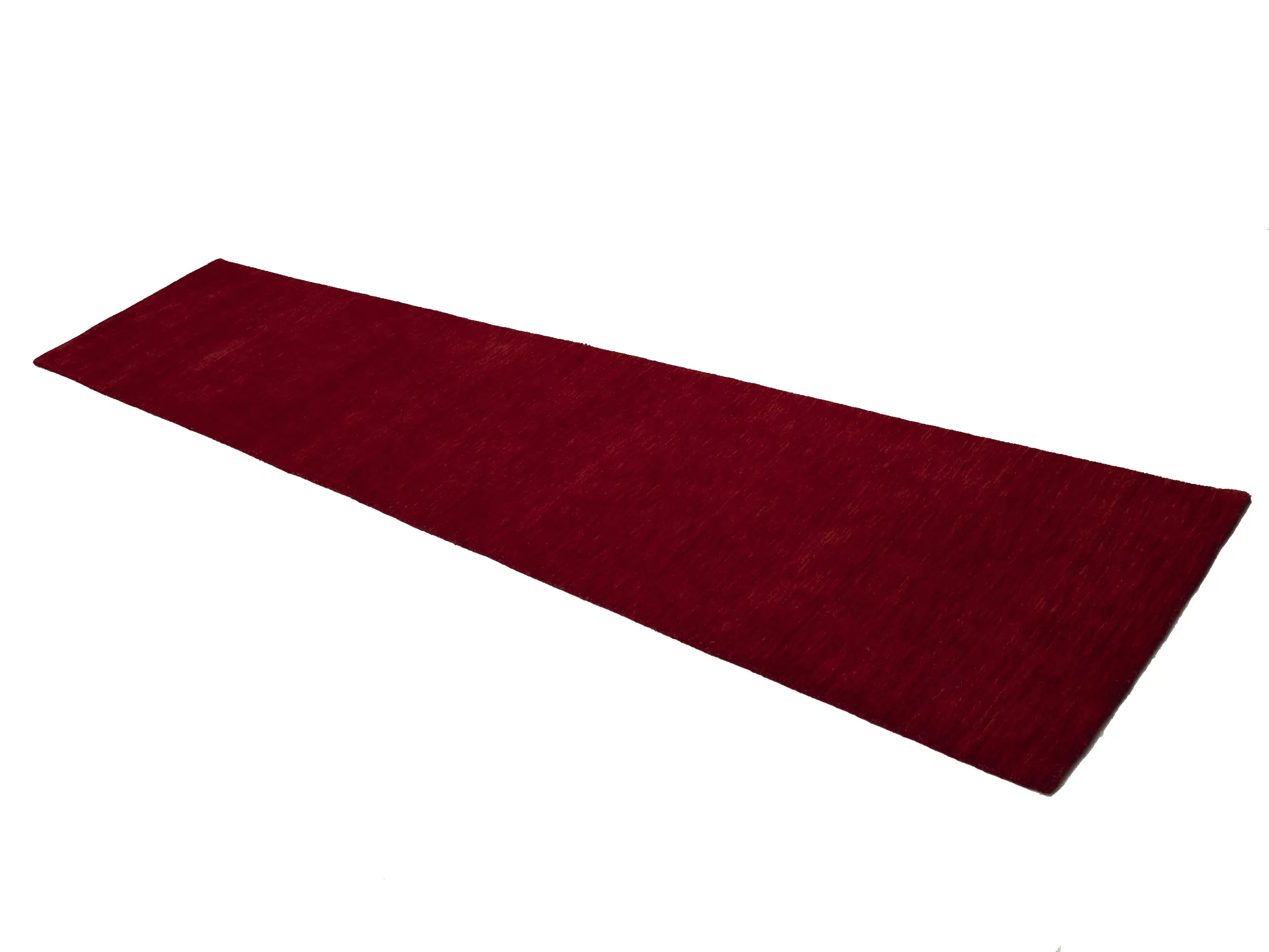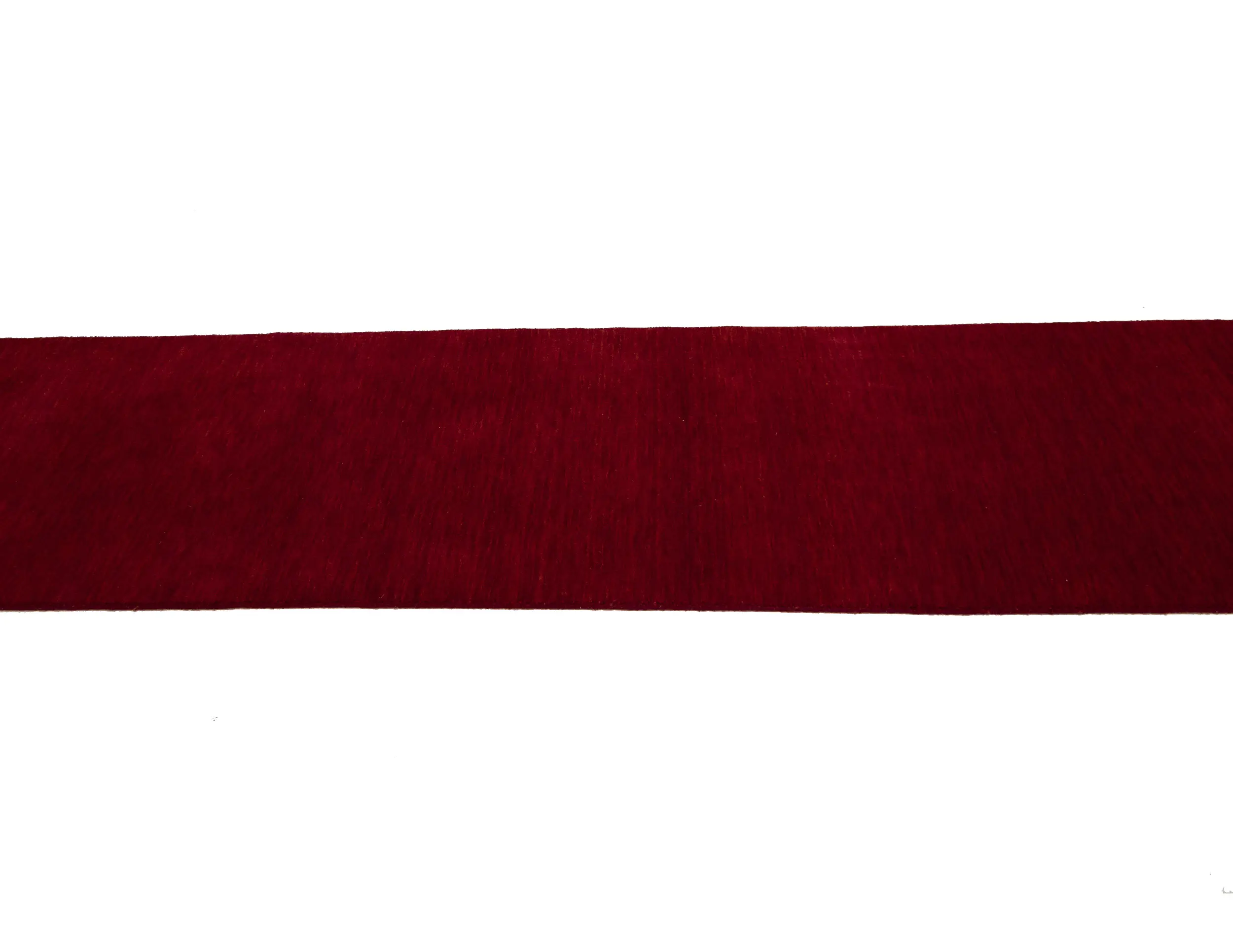 This hand-loomed 3X12 Red Oriental Runner rug from India features a modern, Solid design that seamlessly integrates traditional craftsmanship with contemporary style, showcasing a striking Cherry Red primary color. It provides a luxuriant softness and durability underfoot, as it is constructed from premium wool with a cotton foundation. The rug is optimized for high-traffic areas due to its medium pile height and knot density of 100 knots per square inch, which ensures durability and comfort. This rug, which is in exceptional condition and was recently manufactured, is an ideal complement to any contemporary setting, providing both versatility and timeless elegance.