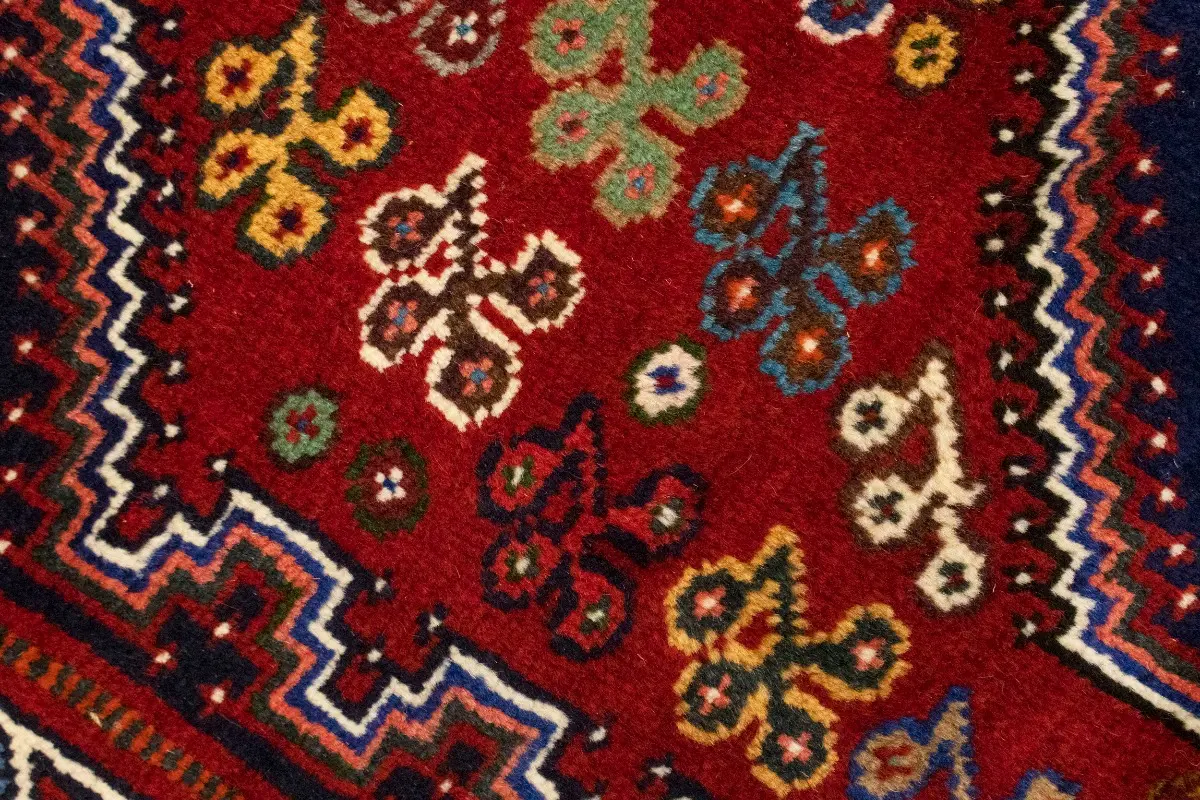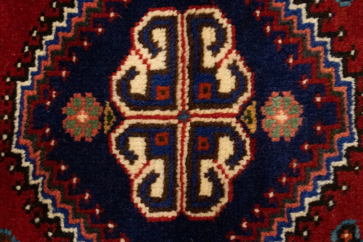 Handmade 3'3X4'7 red Persian rug made with vegetable dyes (fine wool pile and cotton foundation), superior knot count, and appealing ancient designs. This Oriental rug never will go out of style and would be among your most valuable treasures.