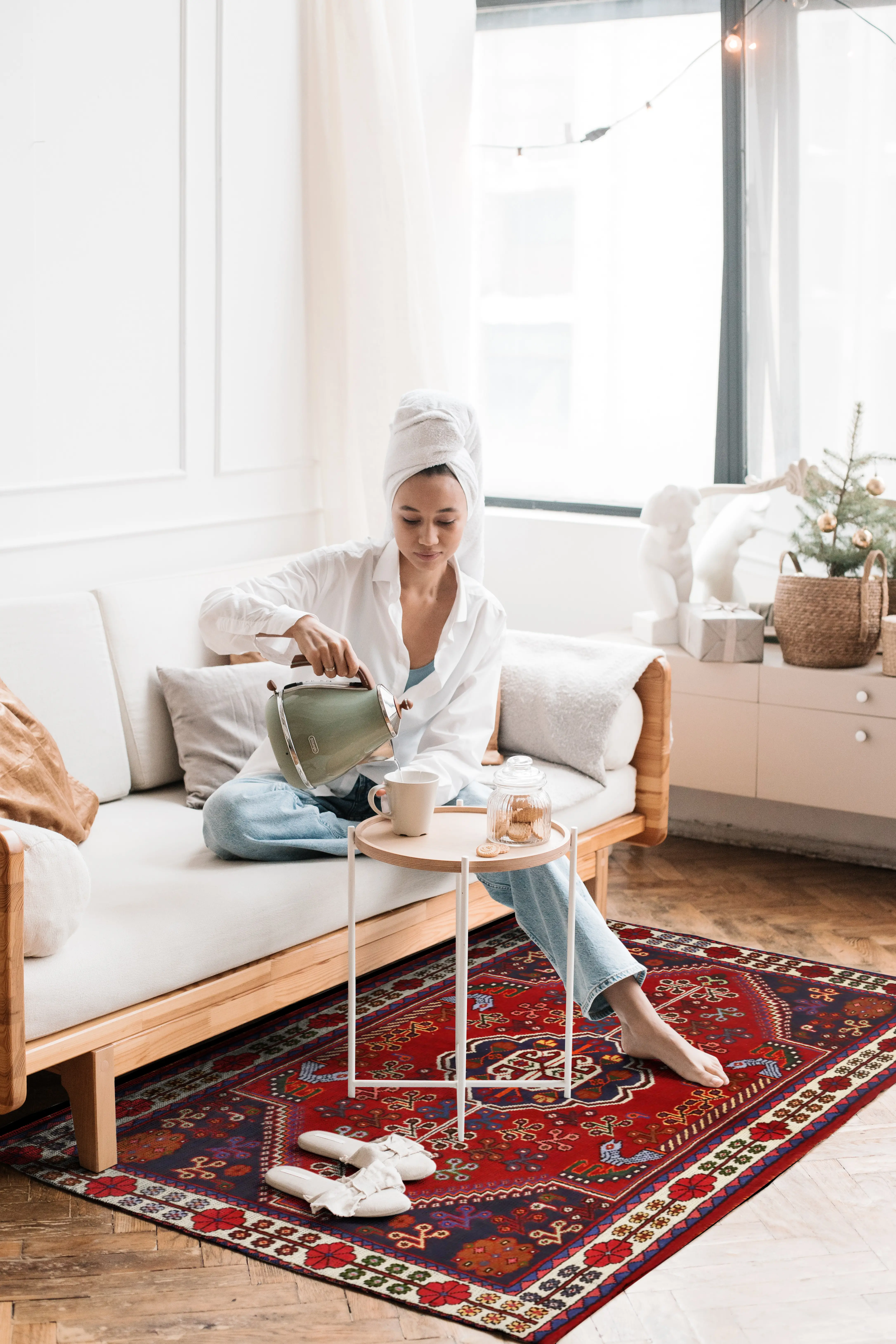 This genuine 3'5X5 red vintage Persian rug was made by the hands of gifted weavers inspired by a variety of spectacular artistic designs, to recreate the aged look of the original piece with a richness of color and ornately patterned background field. What set this tribal Oriental area rug from the others are the material and dye used (wool pile and cotton foundation), knot count, ancient designs, fantastic grades, and its regional historical connection: it has deep roots, from the story of the people who produced it to the meaning of the symbols and colors displayed across its canvas that have been praised for centuries. This home décor carpet will be completely cozy and inviting that never will go out of style! Also, this Oriental rug would be among your most valuable treasures, it is a great investment that accrues value over time, and it will last for generations because was woven with high-quality, all-natural wool; it won’t rip, tear, or shed. Environmentally friendly, opulent yet affordable; this Persian rug will give you a thorough amount of character to help define your living space with elegance and warmth that will capture the eyes and attention of your audience (homeowners, designers, decorators, family and friends). RT-2343