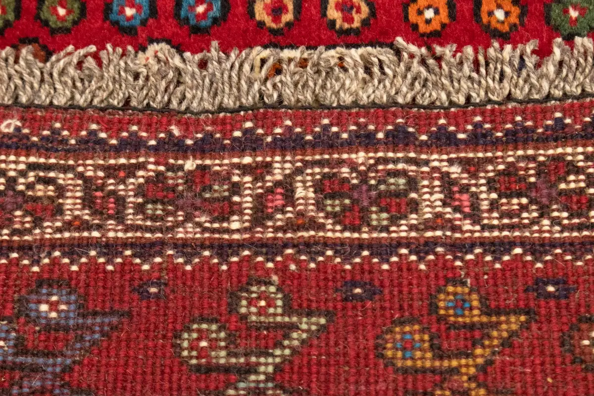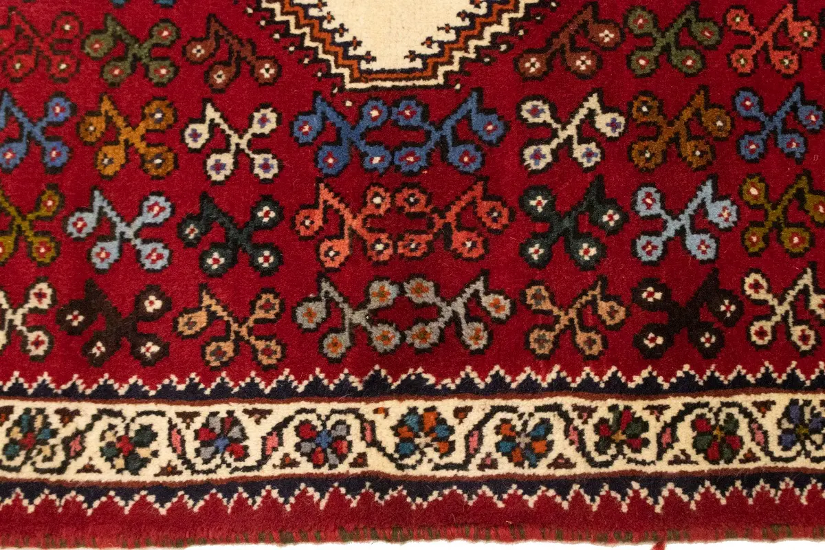 Handmade 3'6X4'3 red Persian rug made with natural dyes (fine wool pile and cotton foundation), superior knot count, and appealing ancient designs. This Oriental rug never will go out of style and would be among your most valuable treasures.