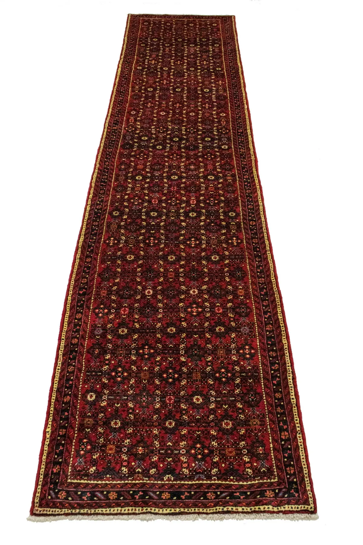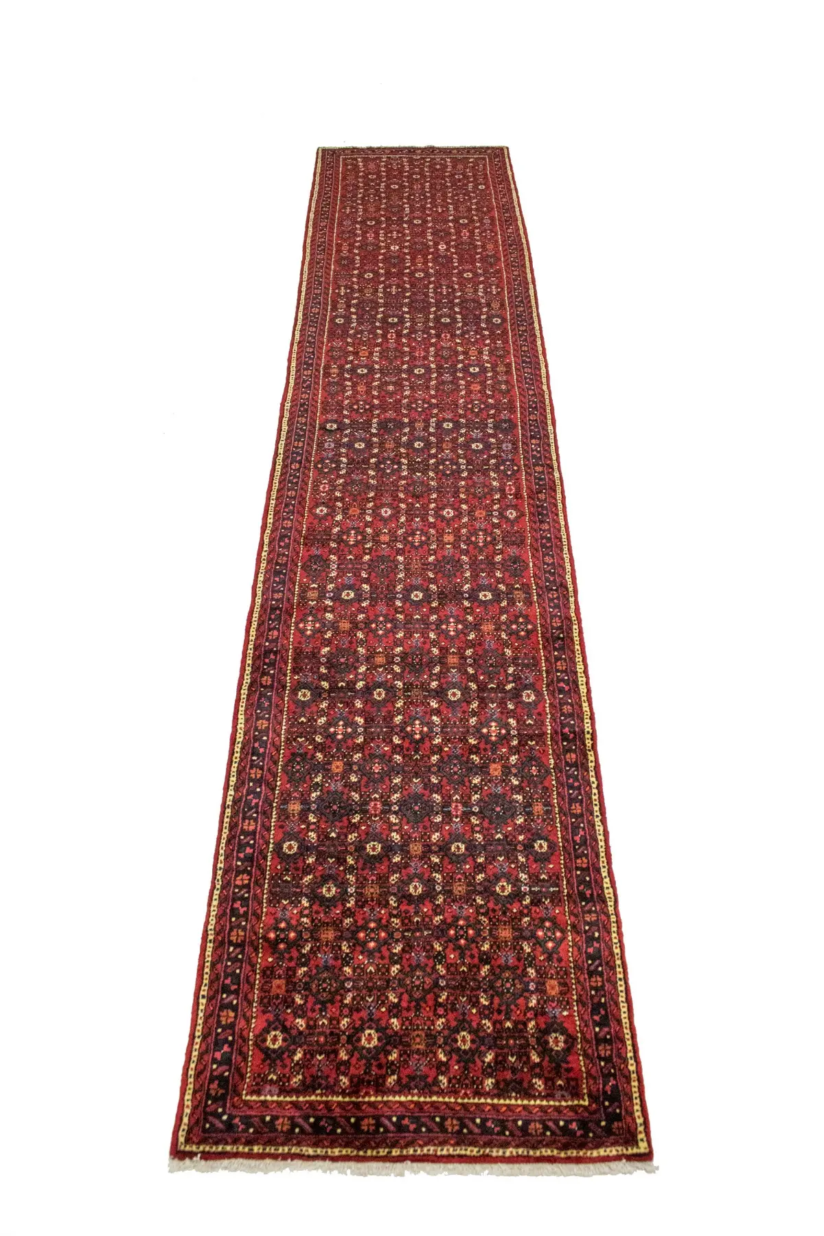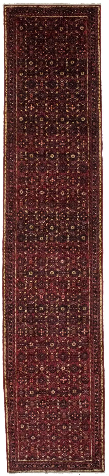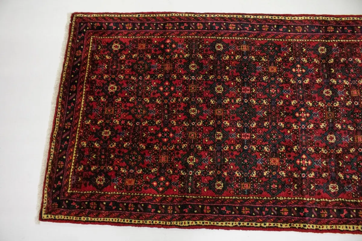 Hand Knotted vintage Persian runner made with vegetable dyes (fine wool pile and cotton foundation), superior knot count, and alluring ancient designs. This Oriental runner never will go out of style and would be among your most valuable treasures.