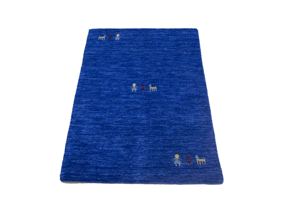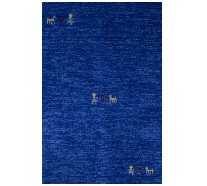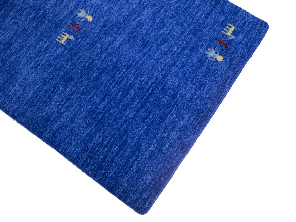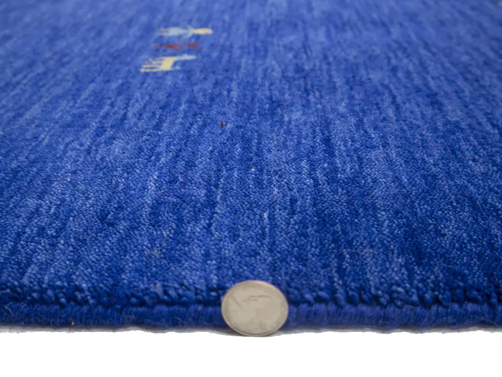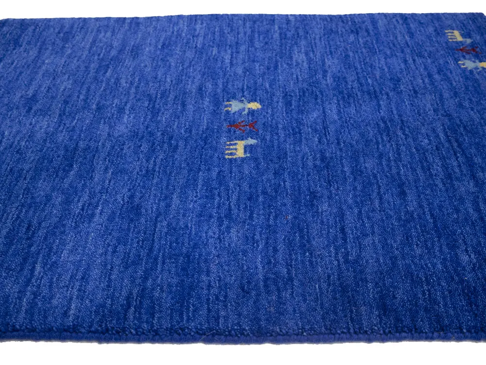 This hand-loomed Oriental rug from India features a modern, Pictorial design that seamlessly integrates traditional craftsmanship with contemporary style, showcasing a striking blue primary color. It provides a luxuriant softness and durability underfoot, as it is constructed from premium wool with a cotton foundation. The rug is optimized for high-traffic areas due to its medium pile height and knot density of 100 knots per square inch, which ensures durability and comfort. This rug, which is in exceptional condition and was recently manufactured, is an ideal complement to any contemporary setting, providing both versatility and timeless elegance.