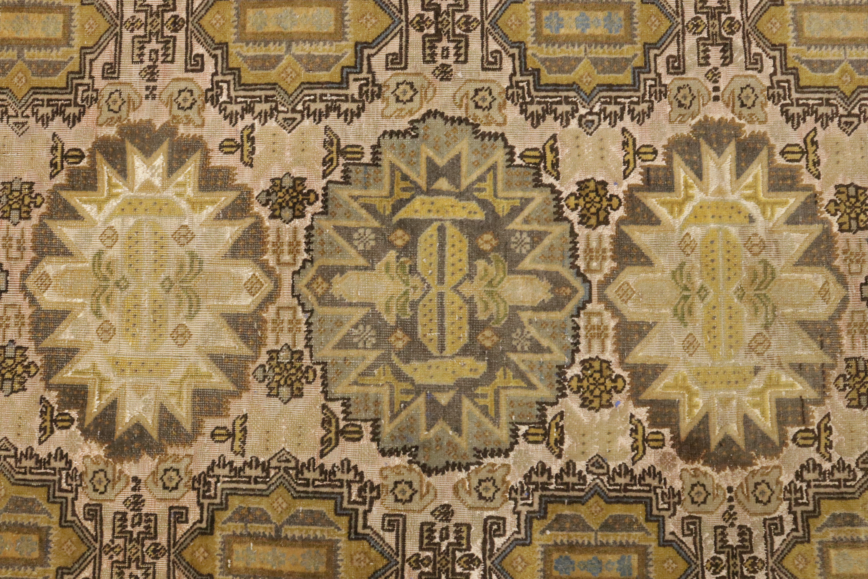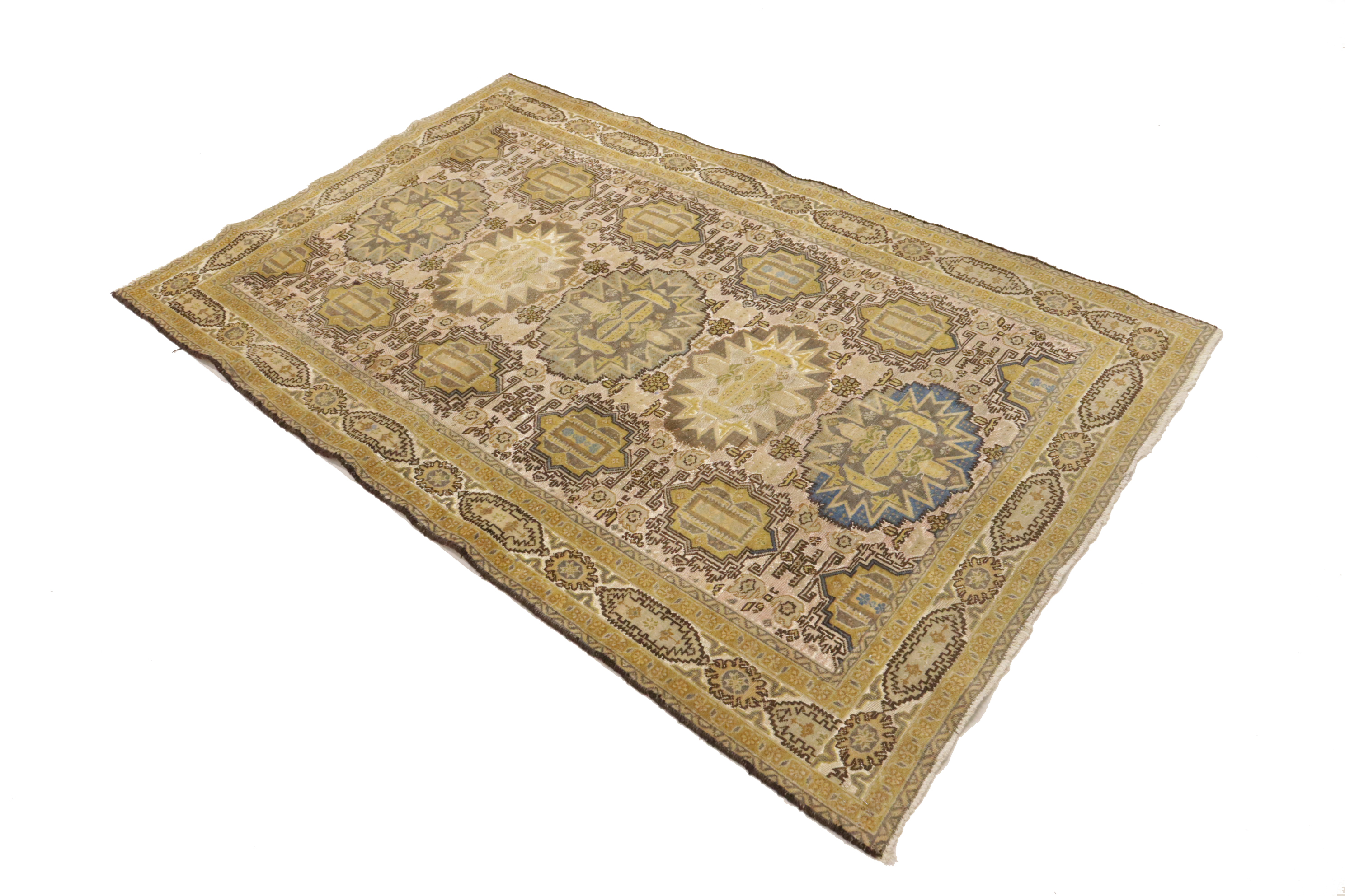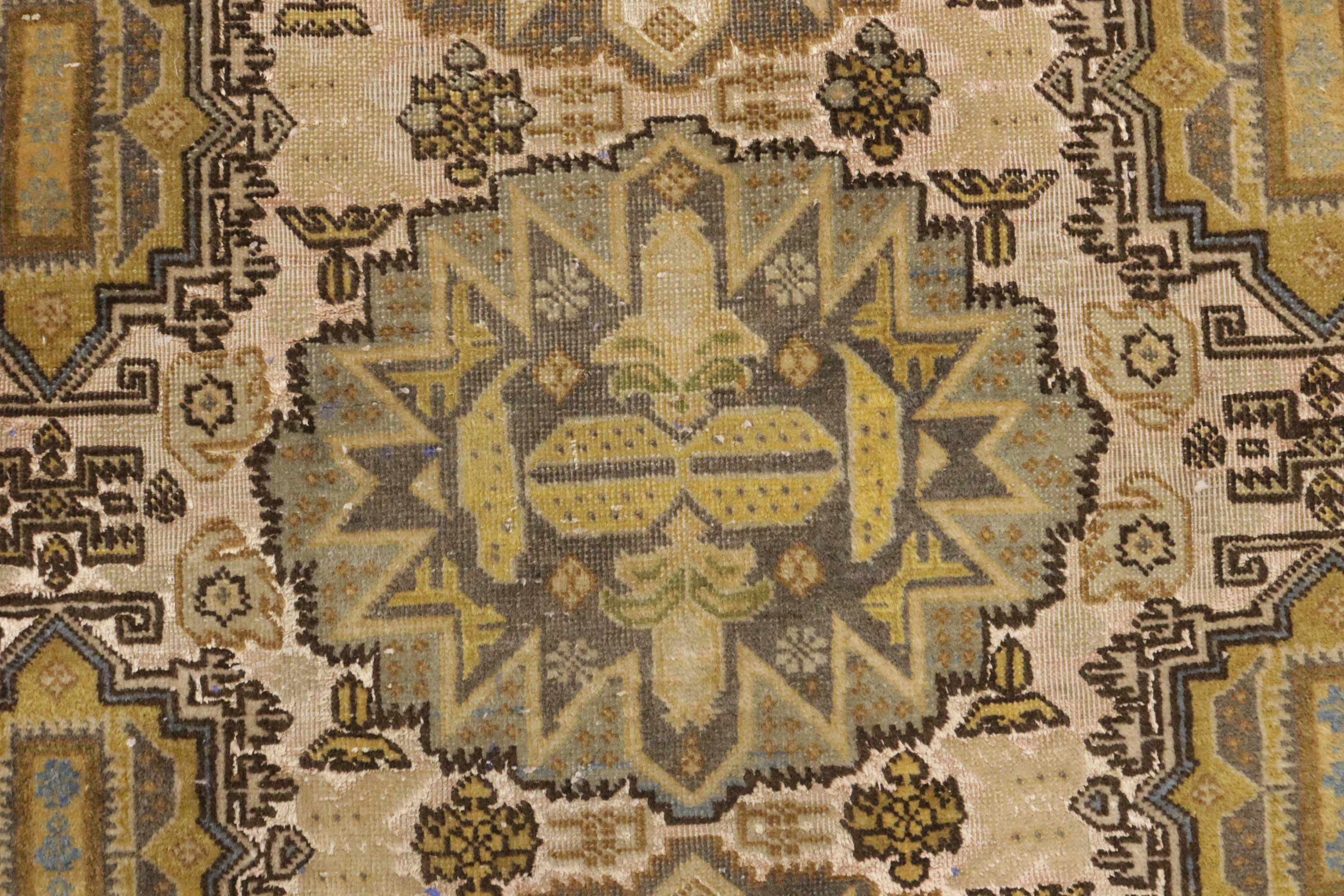 This original 4'0X6'5 cream vintage Persian rug was well-constructed by the hands of master weavers motivated by a variety of stunning artistic designs, to recreate the aged look of the exceptional piece with a richness of color and developed decorative background field. What set this tribal Oriental area rug from the others are the material and dye used (wool pile and cotton foundation), knot count, ancient designs, fantastic grades, and its regional historical connection: it has deep roots, from the story of the people who produced it to the meaning of the symbols and colors displayed across its canvas that have been praised for centuries. This home décor carpet will be completely cozy and inviting that never will go out of style!