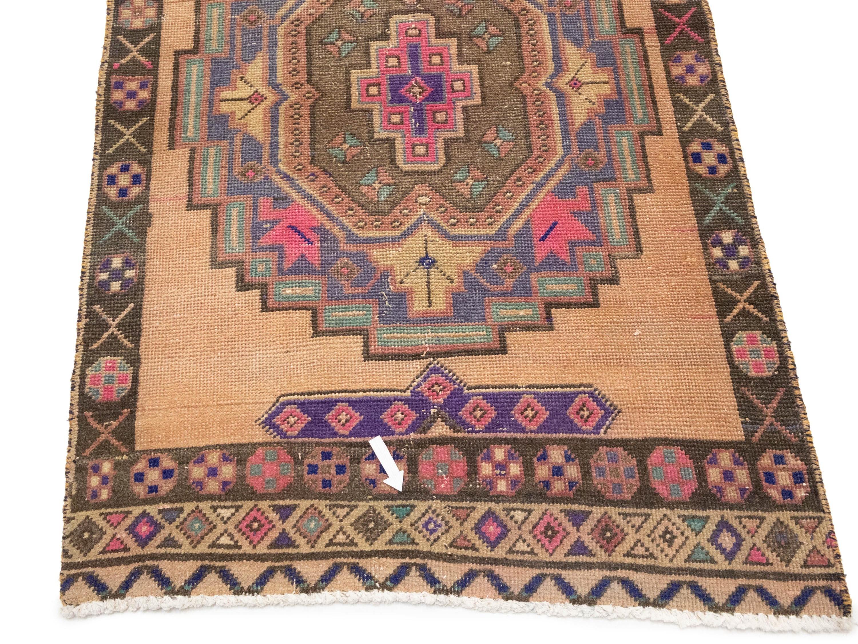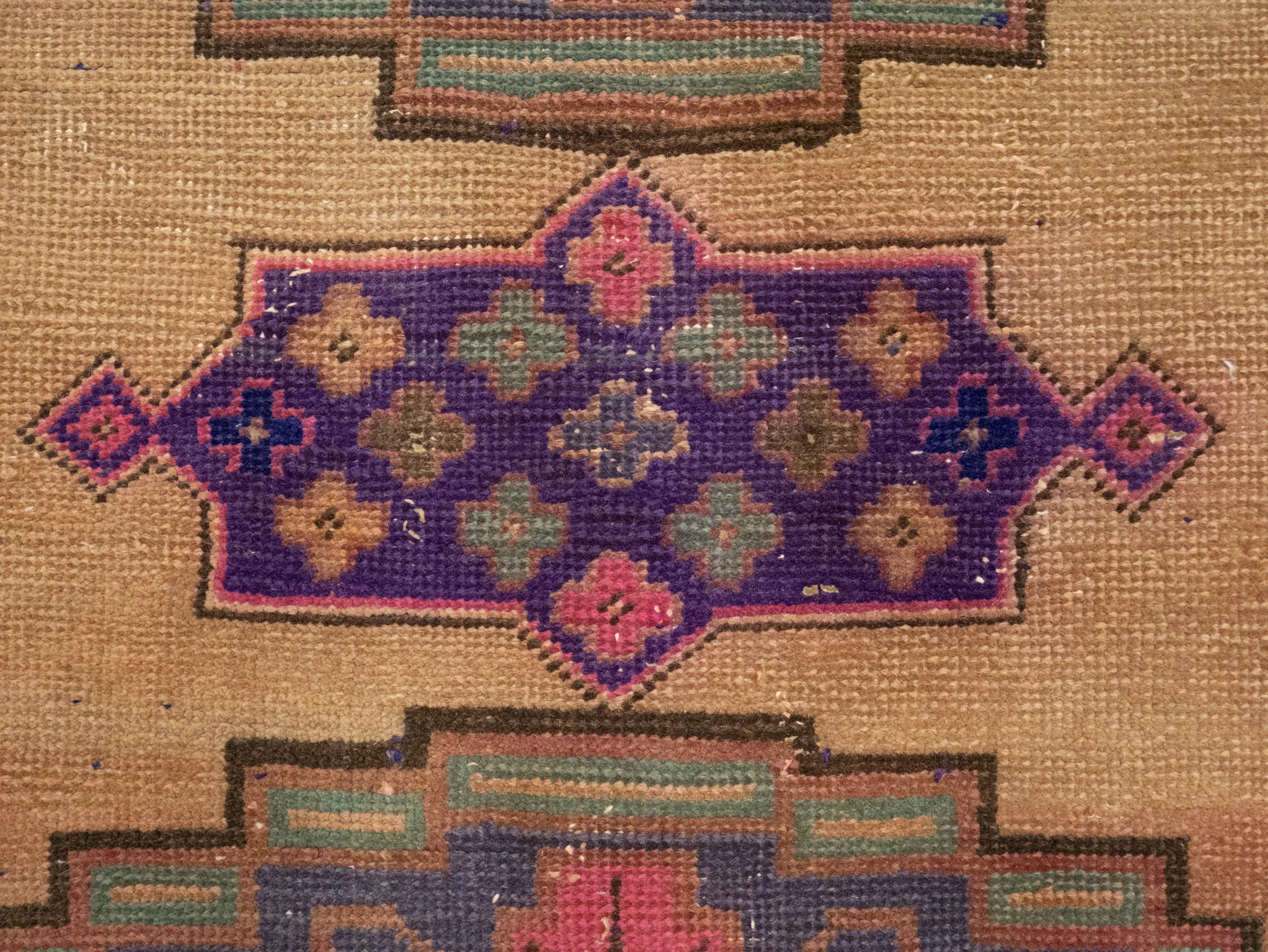 - Muted tones of beige, brown, green, purple, and pink with natural abrash fading