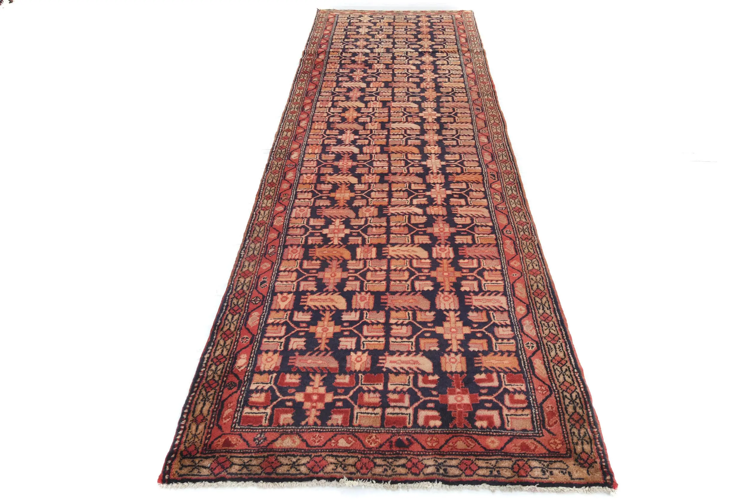 Handmade vintage 3x10 Plum Persian rug made with vegetable dyes (fine wool pile and cotton foundation), exceptional knot count, and appealing ancient designs. This Oriental rug never will go out of style and would be among your most valuable treasures.