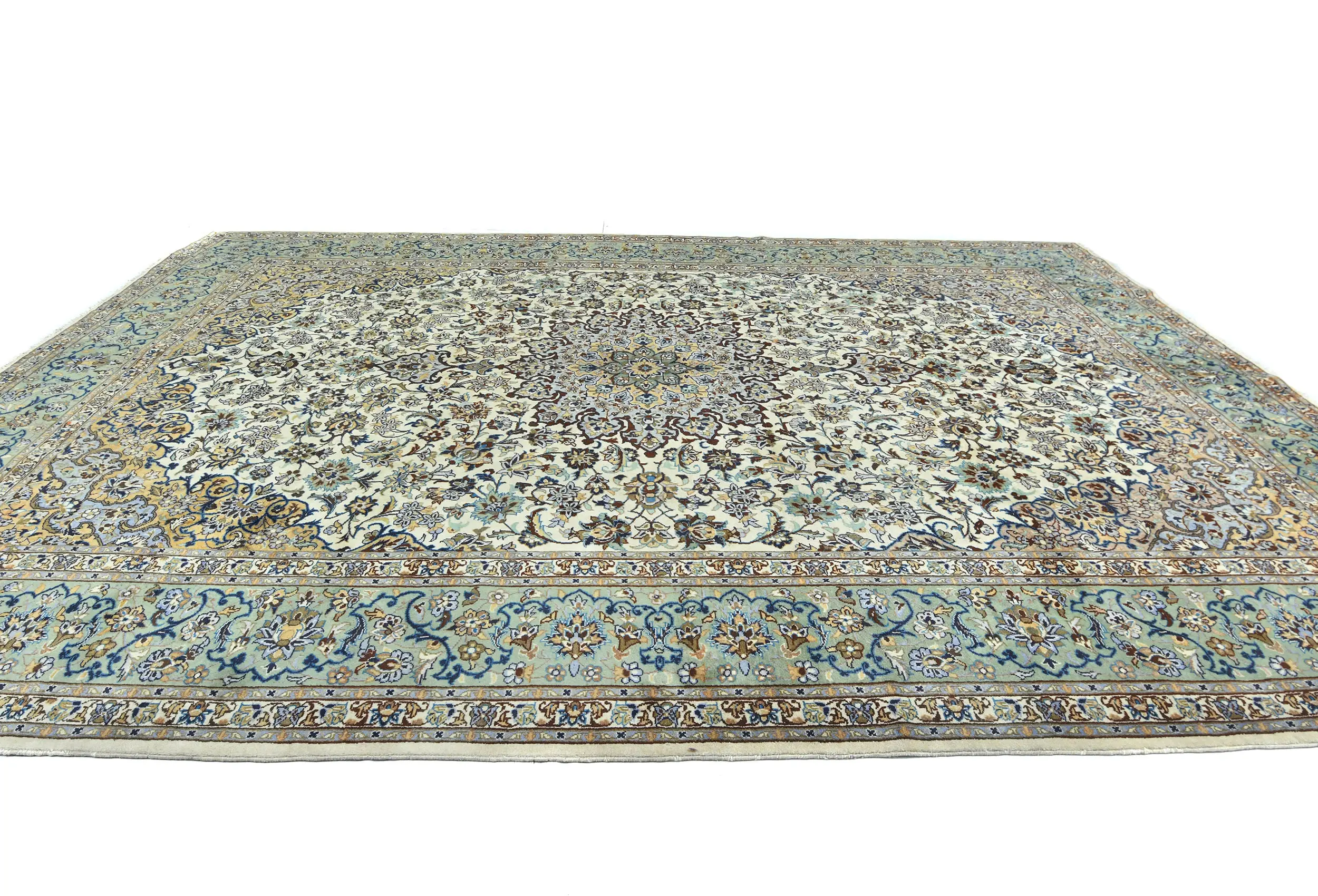 Handmade vintage 11'5 X 16'6 Cream Persian rug made with vegetable dyes (fine wool pile and cotton foundation), superior knot count, and appealing ancient designs. This Oriental rug never will go out of style and would be among your most valuable treasures.