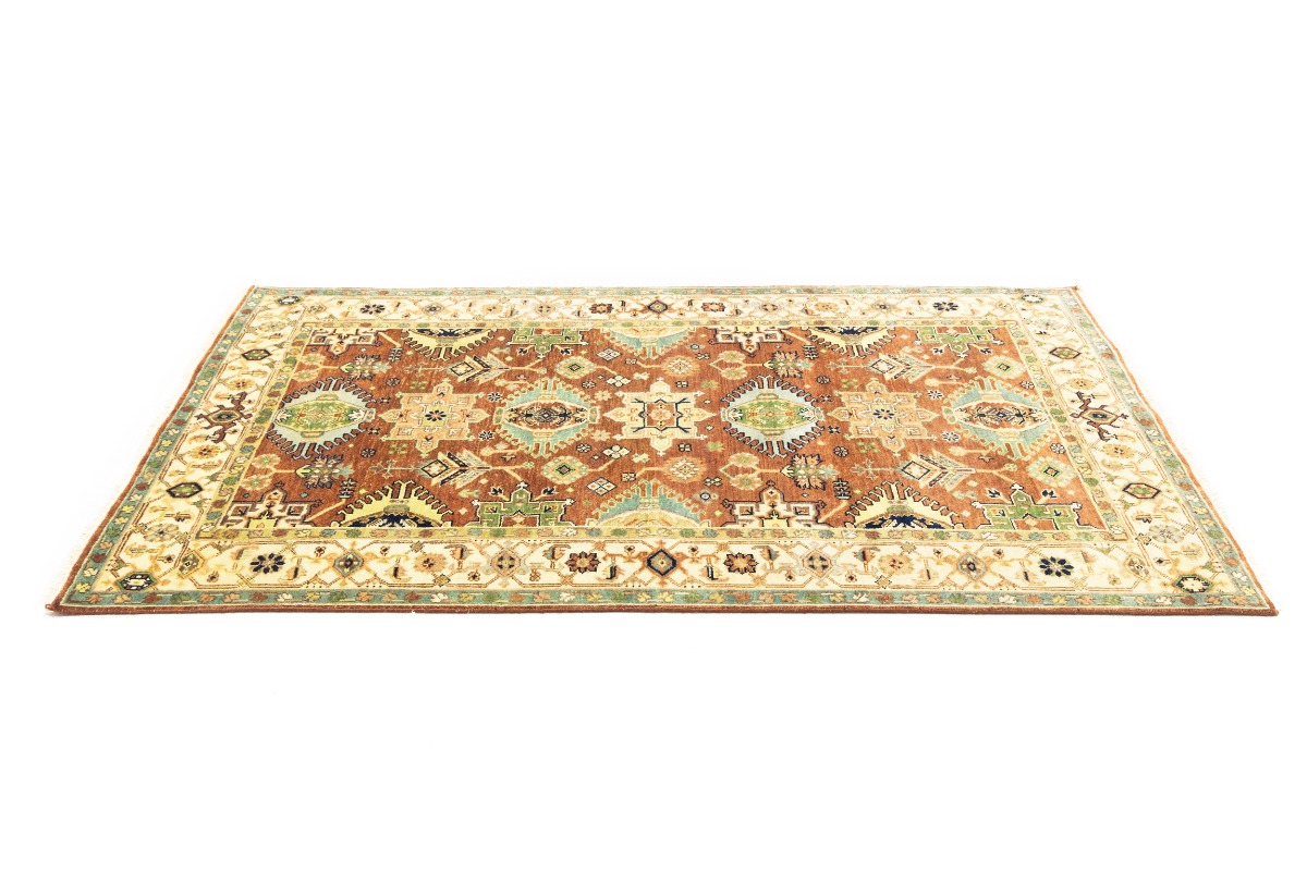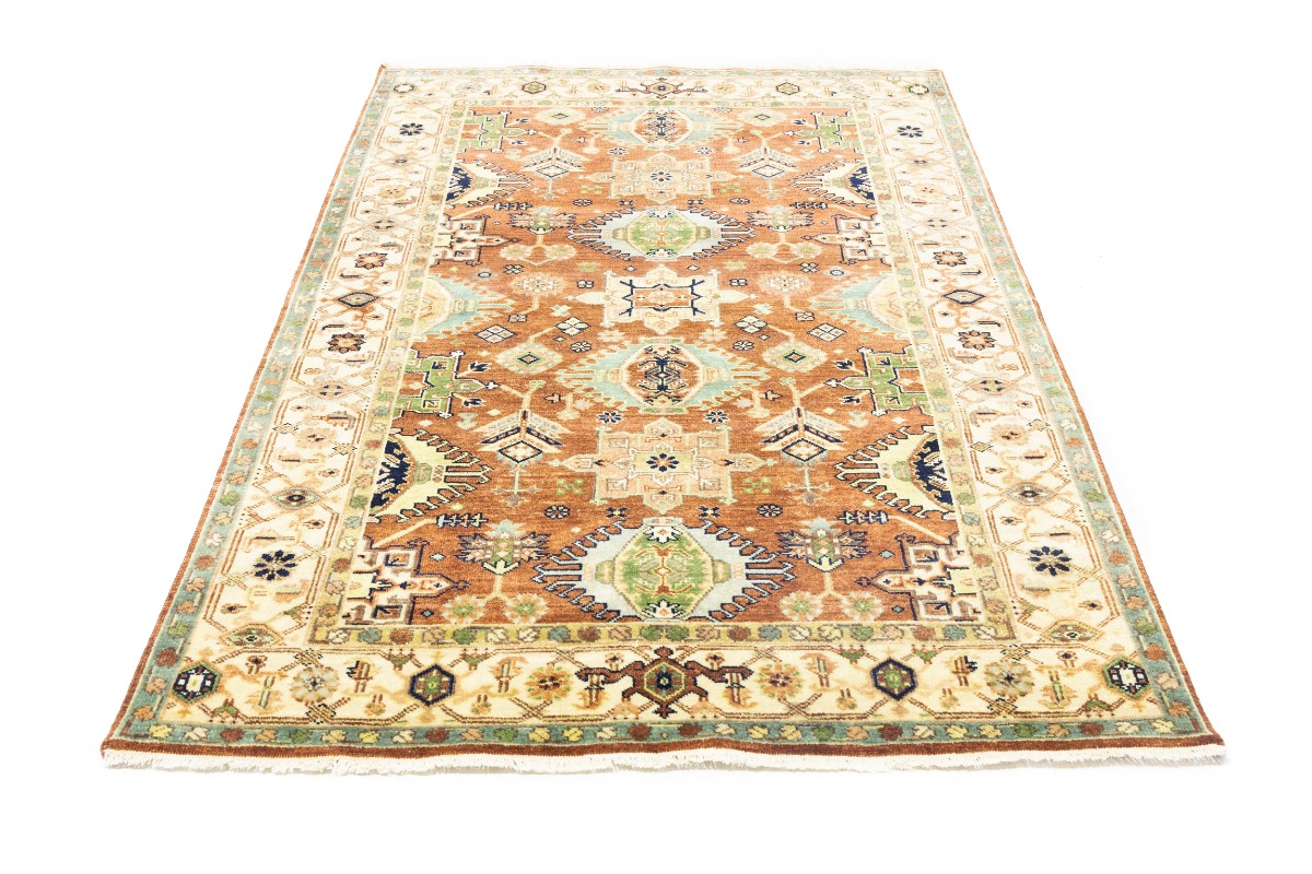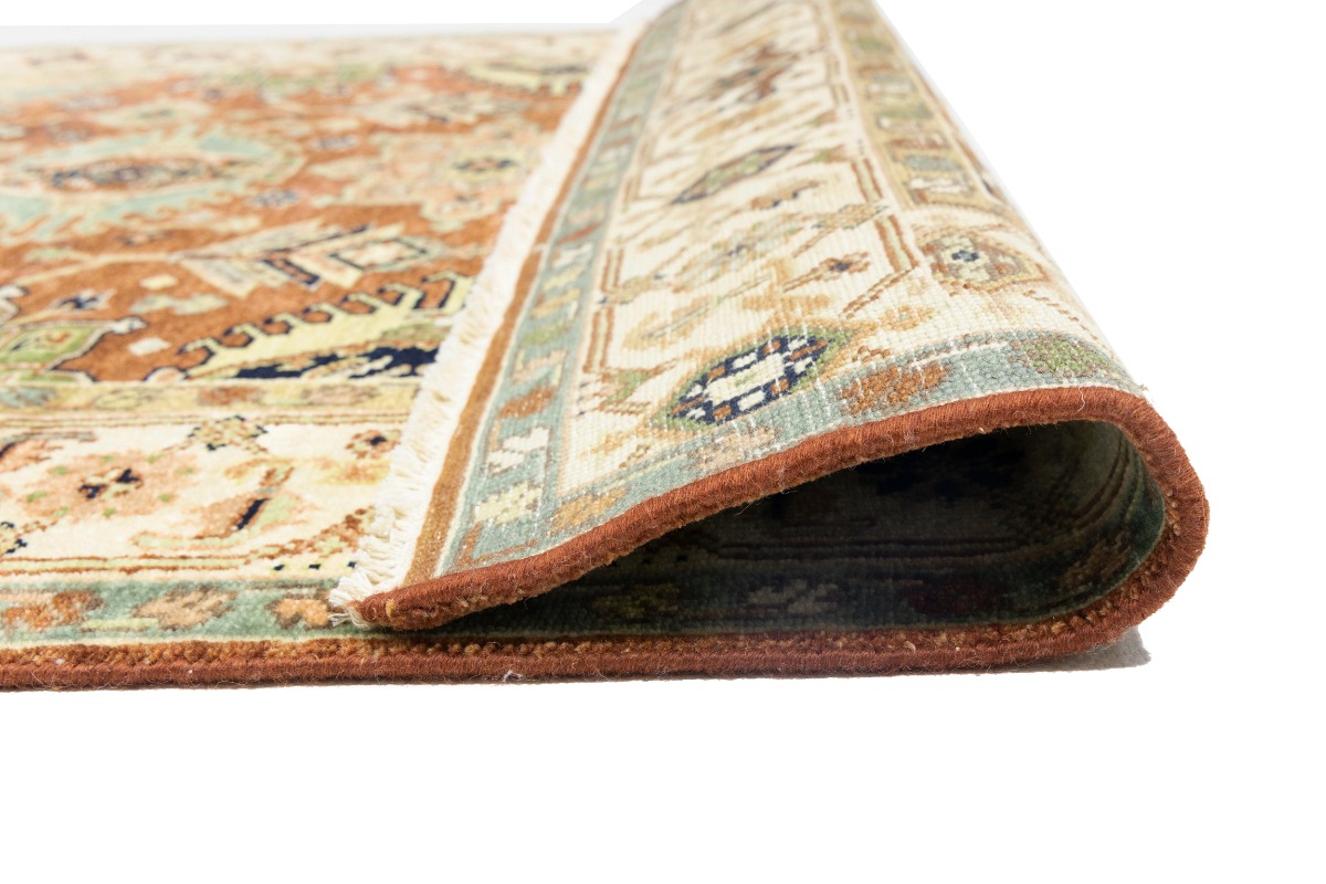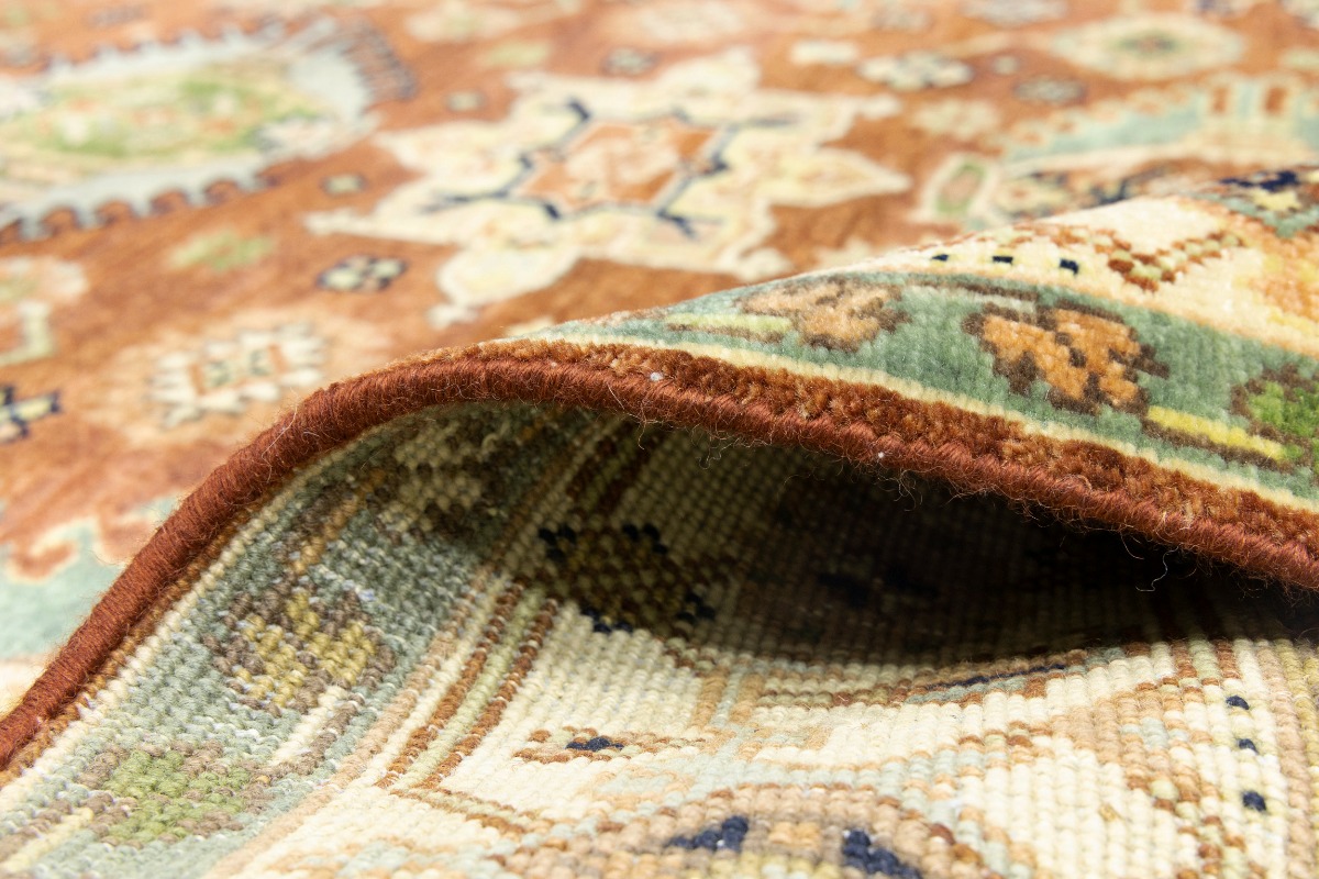 This genuine 5X8 orange new Oriental rug was made by the hands of gifted weavers inspired by a variety of spectacular artistic designs, to recreate the aged look of the original piece with a richness of color and ornately patterned background field. What set this vintage style Oriental area rug from the others are the material and dye used (wool pile and cotton foundation), knot count, ancient designs, fantastic grades, and its regional historical connection: it has deep roots, from the story of the people who produced it to the meaning of the symbols and colors displayed across its canvas that have been praised for centuries. This Indian home décor carpet will be completely cozy and inviting that never will go out of style! Also, this Oriental rug would be among your most valuable treasures, it is a great investment that accrues value over time, and it will last for generations because was woven with high-quality, all-natural wool. Environmentally friendly, opulent yet affordable; this rug will give you a thorough amount of character to help define your living space with elegance and warmth that will capture the eyes and attention of your audience (homeowners, designers, decorators, family and friends). OT-8271