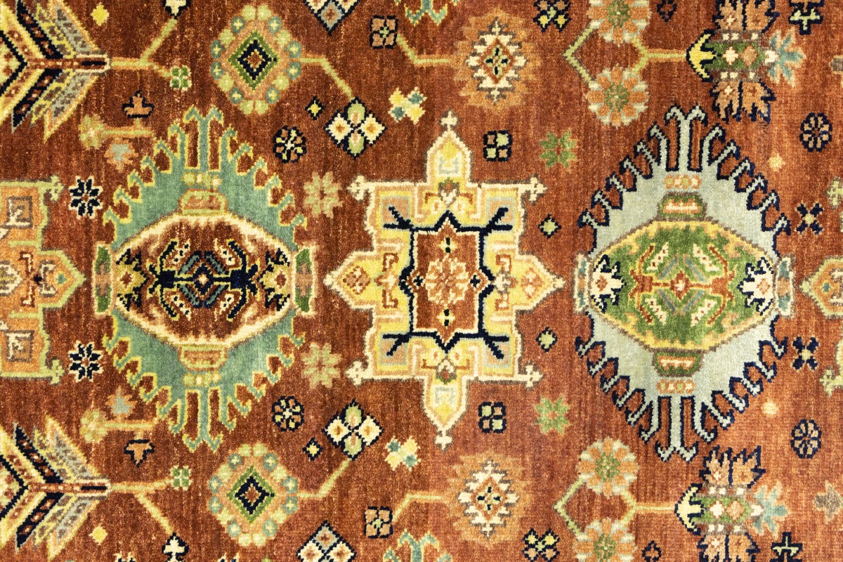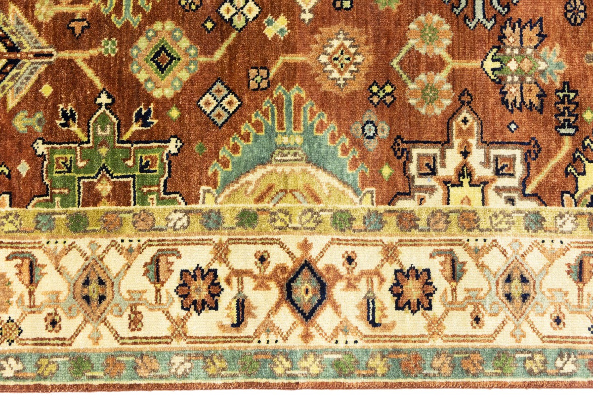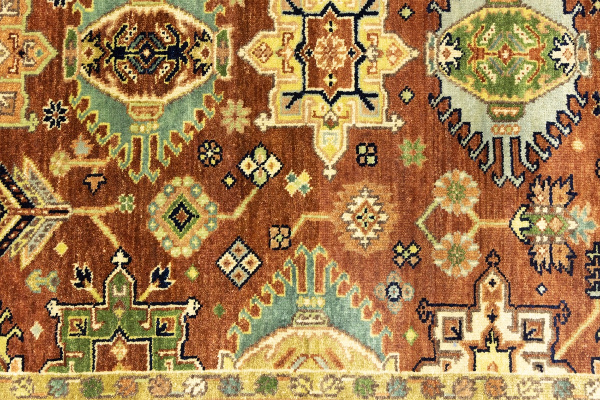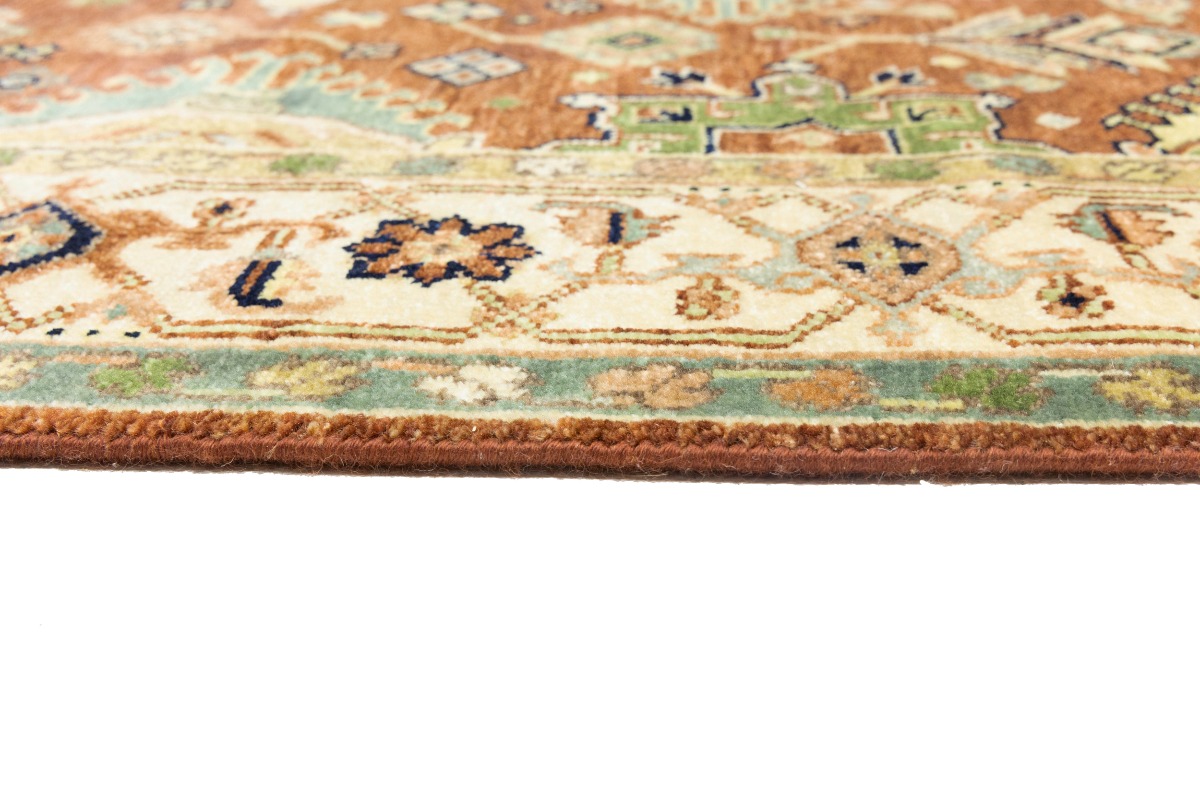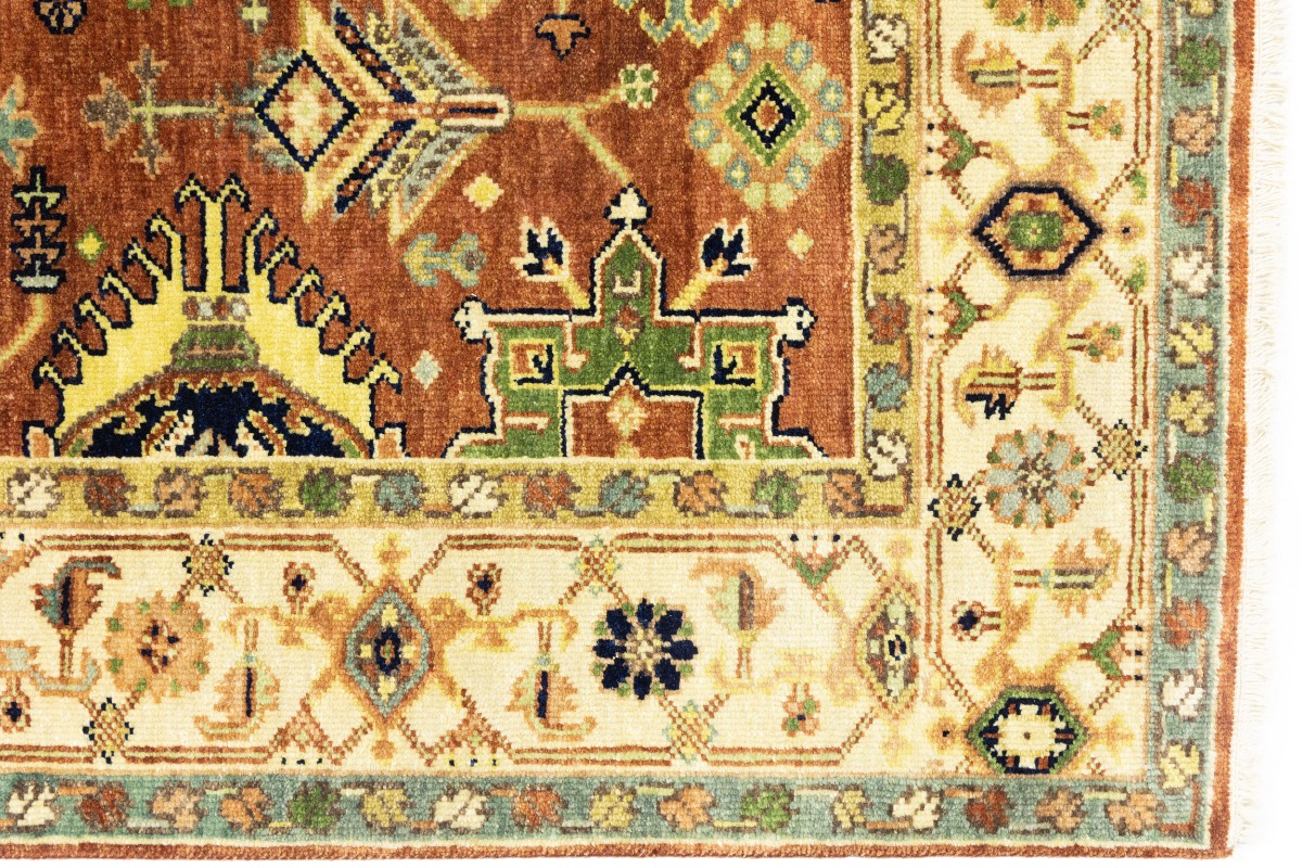 This genuine 5X8 orange new Oriental rug was made by the hands of gifted weavers inspired by a variety of spectacular artistic designs, to recreate the aged look of the original piece with a richness of color and ornately patterned background field. What set this vintage style Oriental area rug from the others are the material and dye used (wool pile and cotton foundation), knot count, ancient designs, fantastic grades, and its regional historical connection: it has deep roots, from the story of the people who produced it to the meaning of the symbols and colors displayed across its canvas that have been praised for centuries. This Indian home décor carpet will be completely cozy and inviting that never will go out of style! Also, this Oriental rug would be among your most valuable treasures, it is a great investment that accrues value over time, and it will last for generations because was woven with high-quality, all-natural wool. Environmentally friendly, opulent yet affordable; this rug will give you a thorough amount of character to help define your living space with elegance and warmth that will capture the eyes and attention of your audience (homeowners, designers, decorators, family and friends). OT-8271