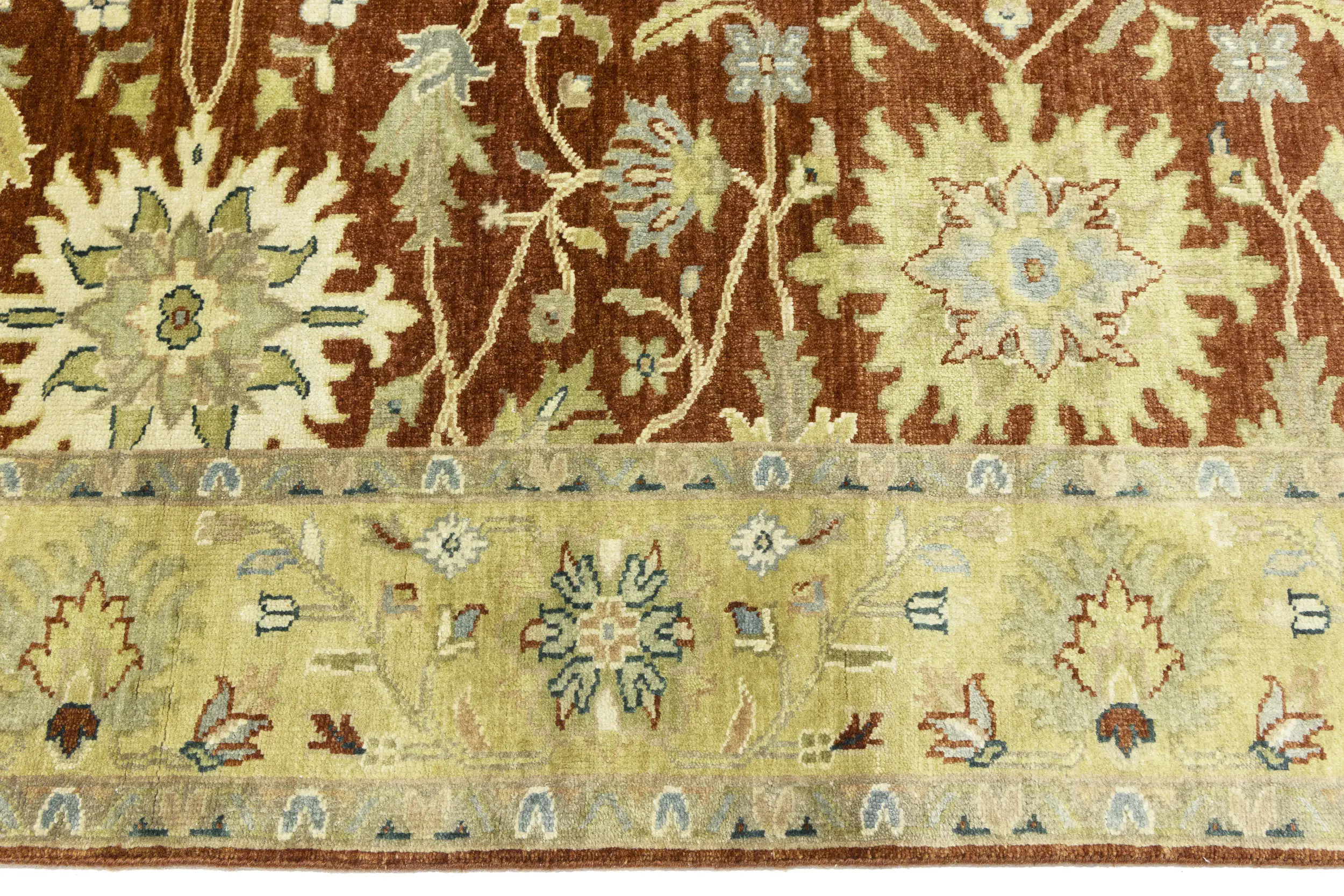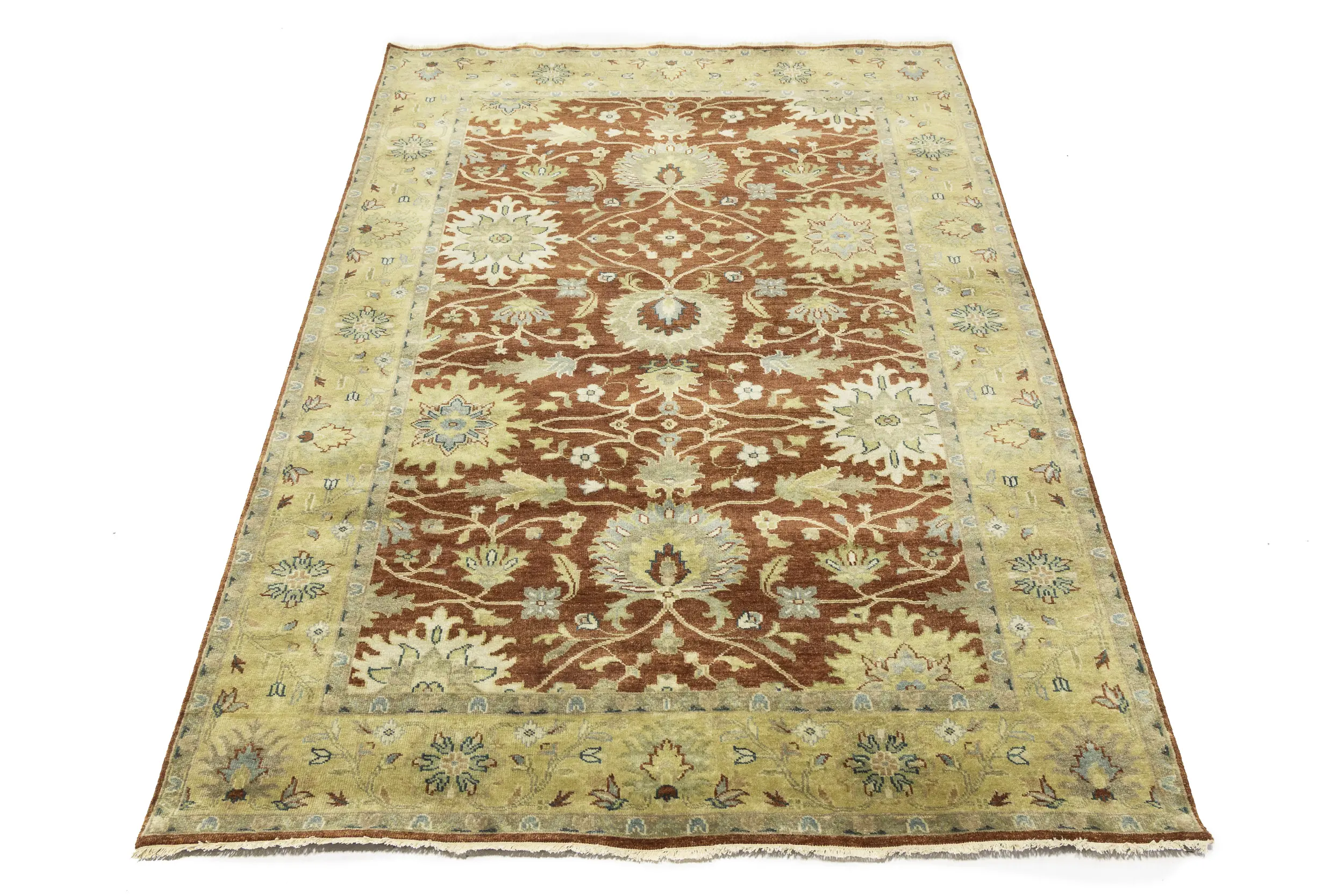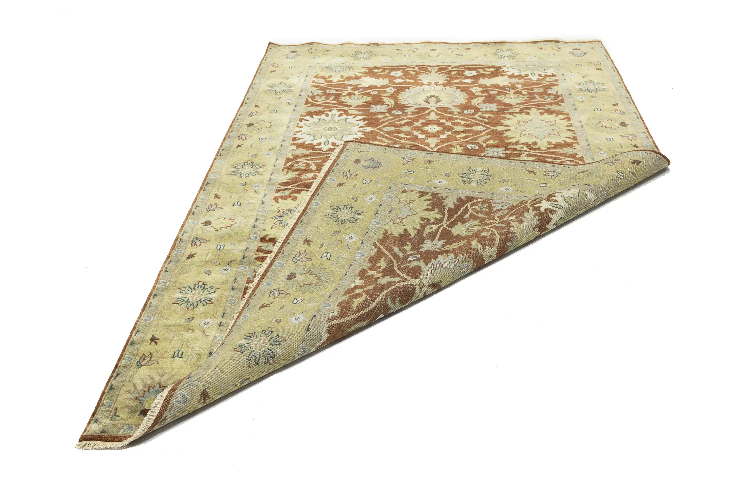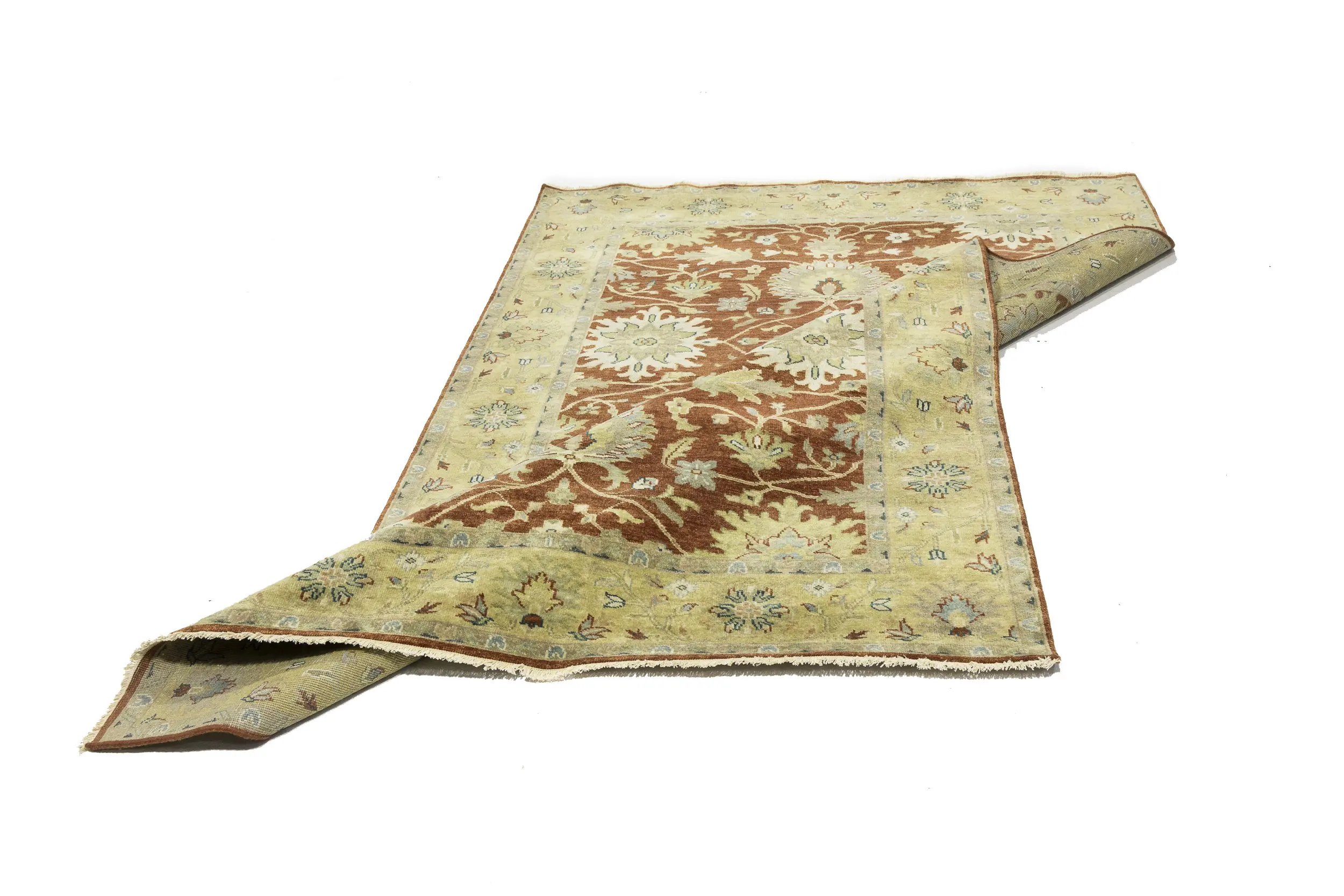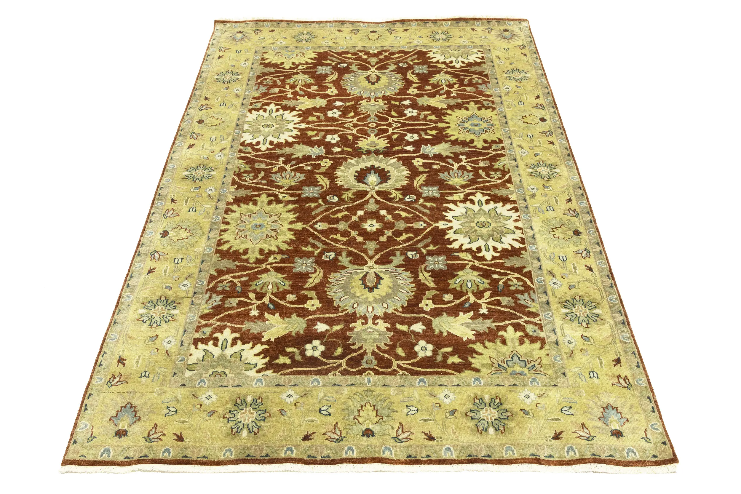 This authentic 6X9 rust new Oriental rug was masterly knotted by the hands of weavers inspired by a variety of wonderful artistic designs, to recreate the aged look of the original piece with a richness of color and intricate patterned background field. What set this vintage style Oriental area rug from the others are the material and dye used (wool pile and cotton foundation), knot count, antique designs, fantastic grades, and its regional historical connection: it has deep roots, from the story of the people who produced it to the meaning of the symbols and colors displayed across its canvas that have been praised for centuries. This Indian home décor carpet will be completely cozy and inviting that never will go out of style! Also, this Oriental rug would be among your most valuable treasures, it is a great investment that accrues value over time, and it will last for generations because was woven with high-quality, all-natural wool. Environmentally friendly, opulent yet affordable; this rug will give you a thorough amount of character to help define your living space with luxury and warmth that will capture the eyes and attention of your audience (homeowners, designers, decorators, family and friends).