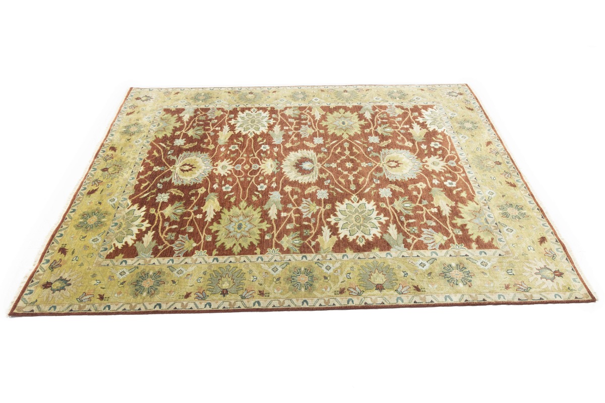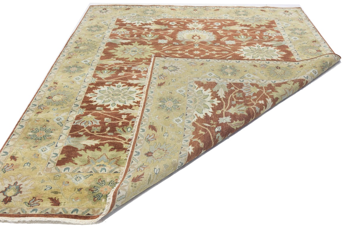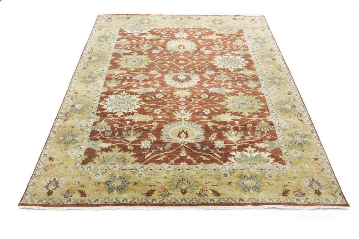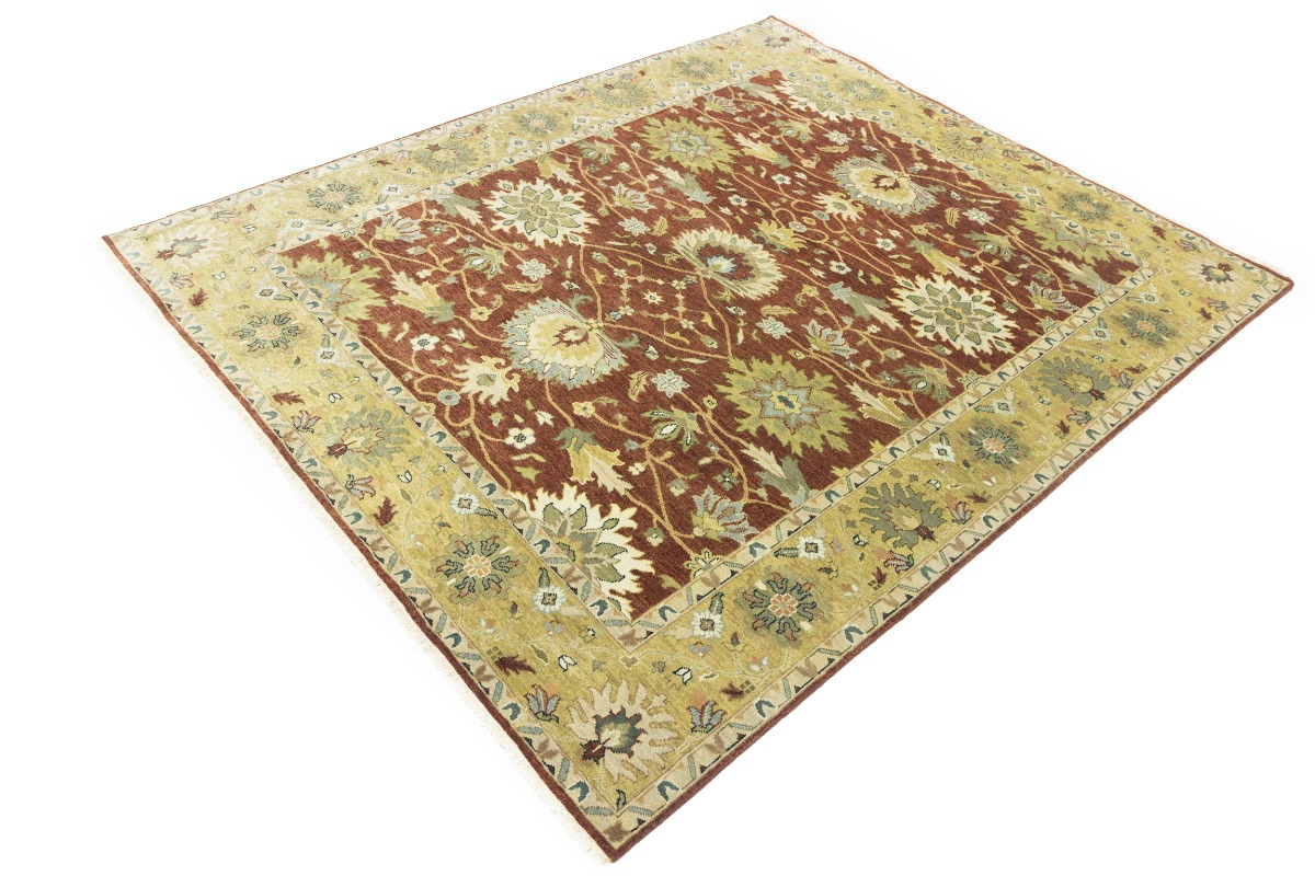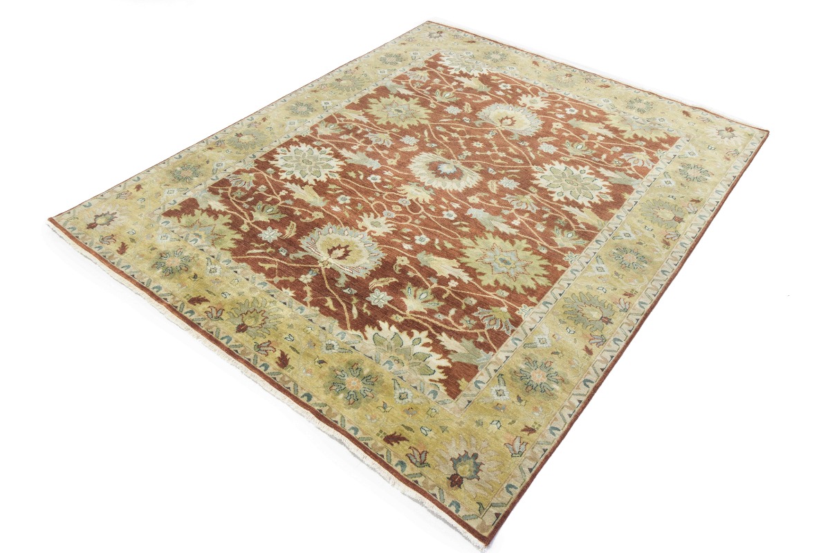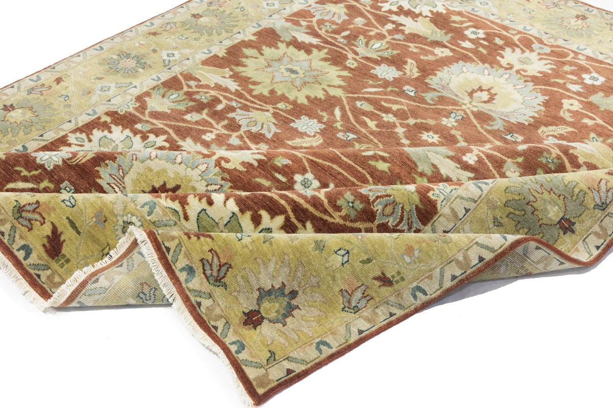 This genuine 8X10 orange new Oriental rug was made by the hands of gifted weavers inspired by a variety of spectacular artistic designs, to recreate the aged look of the original piece with a richness of color and ornately patterned background field. What set this vintage style Oriental area rug from the others are the material and dye used (wool pile and cotton foundation), knot count, ancient designs, fantastic grades, and its regional historical connection: it has deep roots, from the story of the people who produced it to the meaning of the symbols and colors displayed across its canvas that have been praised for centuries. This Indian home décor carpet will be completely cozy and inviting that never will go out of style! Also, this Oriental rug would be among your most valuable treasures, it is a great investment that accrues value over time, and it will last for generations because was woven with high-quality, all-natural wool. Environmentally friendly, opulent yet affordable; this rug will give you a thorough amount of character to help define your living space with elegance and warmth that will capture the eyes and attention of your audience (homeowners, designers, decorators, family and friends). OT-9063