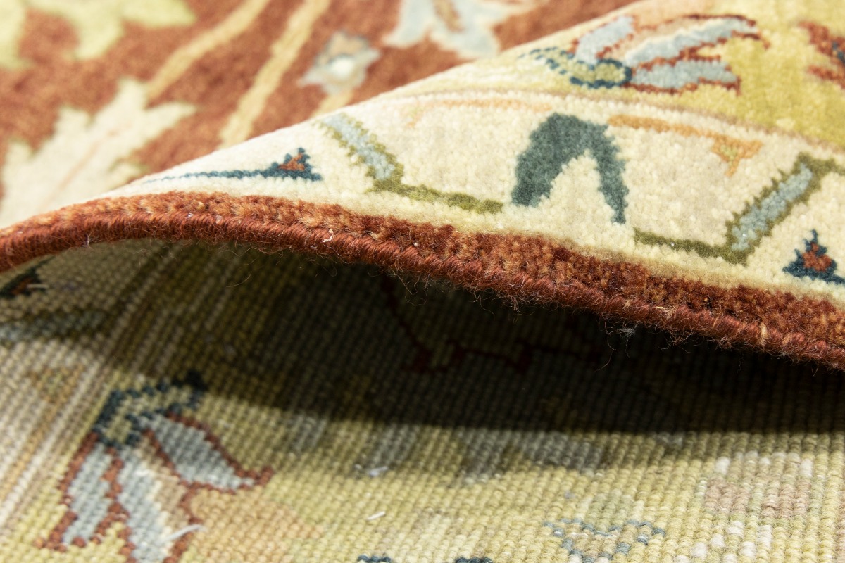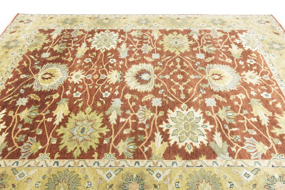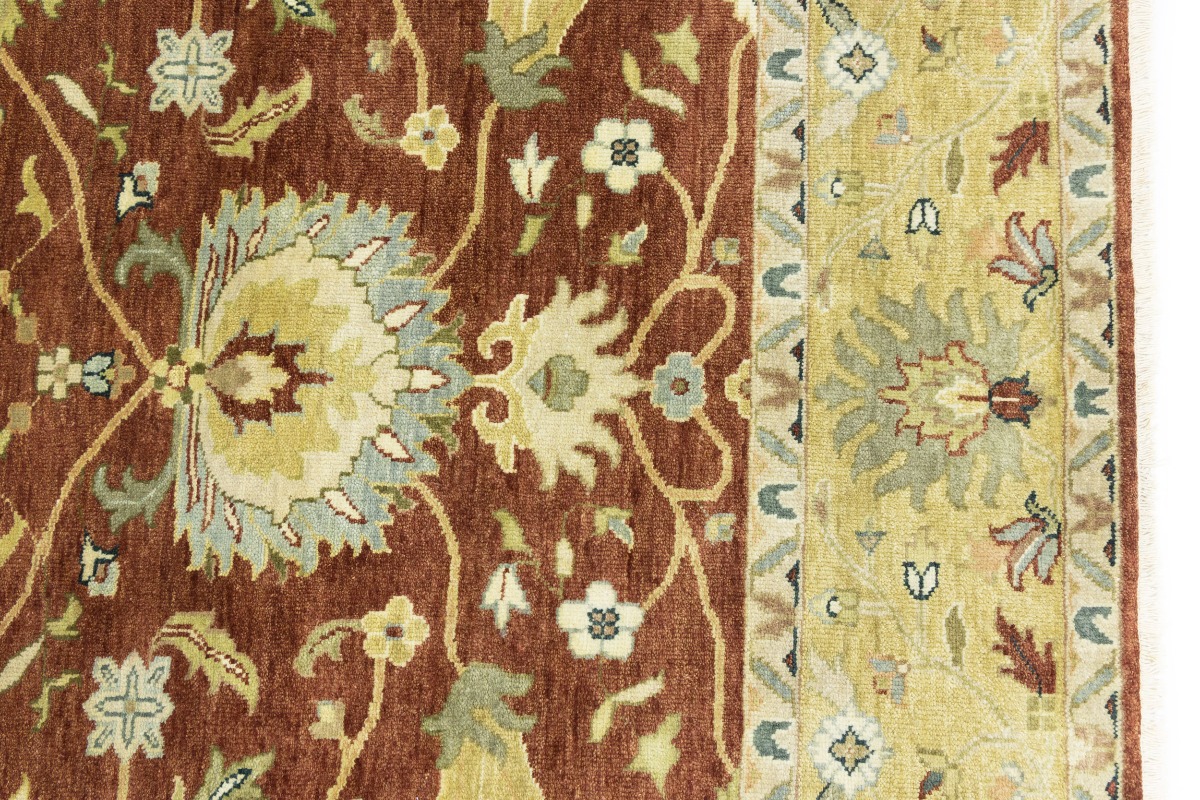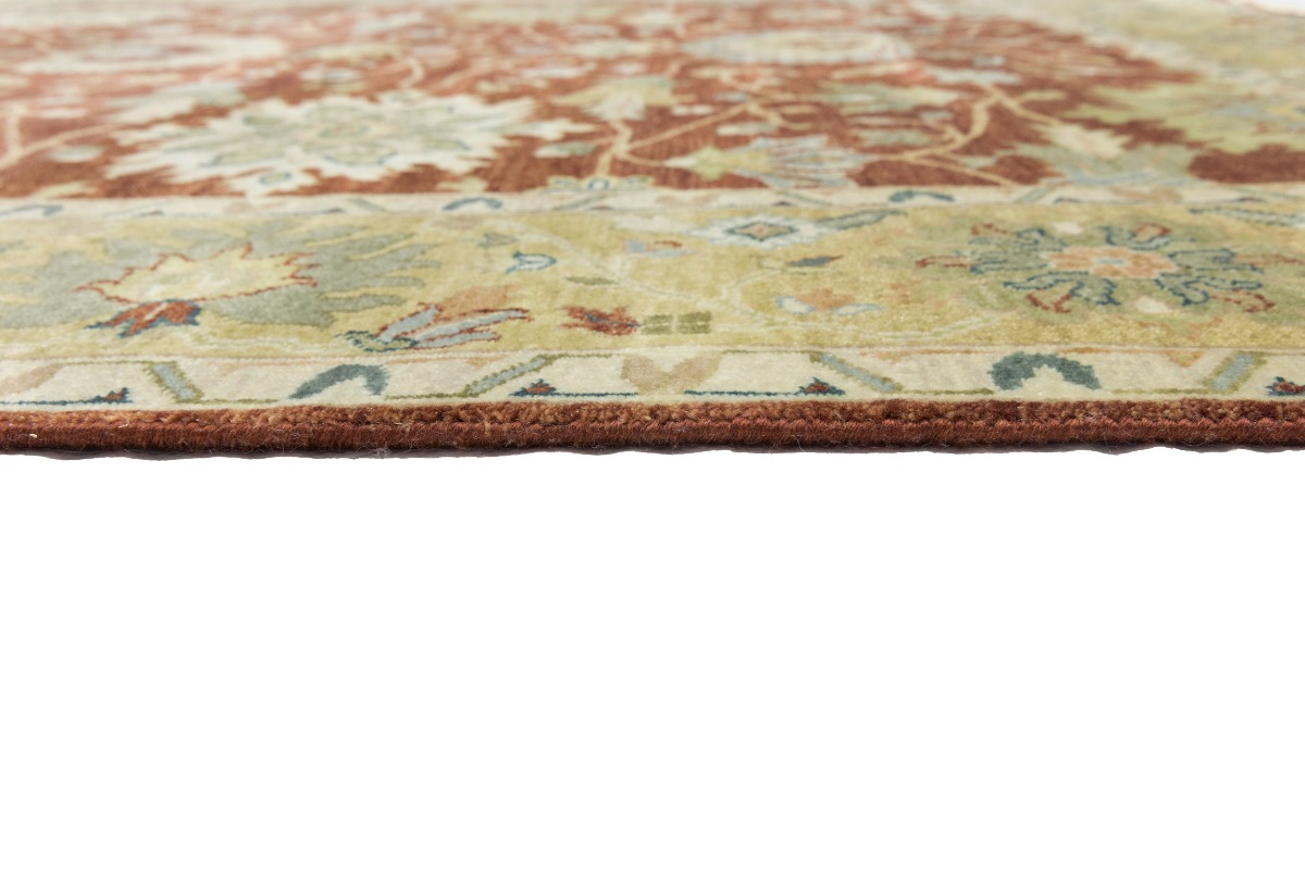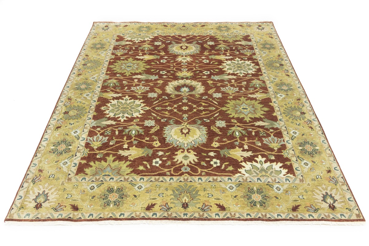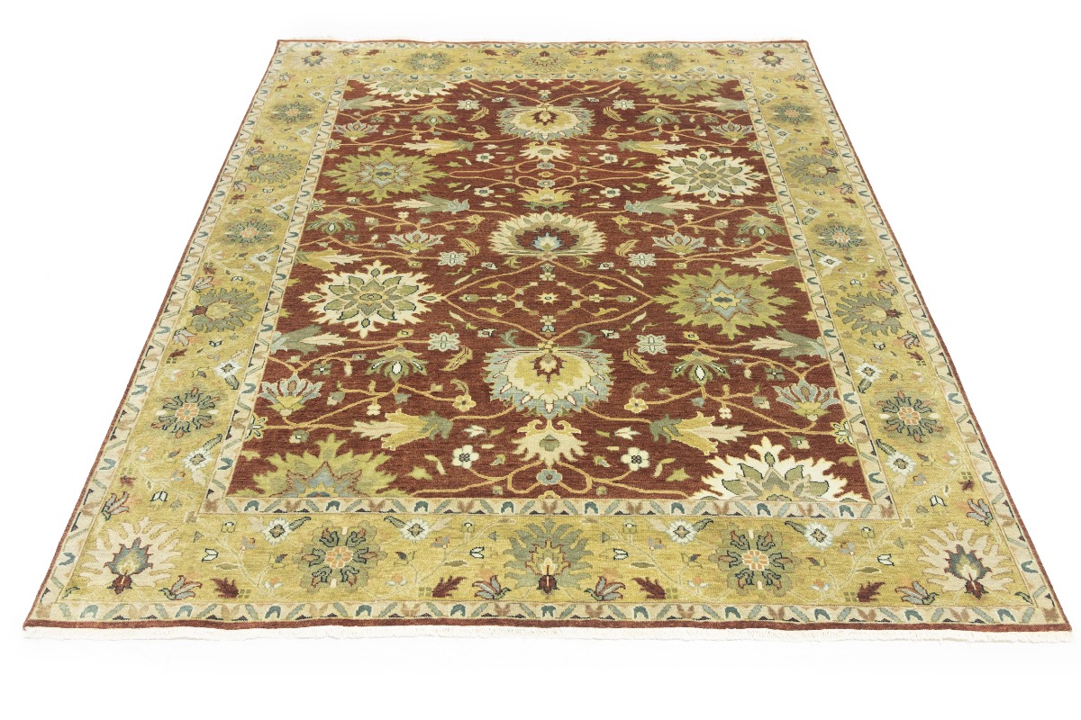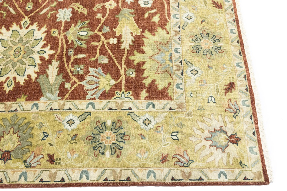 This genuine 8X10 orange new Oriental rug was made by the hands of gifted weavers inspired by a variety of spectacular artistic designs, to recreate the aged look of the original piece with a richness of color and ornately patterned background field. What set this vintage style Oriental area rug from the others are the material and dye used (wool pile and cotton foundation), knot count, ancient designs, fantastic grades, and its regional historical connection: it has deep roots, from the story of the people who produced it to the meaning of the symbols and colors displayed across its canvas that have been praised for centuries. This Indian home décor carpet will be completely cozy and inviting that never will go out of style! Also, this Oriental rug would be among your most valuable treasures, it is a great investment that accrues value over time, and it will last for generations because was woven with high-quality, all-natural wool. Environmentally friendly, opulent yet affordable; this rug will give you a thorough amount of character to help define your living space with elegance and warmth that will capture the eyes and attention of your audience (homeowners, designers, decorators, family and friends). OT-9063