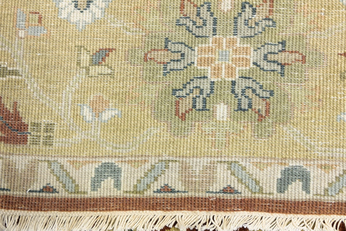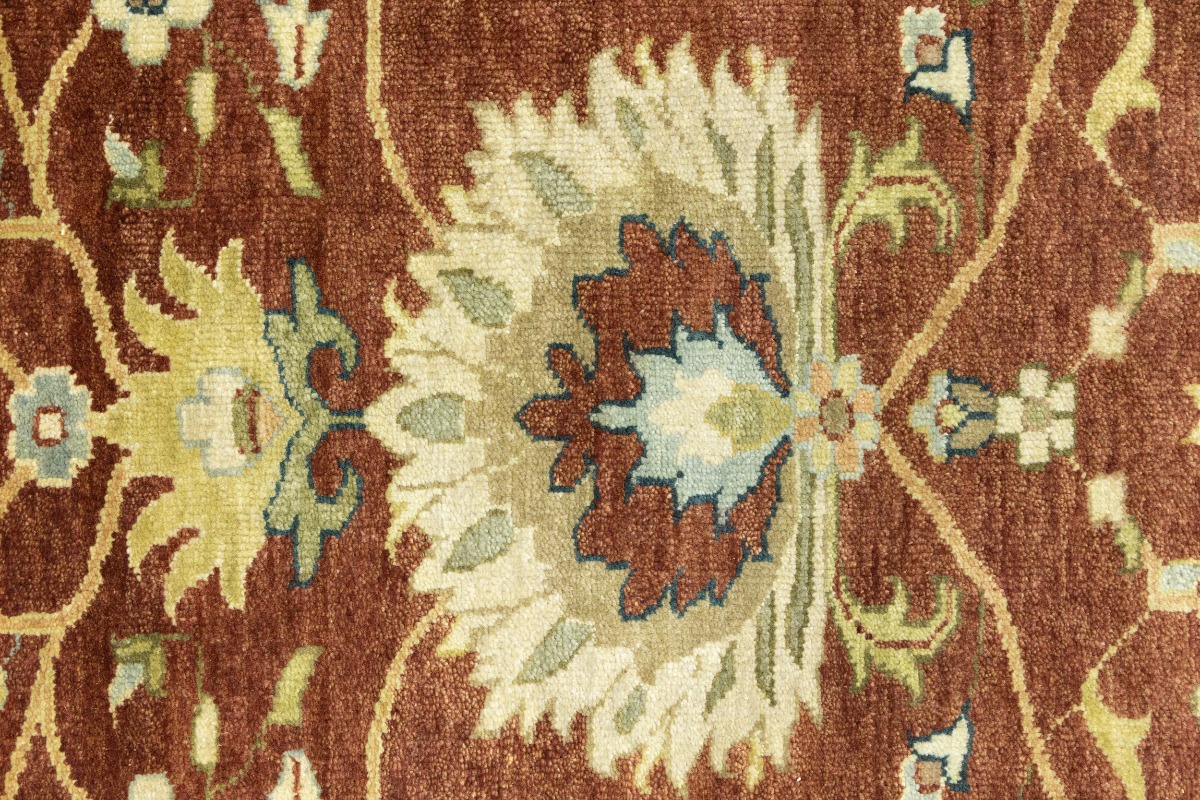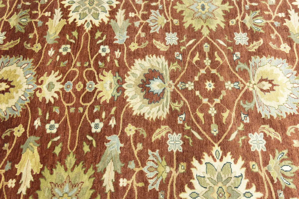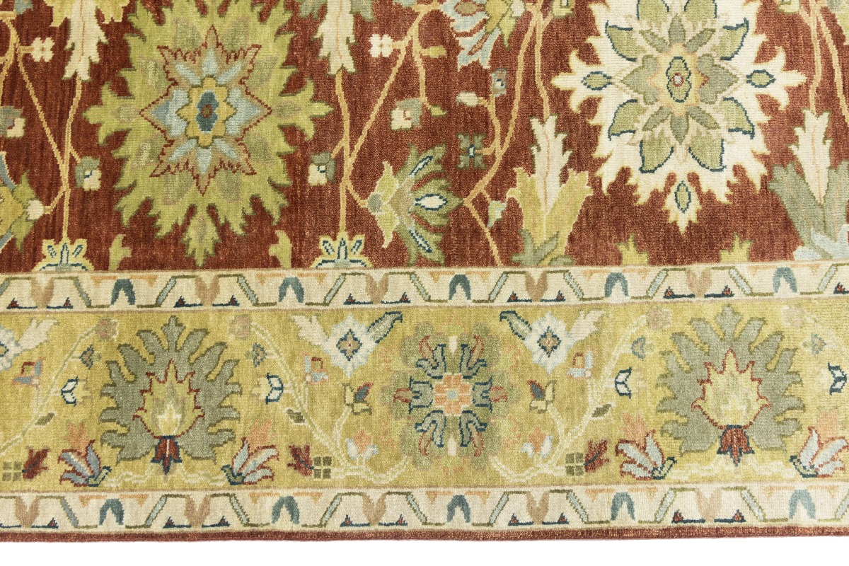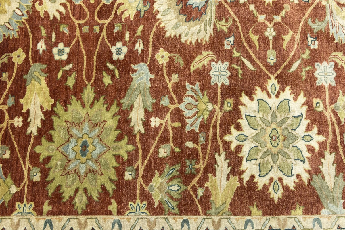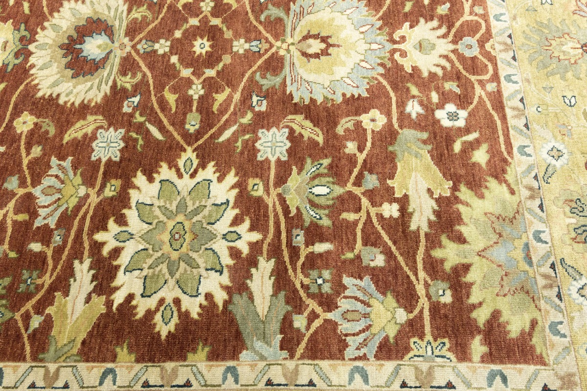 This genuine 8X10 orange new Oriental rug was made by the hands of gifted weavers inspired by a variety of spectacular artistic designs, to recreate the aged look of the original piece with a richness of color and ornately patterned background field. What set this vintage style Oriental area rug from the others are the material and dye used (wool pile and cotton foundation), knot count, ancient designs, fantastic grades, and its regional historical connection: it has deep roots, from the story of the people who produced it to the meaning of the symbols and colors displayed across its canvas that have been praised for centuries. This Indian home décor carpet will be completely cozy and inviting that never will go out of style! Also, this Oriental rug would be among your most valuable treasures, it is a great investment that accrues value over time, and it will last for generations because was woven with high-quality, all-natural wool. Environmentally friendly, opulent yet affordable; this rug will give you a thorough amount of character to help define your living space with elegance and warmth that will capture the eyes and attention of your audience (homeowners, designers, decorators, family and friends). OT-9063