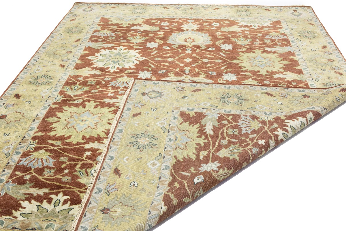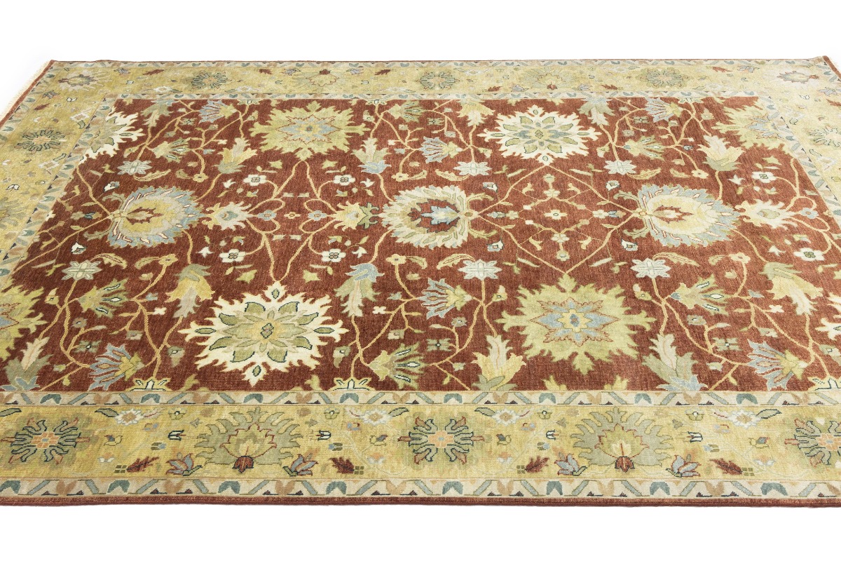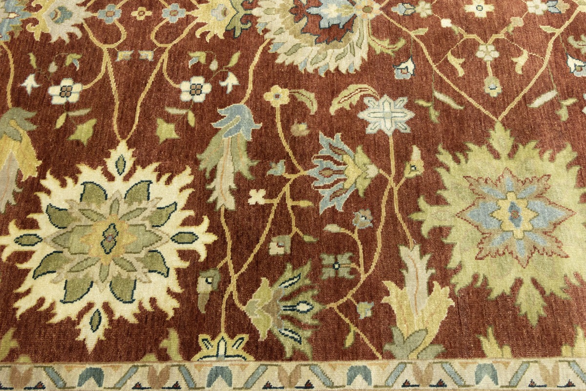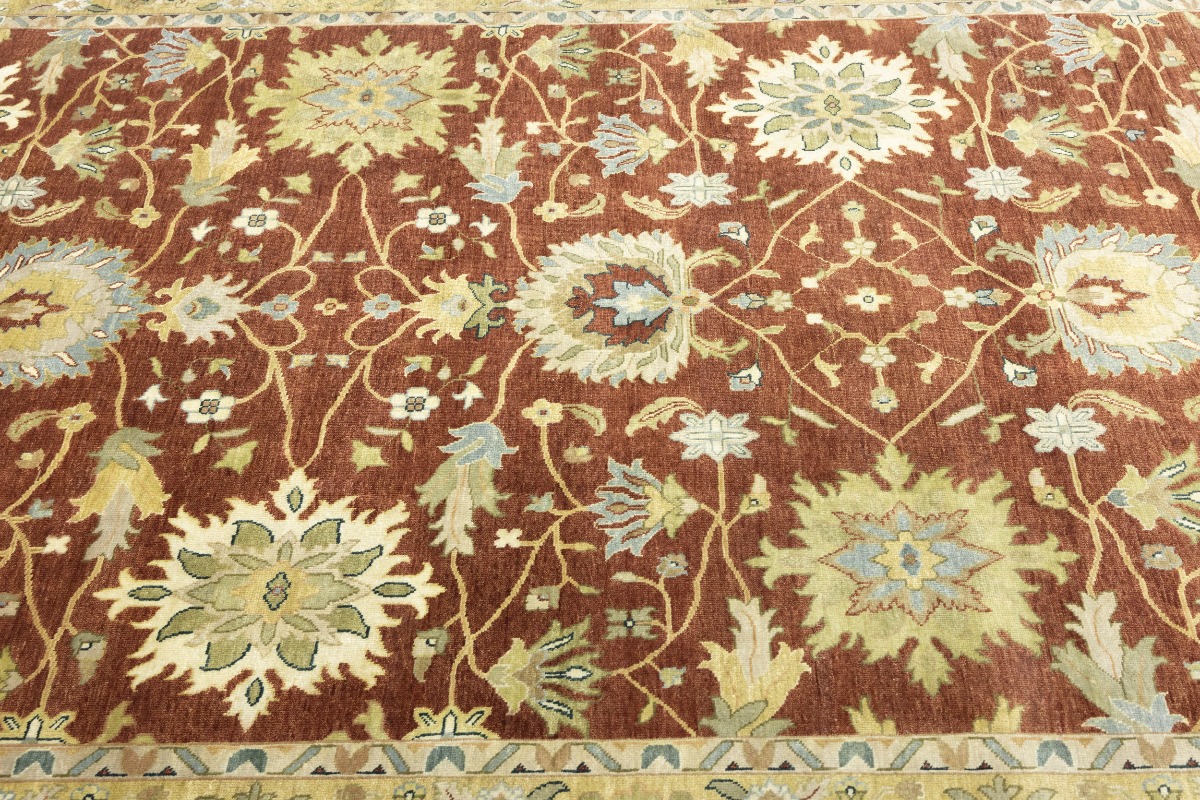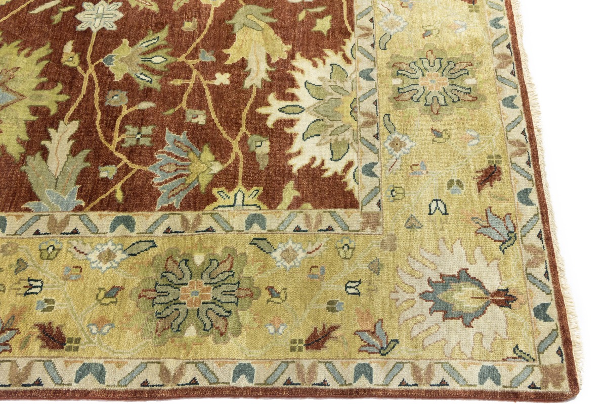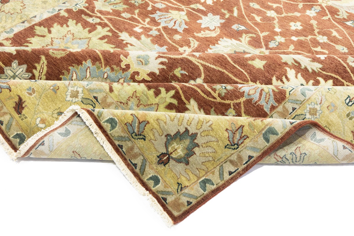 This genuine 9X12 orange new Oriental rug was made by the hands of gifted weavers inspired by a variety of spectacular artistic designs, to recreate the aged look of the original piece with a richness of color and ornately patterned background field. What set this vintage style Oriental area rug from the others are the material and dye used (wool pile and cotton foundation), knot count, ancient designs, fantastic grades, and its regional historical connection: it has deep roots, from the story of the people who produced it to the meaning of the symbols and colors displayed across its canvas that have been praised for centuries. This Indian home décor carpet will be completely cozy and inviting that never will go out of style! Also, this Oriental rug would be among your most valuable treasures, it is a great investment that accrues value over time, and it will last for generations because was woven with high-quality, all-natural wool. Environmentally friendly, opulent yet affordable; this rug will give you a thorough amount of character to help define your living space with elegance and warmth that will capture the eyes and attention of your audience (homeowners, designers, decorators, family and friends). OT-9065