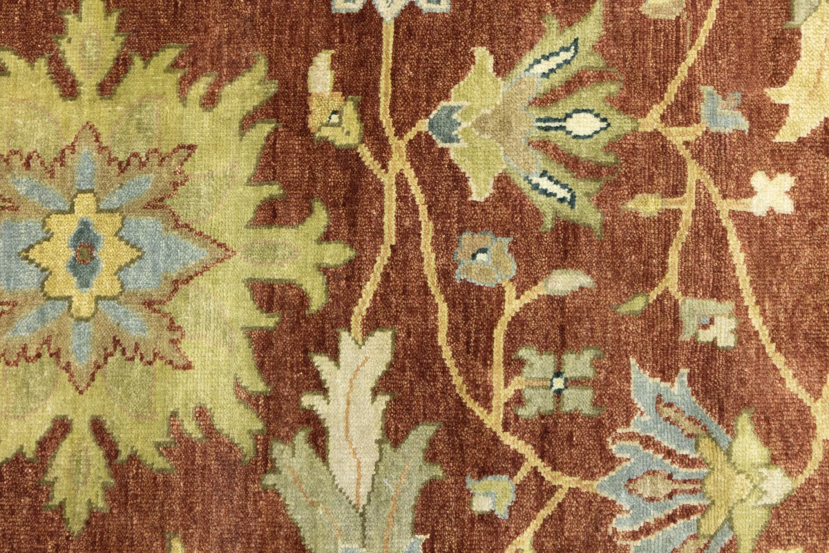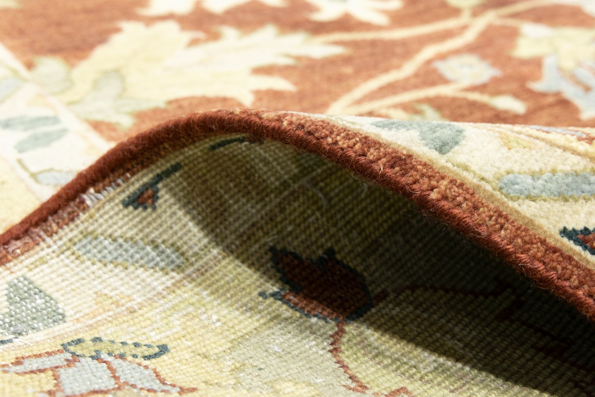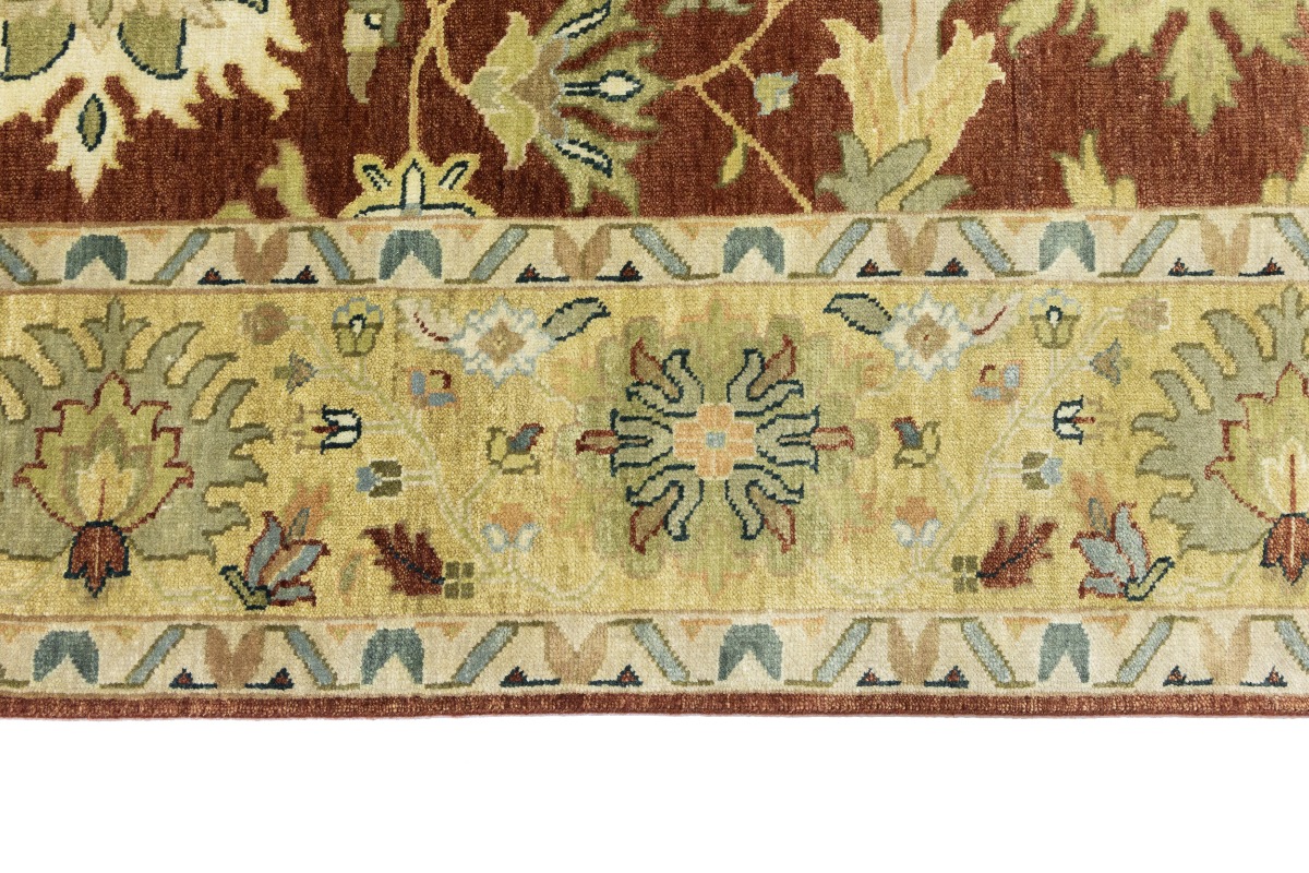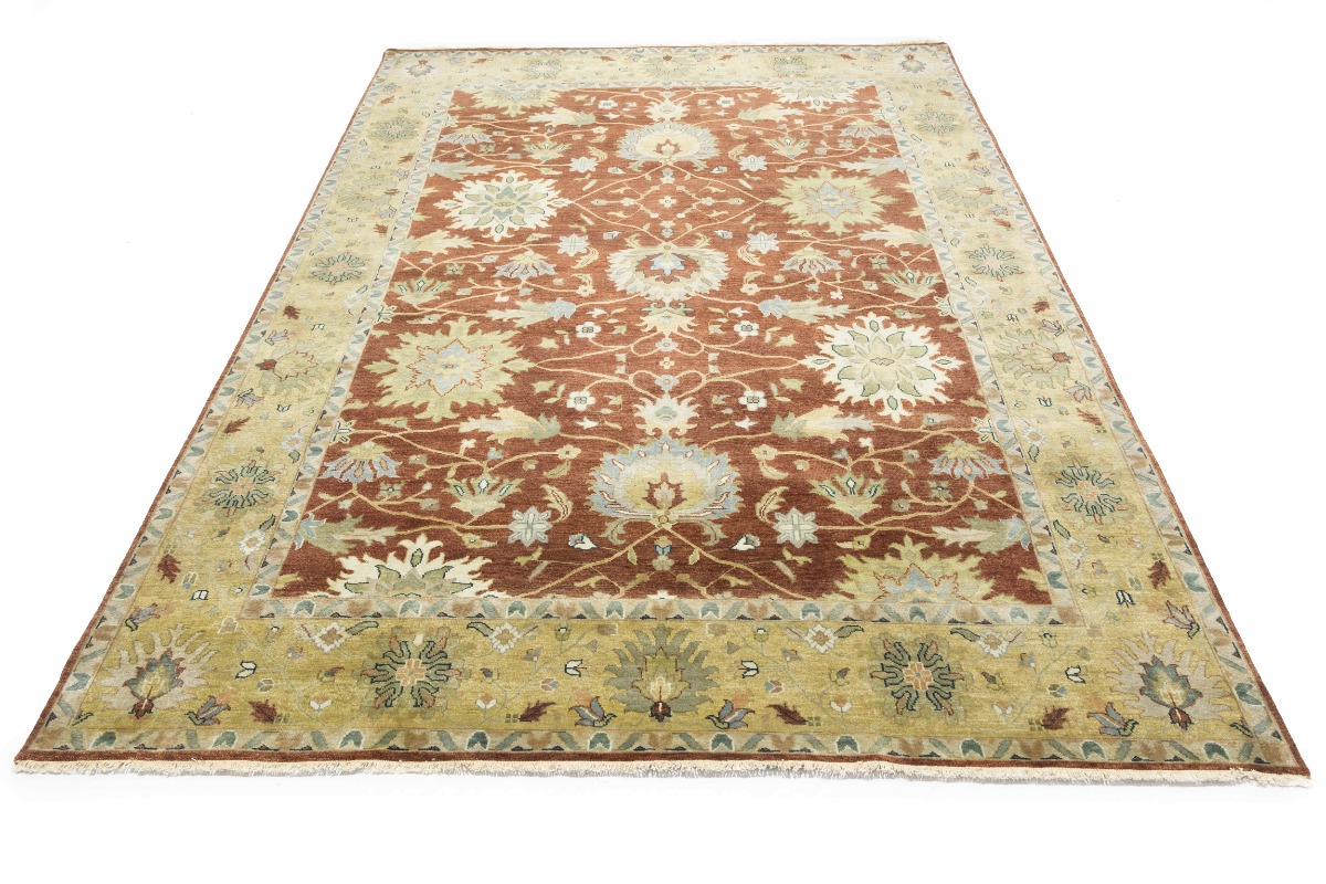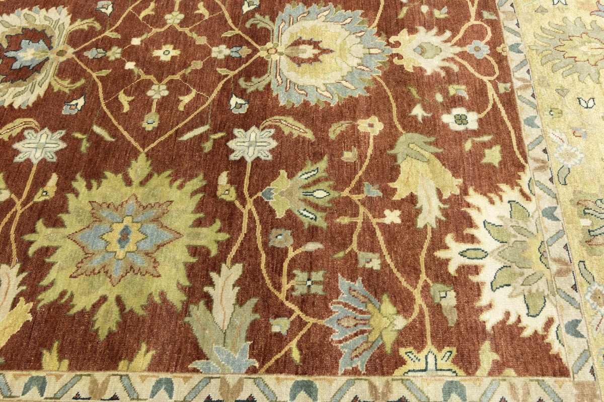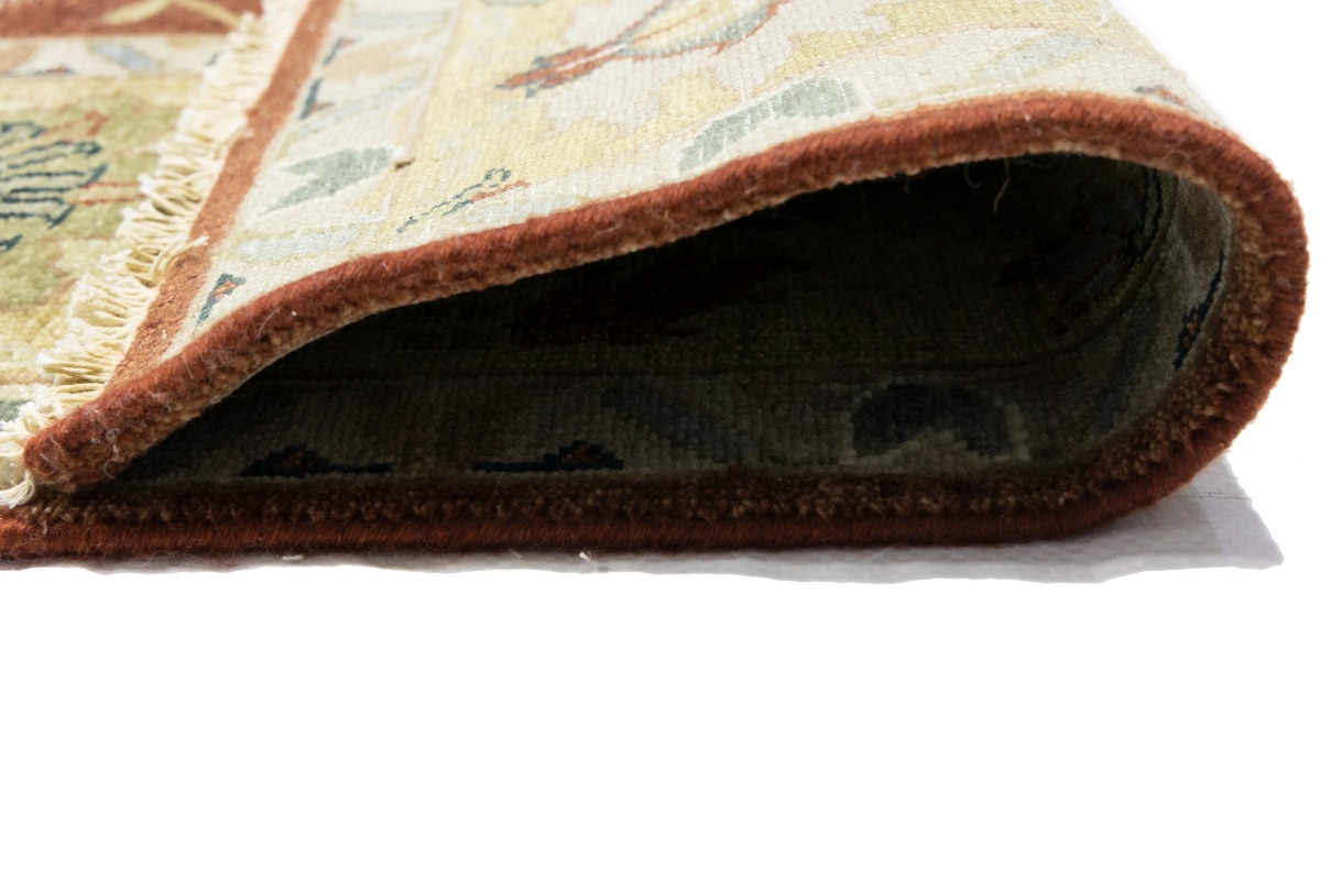 This genuine 9X12 orange new Oriental rug was made by the hands of gifted weavers inspired by a variety of spectacular artistic designs, to recreate the aged look of the original piece with a richness of color and ornately patterned background field. What set this vintage style Oriental area rug from the others are the material and dye used (wool pile and cotton foundation), knot count, ancient designs, fantastic grades, and its regional historical connection: it has deep roots, from the story of the people who produced it to the meaning of the symbols and colors displayed across its canvas that have been praised for centuries. This Indian home décor carpet will be completely cozy and inviting that never will go out of style! Also, this Oriental rug would be among your most valuable treasures, it is a great investment that accrues value over time, and it will last for generations because was woven with high-quality, all-natural wool. Environmentally friendly, opulent yet affordable; this rug will give you a thorough amount of character to help define your living space with elegance and warmth that will capture the eyes and attention of your audience (homeowners, designers, decorators, family and friends). OT-9065