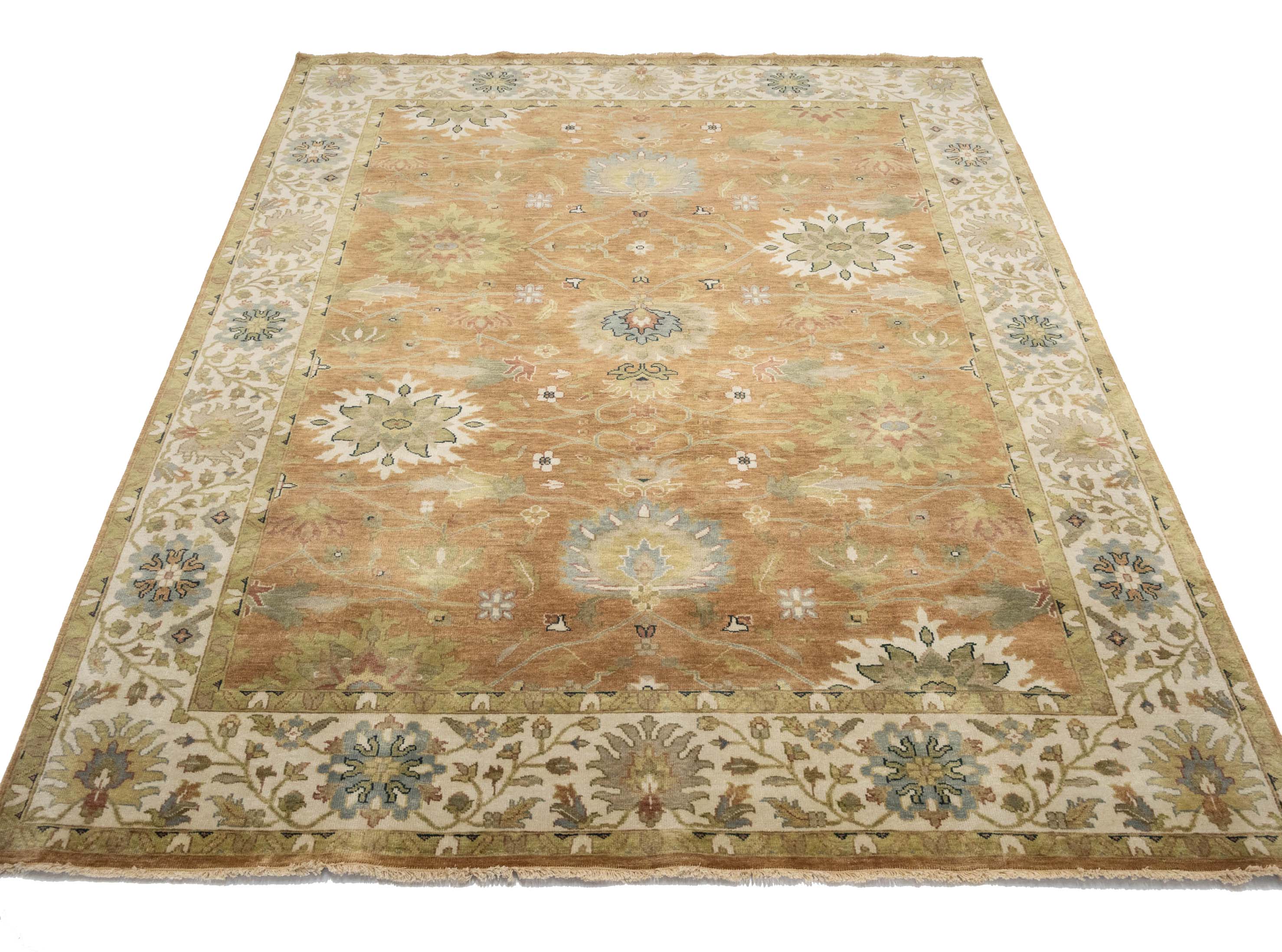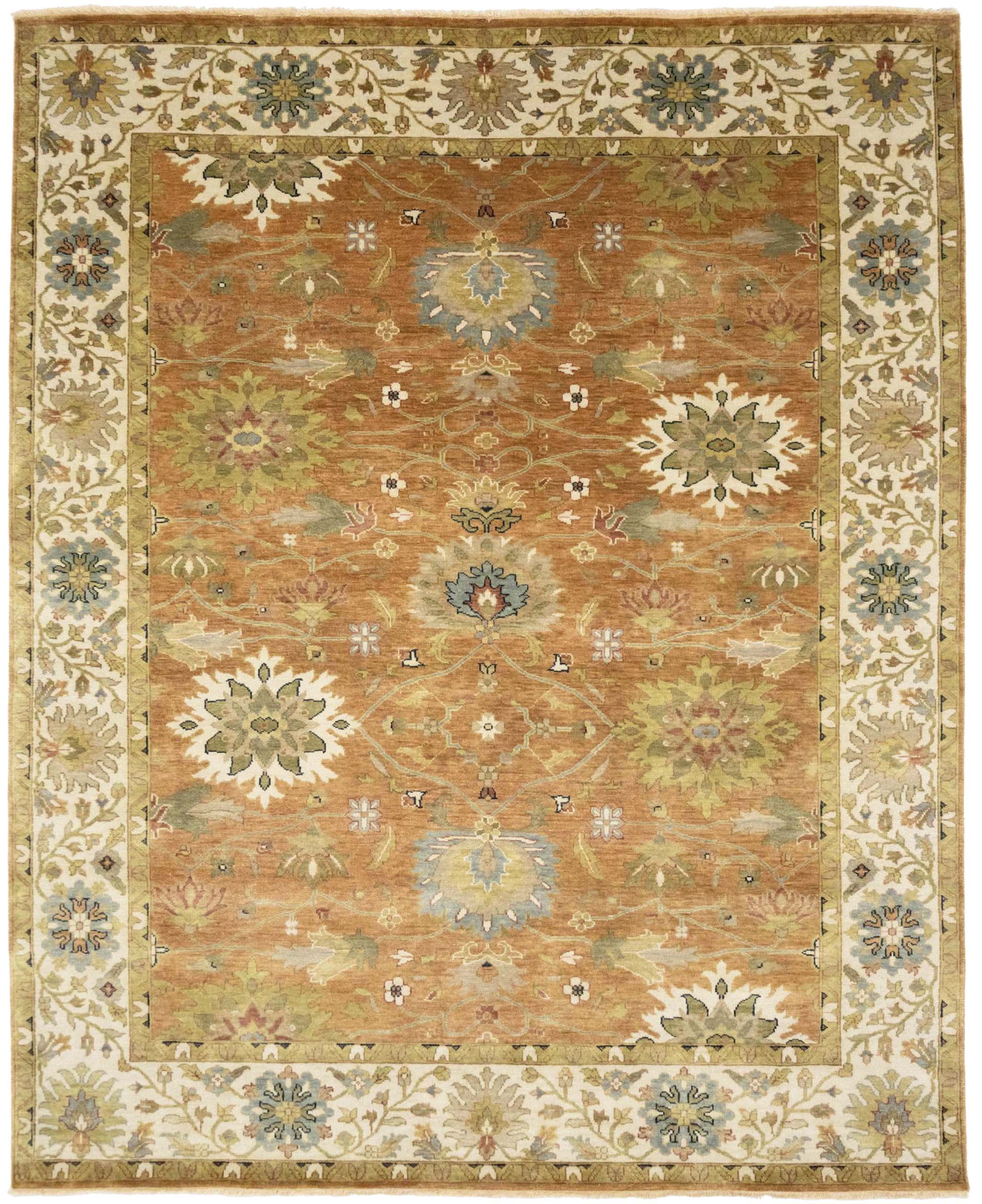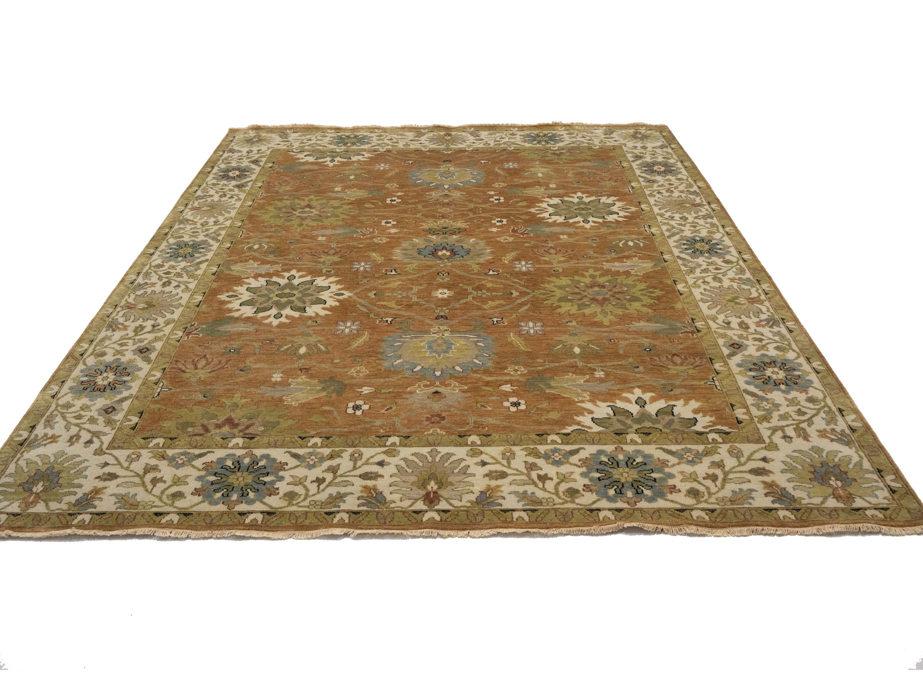 This genuine 8x10 Rust new Oriental rug was made by the hands of gifted weavers inspired by a variety of spectacular artistic designs, to recreate the aged look of the original piece with a richness of color and ornately patterned background field. What set this vintage style Oriental area rug from the others are the material and dye used (wool pile and cotton foundation), knot count, ancient designs, fantastic grades, and its regional historical connection: it has deep roots, from the story of the people who produced it to the meaning of the symbols and colors displayed across its canvas that have been praised for centuries. This Indian home décor carpet will be completely cozy and inviting that never will go out of style! Also, this Oriental rug would be among your most valuable treasures, it is a great investment that accrues value over time, and it will last for generations because was woven with high-quality, all-natural wool. Environmentally friendly, opulent yet affordable; this rug will give you a thorough amount of character to help define your living space with elegance and warmth that will capture the eyes and attention of your audience (homeowners, designers, decorators, family and friends). OT-11305