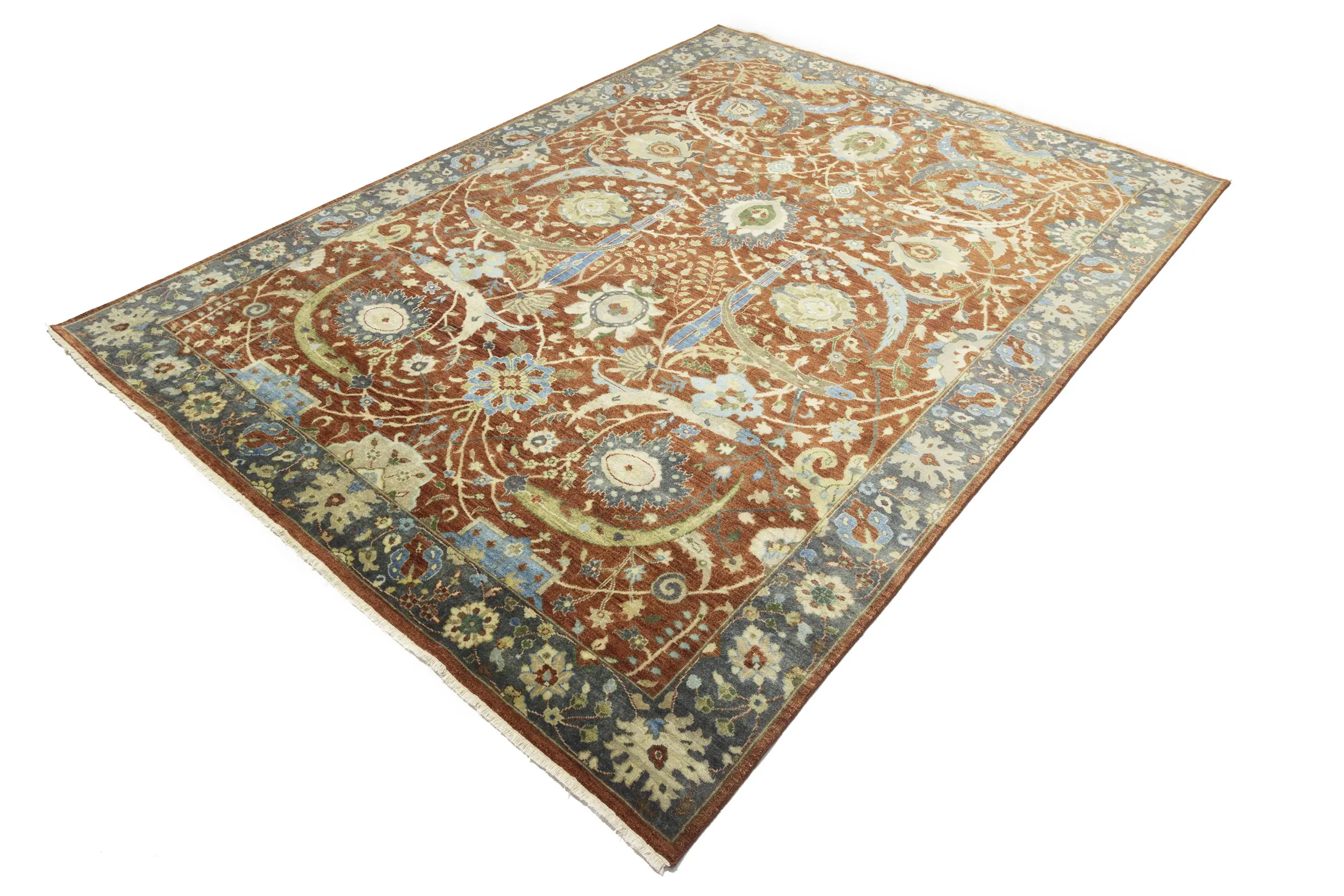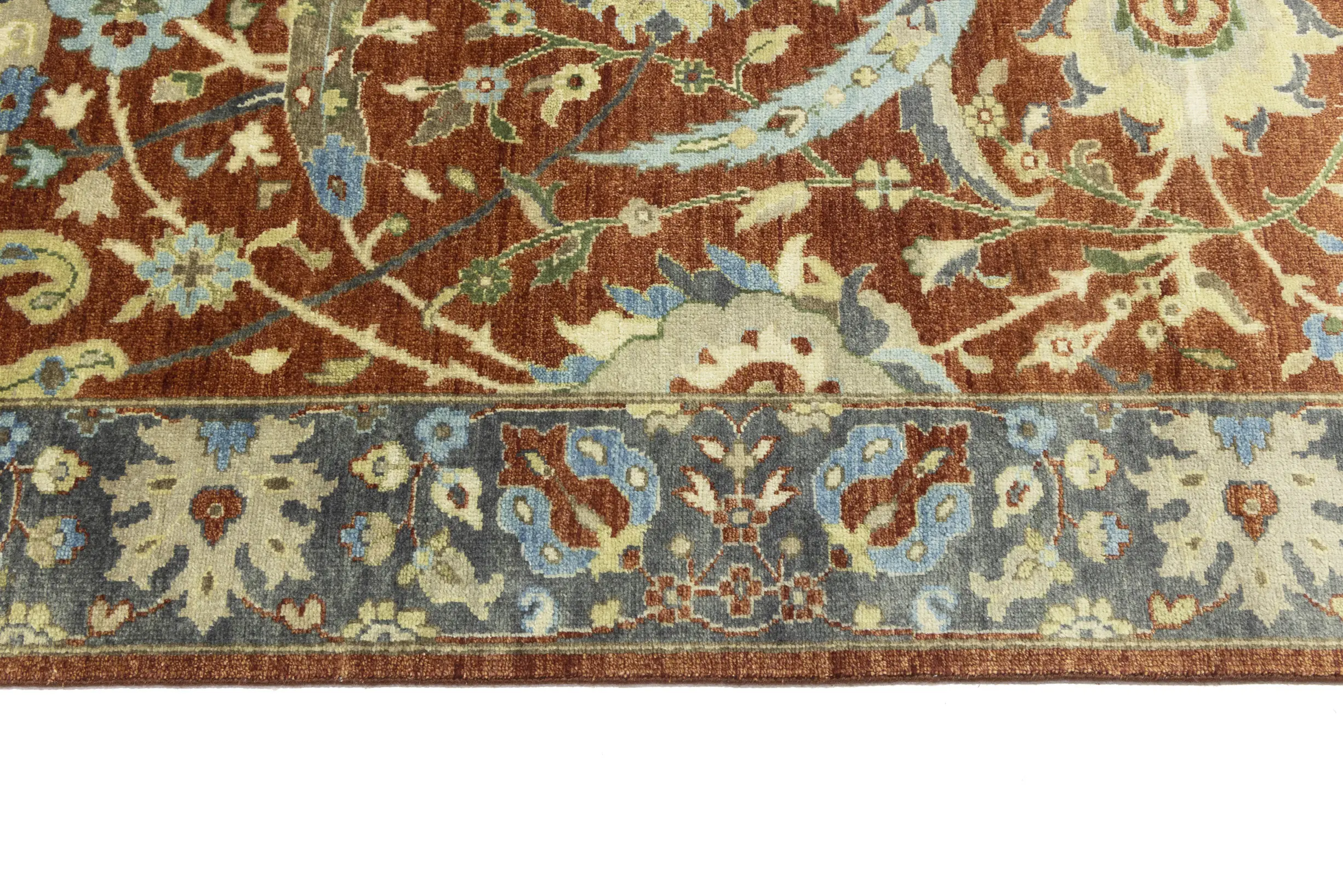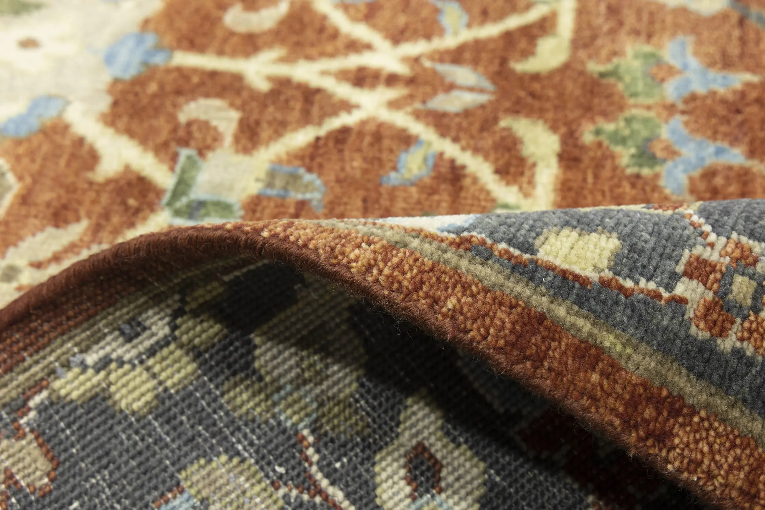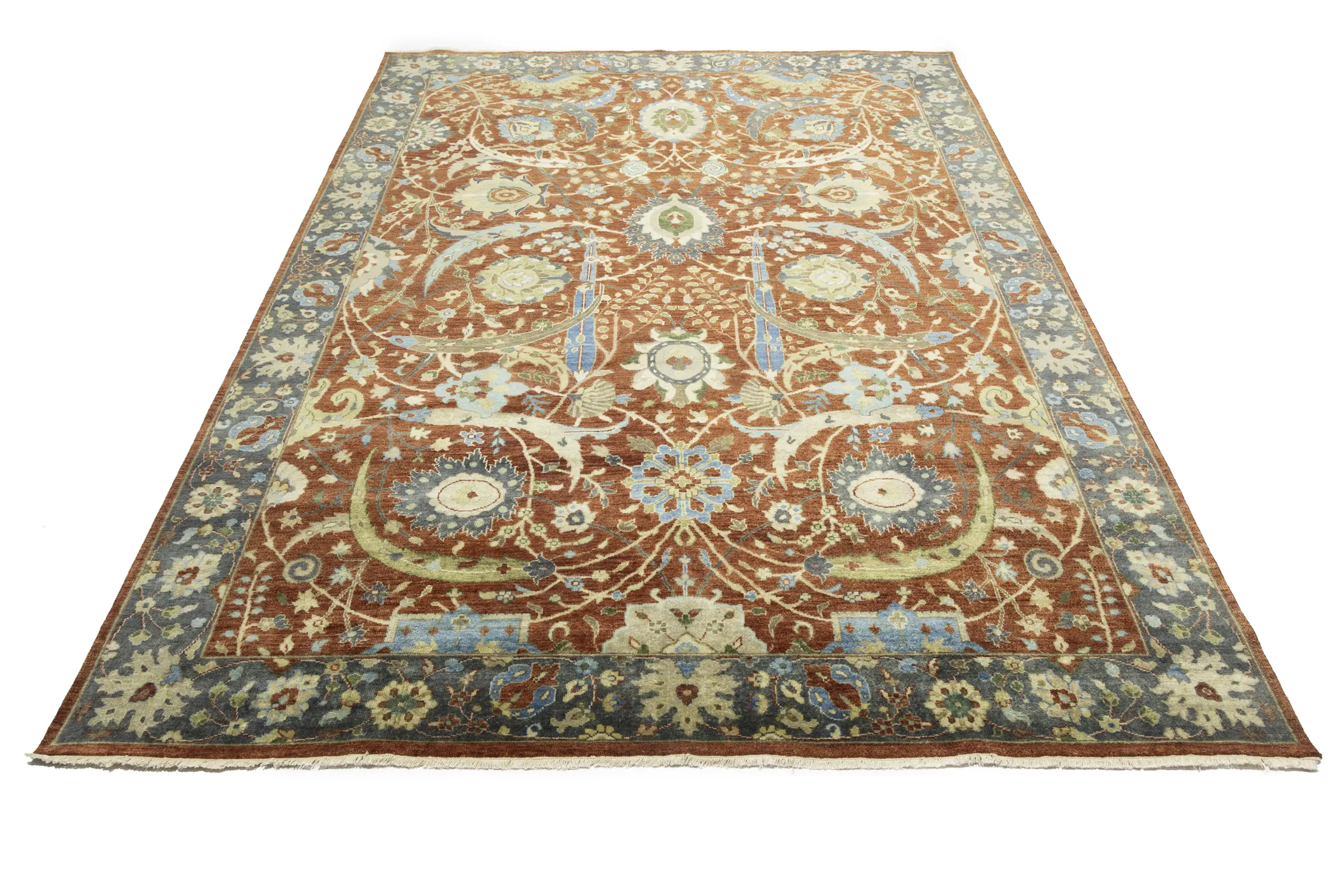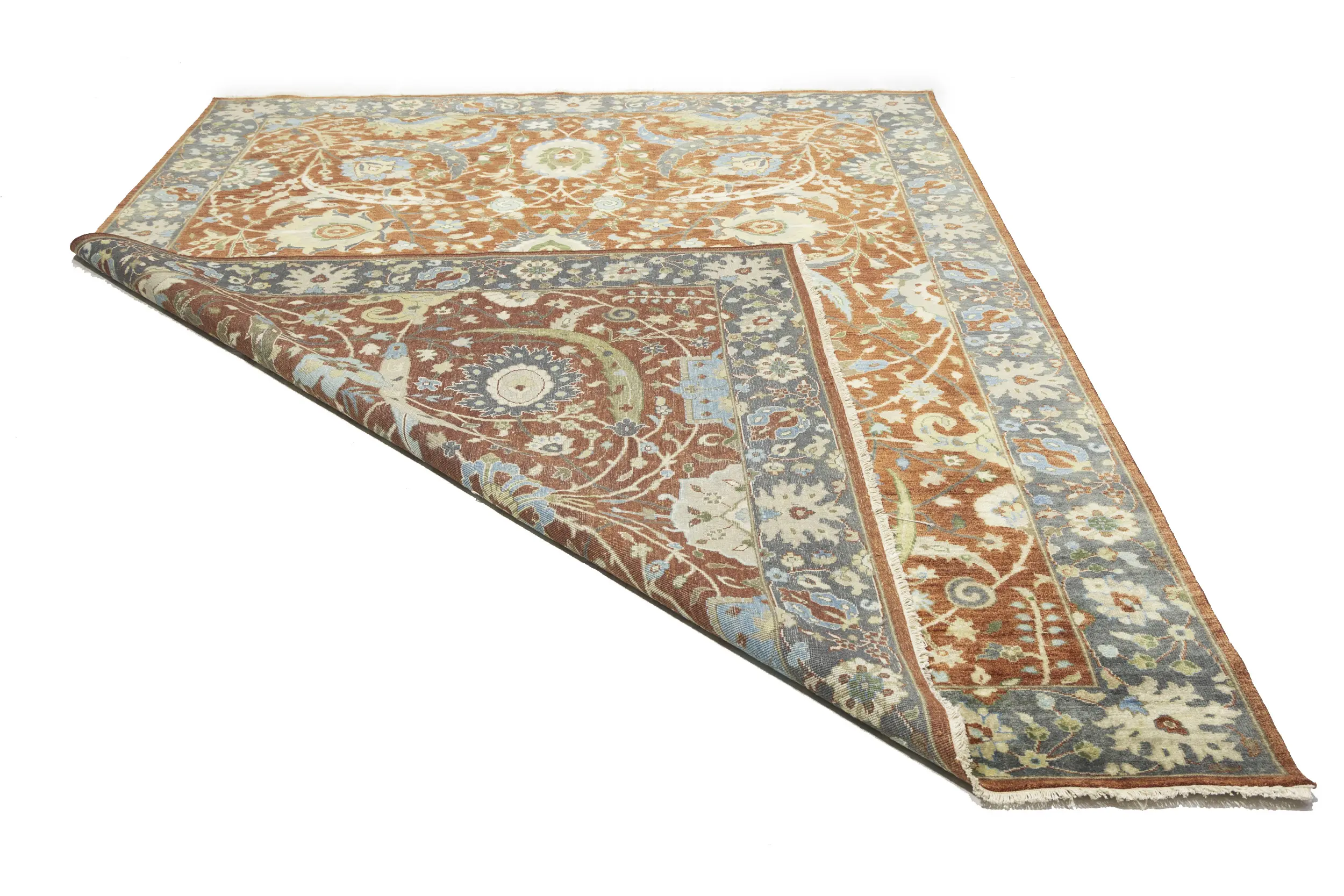 This genuine 9X12 orange new Oriental rug was made by the hands of gifted weavers inspired by a variety of spectacular artistic designs, to recreate the aged look of the original piece with a richness of color and ornately patterned background field. What set this vintage style Oriental area rug from the others are the material and dye used (wool pile and cotton foundation), knot count, ancient designs, fantastic grades, and its regional historical connection: it has deep roots, from the story of the people who produced it to the meaning of the symbols and colors displayed across its canvas that have been praised for centuries. This Indian home décor carpet will be completely cozy and inviting that never will go out of style! Also, this Oriental rug would be among your most valuable treasures, it is a great investment that accrues value over time, and it will last for generations because was woven with high-quality, all-natural wool. Environmentally friendly, opulent yet affordable; this rug will give you a thorough amount of character to help define your living space with elegance and warmth that will capture the eyes and attention of your audience (homeowners, designers, decorators, family and friends).