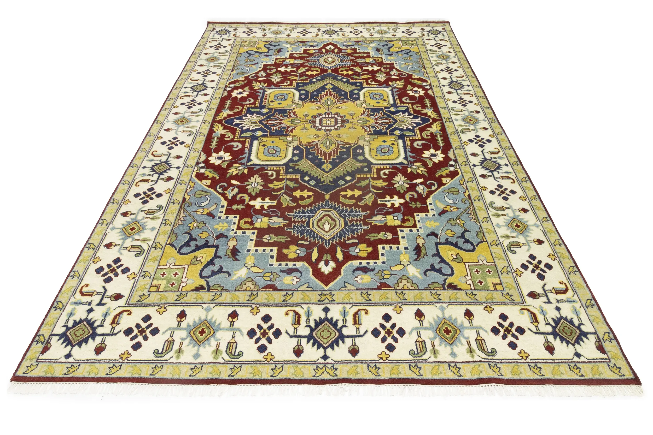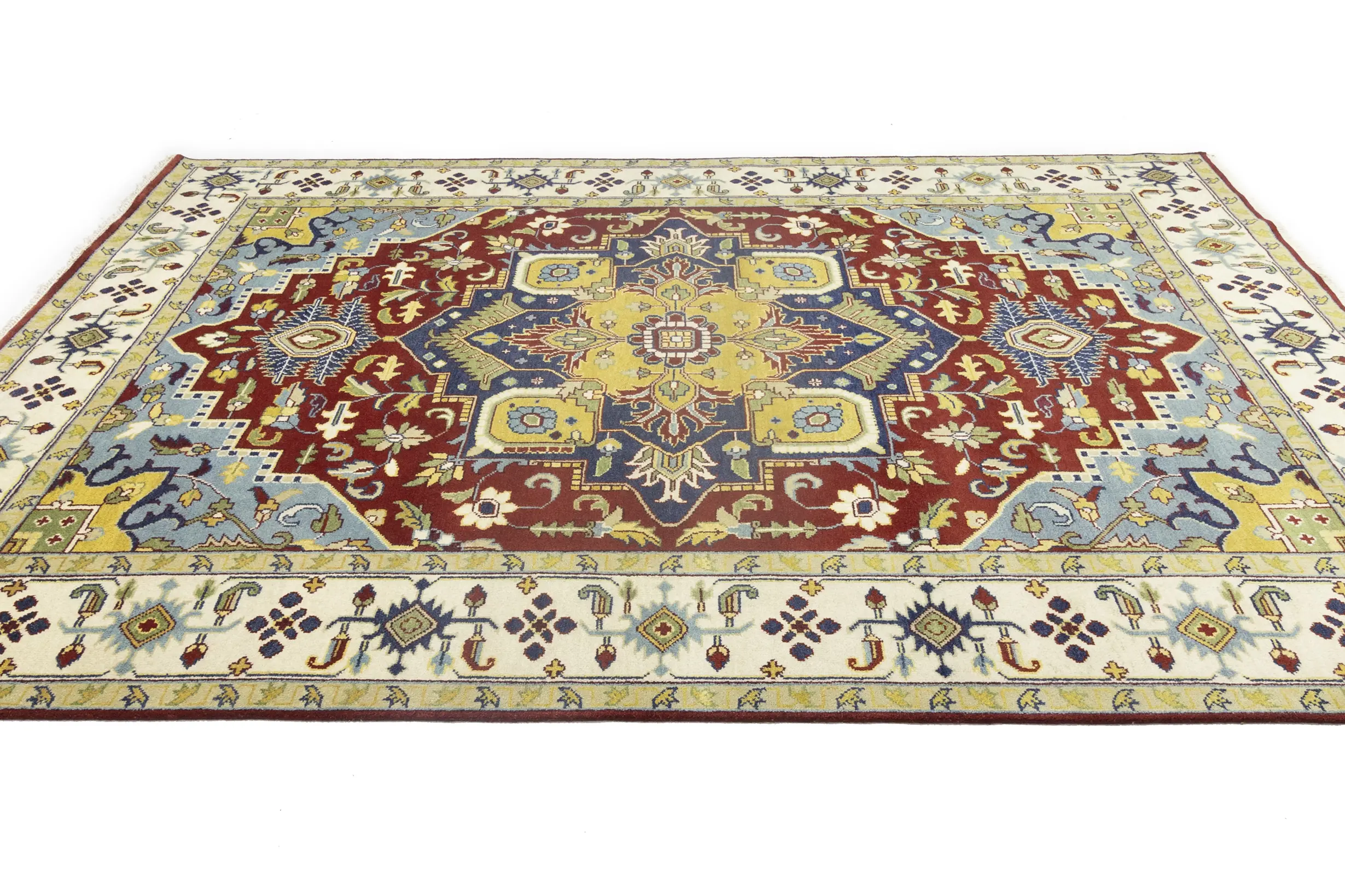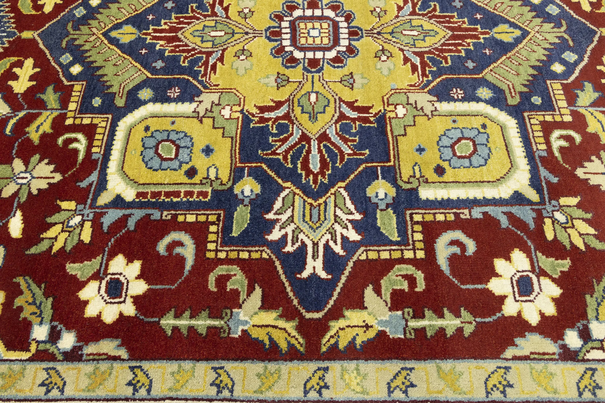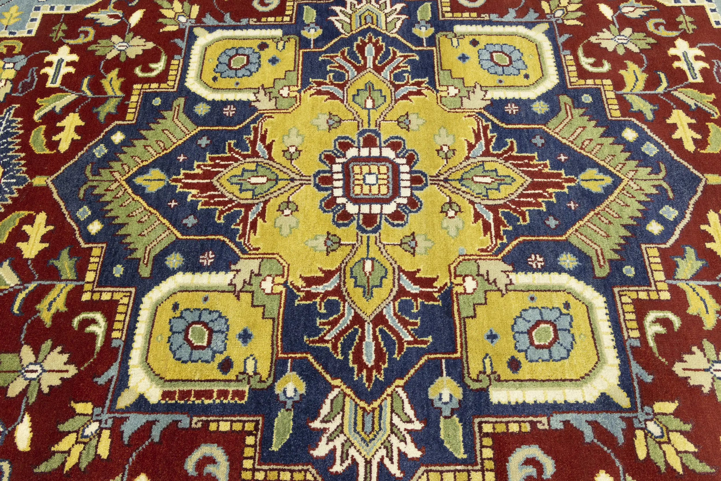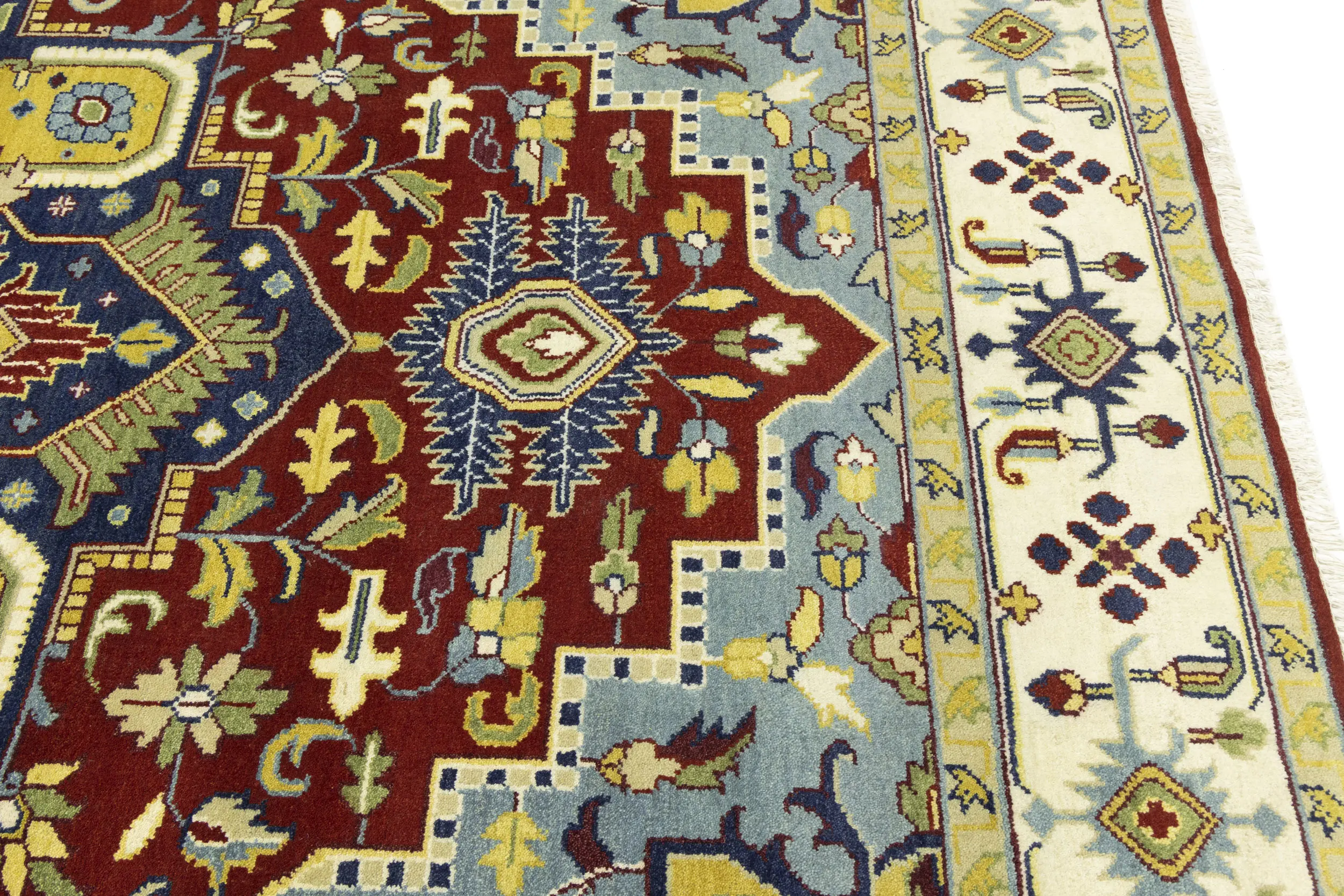 This original 10X14 red new Oriental rug was finely knotted by the hands of weavers influenced by a variety of amazing artistic designs, to recreate the aged look of the exceptional piece with a richness of color and embellished background field. What set this vintage style Oriental area rug from the others are the material and dye used (wool pile and cotton foundation), knot count, antique designs, fantastic grades, and its regional historical connection: it has deep roots, from the story of the people who produced it to the meaning of the symbols and colors displayed across its canvas that have been praised for centuries. This Indian home décor carpet will be completely cozy and inviting that never will go out of style!