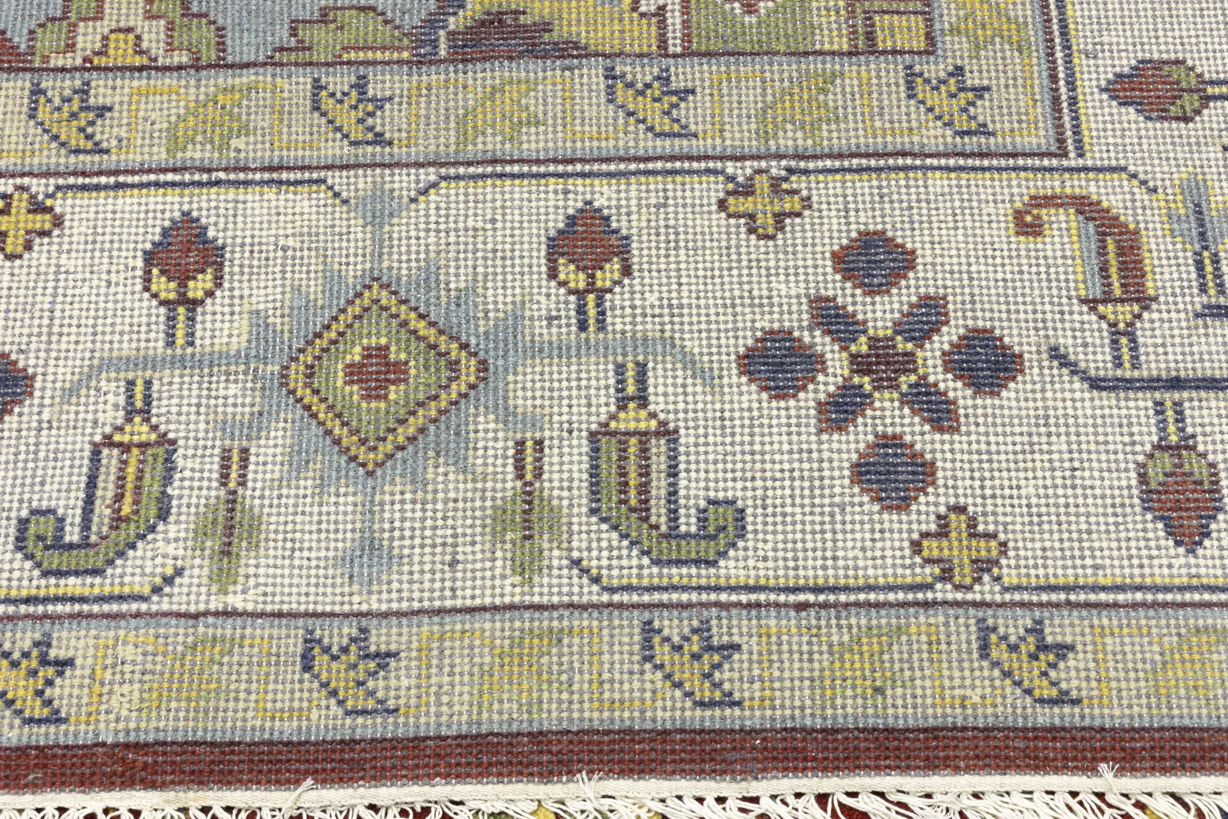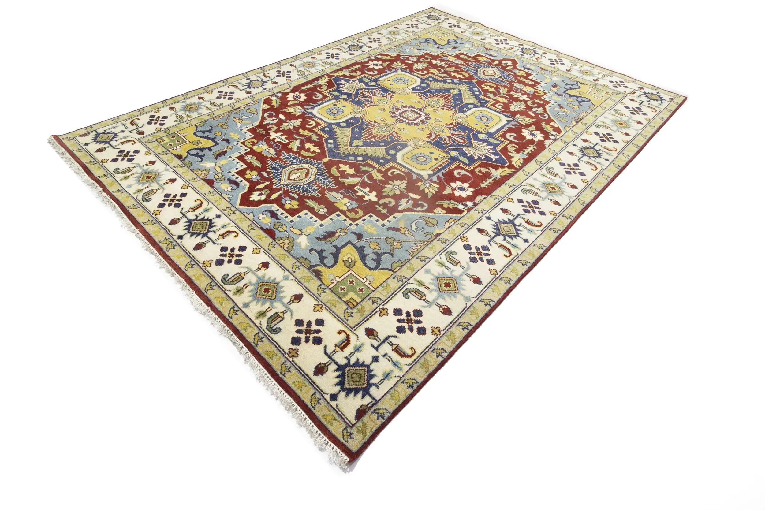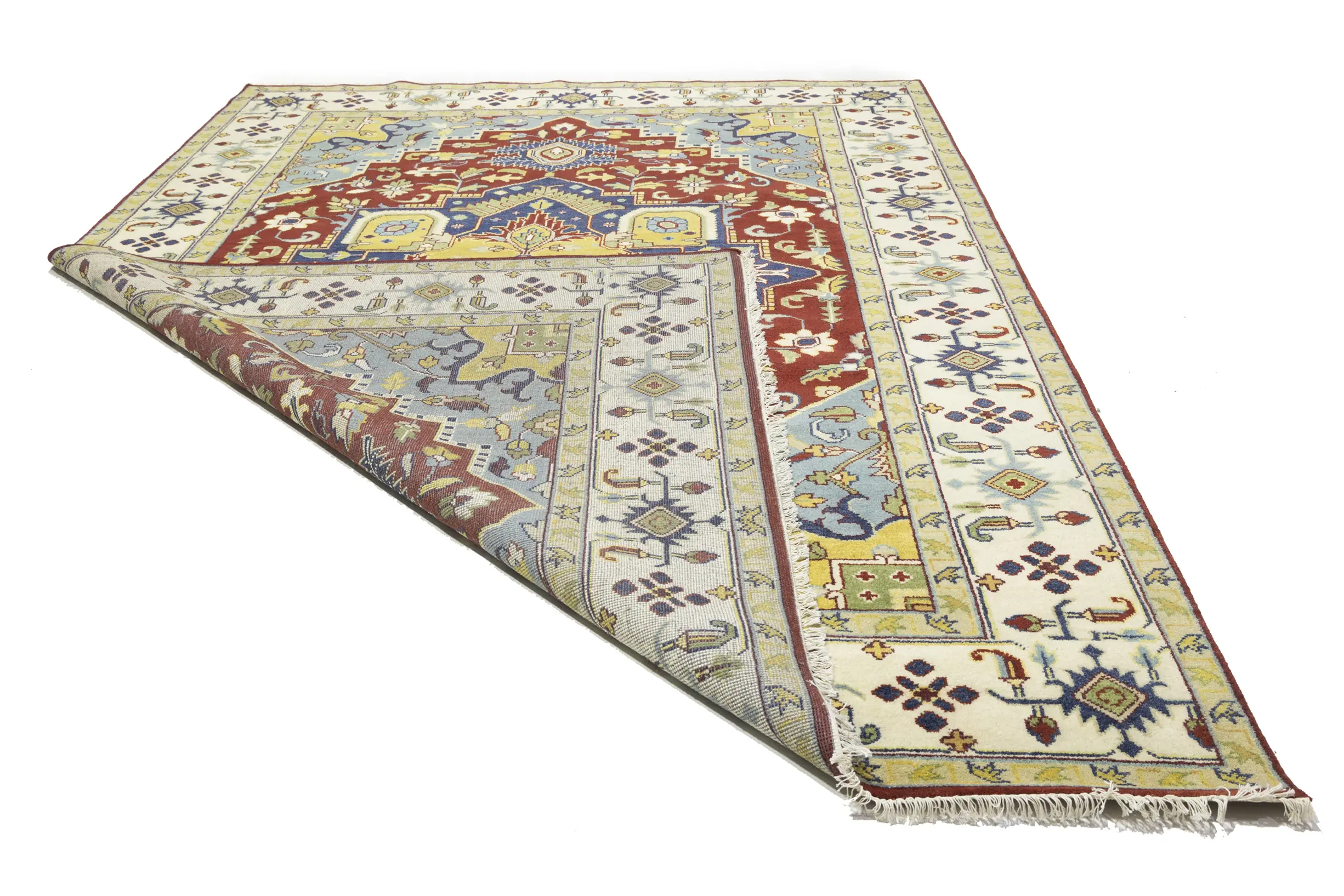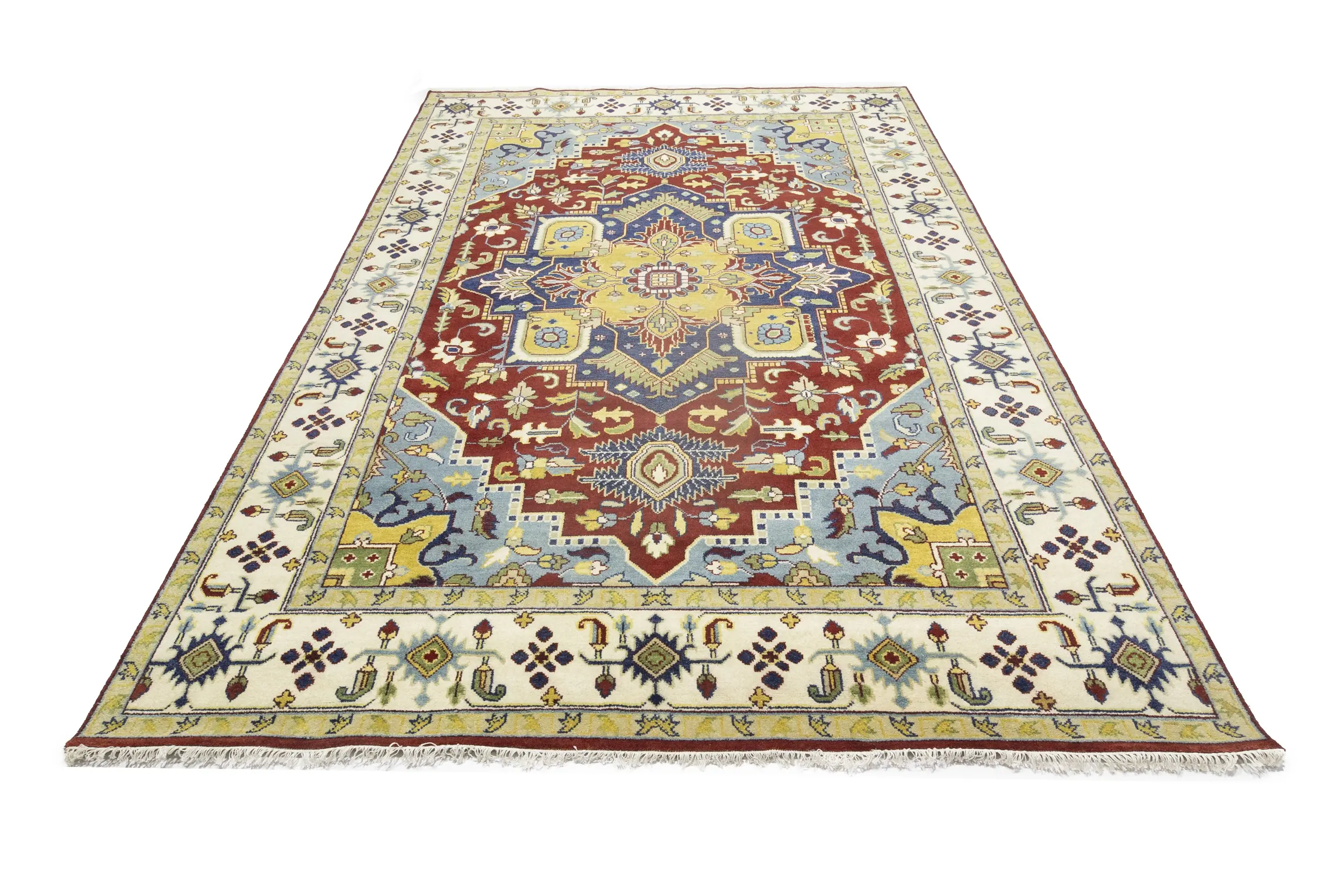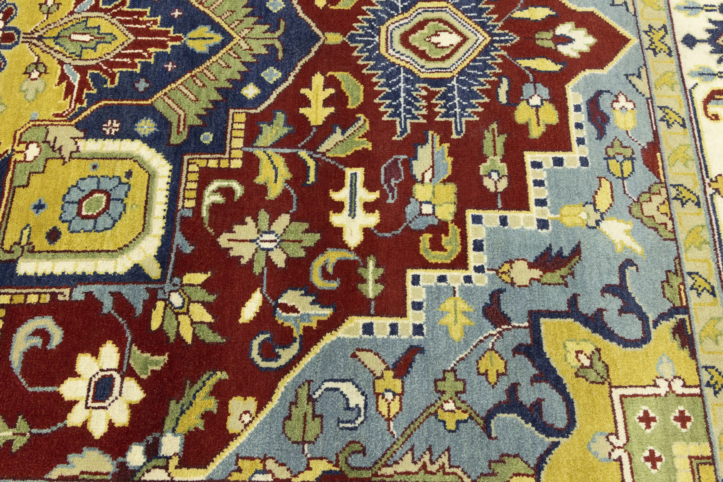 This original 10X14 red new Oriental rug was finely knotted by the hands of weavers influenced by a variety of amazing artistic designs, to recreate the aged look of the exceptional piece with a richness of color and embellished background field. What set this vintage style Oriental area rug from the others are the material and dye used (wool pile and cotton foundation), knot count, antique designs, fantastic grades, and its regional historical connection: it has deep roots, from the story of the people who produced it to the meaning of the symbols and colors displayed across its canvas that have been praised for centuries. This Indian home décor carpet will be completely cozy and inviting that never will go out of style!