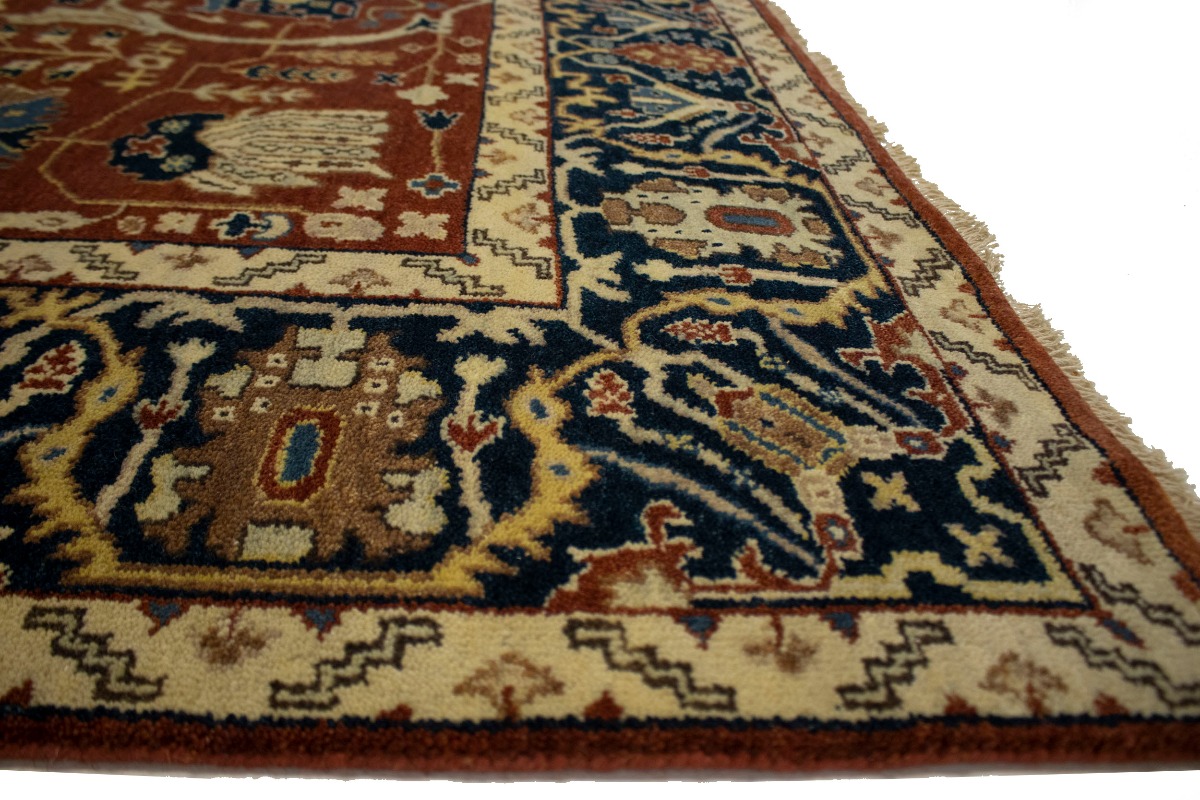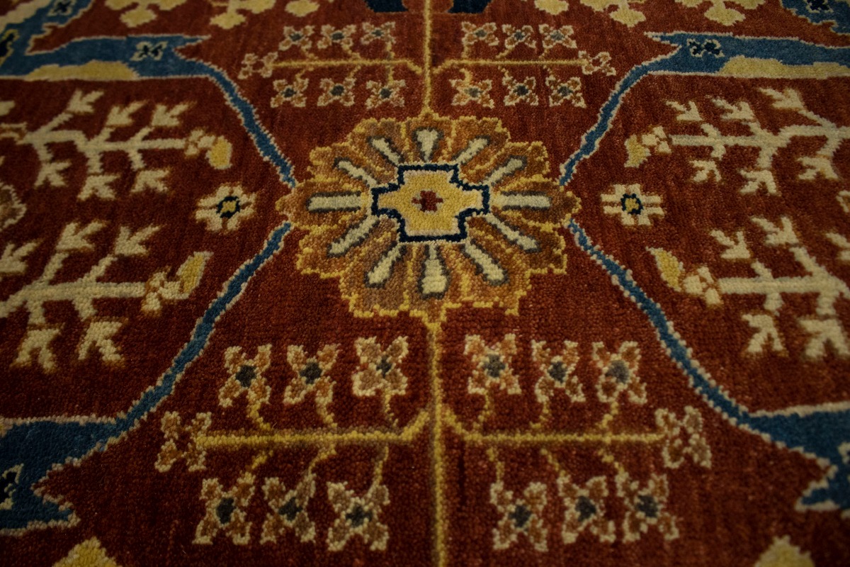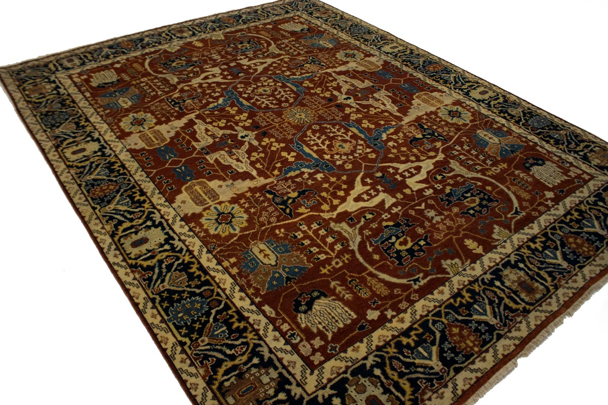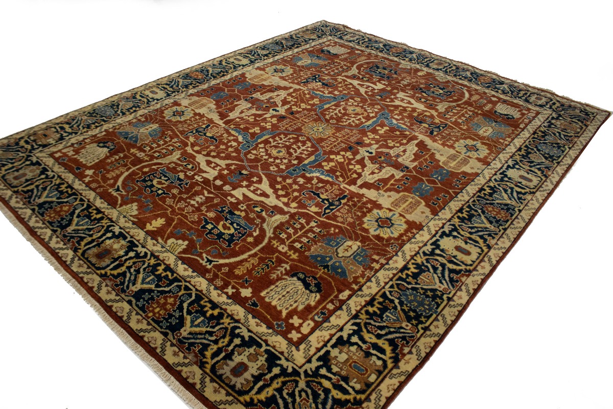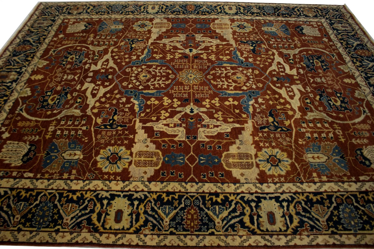 This genuine 8X10 rusty red new Oriental rug was masterly knotted by the hands of weavers inspired by a variety of wonderful artistic designs, to recreate the aged look of the original piece with a richness of color and intricate patterned background field. What set this vintage style Oriental area rug from the others are the material and dye used (wool pile and cotton foundation), knot count, antique designs, fantastic grades, and its regional historical connection: it has deep roots, from the story of the people who produced it to the meaning of the symbols and colors displayed across its canvas that have been praised for centuries. This Indian home décor carpet will be completely cozy and inviting that never will go out of style! Also, this Oriental rug would be among your most valuable treasures, it is a great investment that accrues value over time, and it will last for generations because was woven with high-quality, all-natural wool. Environmentally friendly, opulent yet affordable; this rug/runner will give you a thorough amount of character to help define your living space with luxury and warmth that will capture the eyes and attention of your audience (homeowners, designers, decorators, family and friends). OT-884