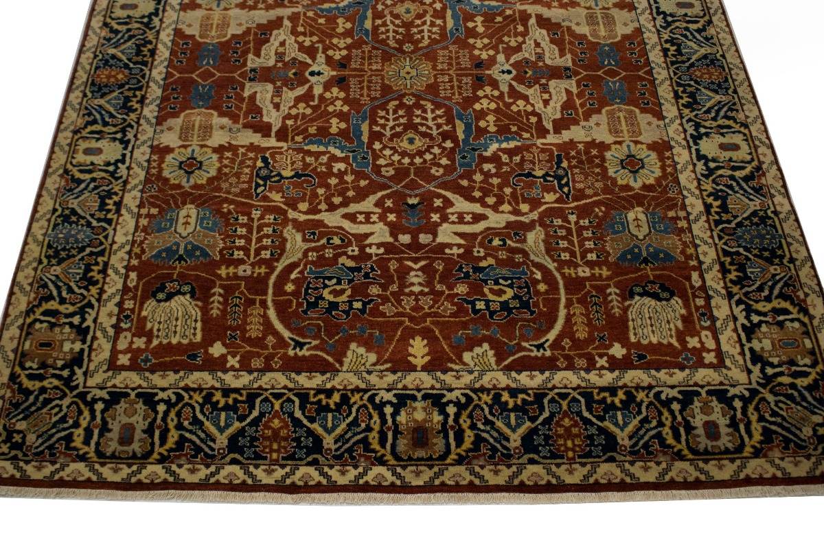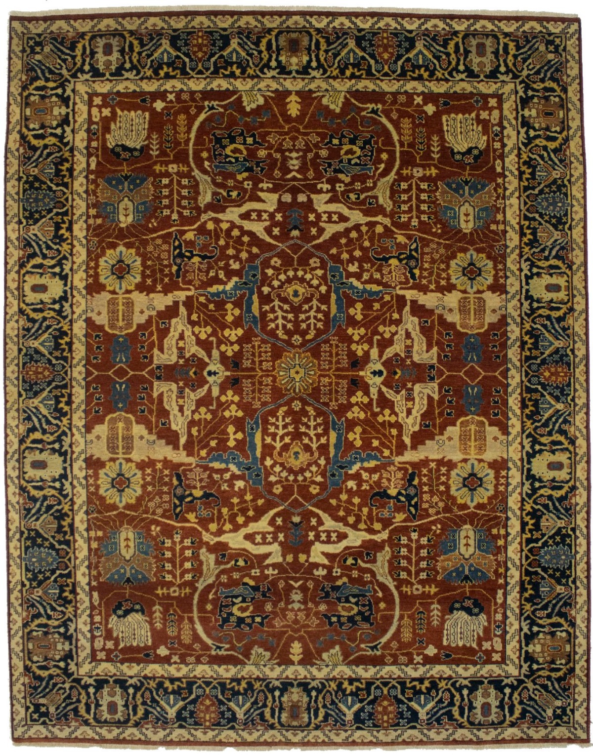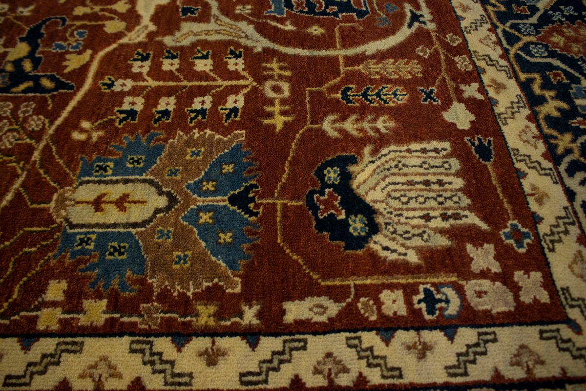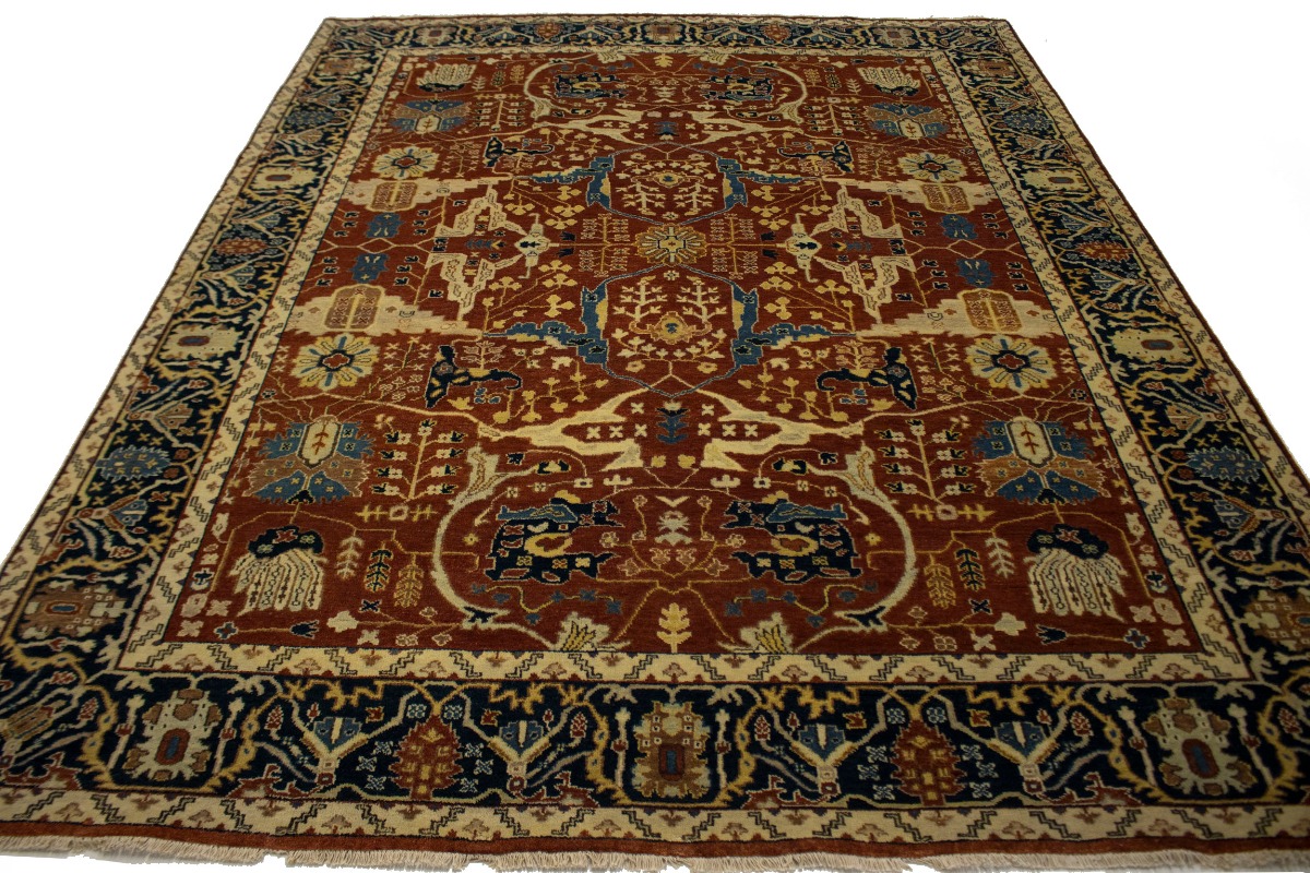 This genuine 8X10 rusty red new Oriental rug was masterly knotted by the hands of weavers inspired by a variety of wonderful artistic designs, to recreate the aged look of the original piece with a richness of color and intricate patterned background field. What set this vintage style Oriental area rug from the others are the material and dye used (wool pile and cotton foundation), knot count, antique designs, fantastic grades, and its regional historical connection: it has deep roots, from the story of the people who produced it to the meaning of the symbols and colors displayed across its canvas that have been praised for centuries. This Indian home décor carpet will be completely cozy and inviting that never will go out of style! Also, this Oriental rug would be among your most valuable treasures, it is a great investment that accrues value over time, and it will last for generations because was woven with high-quality, all-natural wool. Environmentally friendly, opulent yet affordable; this rug/runner will give you a thorough amount of character to help define your living space with luxury and warmth that will capture the eyes and attention of your audience (homeowners, designers, decorators, family and friends). OT-884