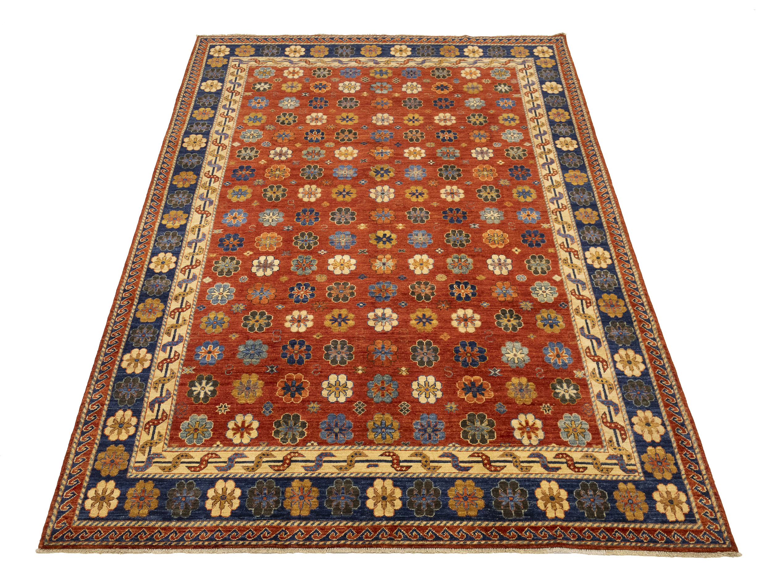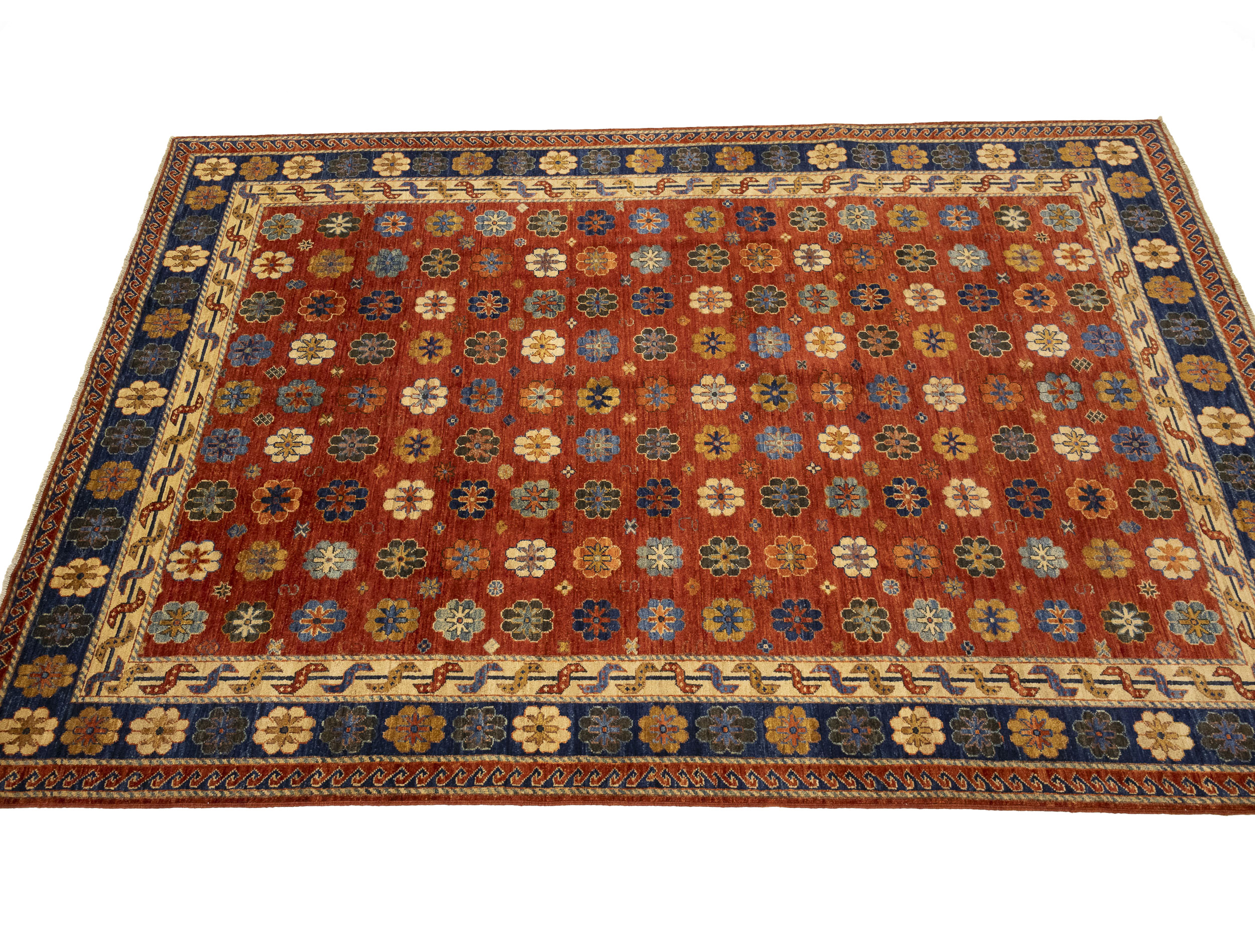 Hand Knotted 6'9X9'8 red Oriental rug made with vegetable dyes (fine wool pile and cotton foundation), superior knot count, and appealing ancient designs. This Oriental rug never will go out of style and would be among your most valuable treasures.