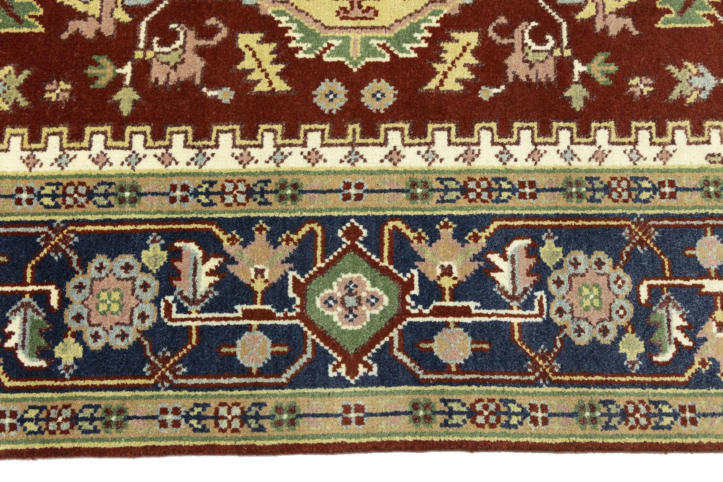 This original 9X12 Red new Oriental rug was finely knotted by the hands of weavers influenced by a variety of amazing artistic designs, to recreate the aged look of the exceptional piece with a richness of color and embellished background field. What set this vintage style Oriental area rug from the others are the material and dye used (wool pile and cotton foundation), knot count, antique designs, fantastic grades, and its regional historical connection: it has deep roots, from the story of the people who produced it to the meaning of the symbols and colors displayed across its canvas that have been praised for centuries. This Indian home décor carpet will be completely cozy and inviting that never will go out of style!