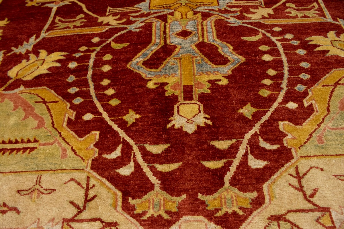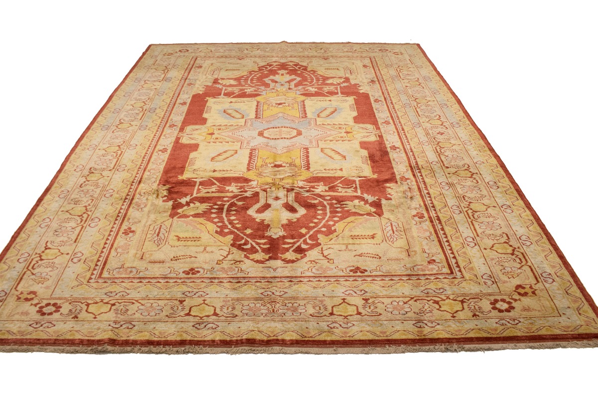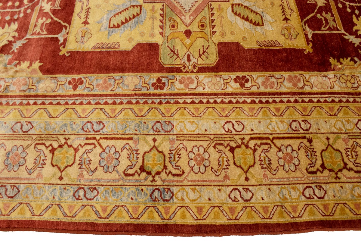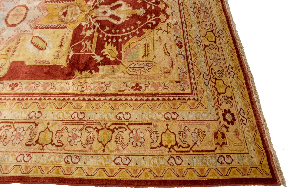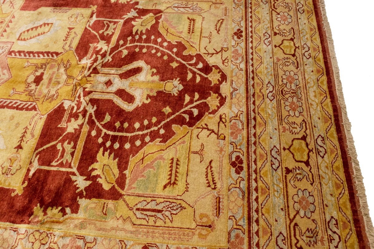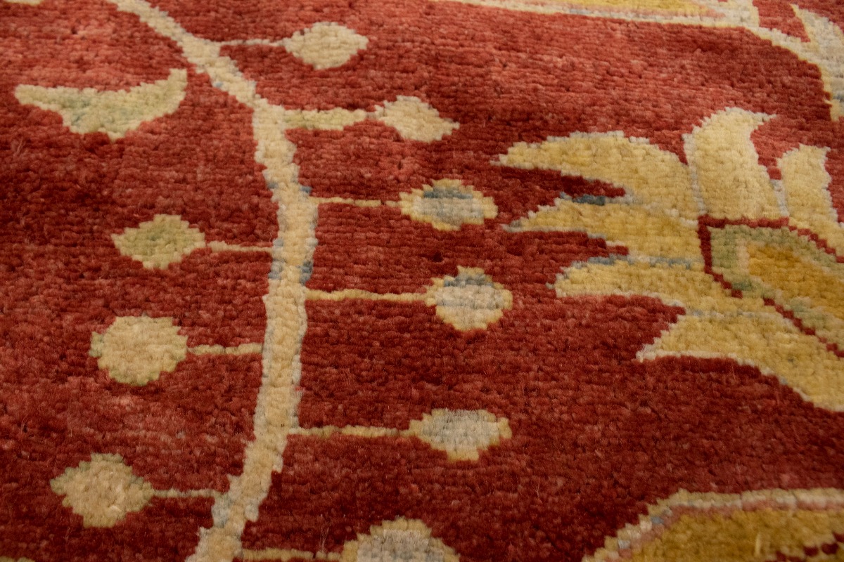This original 8'3X11'5 red new Oriental rug was finely knotted by the hands of weavers influenced by a variety of amazing artistic designs, to recreate the aged look of the exceptional piece with a richness of color and embellished background field. What set this vintage style Oriental area rug from the others are the material and dye used (wool pile and cotton foundation), knot count, antique designs, fantastic grades, and its regional historical connection: it has deep roots, from the story of the people who produced it to the meaning of the symbols and colors displayed across its canvas that have been praised for centuries. This Indian home décor carpet will be completely cozy and inviting that never will go out of style! Also, this Oriental rug would be among your most valuable treasures, it is a great investment that increase in value over time, and it will last a lifetime because was woven with high-quality, all-natural wool. Eco-friendly, opulent yet affordable; this rug will give you an extra pop of character to help define your home environment with luxury and warmth that will capture the eyes and attention of your audience (homeowners, designers, decorators, family and friends). RT-2151