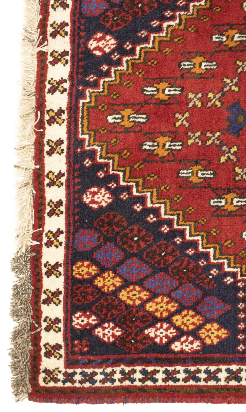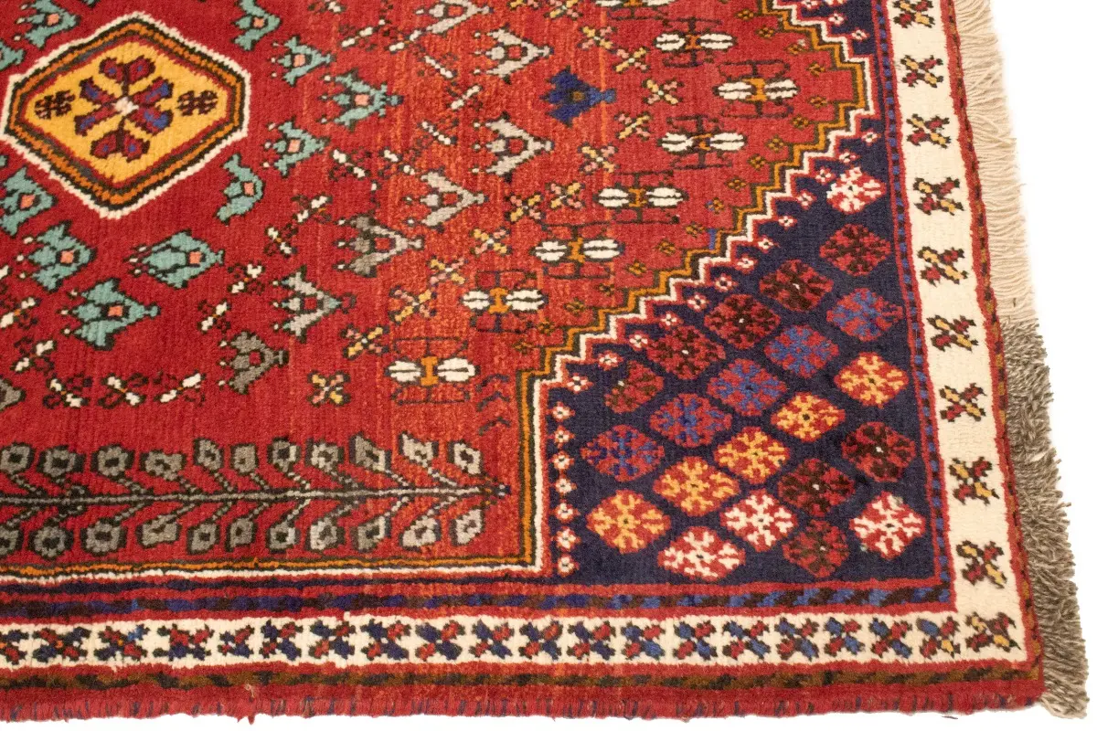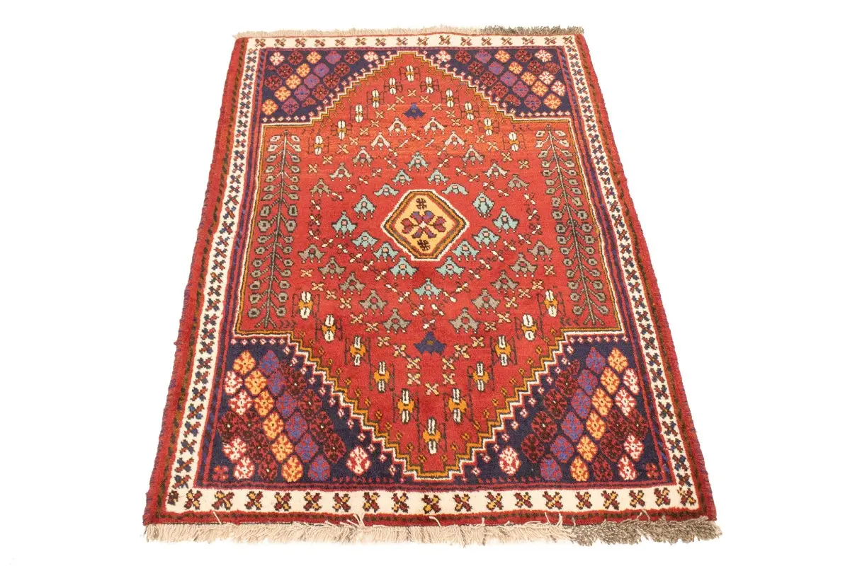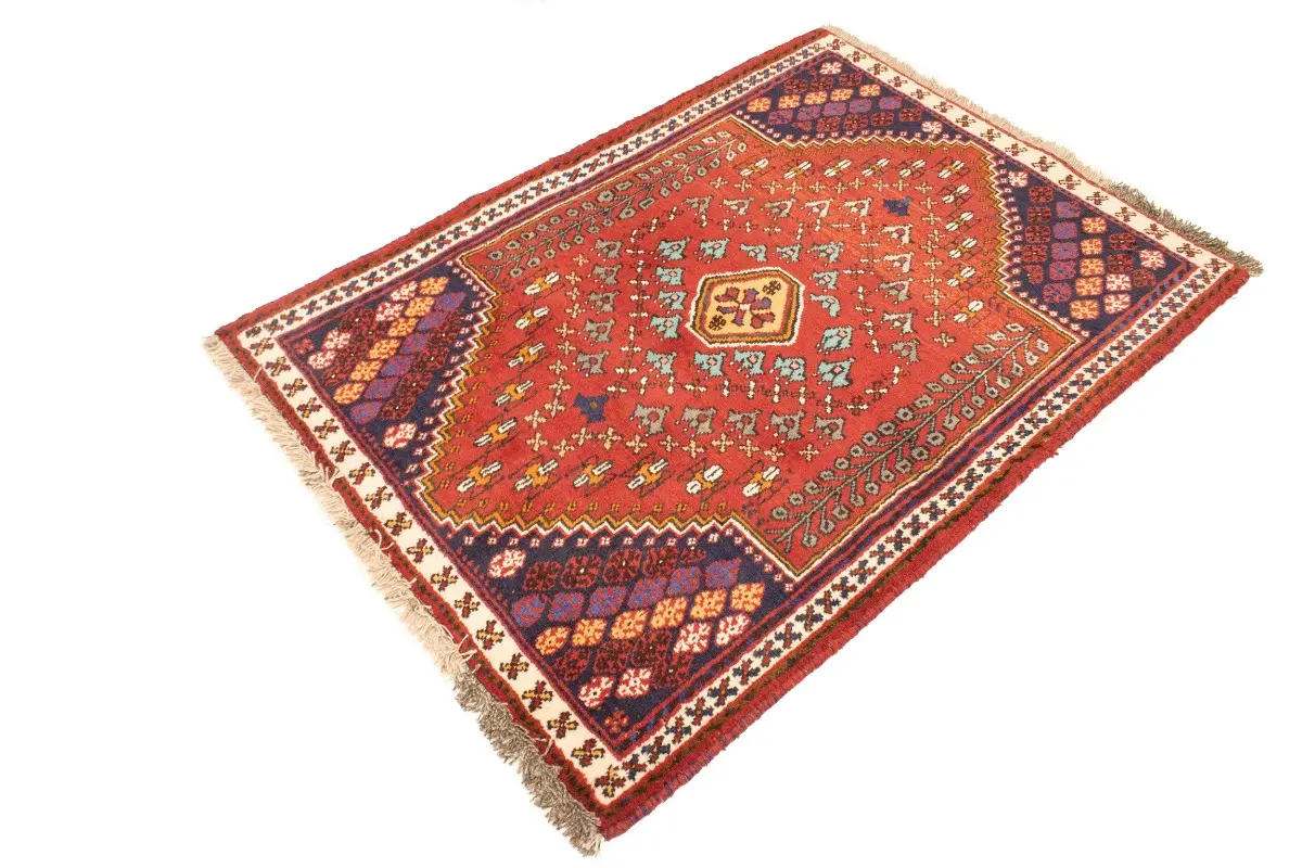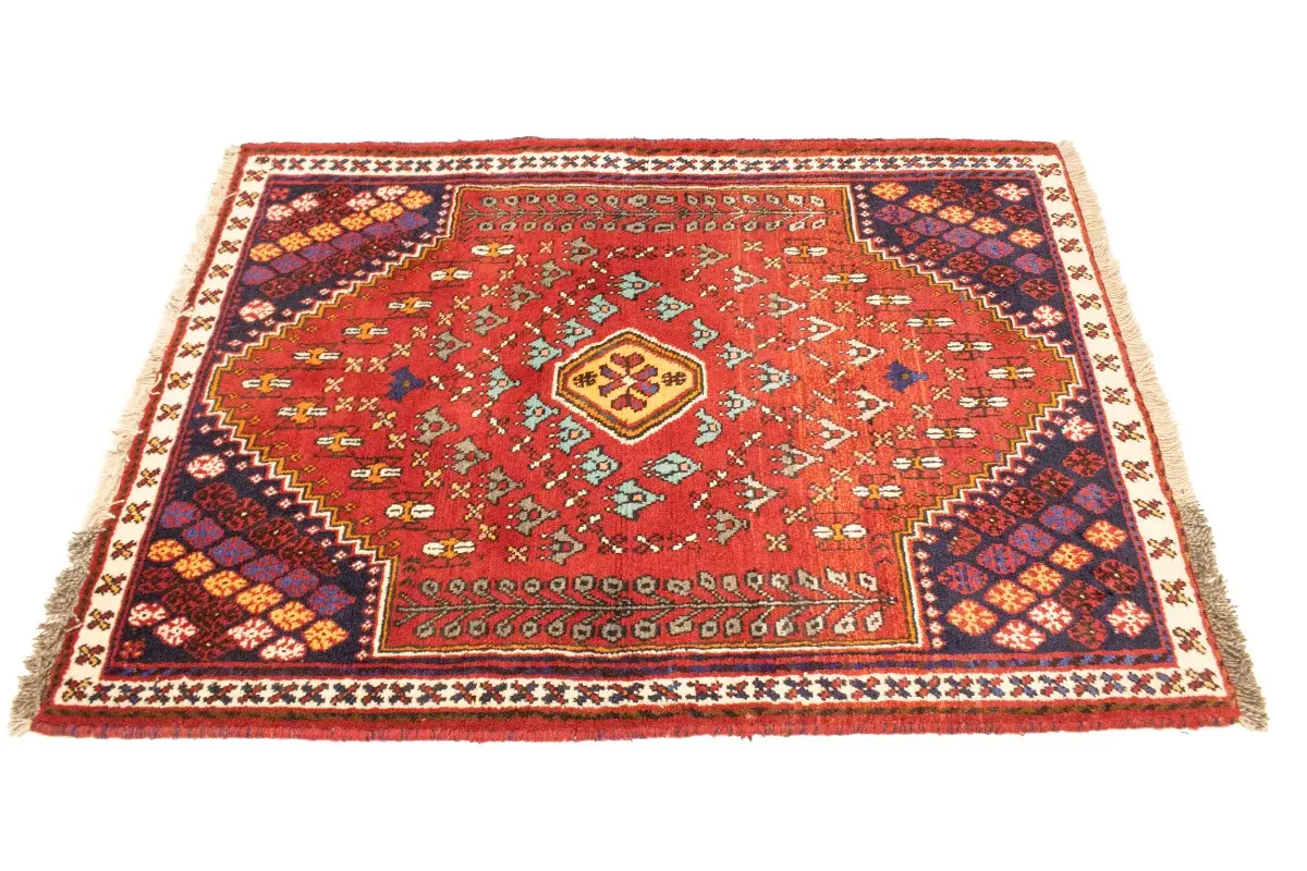 Handmade 3'5X4'9 red Persian rug made with natural dyes (fine wool pile and cotton foundation), superior knot count, and appealing ancient designs. This Oriental rug never will go out of style and would be among your most valuable treasures.