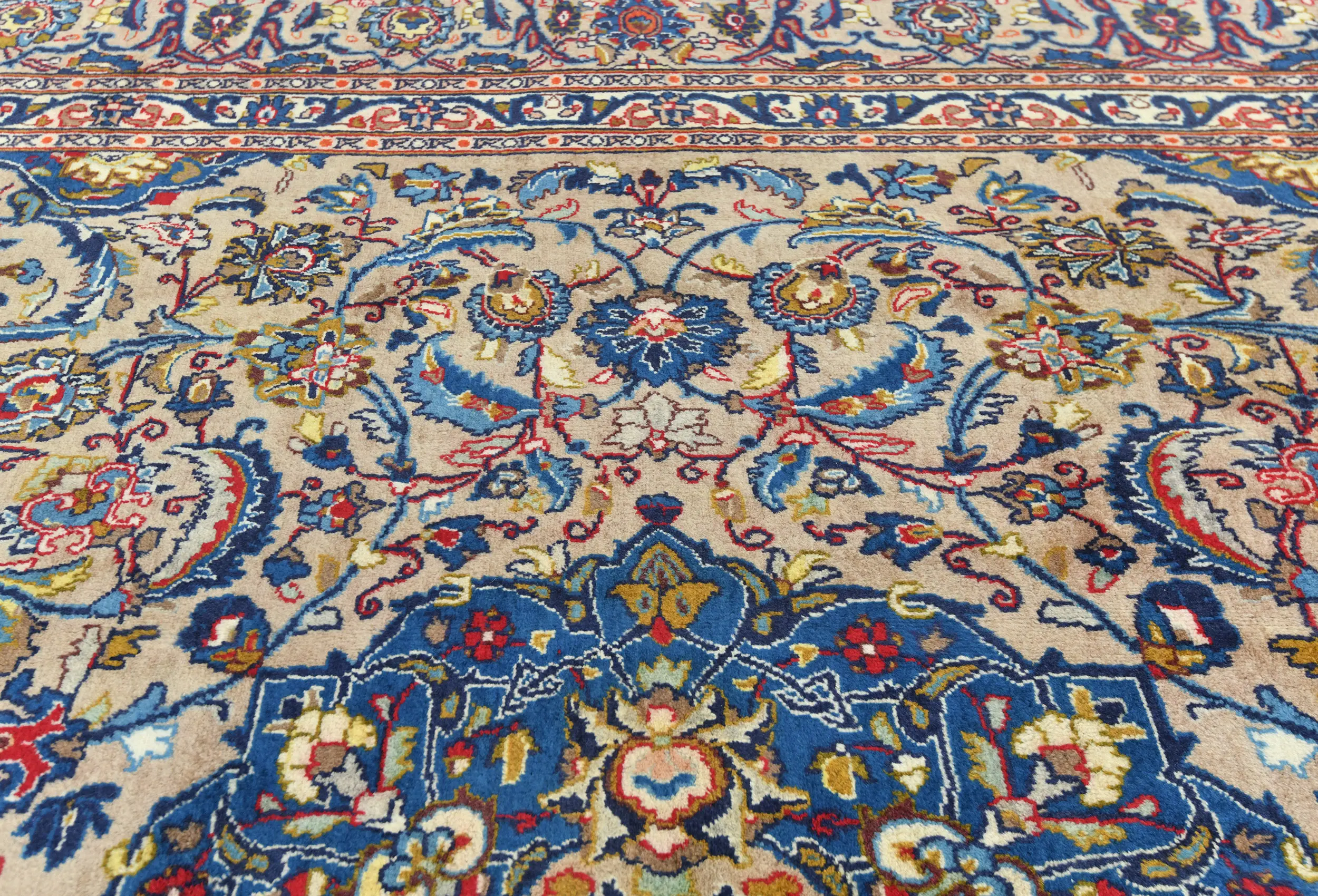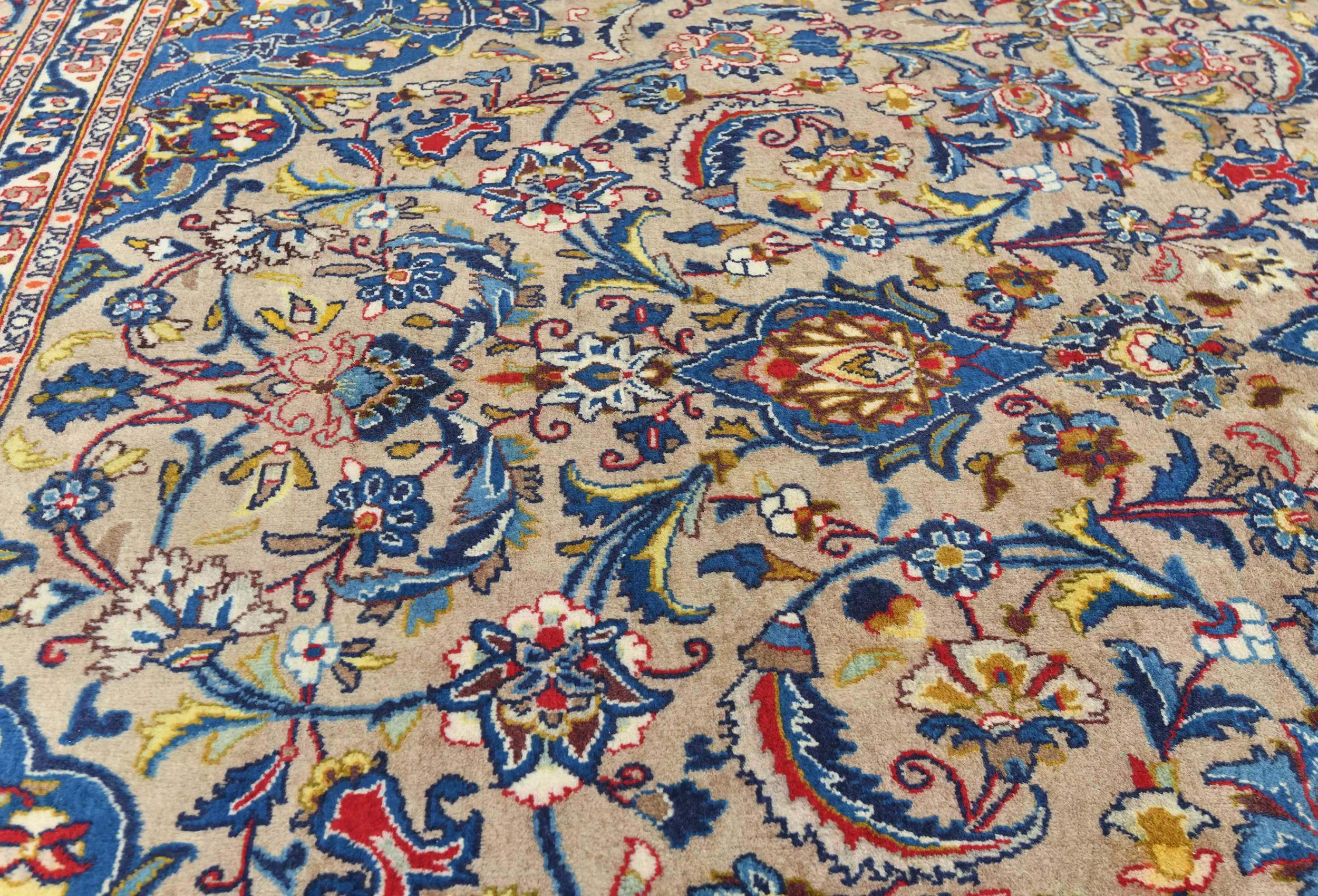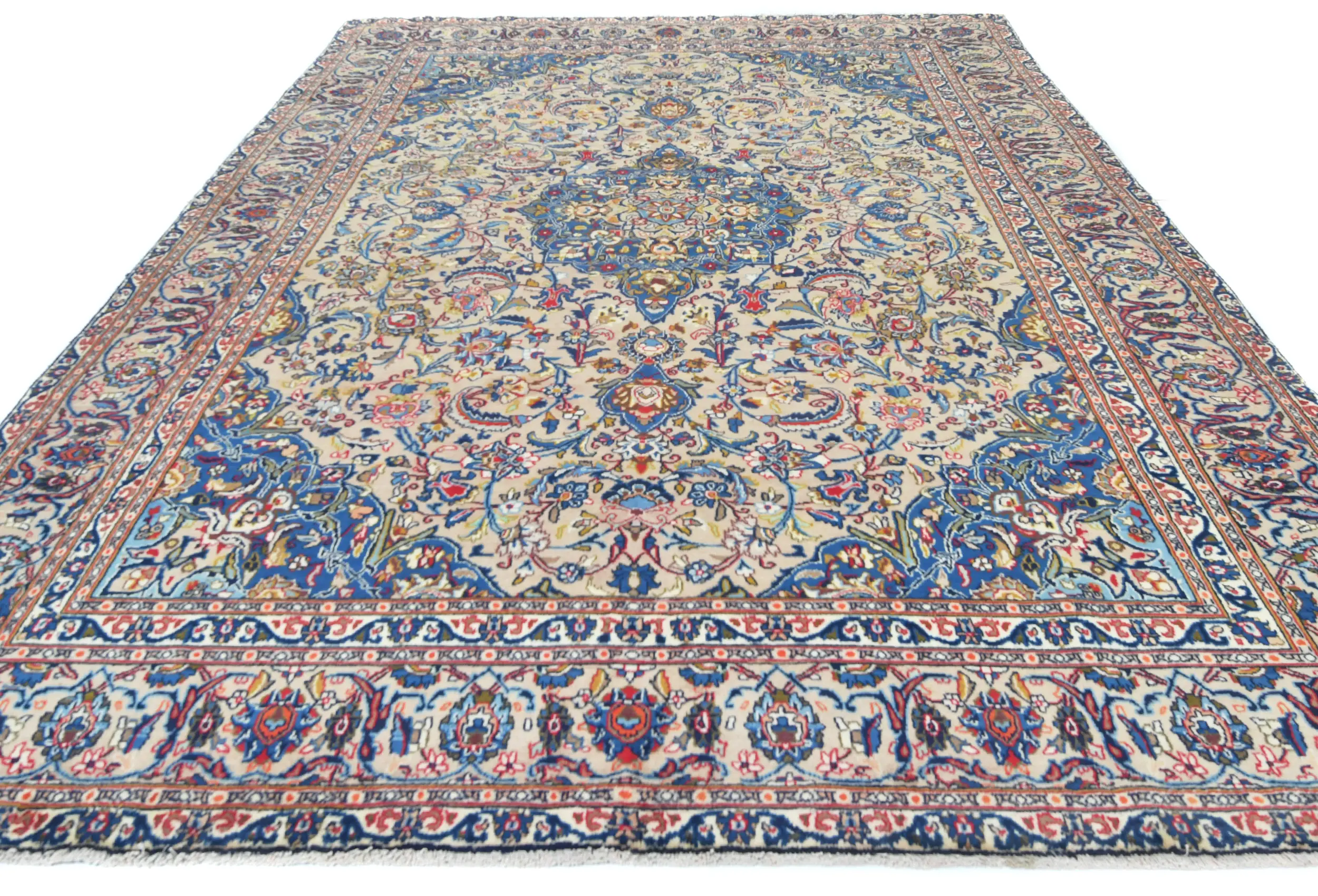 Handmade semi antique 9X13 beige Persian rug made with vegetable dyes (fine wool pile and cotton foundation), superior knot count, and alluring ancient designs. This Oriental rug/runner never will go out of style and would be among your most valuable treasures.