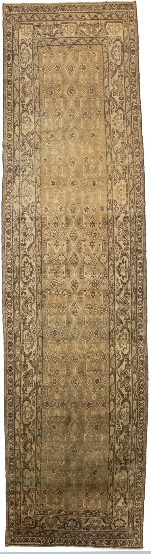 Handmade semi antique Persian over-sized runner made with vegetable dyes (fine wool pile and cotton foundation), exceptional knot count, and appealing ancient designs. This Oriental palace runner never will go out of style and would be among your most valuable treasures.