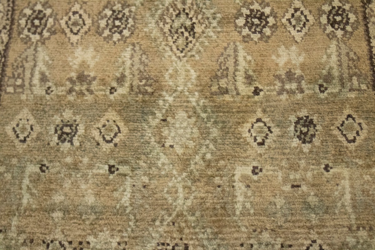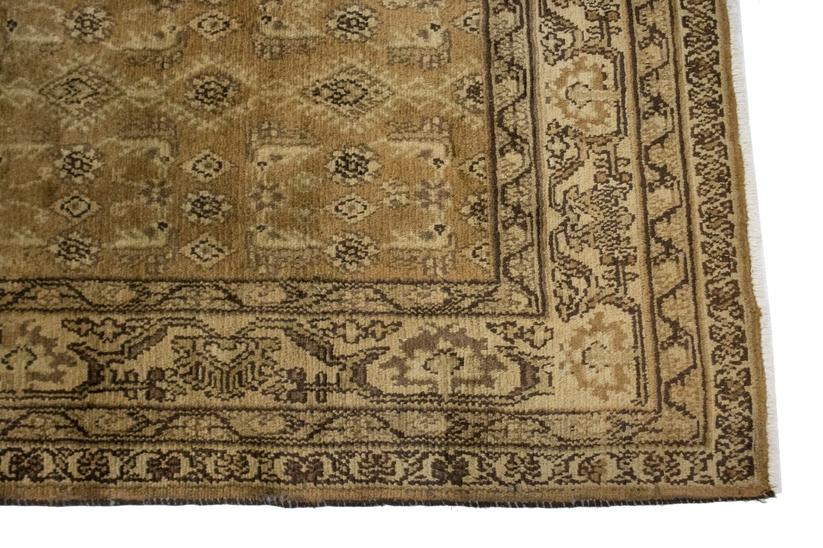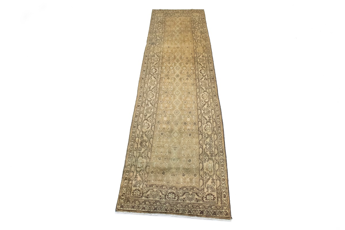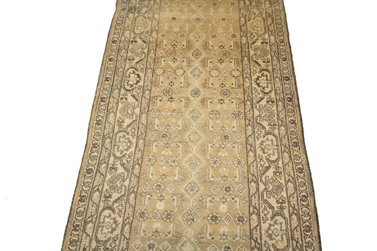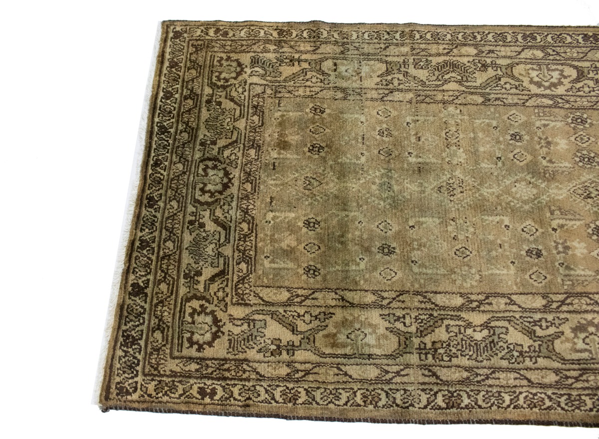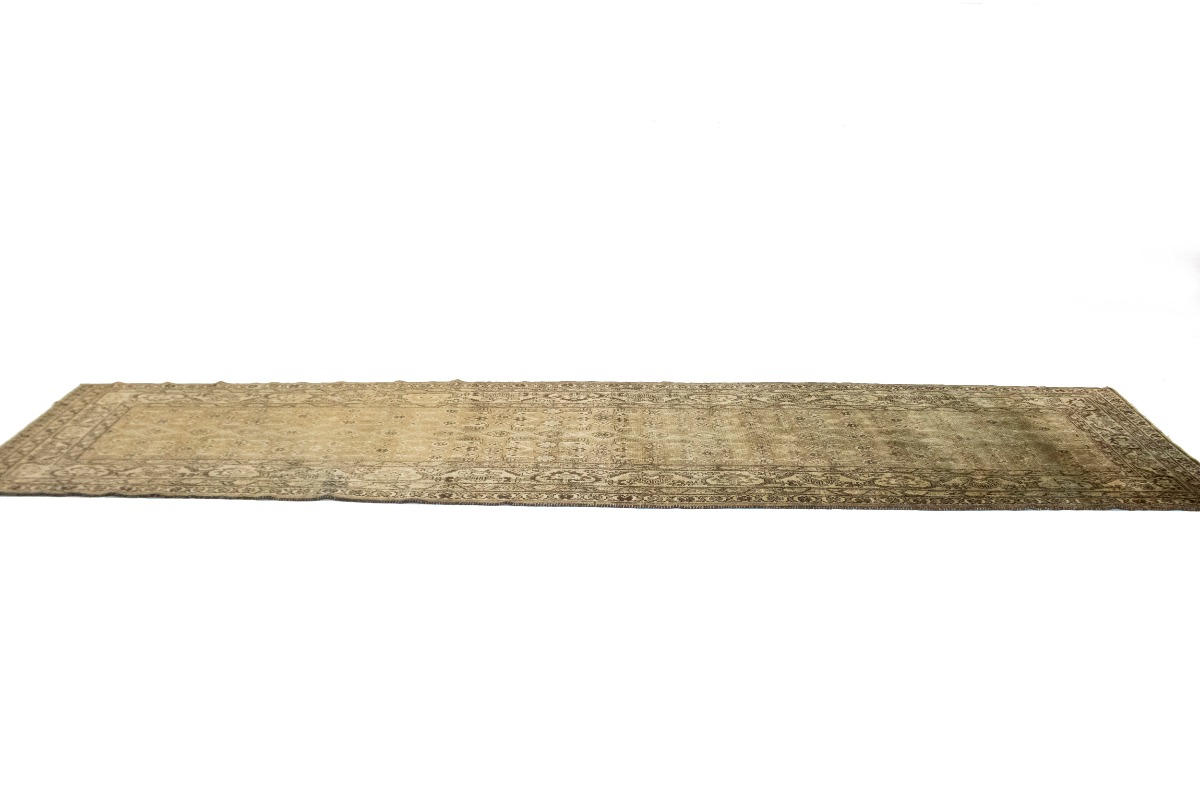 This authentic 4X15 muted brown gold semi antique Persian palace runner was finely knotted by the hands of weavers influenced by a variety of amazing artistic designs, to recreate the aged look of the exceptional piece with a richness of color and embellished background field. What set this tribal Oriental area palace runner from the others are the material and dye used (wool pile and cotton foundation), knot count, antique designs, fantastic grades, and its regional historical connection: it has deep roots, from the story of the people who produced it to the meaning of the symbols and colors displayed across its canvas that have been praised for centuries. This home décor carpet will be completely cozy and inviting that never will go out of style! Also, this Oriental palace runner would be among your most valuable treasures, it is a great investment that increase in value over time, and it will last a lifetime because was woven with high-quality, all- natural wool; it won’t rip, tear, or shed. Eco-friendly, opulent yet affordable; this Persian rug will give you an extra pop of character to help define your home environment with luxury and warmth that will capture the eyes and attention of your audience (homeowners, designers, decorators, family and friends).