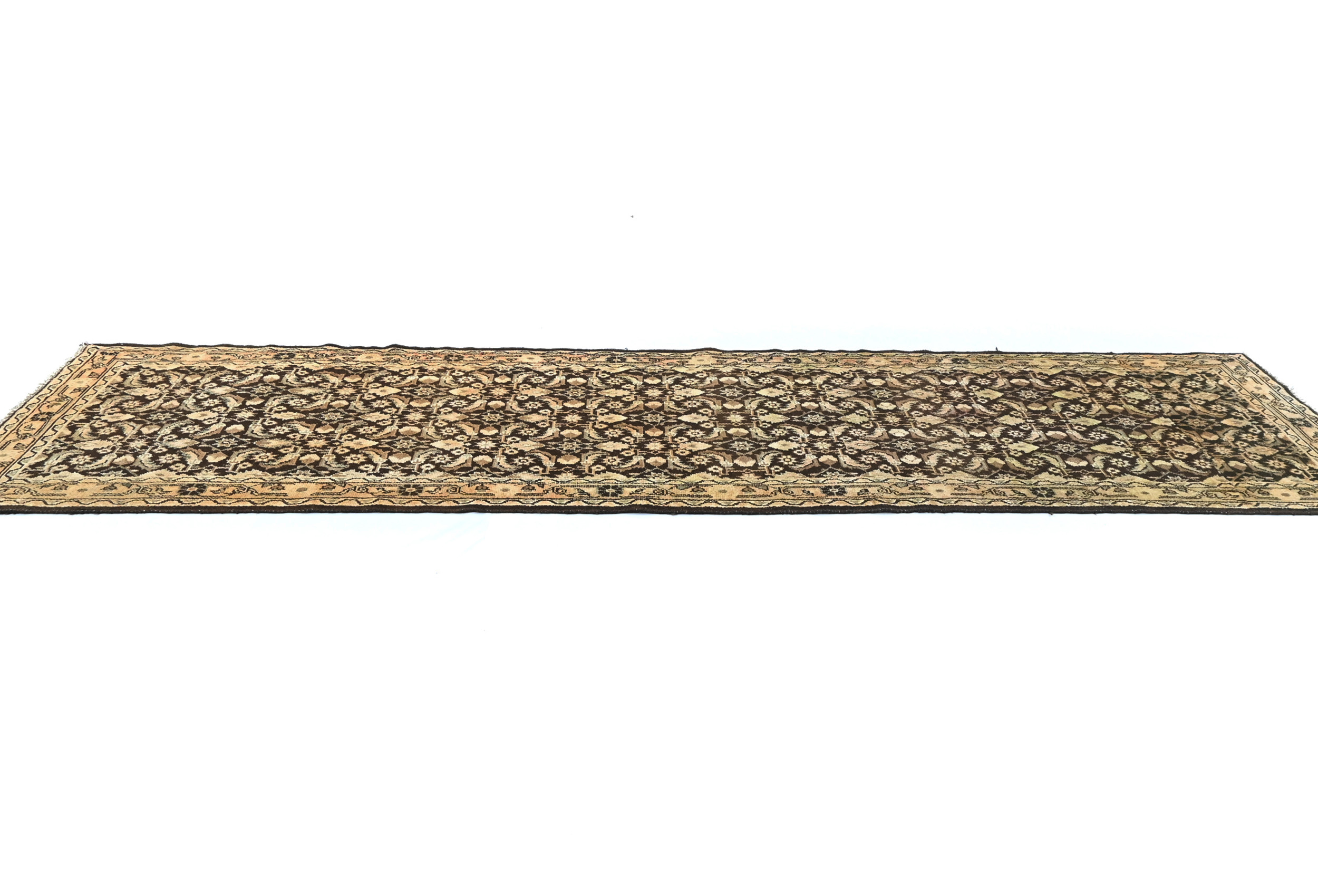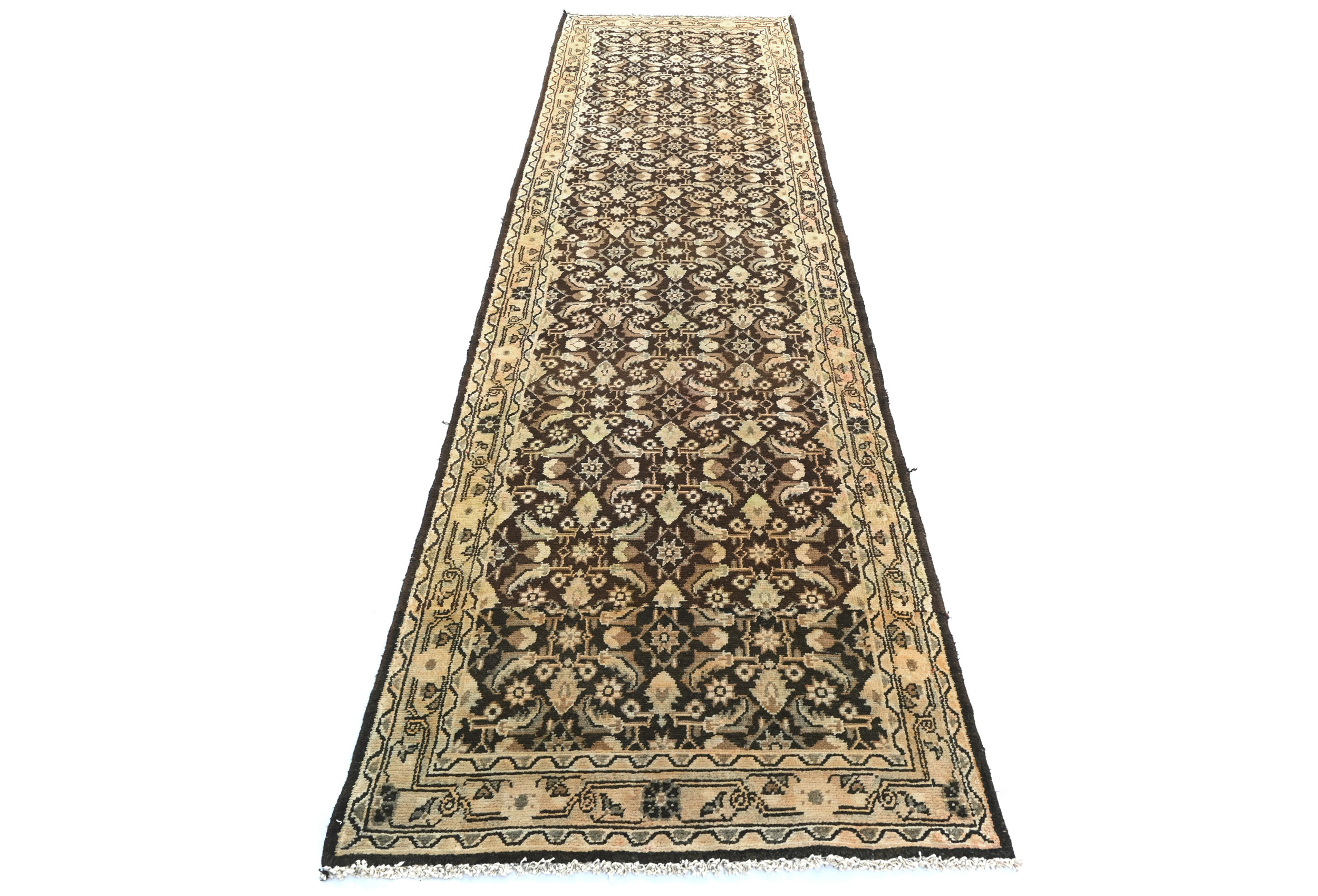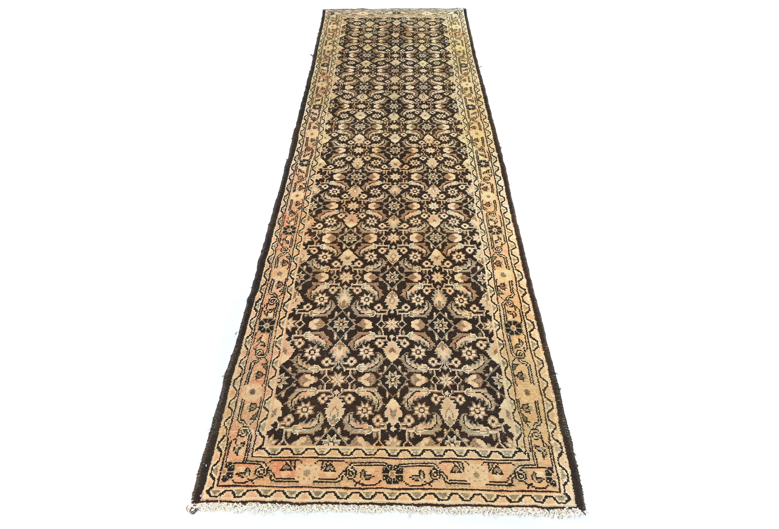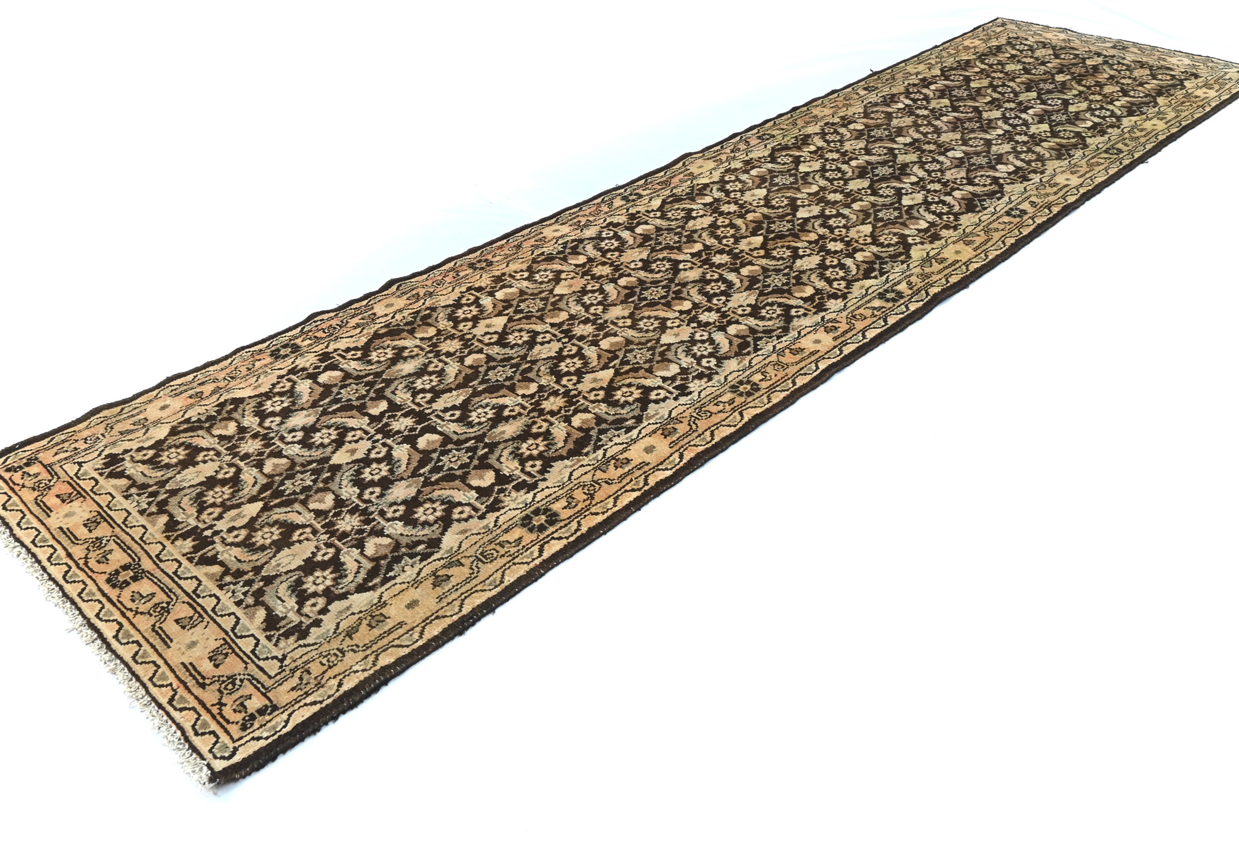 Handmade vintage 3X11 dark brown Oriental runner made with vegetable dyes (fine wool pile and cotton foundation), superior knot count, and alluring ancient designs. This Oriental runner never will go out of style and would be among your most valuable treasures. RT-6463
