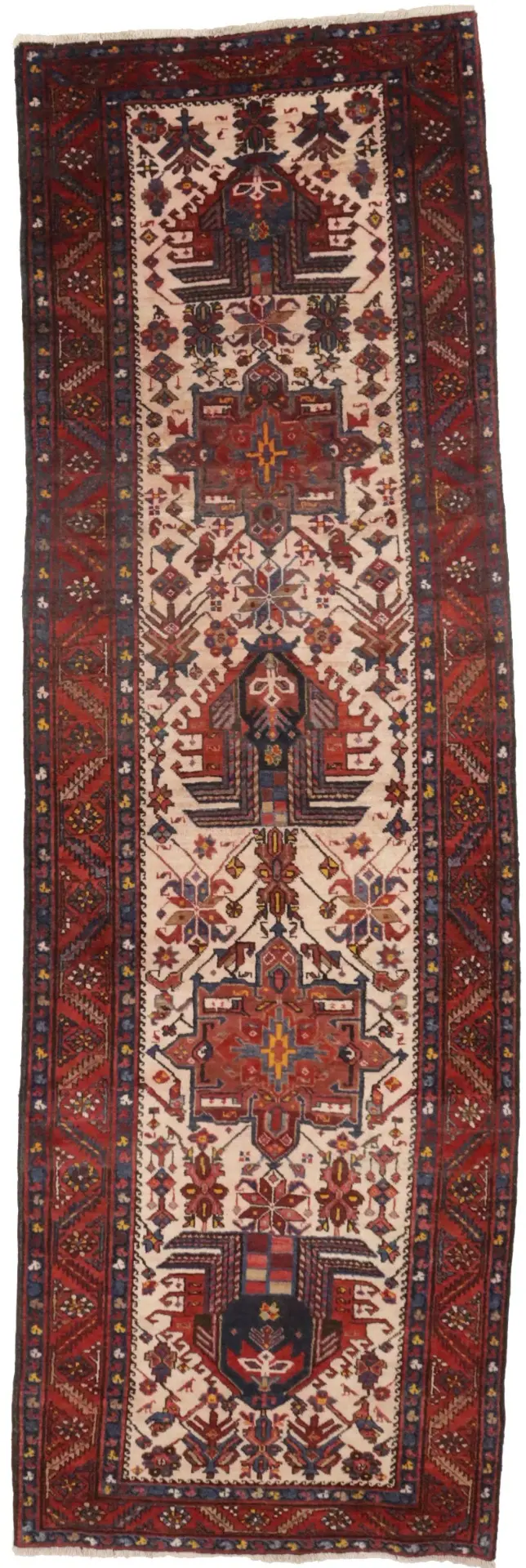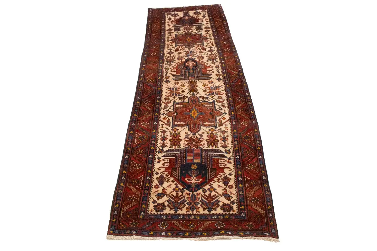 Hand Knotted semi antique 4X12 cream Persian runner made with vegetable dyes (fine wool pile and cotton foundation), exceptional knot count, and alluring ancient designs. This Oriental runner never will go out of style and would be among your most valuable treasures.