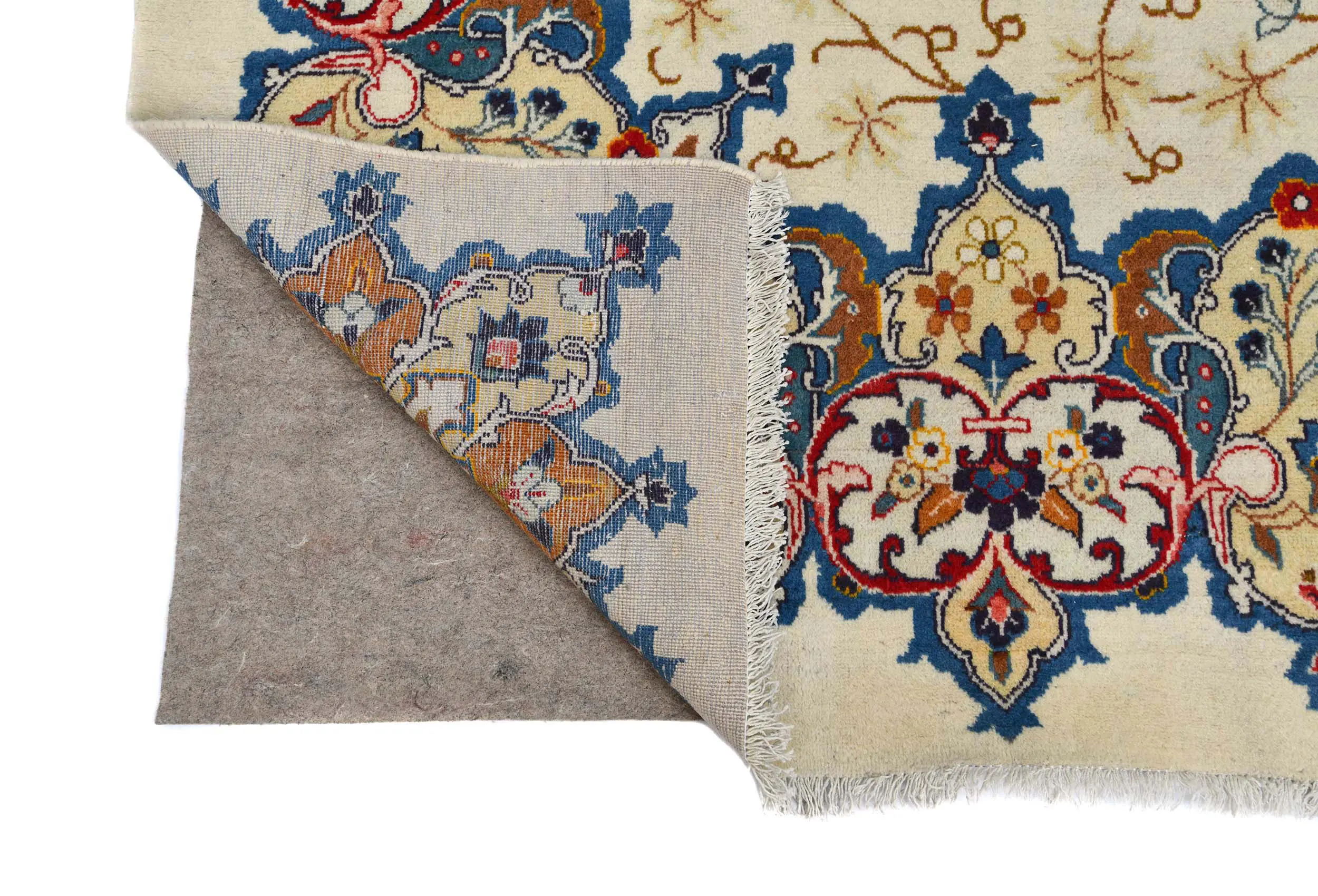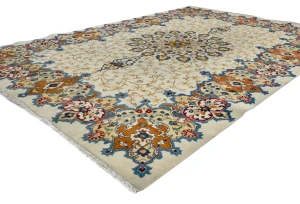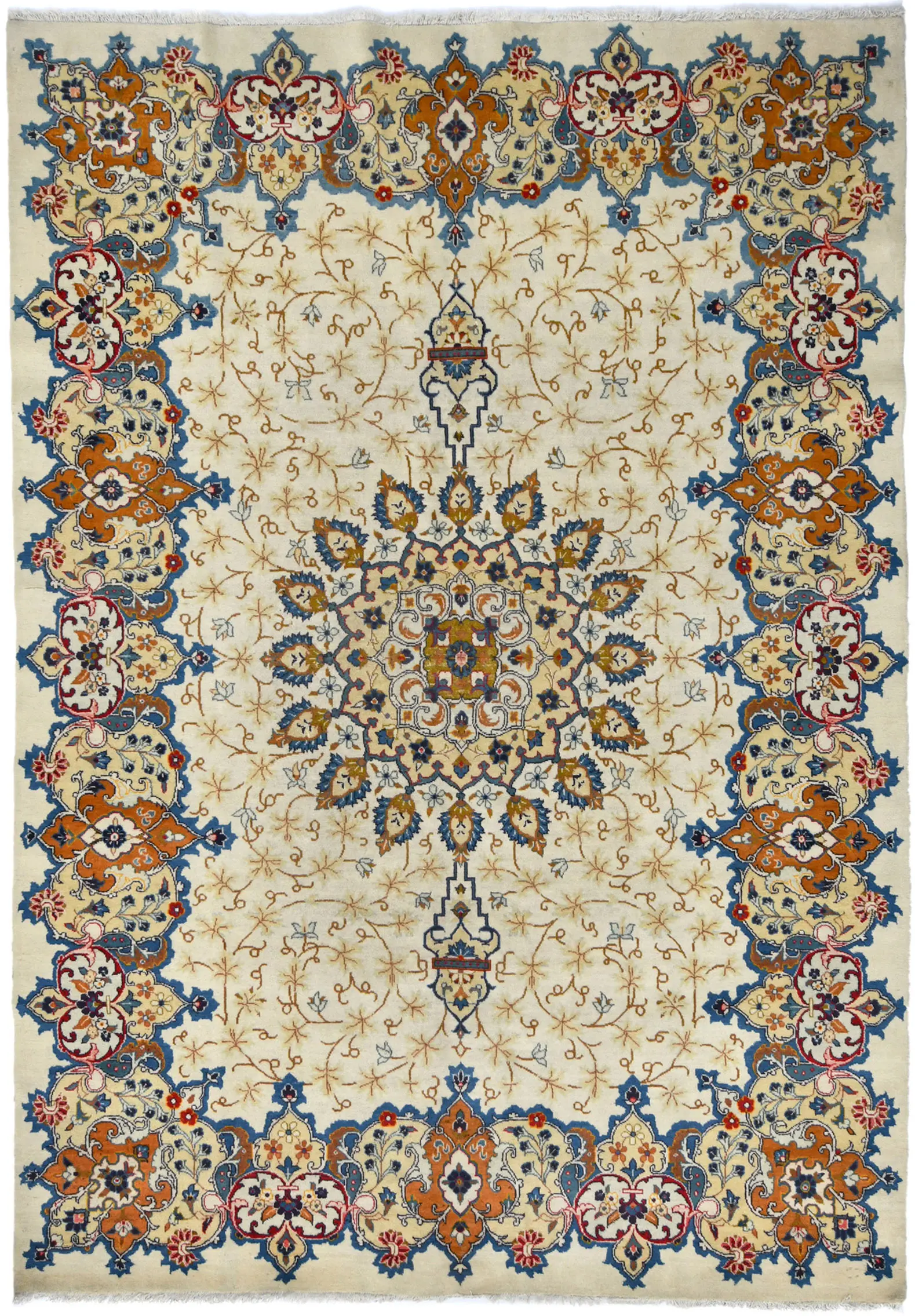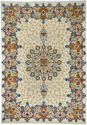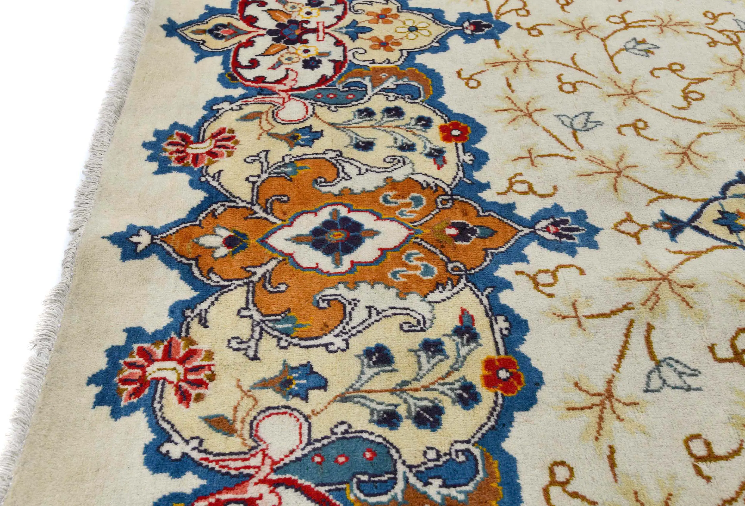 Handmade semi antique 8X11 cream Persian rug made with vegetable dyes (fine wool pile and cotton foundation), superior knot count, and alluring ancient designs. This Oriental rug never will go out of style and would be among your most valuable treasures.