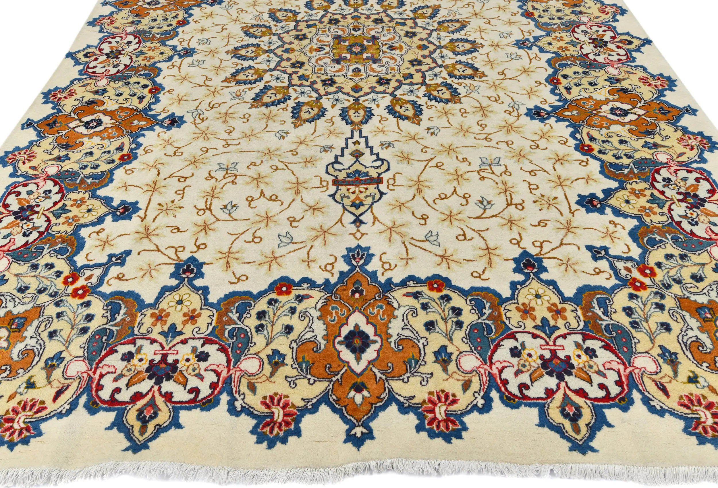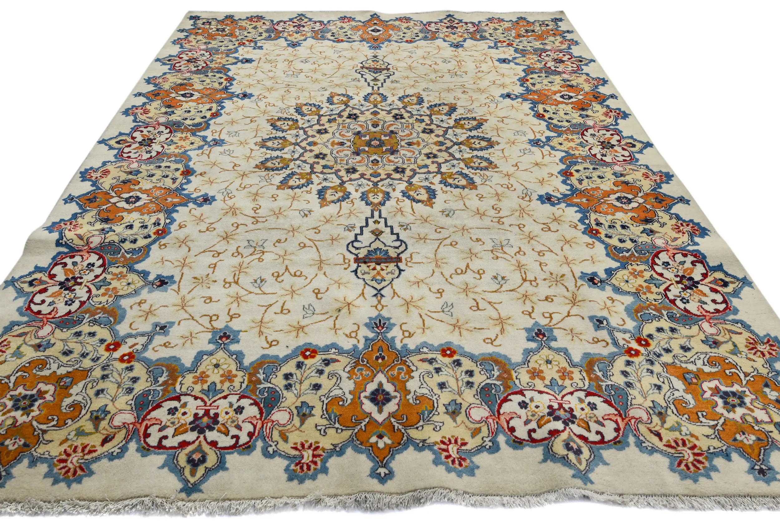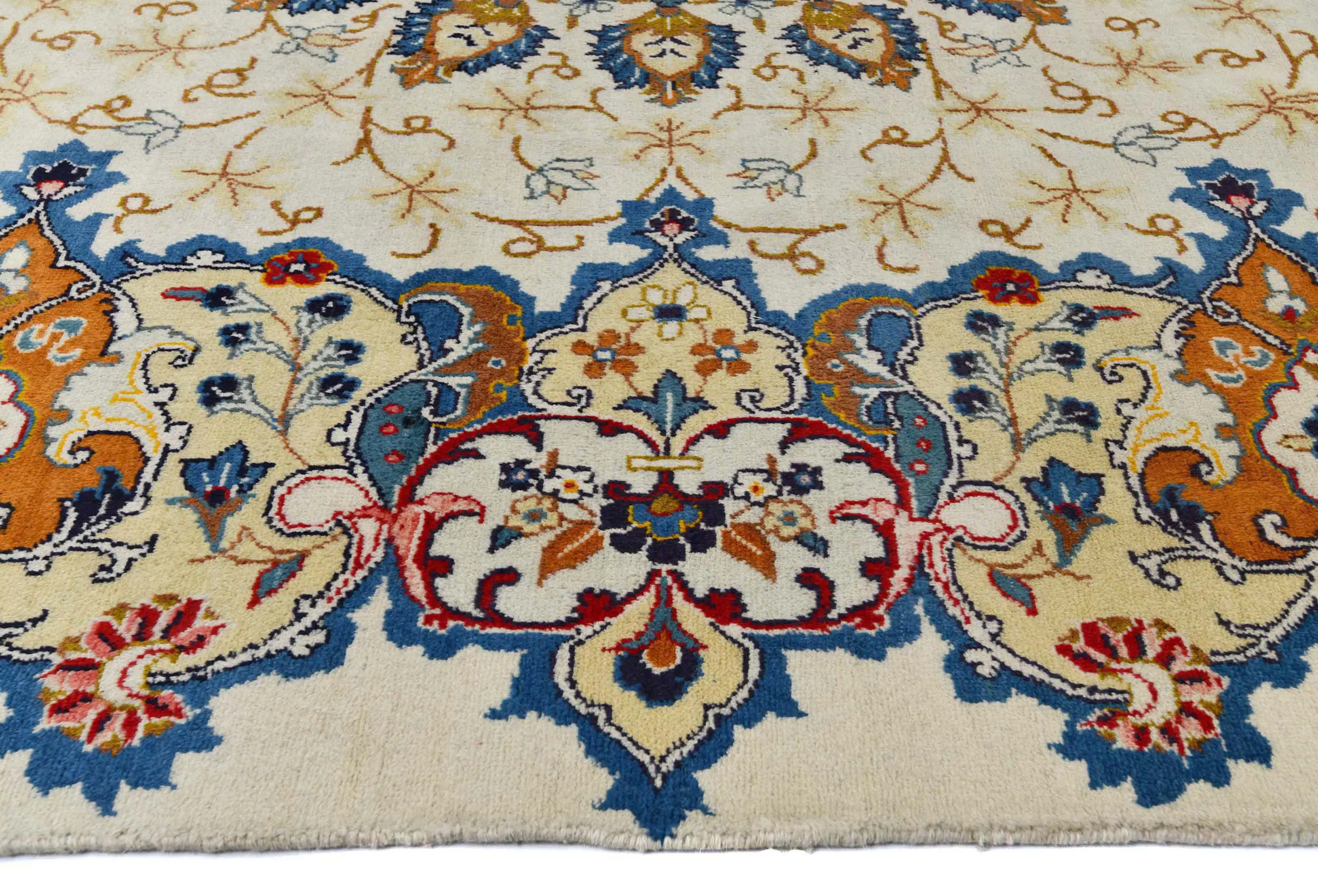 Handmade semi antique 8X11 cream Persian rug made with vegetable dyes (fine wool pile and cotton foundation), superior knot count, and alluring ancient designs. This Oriental rug never will go out of style and would be among your most valuable treasures.